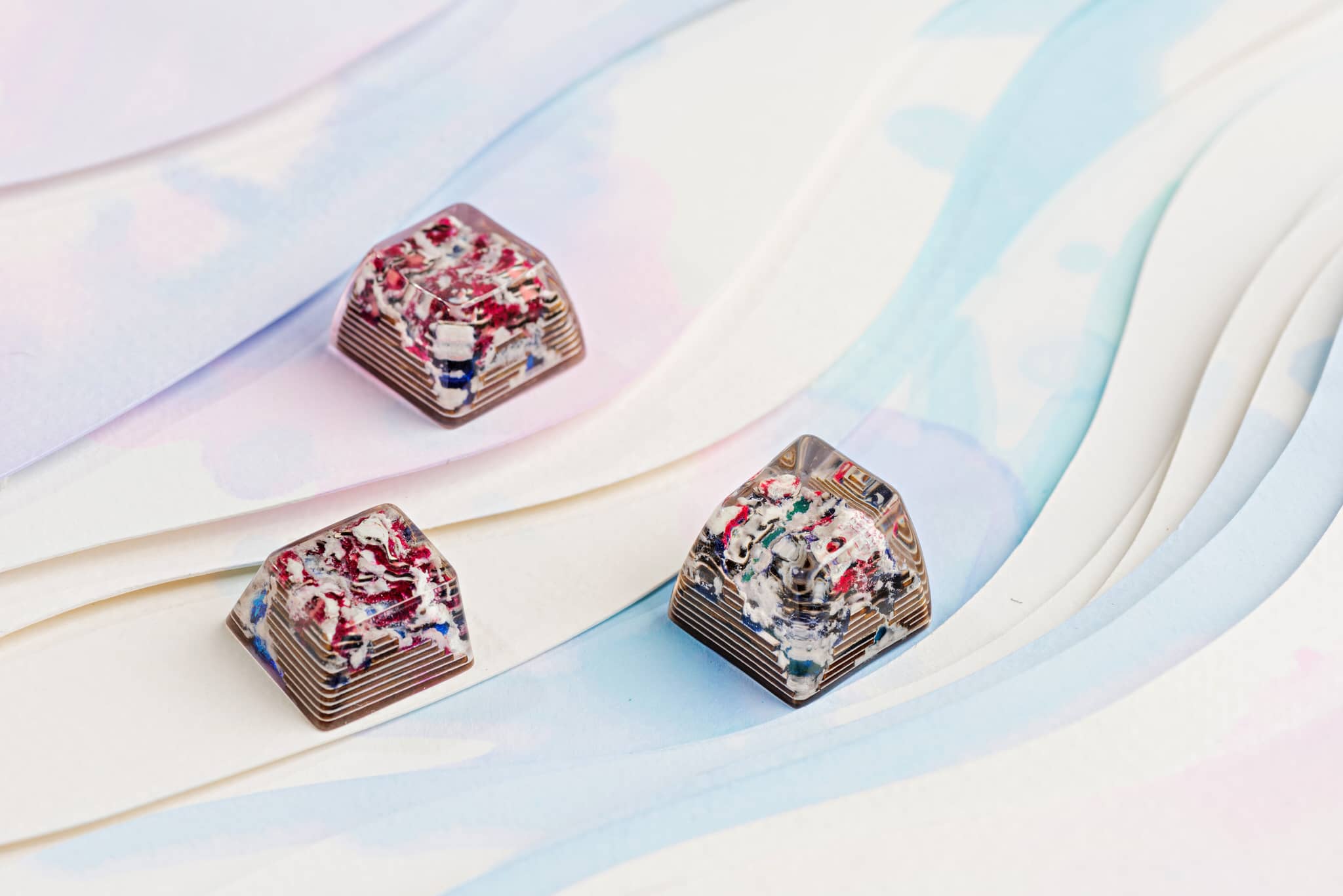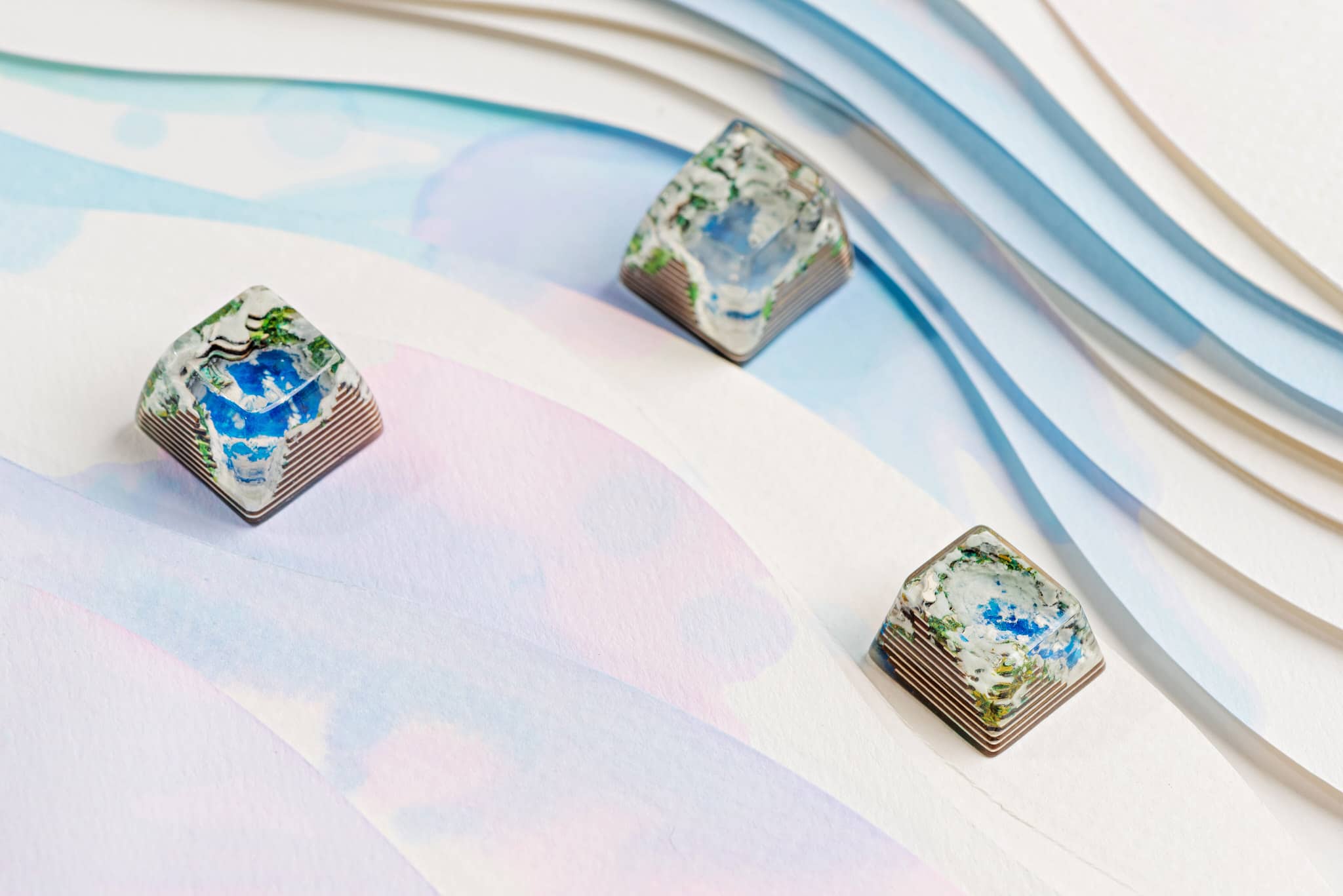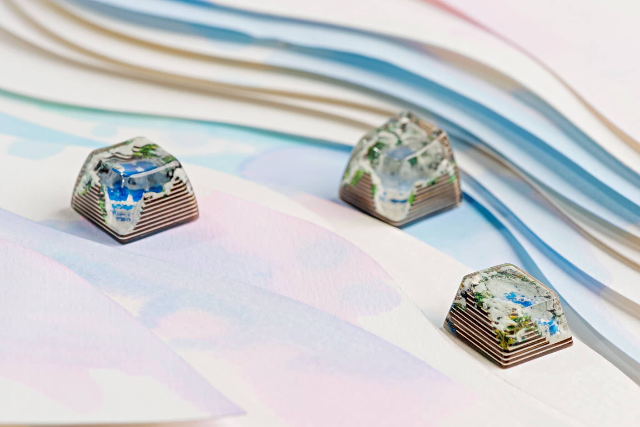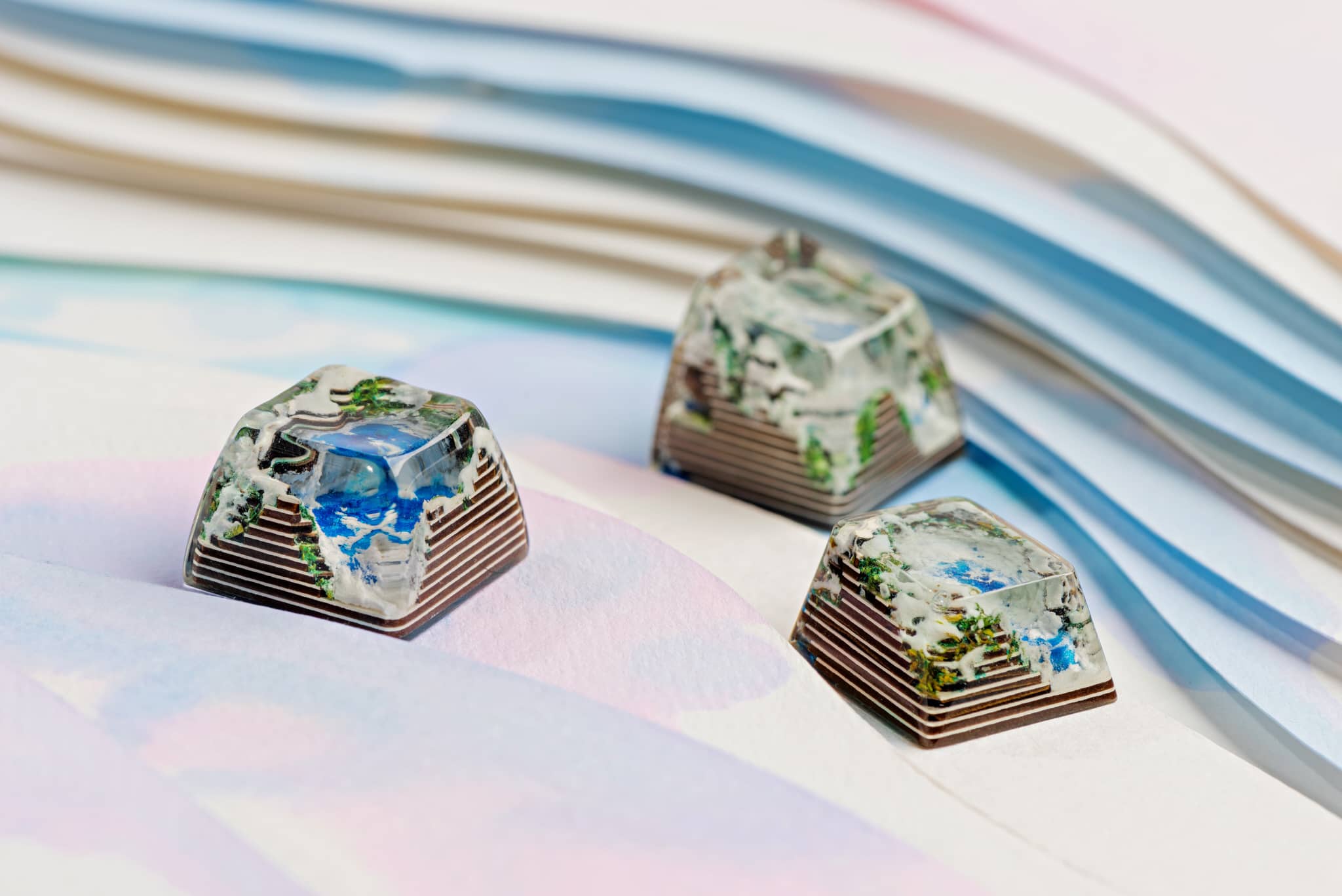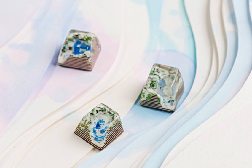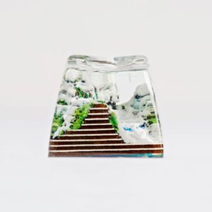 It’s a triple scenario of a whiteout typography which including three profiles SA row 1, row 3 and Cherry. Depict the glacier and an iconic frozen lake in the middle of the keycap, green.. They’re made in the same topography which all has a small cave in the back of the keycap, and there are slight differences of the topography height and the effect of lake color. Profile SA row 1 has an opaque surface of the frozen lake.