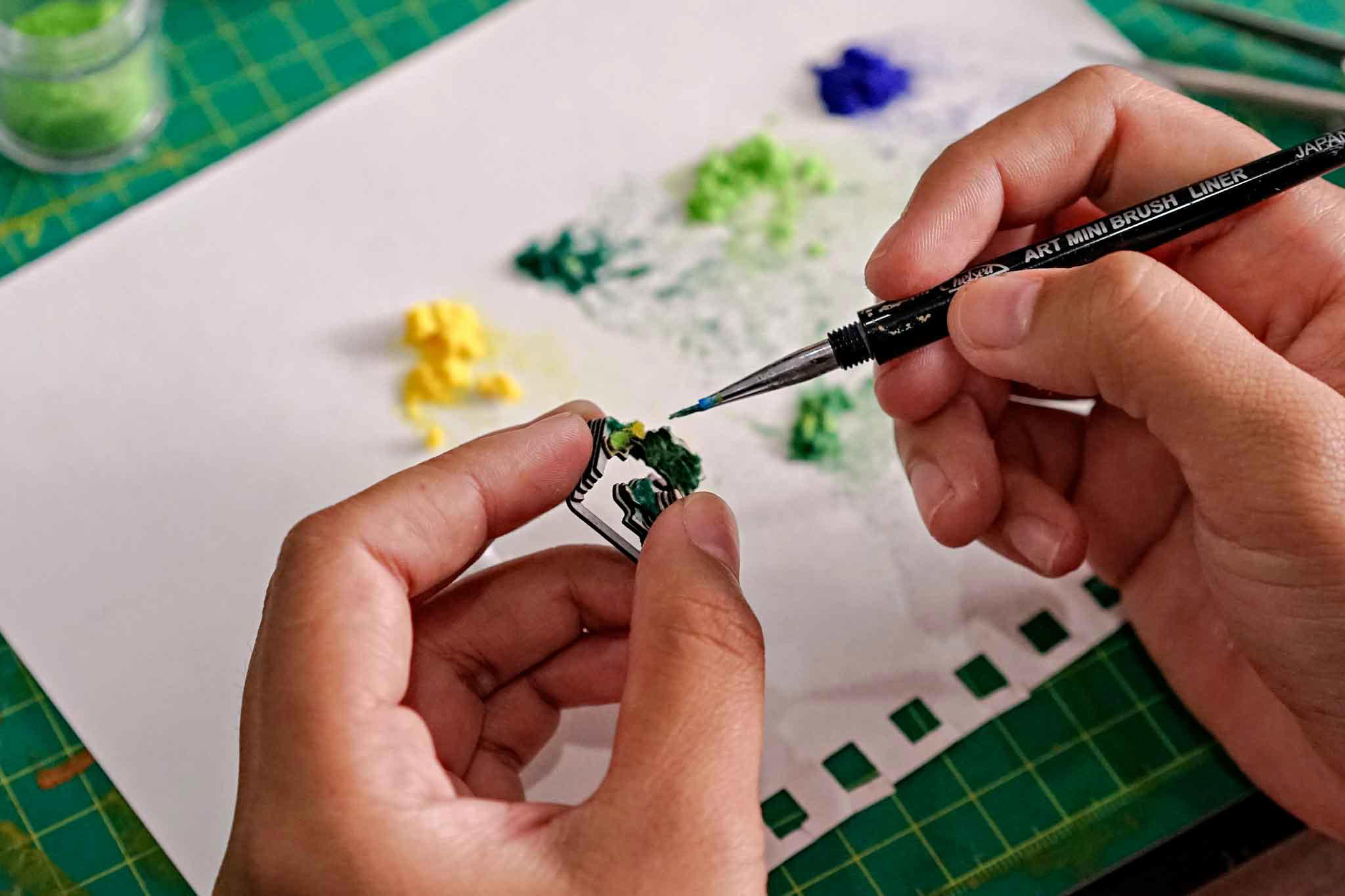 - The mixing of colors to blend into the empty wooden parts on each terrace and tiny green grass is done manually in a very meticulous way.