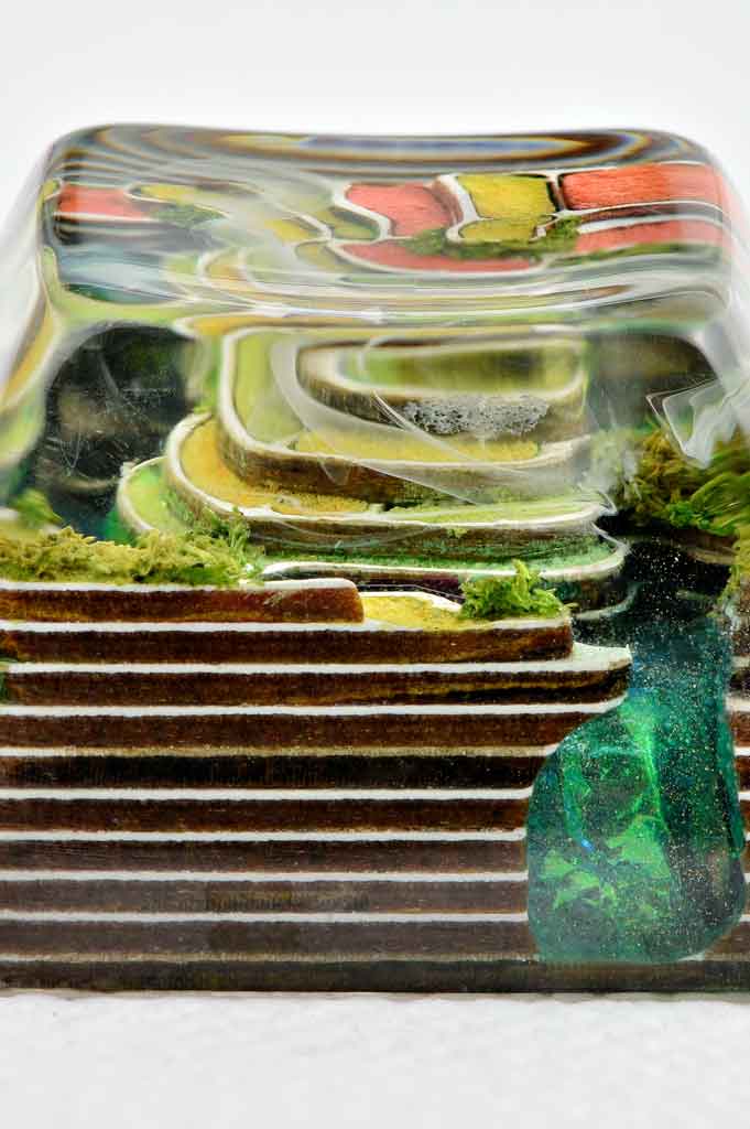 - 14 layers of wood are stacked on top of each other with a certain amount of resin UV (the resin type use UV light to solid) so that the thickness between layers is always thin and equal. The glue is made sure to not leak and the height of the wood blocks has to be the same.