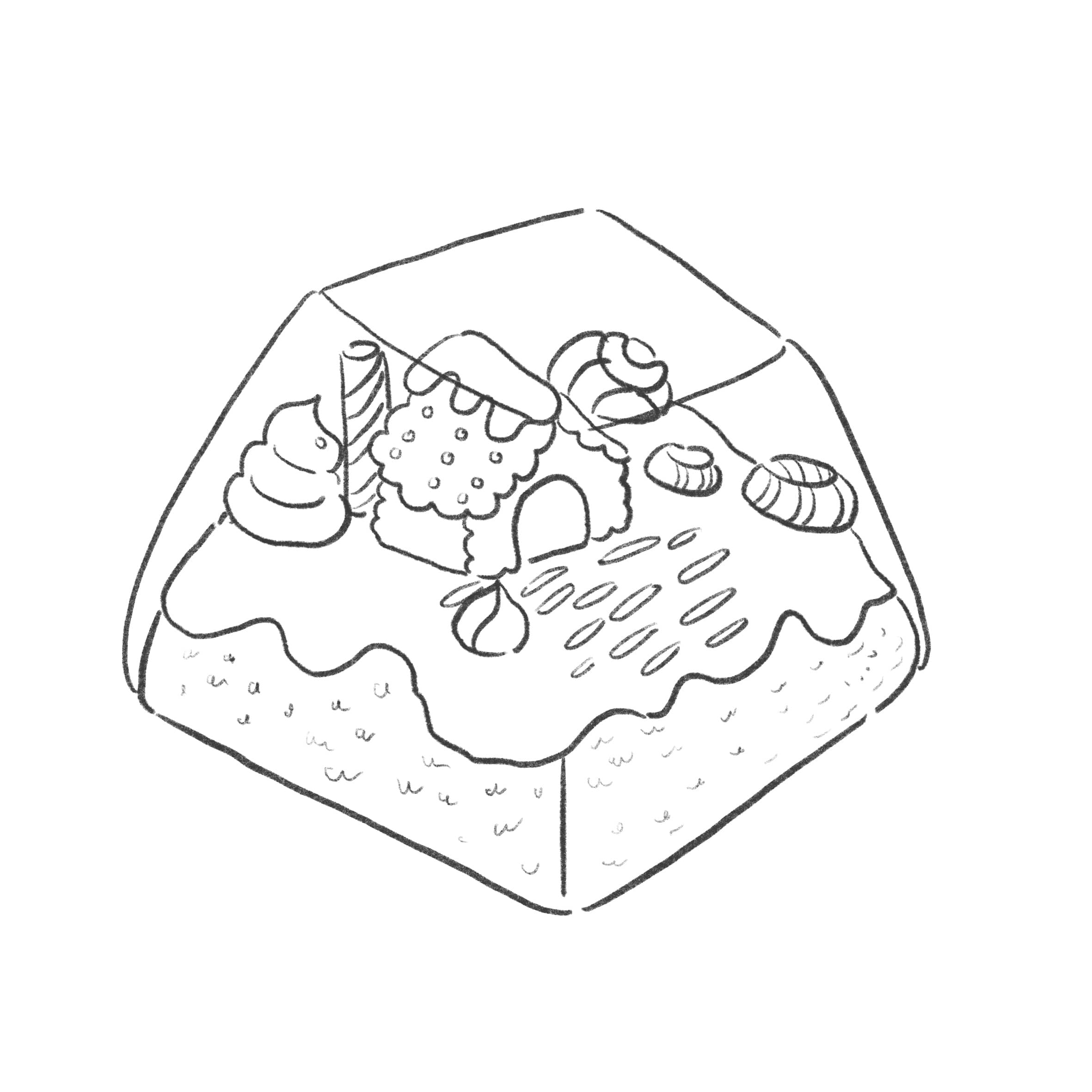 Choco fudge and Raspberry Trifle are almond paste volcano which lava are made from almond paste lava and mountain body are made from choco fudge and raspberry trifle. Lolly are coveredon the surface of the mountain.