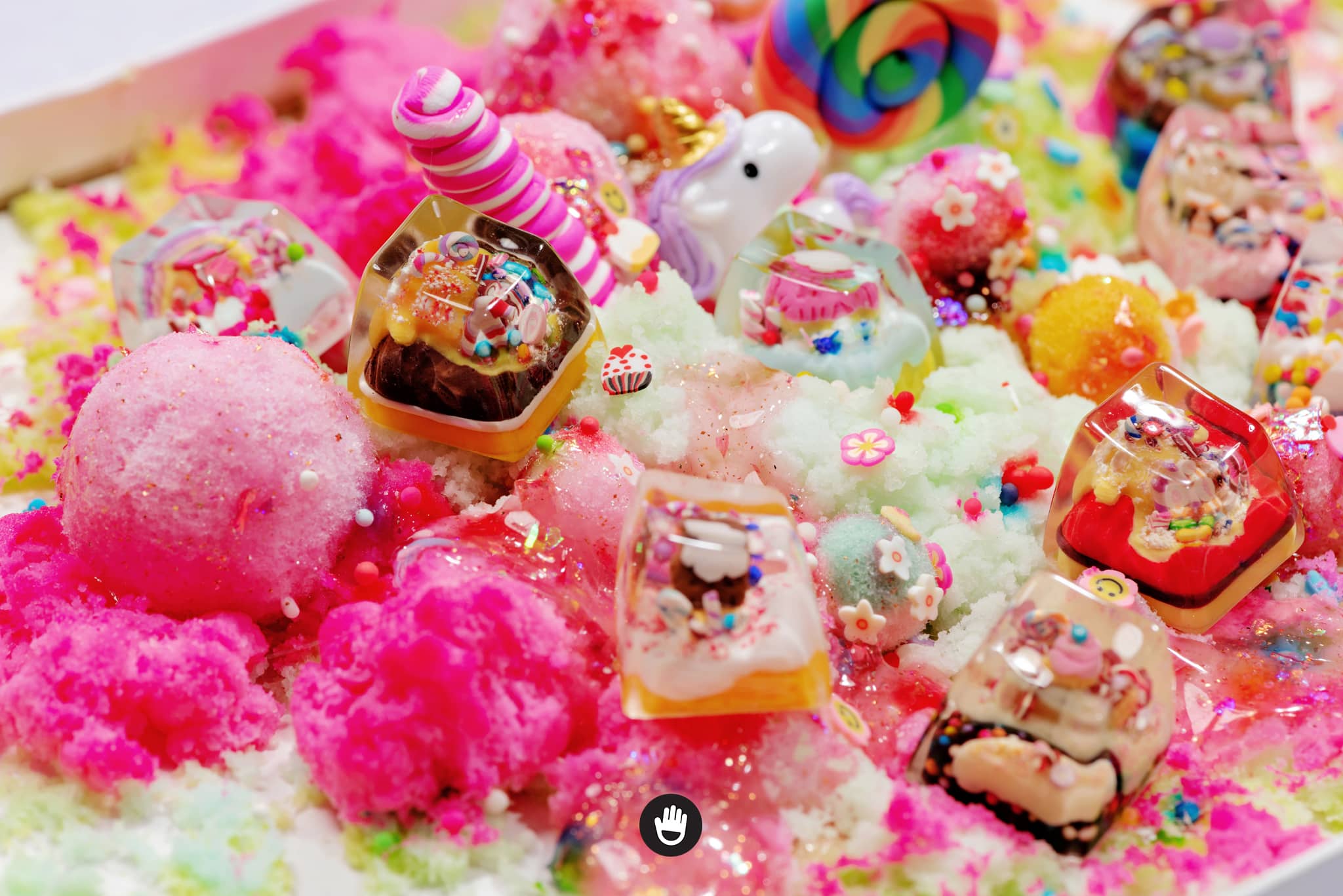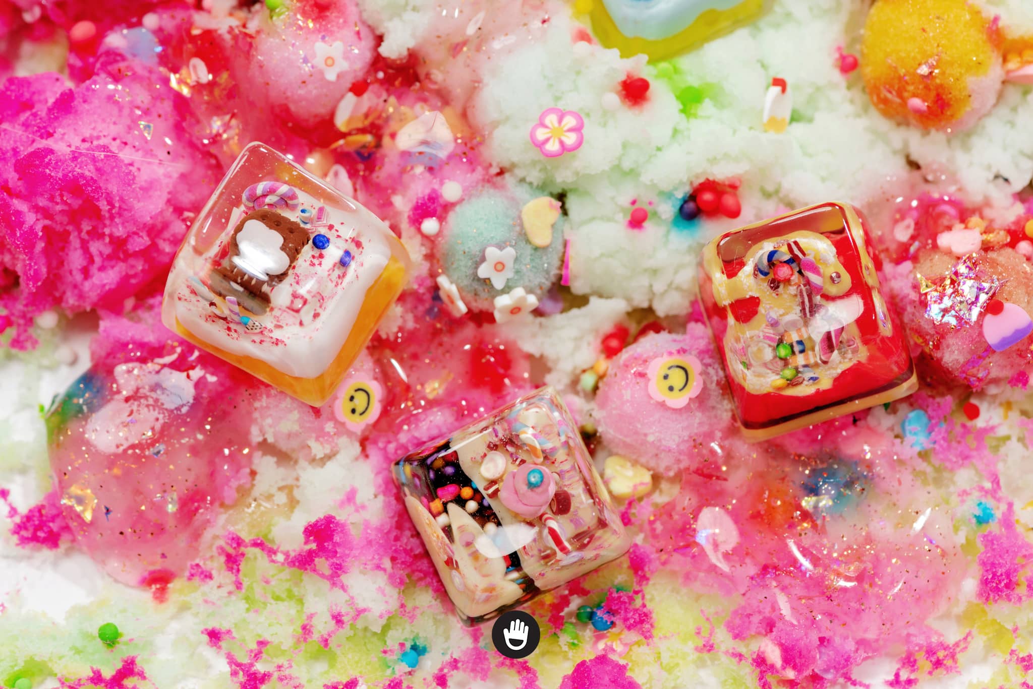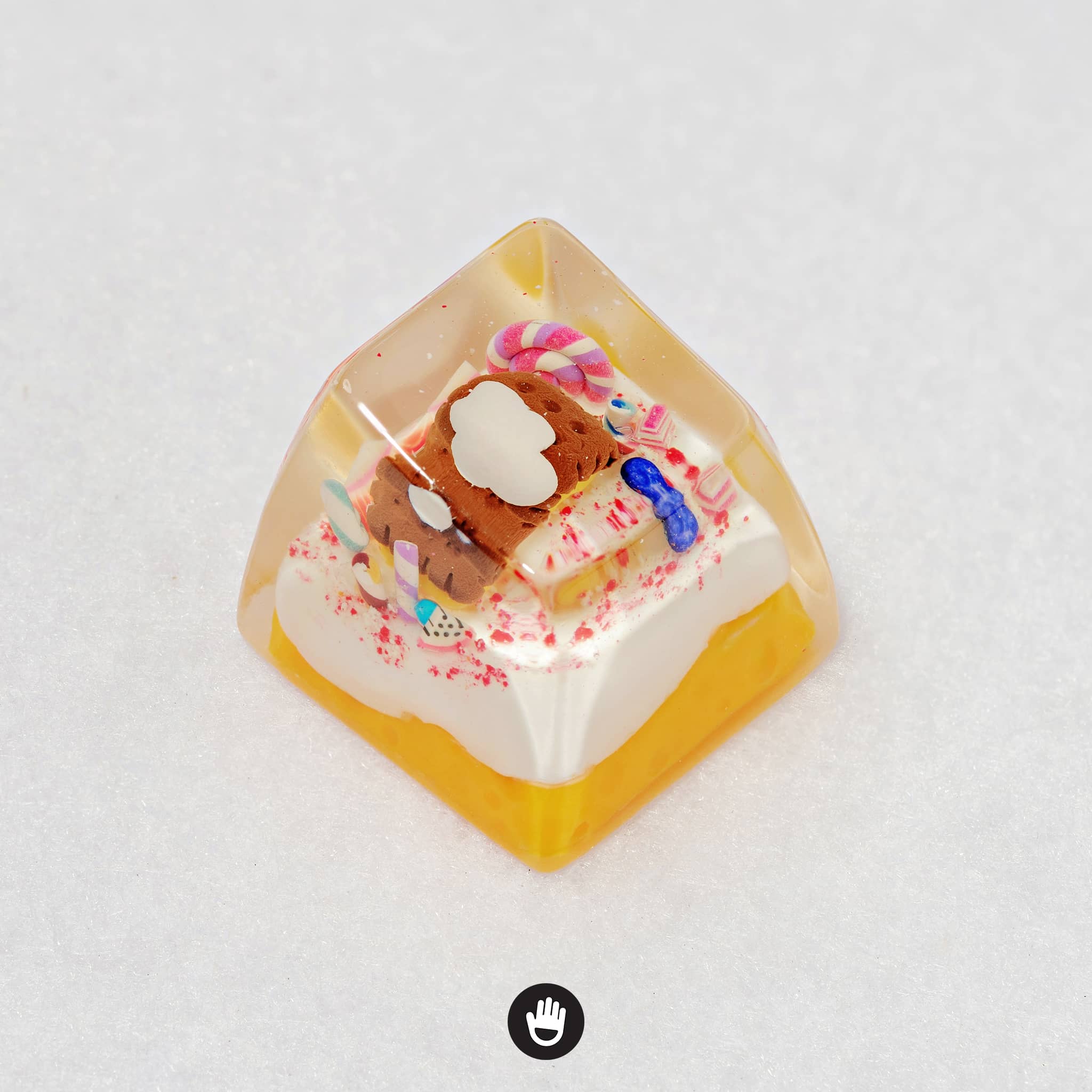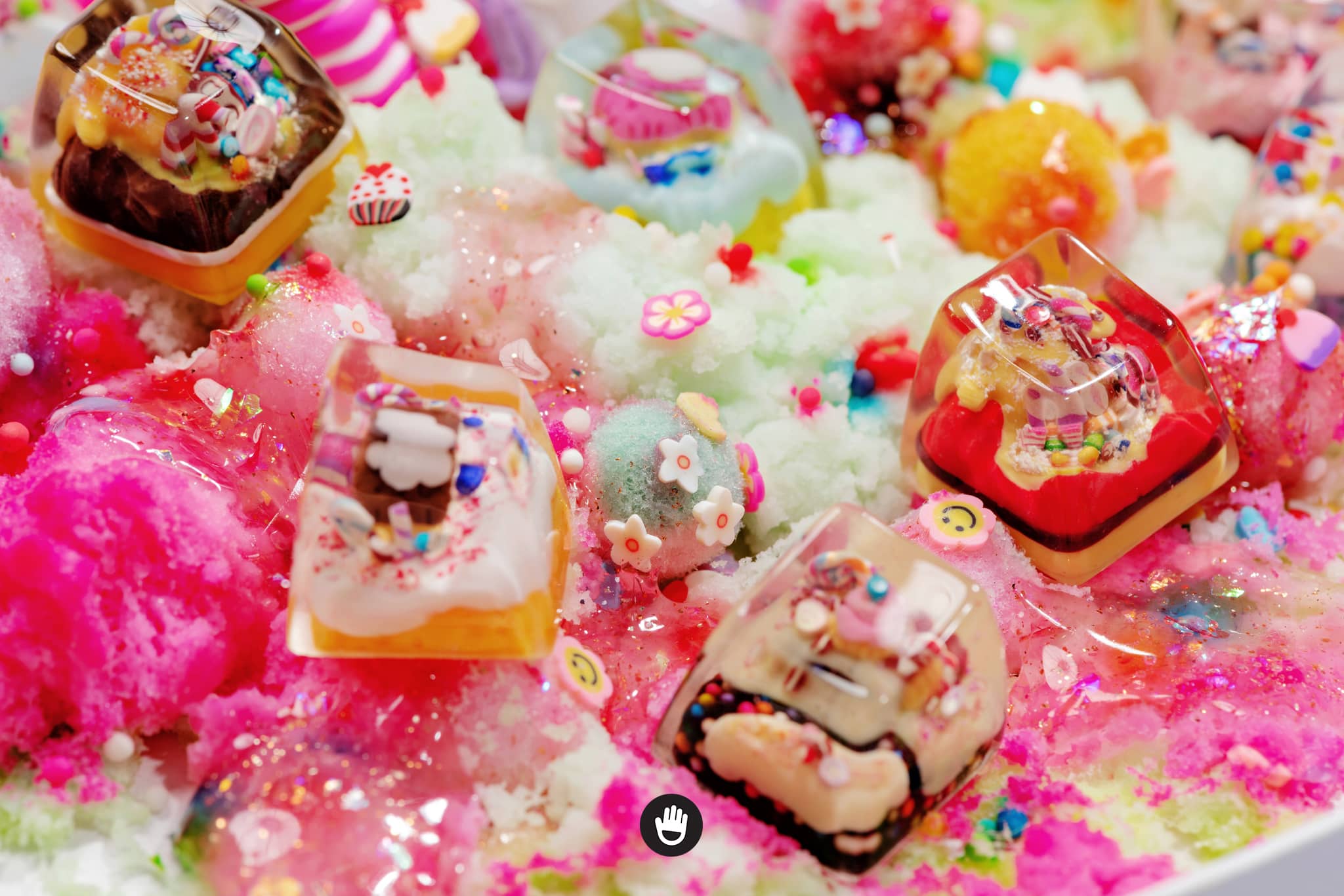 All candies, sweet stuff, cream and cake houses are hand sculpted, piece by piece. And sticked together in each individual keycap. Finally they would be casted with glorious transparent resin and flourished until they’re smooth and shine.