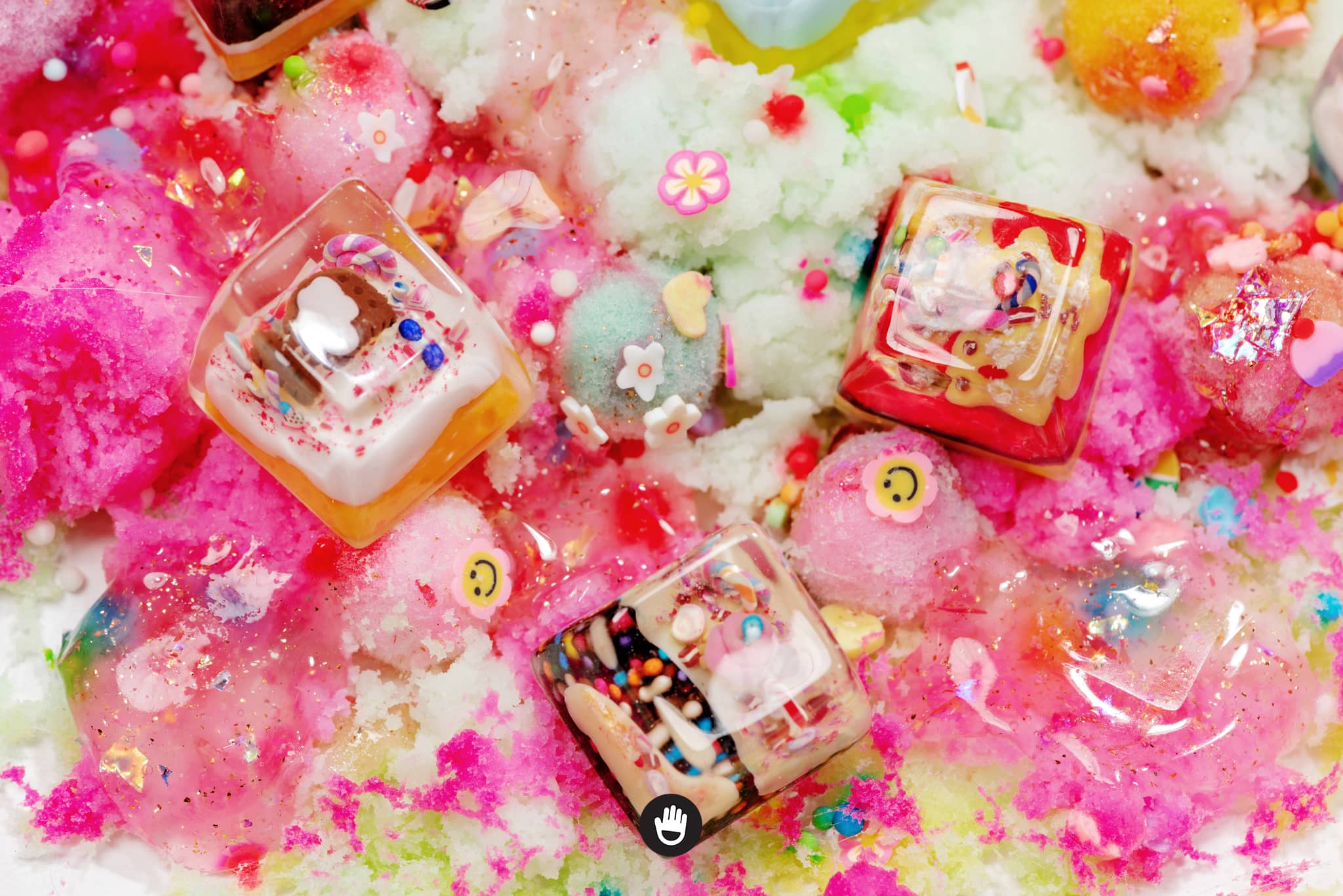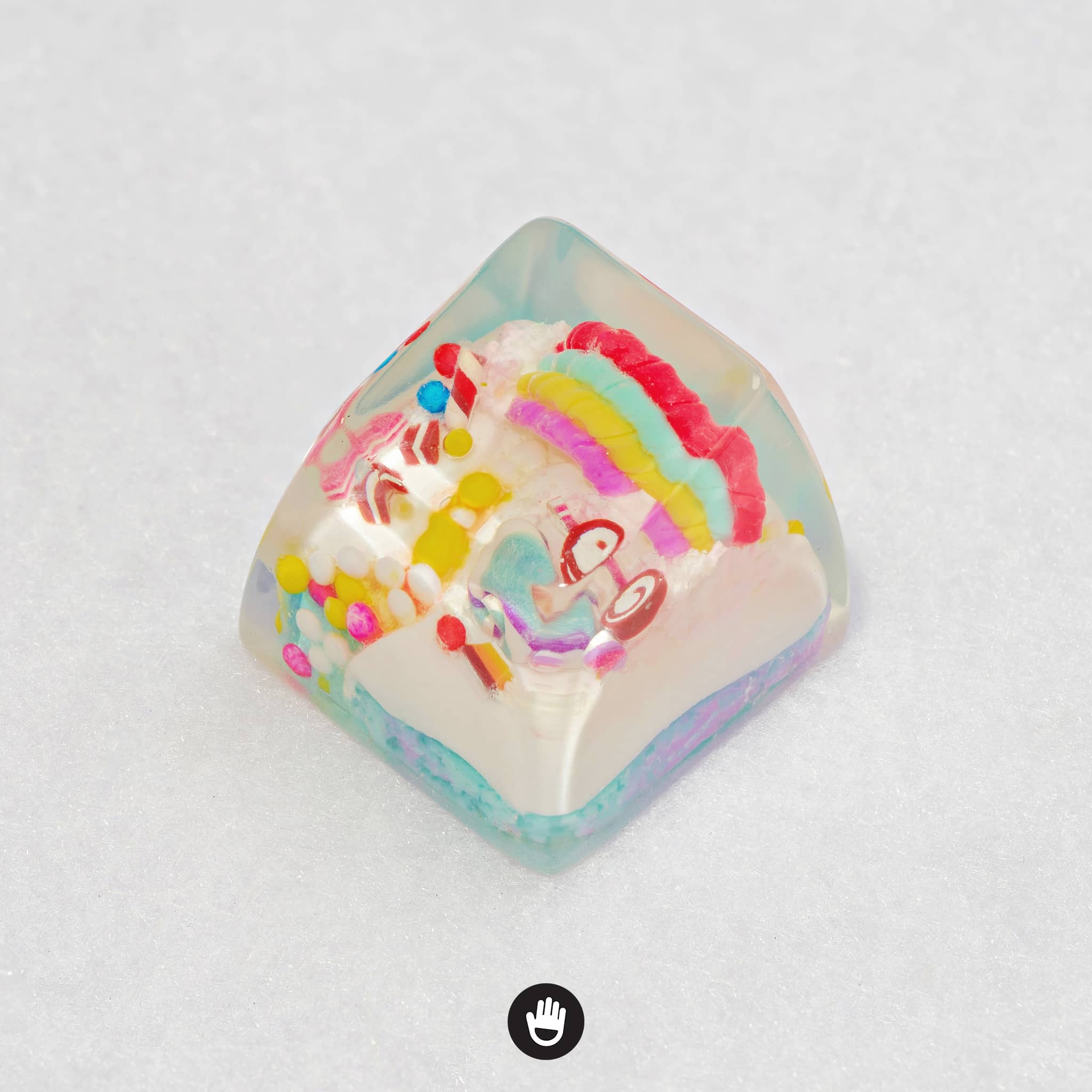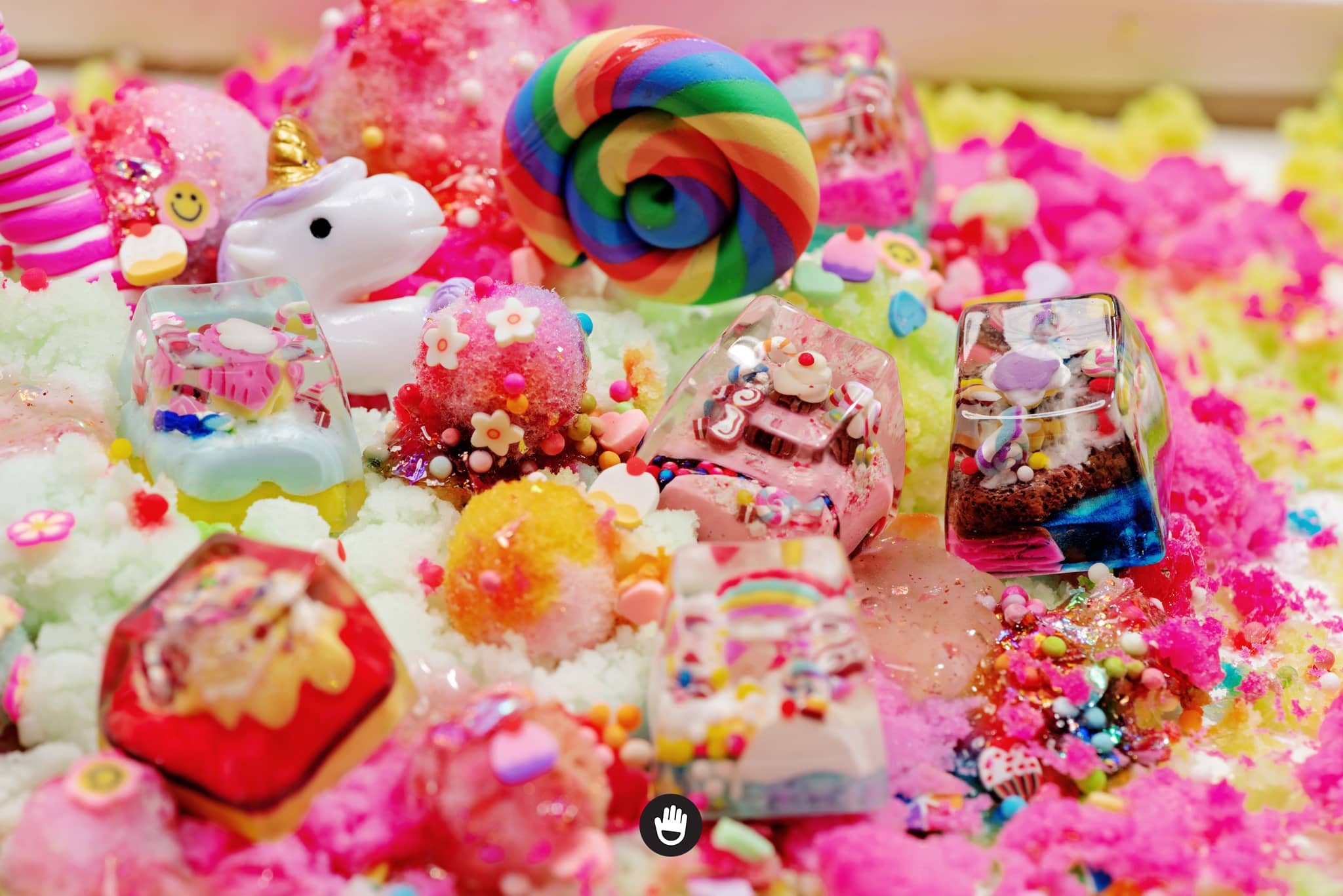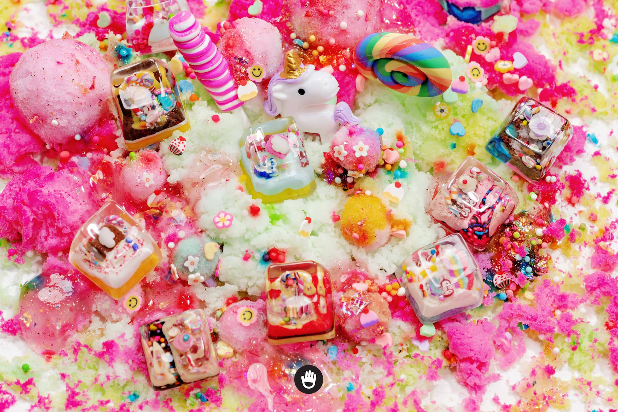 All candies, sweet stuff, cream and cake houses are hand sculpted, piece by piece. And sticked together in each individual keycap. Finally they would be casted with glorious transparent resin and flourished until they’re smooth and shine.