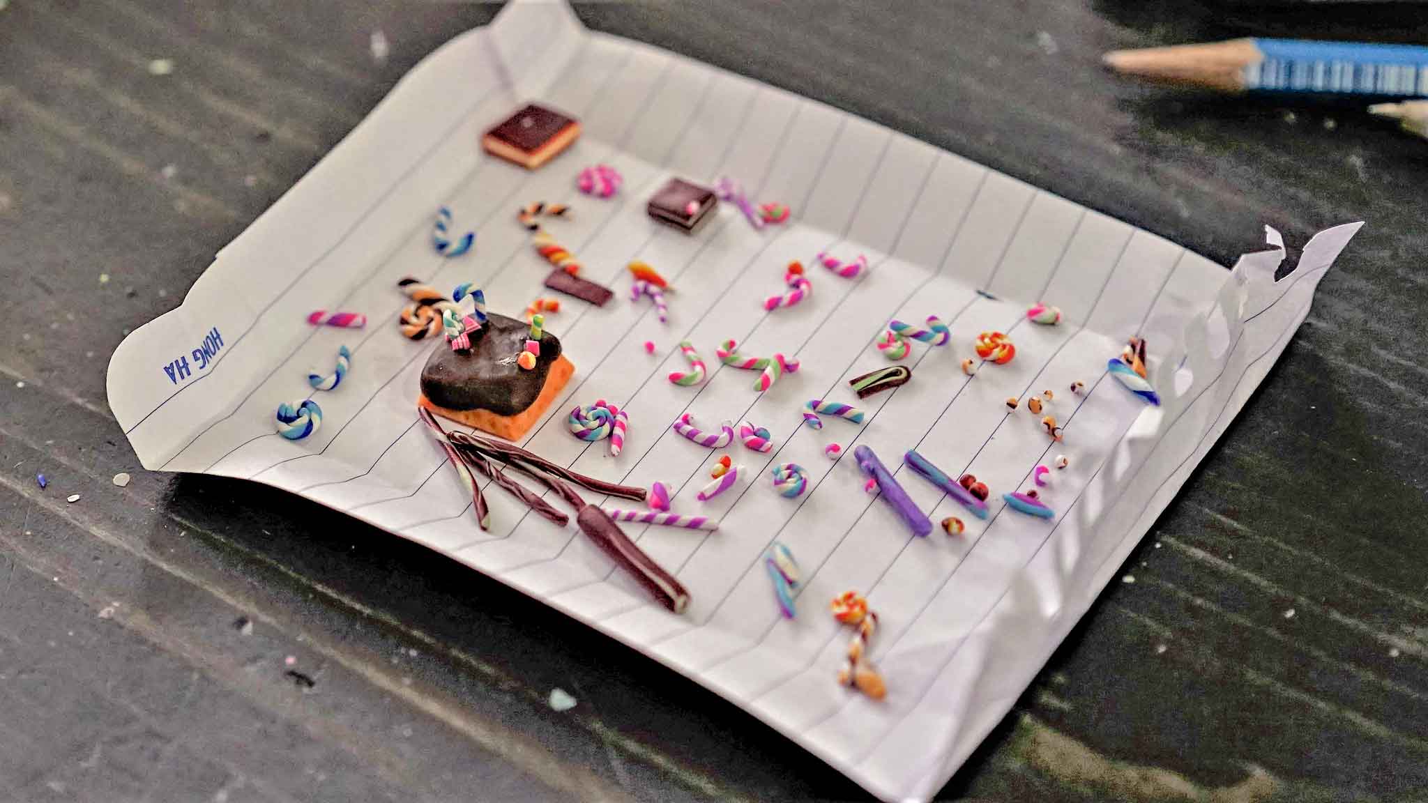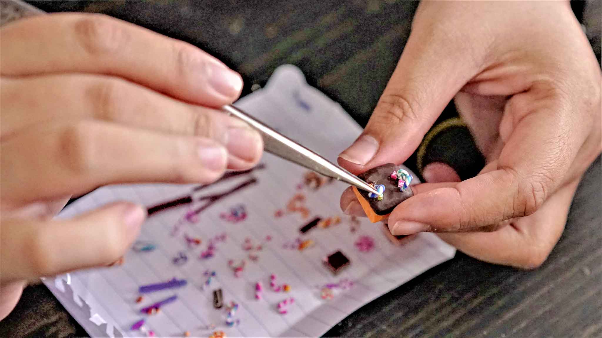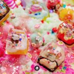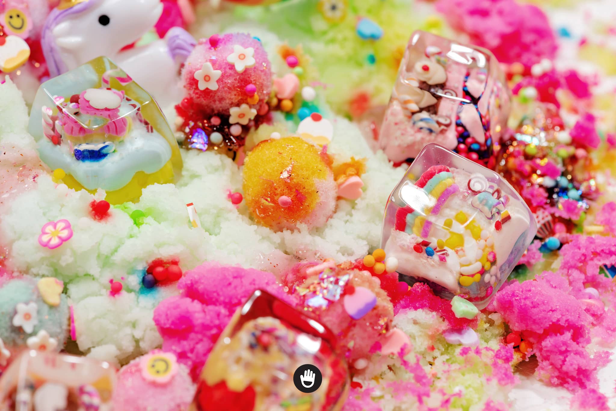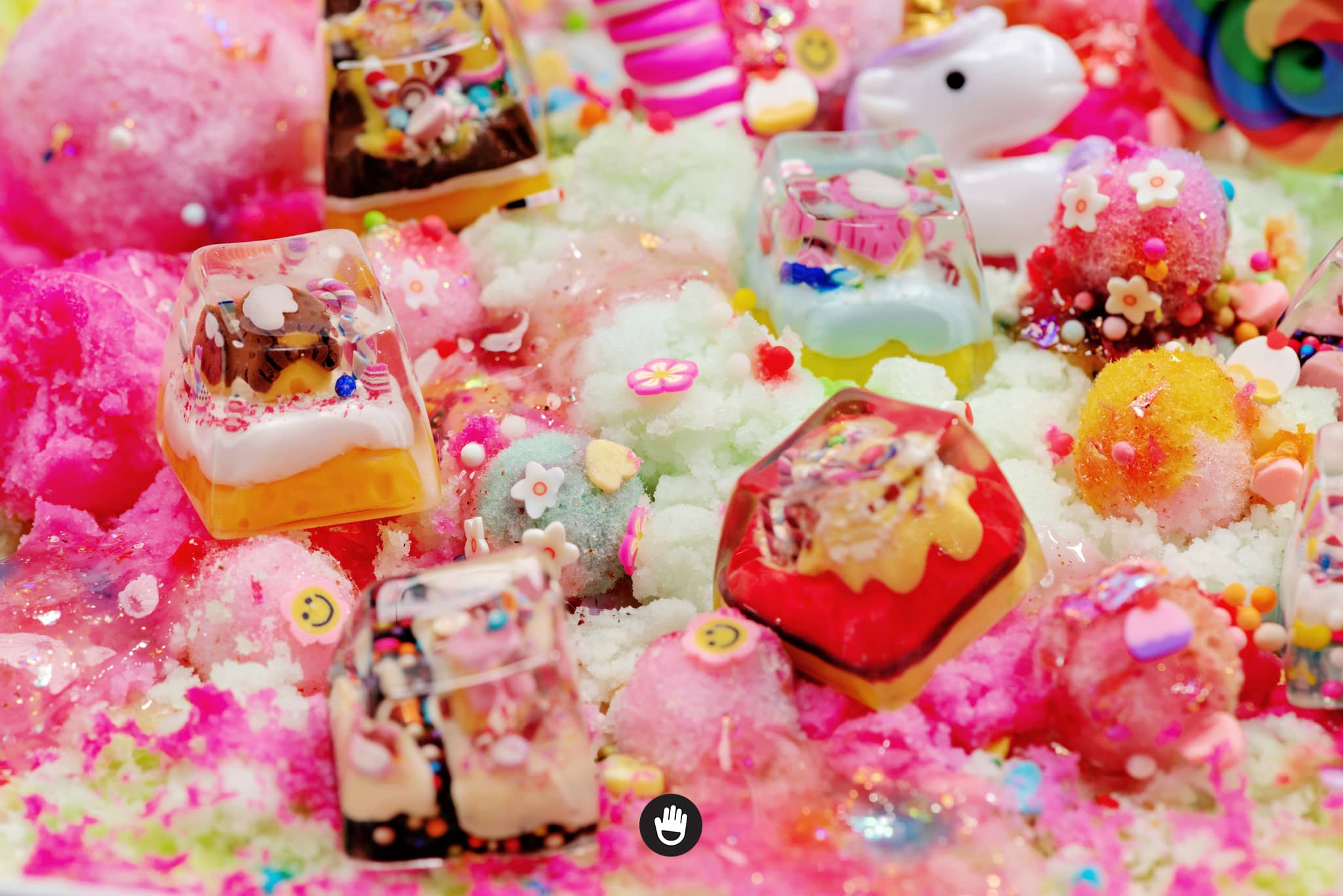 All candies, sweet stuff, cream and cake houses are hand sculpted, piece by piece. And sticked together in each individual keycap. Finally they would be casted with glorious transparent resin and flourished until they’re smooth and shine.