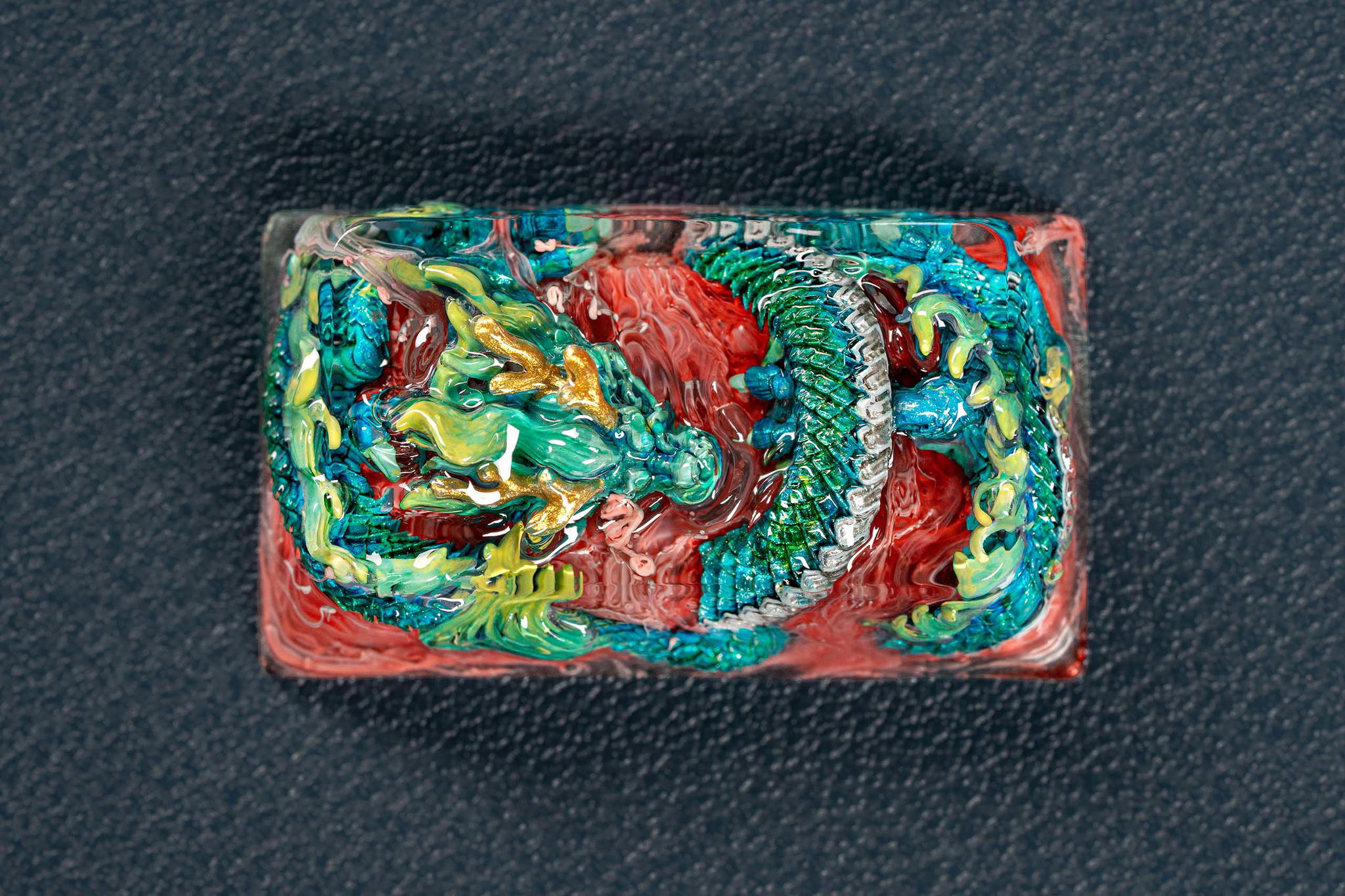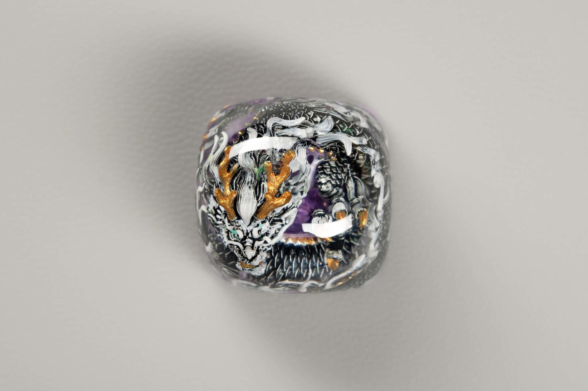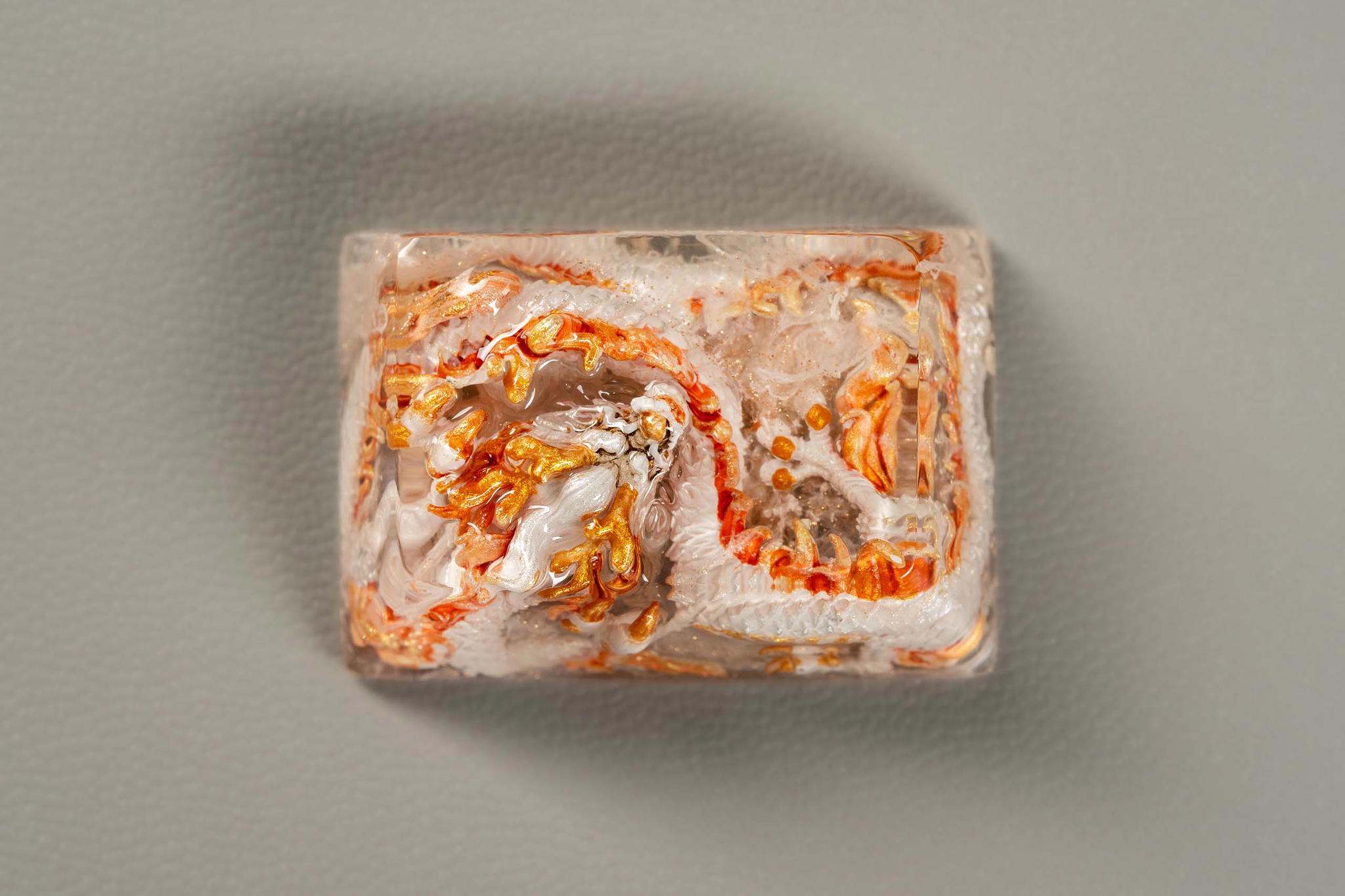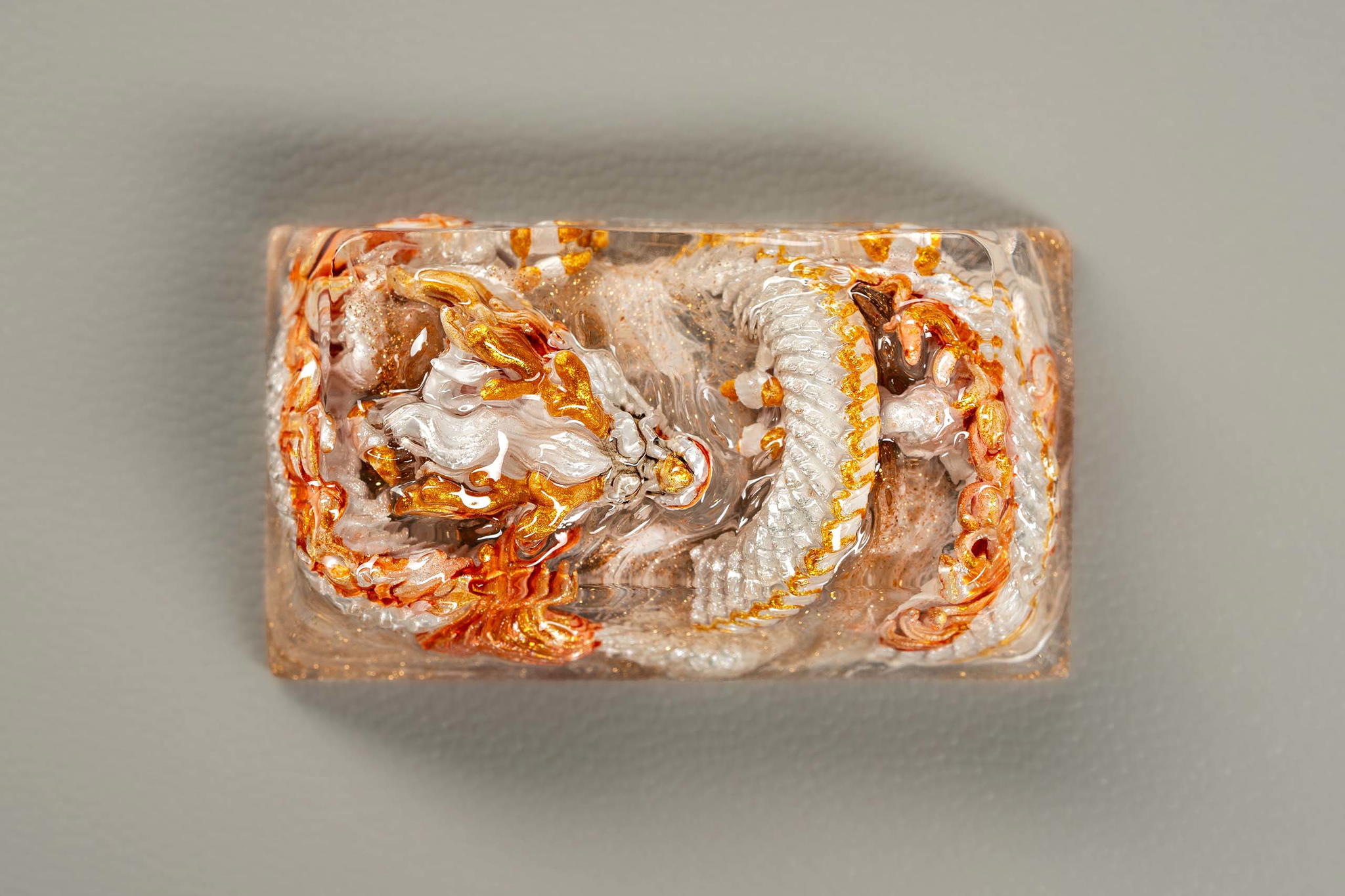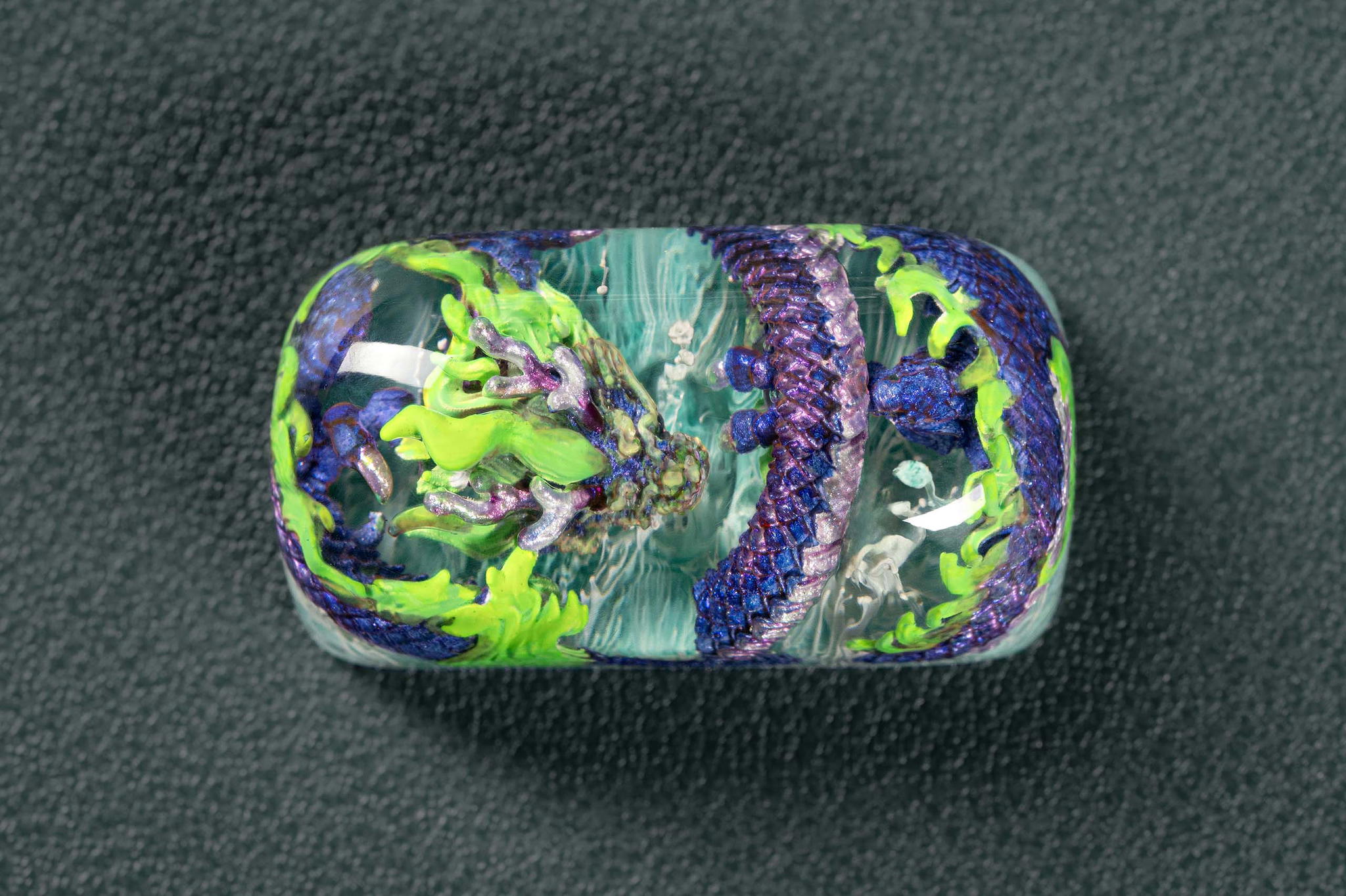 Unlike other makers who use 3D printing and painting technology, Jelly Key creates dragons through a complex multi-layer casting technique, resulting in completely handcrafted, sharp details. Polishing the keycap after removing it from the mold is also a big challenge with a keycap surface that is neither flat nor curved, including corners, the transparent layer surrounding the dragon, and the hard-to-define curve of the ripples. All are sanded through 4 different levels of sandpaper and polished twice by machine to achieve the highest level of finish.