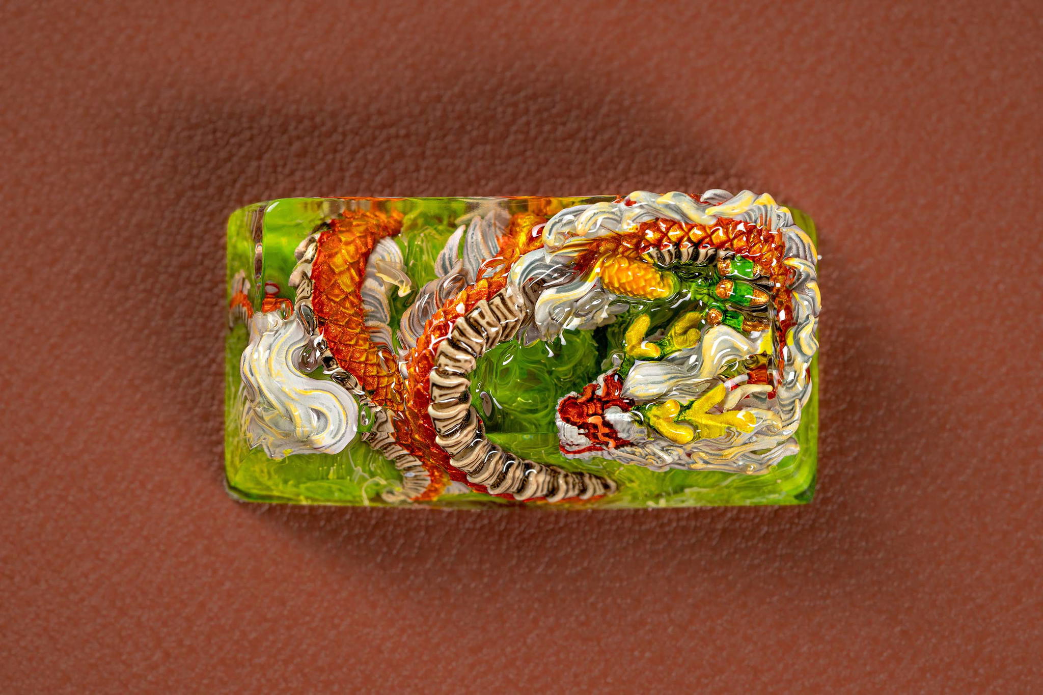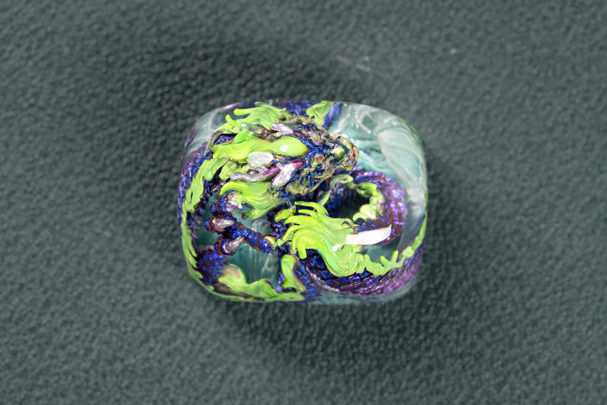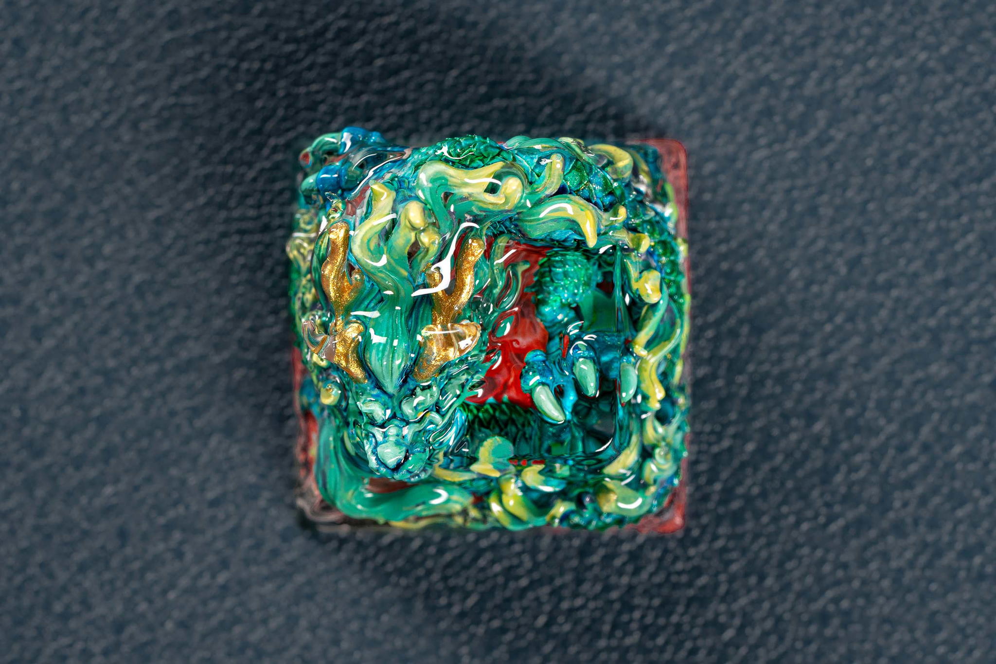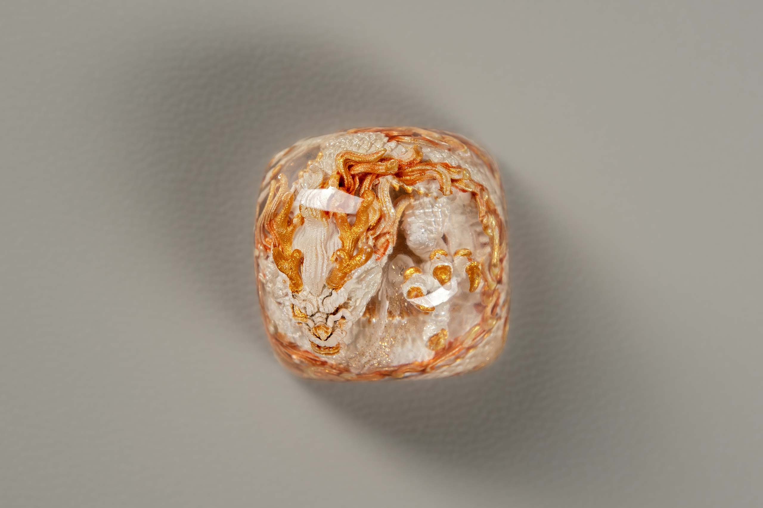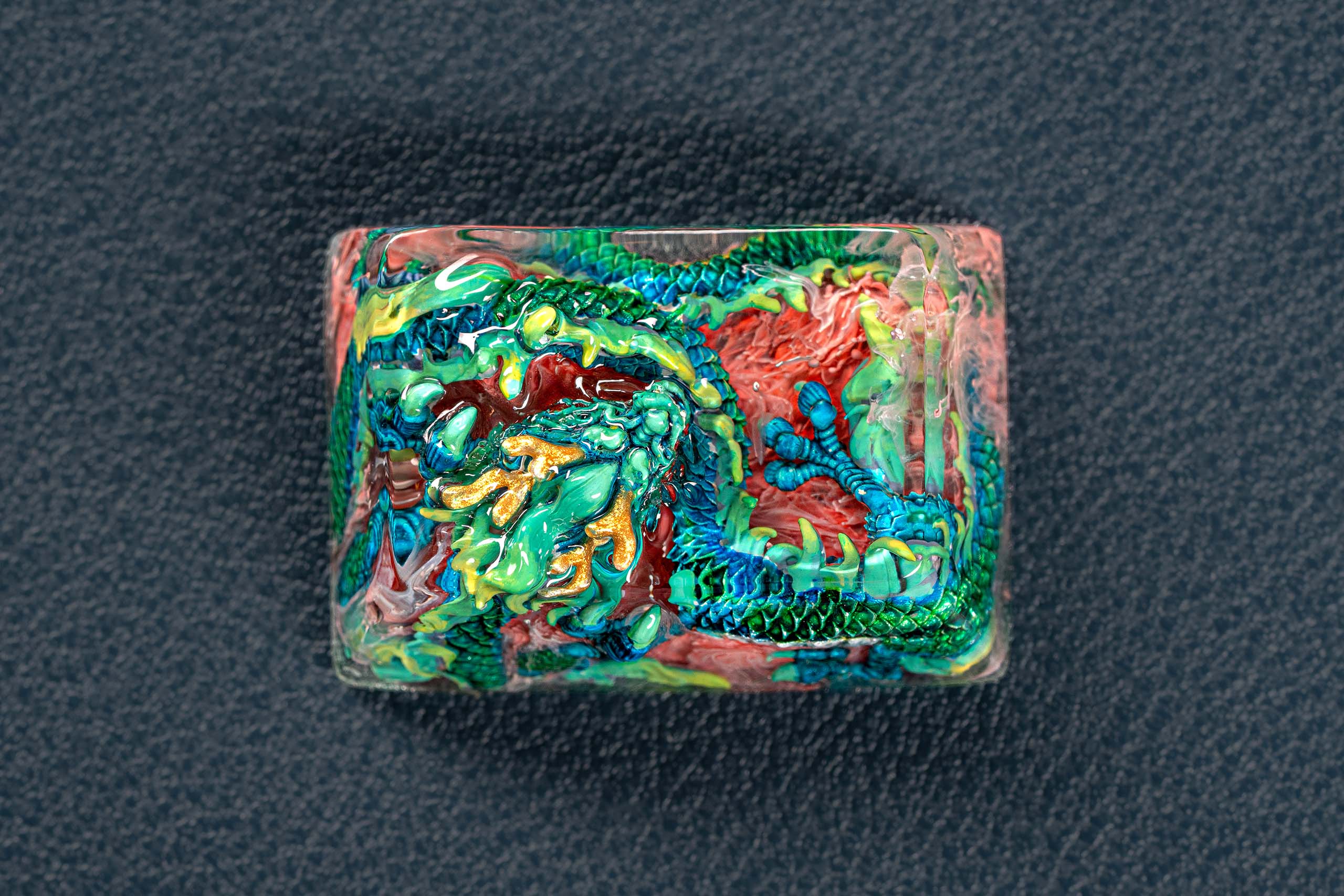 Unlike other makers who use 3D printing and painting technology, Jelly Key creates dragons through a complex multi-layer casting technique, resulting in completely handcrafted, sharp details. Polishing the keycap after removing it from the mold is also a big challenge with a keycap surface that is neither flat nor curved, including corners, the transparent layer surrounding the dragon, and the hard-to-define curve of the ripples. All are sanded through 4 different levels of sandpaper and polished twice by machine to achieve the highest level of finish.