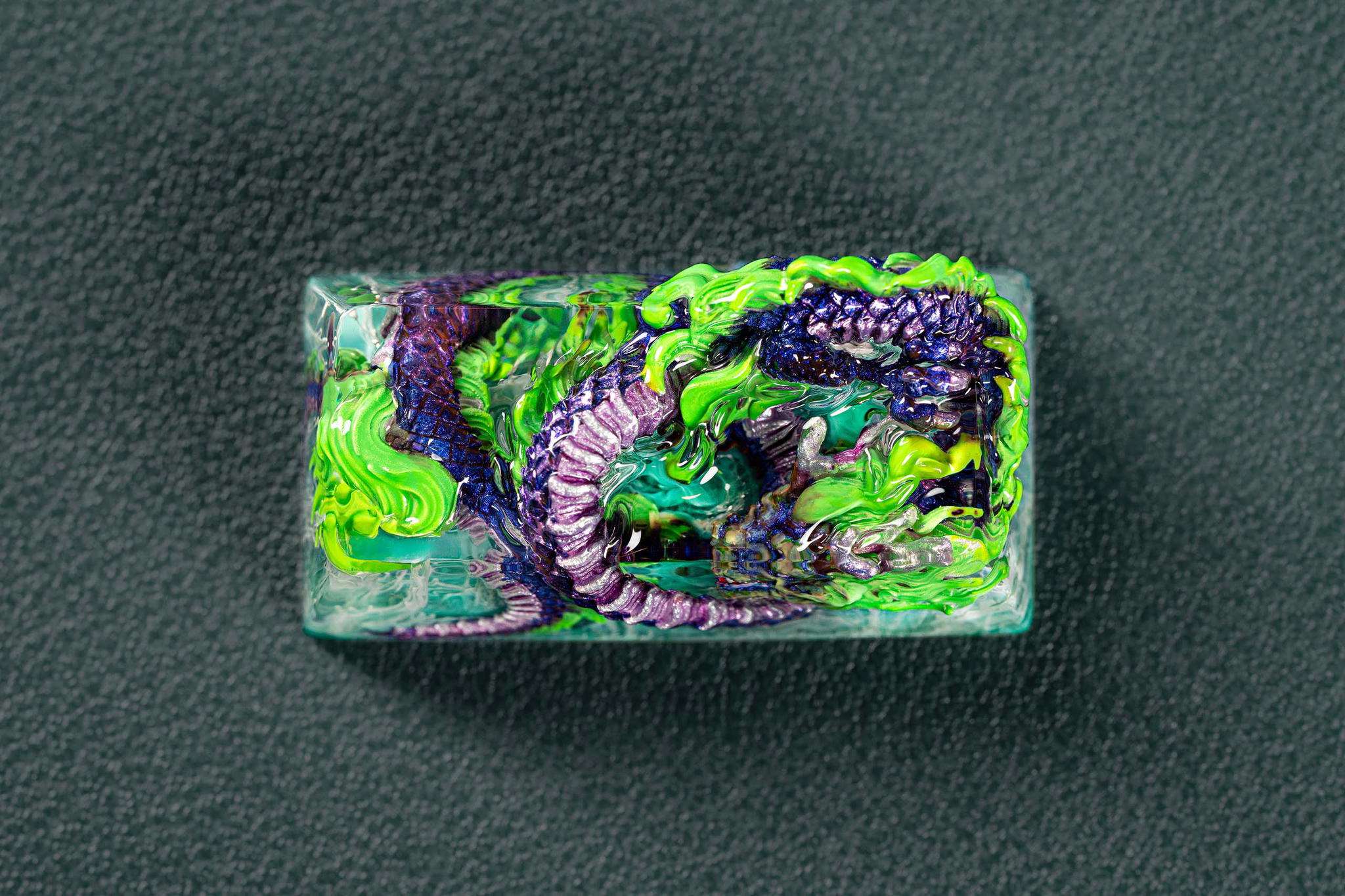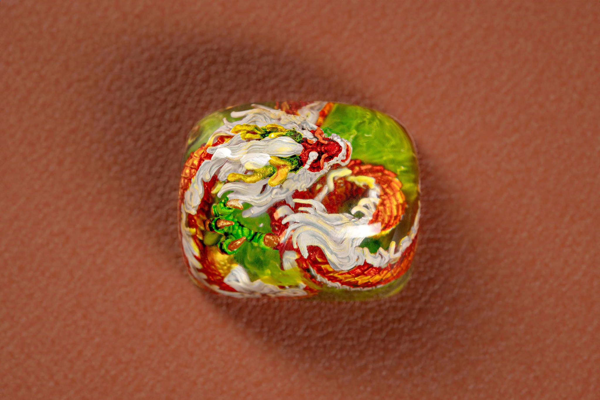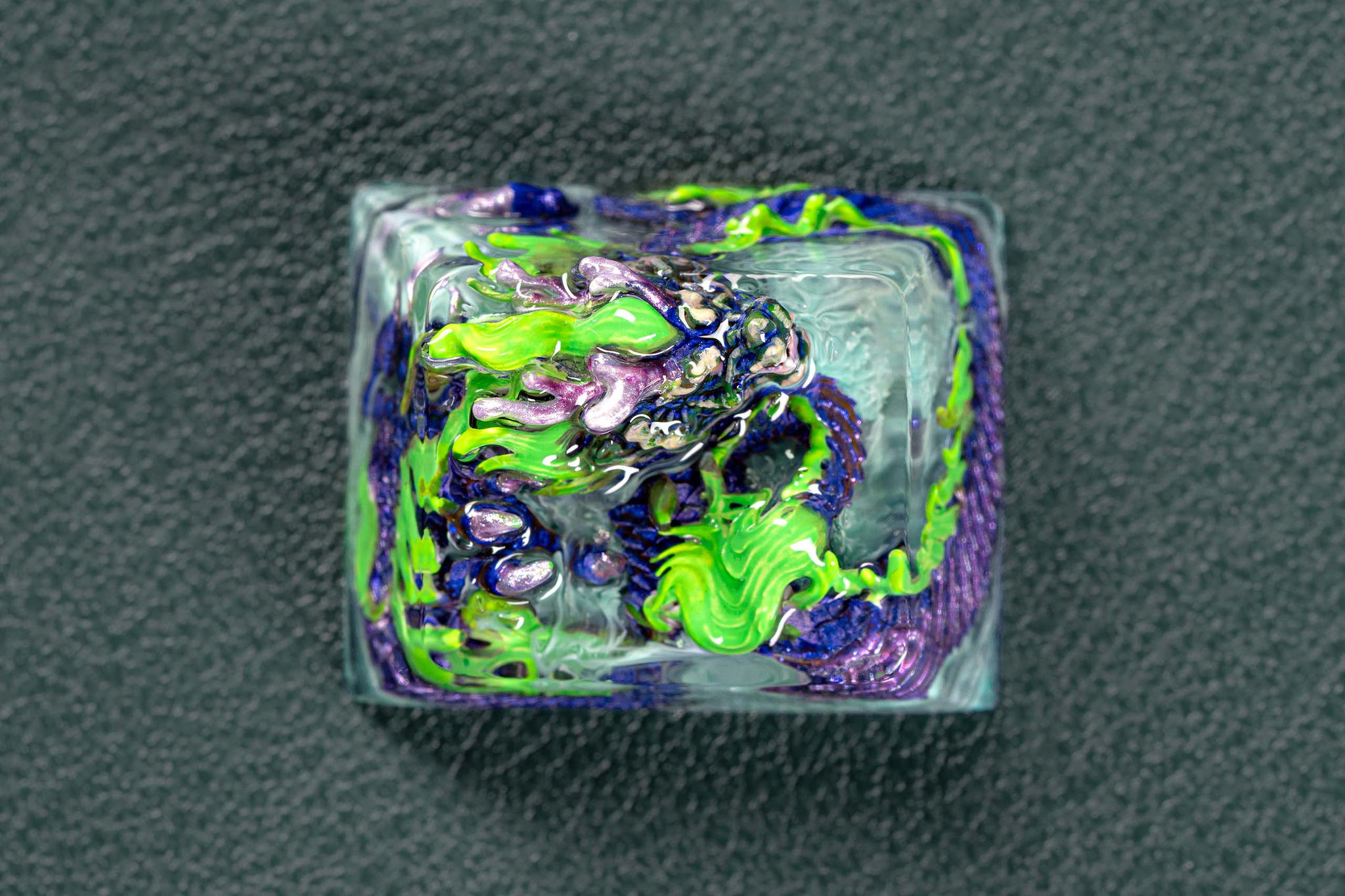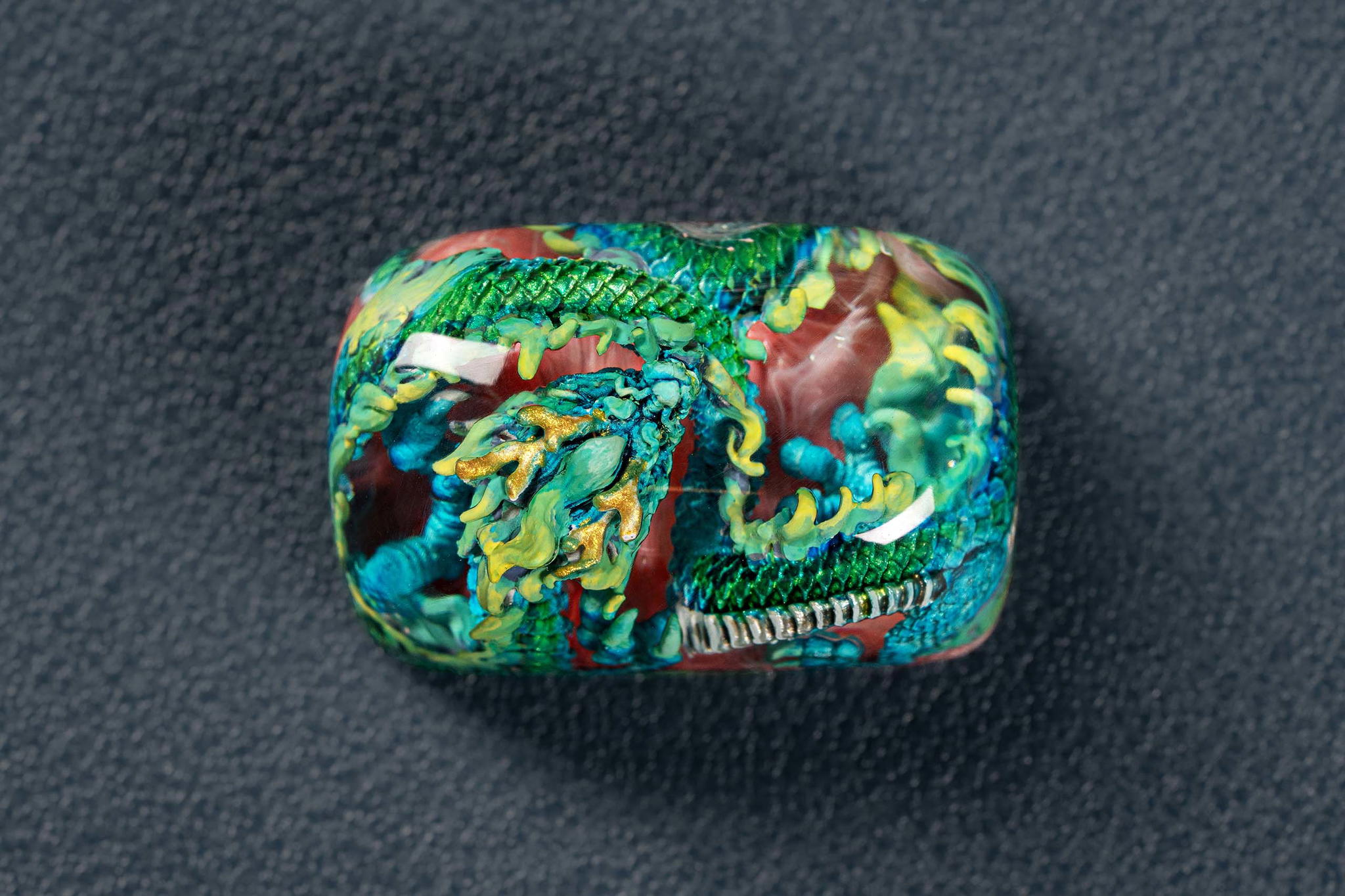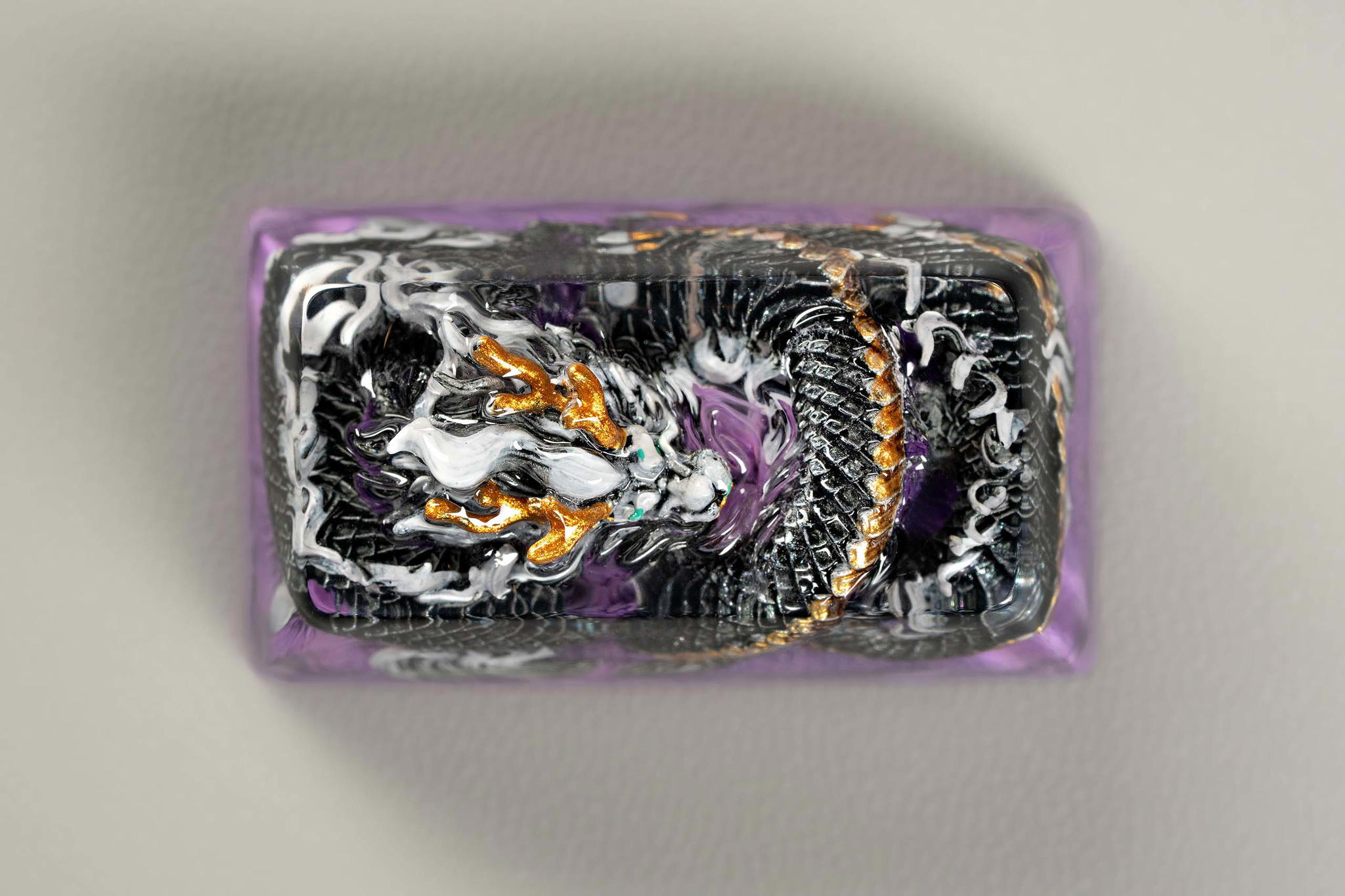 Unlike other makers who use 3D printing and painting technology, Jelly Key creates dragons through a complex multi-layer casting technique, resulting in completely handcrafted, sharp details. Polishing the keycap after removing it from the mold is also a big challenge with a keycap surface that is neither flat nor curved, including corners, the transparent layer surrounding the dragon, and the hard-to-define curve of the ripples. All are sanded through 4 different levels of sandpaper and polished twice by machine to achieve the highest level of finish.