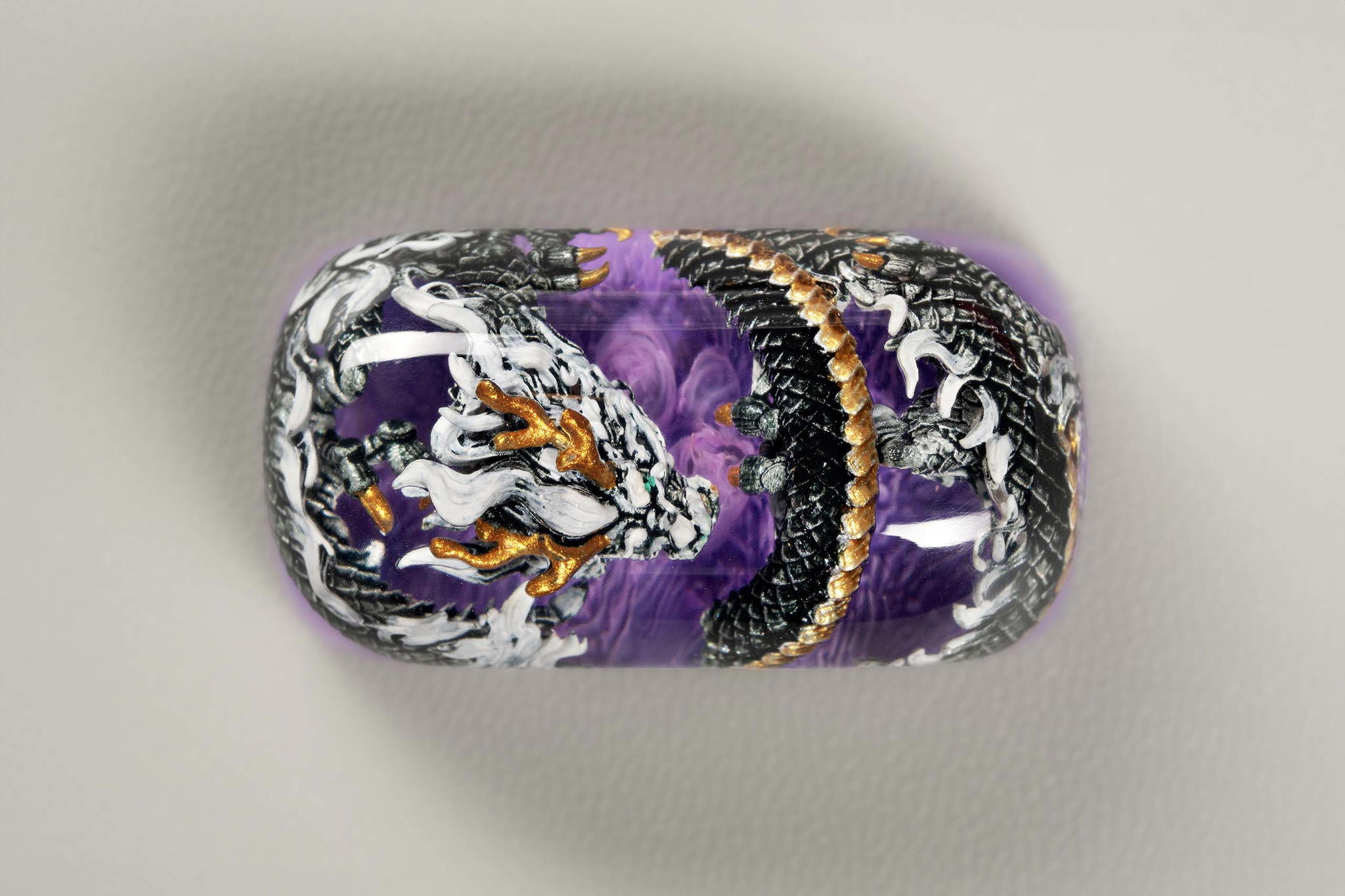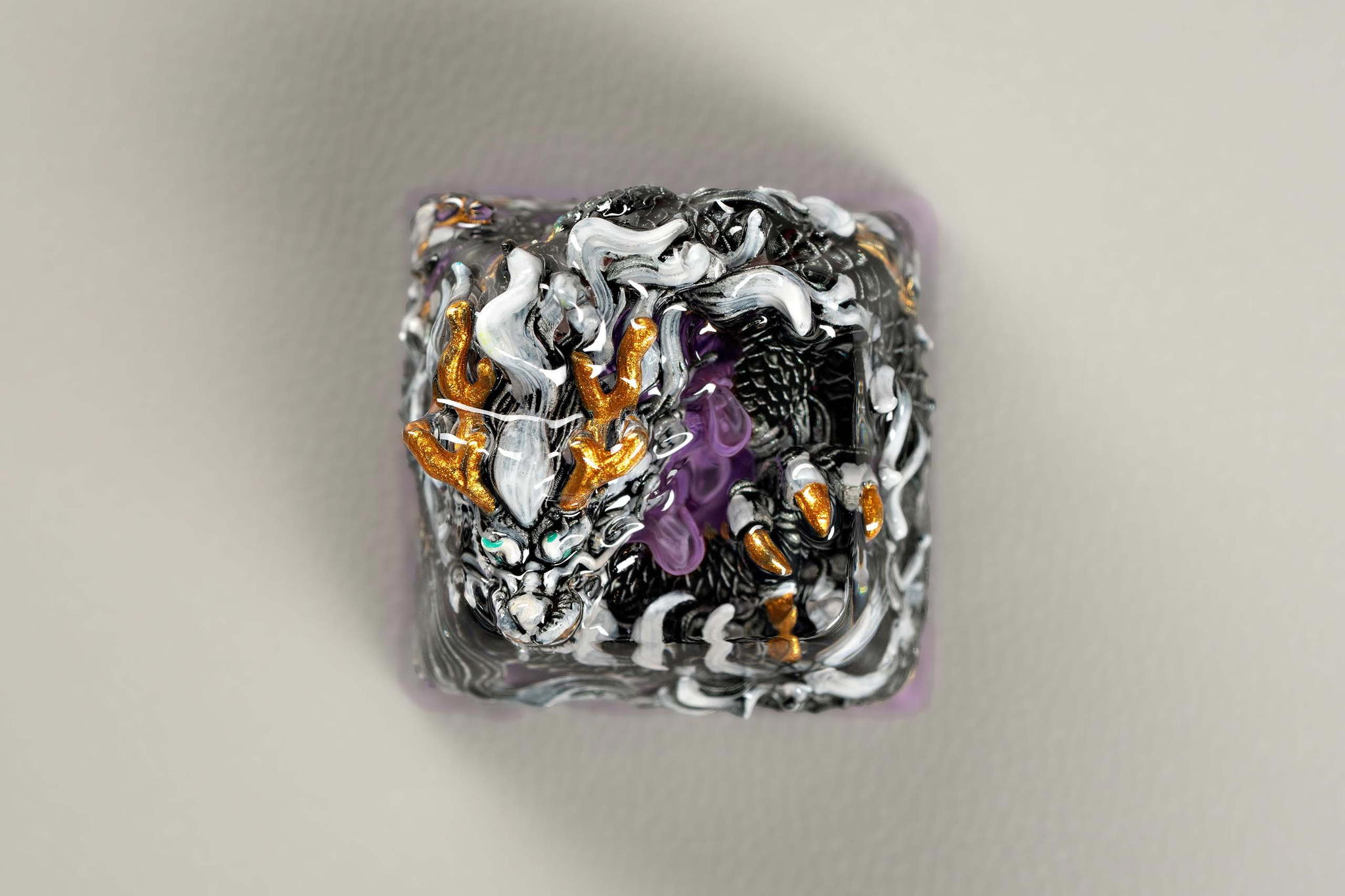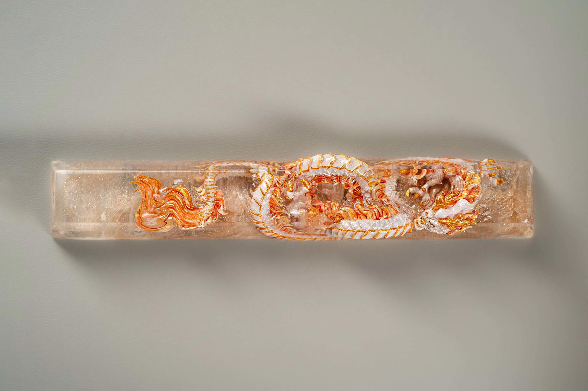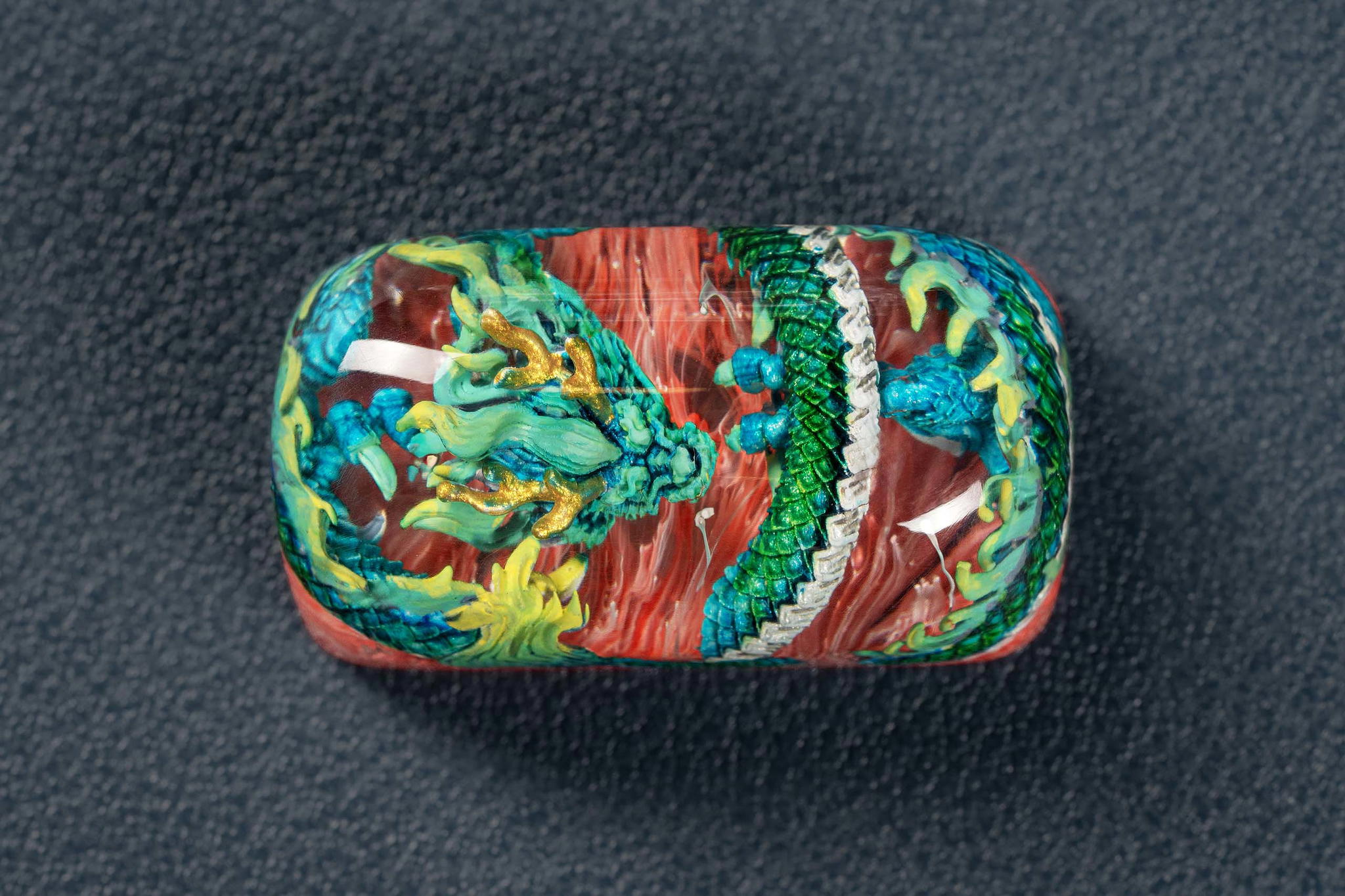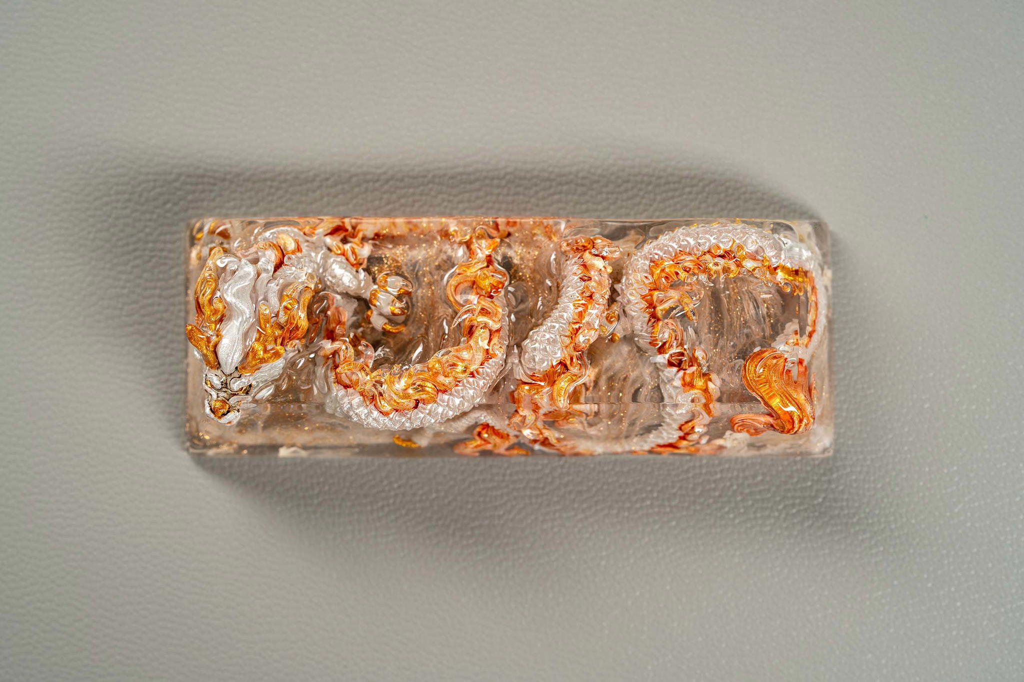 Unlike other makers who use 3D printing and painting technology, Jelly Key creates dragons through a complex multi-layer casting technique, resulting in completely handcrafted, sharp details. Polishing the keycap after removing it from the mold is also a big challenge with a keycap surface that is neither flat nor curved, including corners, the transparent layer surrounding the dragon, and the hard-to-define curve of the ripples. All are sanded through 4 different levels of sandpaper and polished twice by machine to achieve the highest level of finish.
