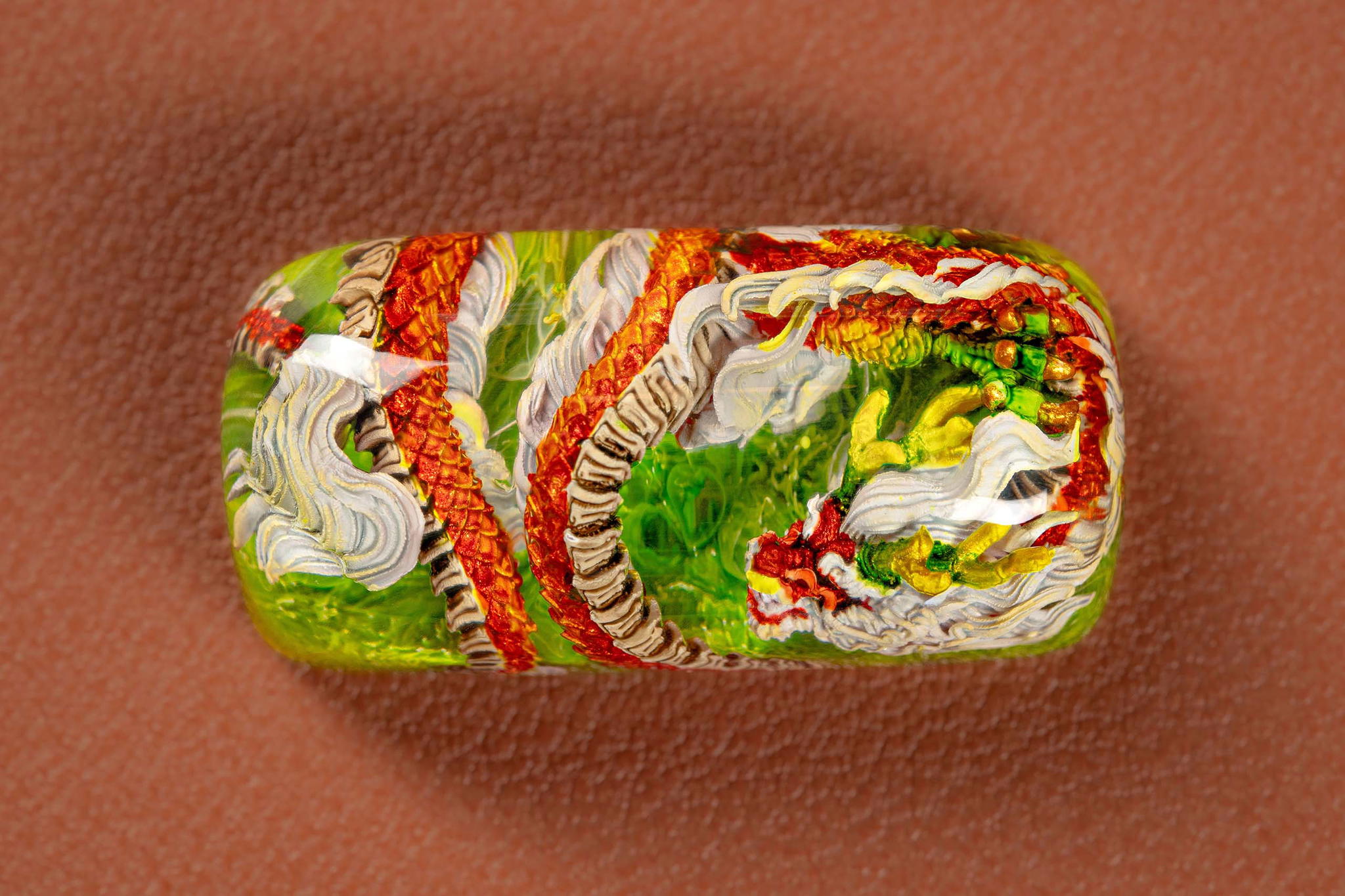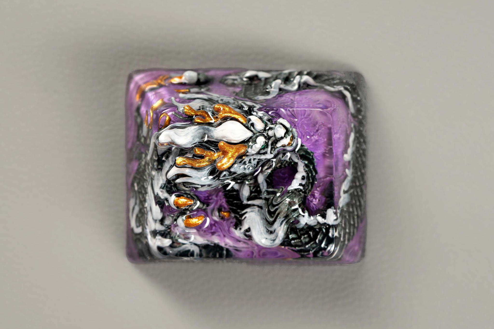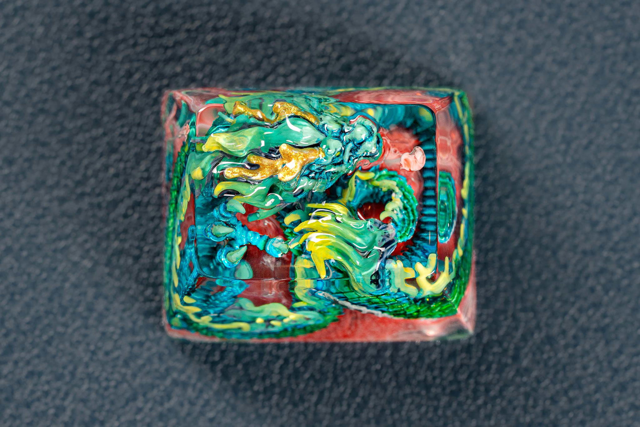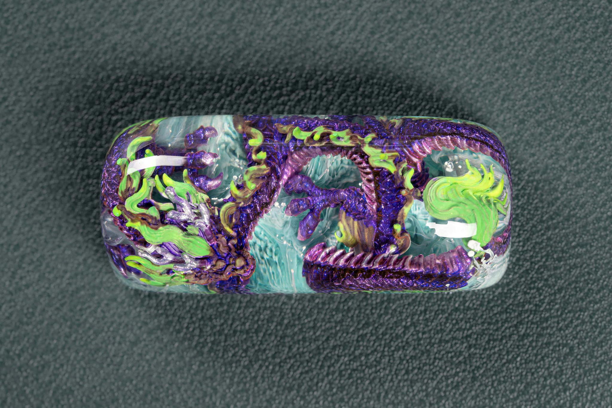 Unlike other makers who use 3D printing and painting technology, Jelly Key creates dragons through a complex multi-layer casting technique, resulting in completely handcrafted, sharp details. Polishing the keycap after removing it from the mold is also a big challenge with a keycap surface that is neither flat nor curved, including corners, the transparent layer surrounding the dragon, and the hard-to-define curve of the ripples. All are sanded through 4 different levels of sandpaper and polished twice by machine to achieve the highest level of finish.