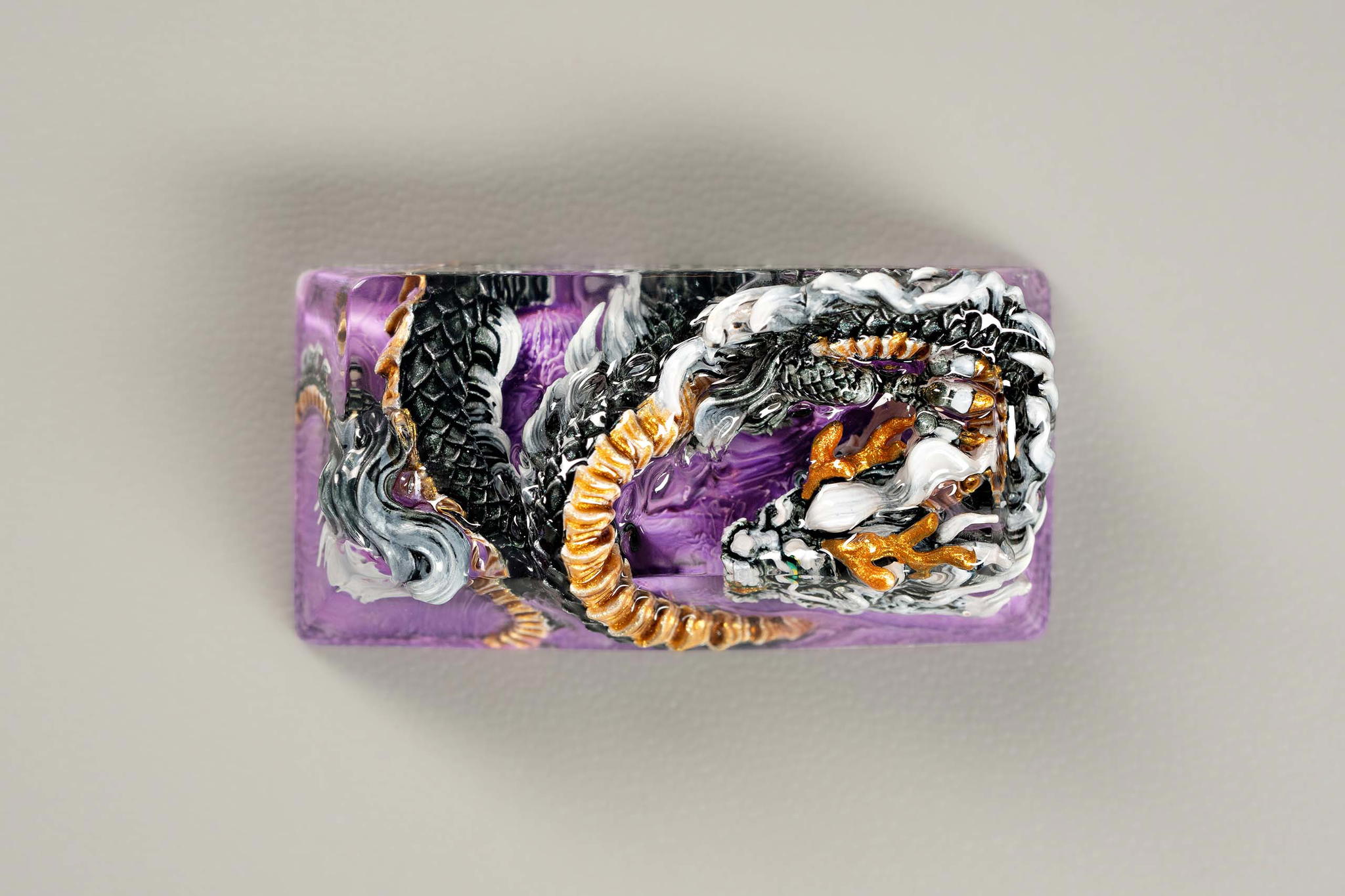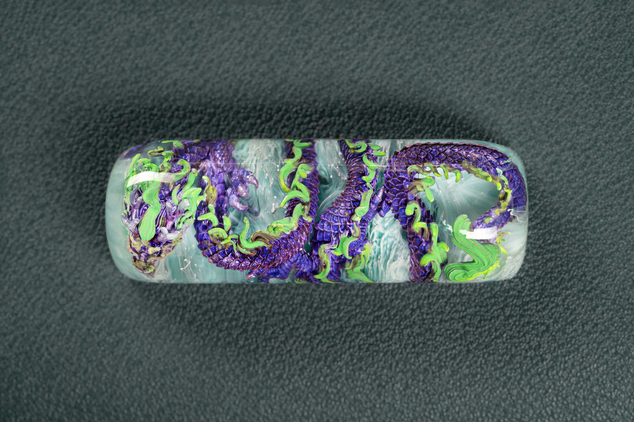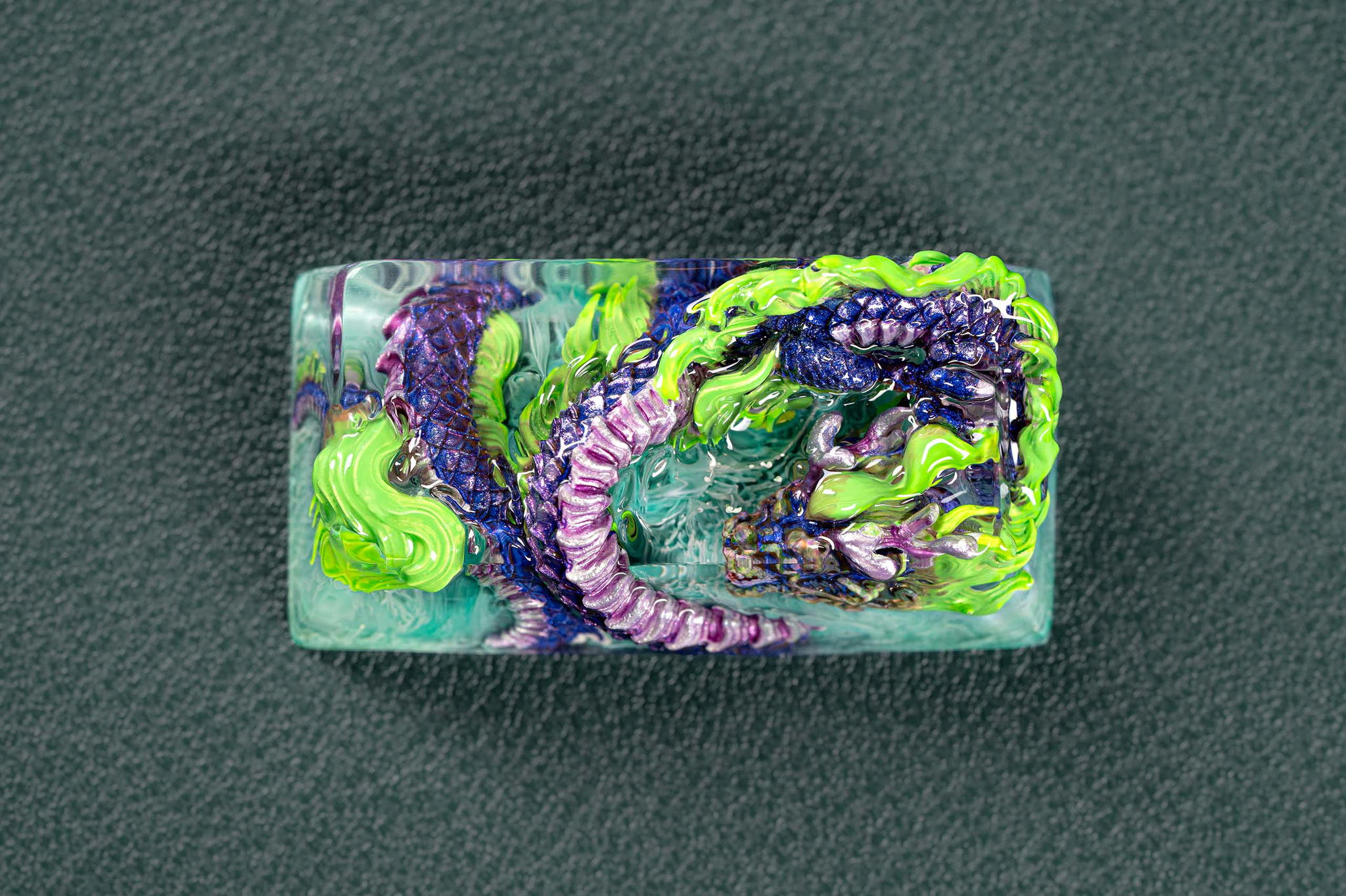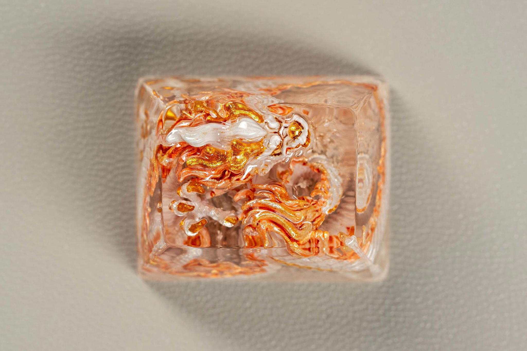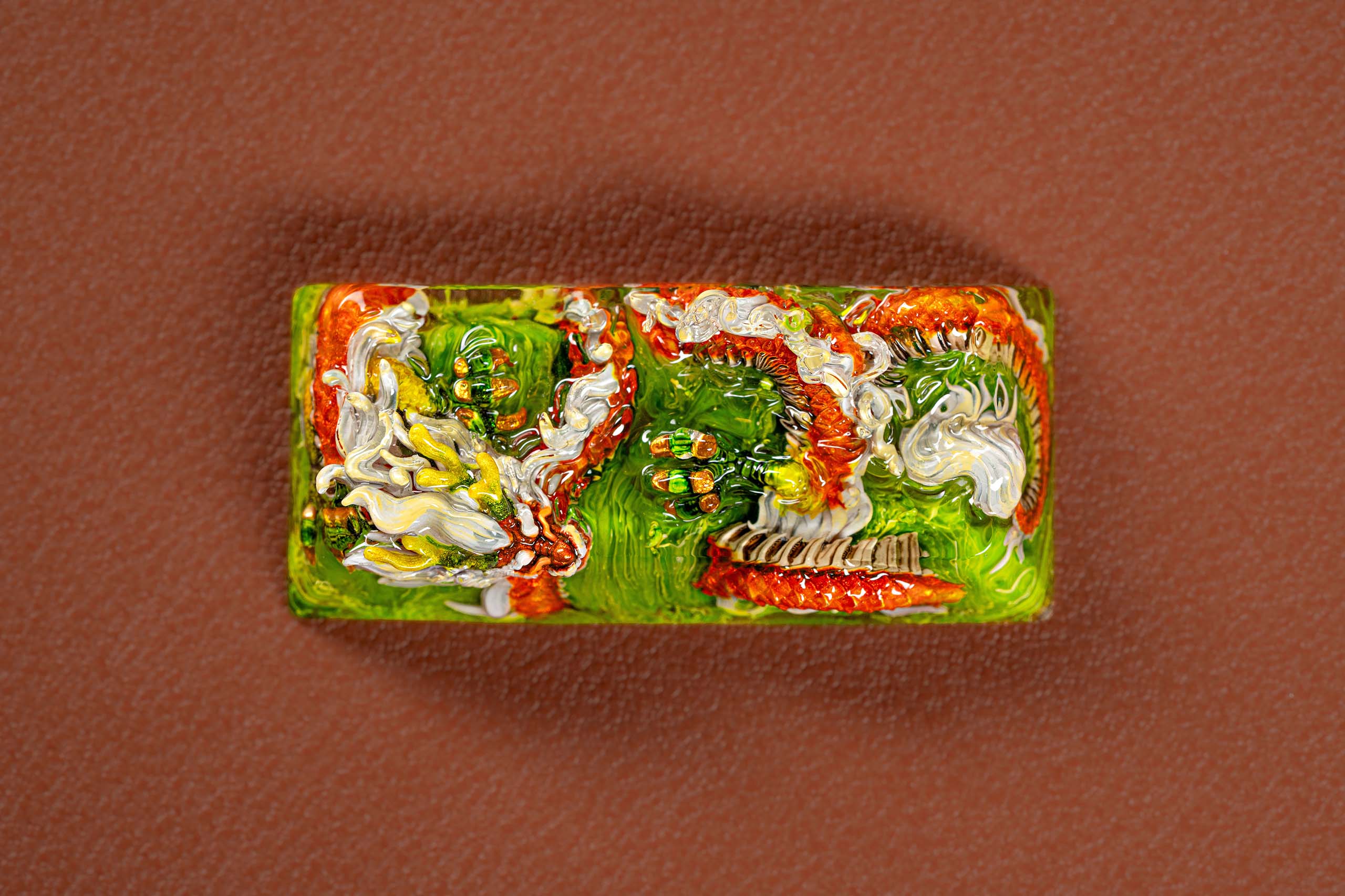 Unlike other makers who use 3D printing and painting technology, Jelly Key creates dragons through a complex multi-layer casting technique, resulting in completely handcrafted, sharp details. Polishing the keycap after removing it from the mold is also a big challenge with a keycap surface that is neither flat nor curved, including corners, the transparent layer surrounding the dragon, and the hard-to-define curve of the ripples. All are sanded through 4 different levels of sandpaper and polished twice by machine to achieve the highest level of finish.