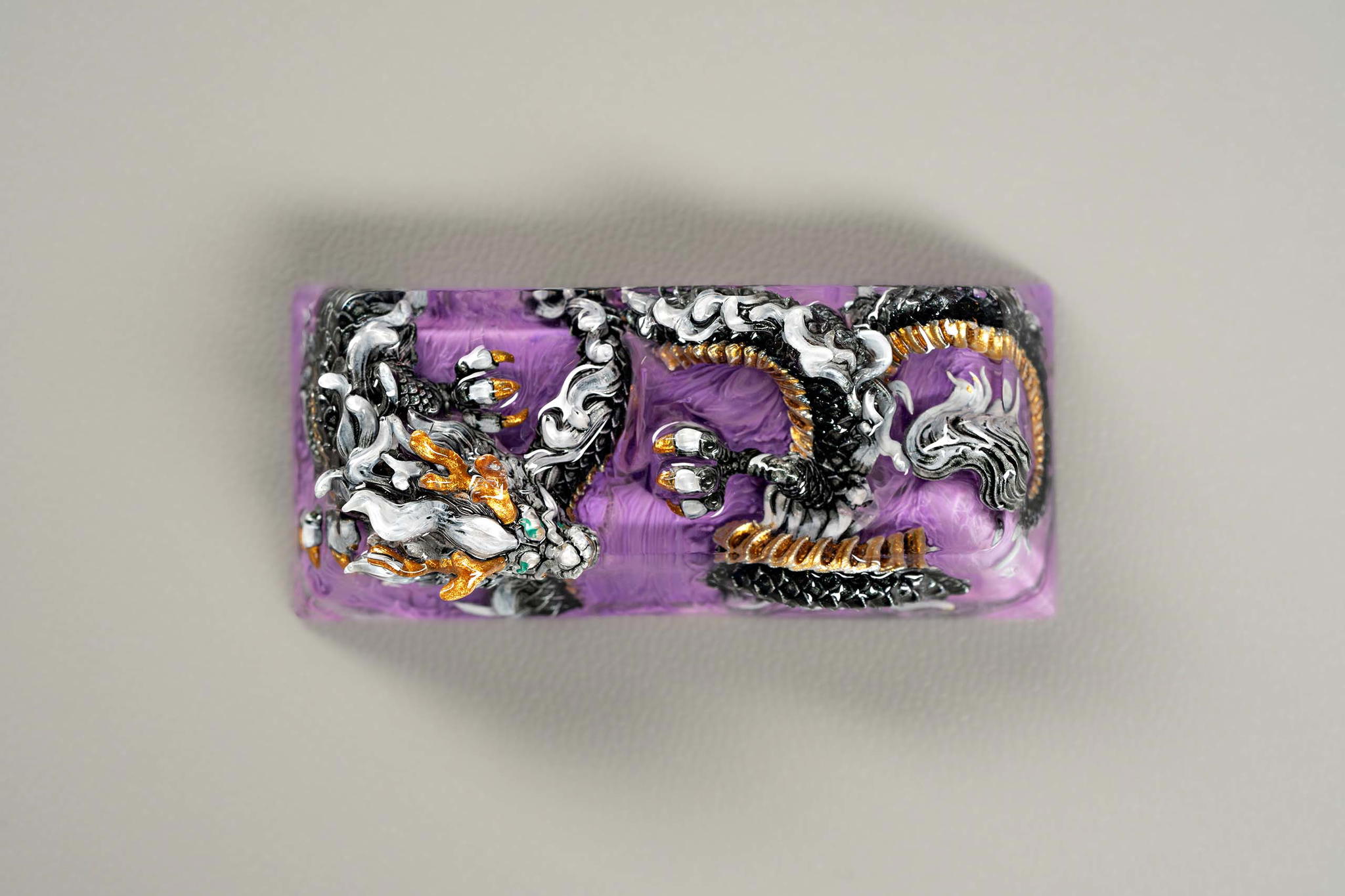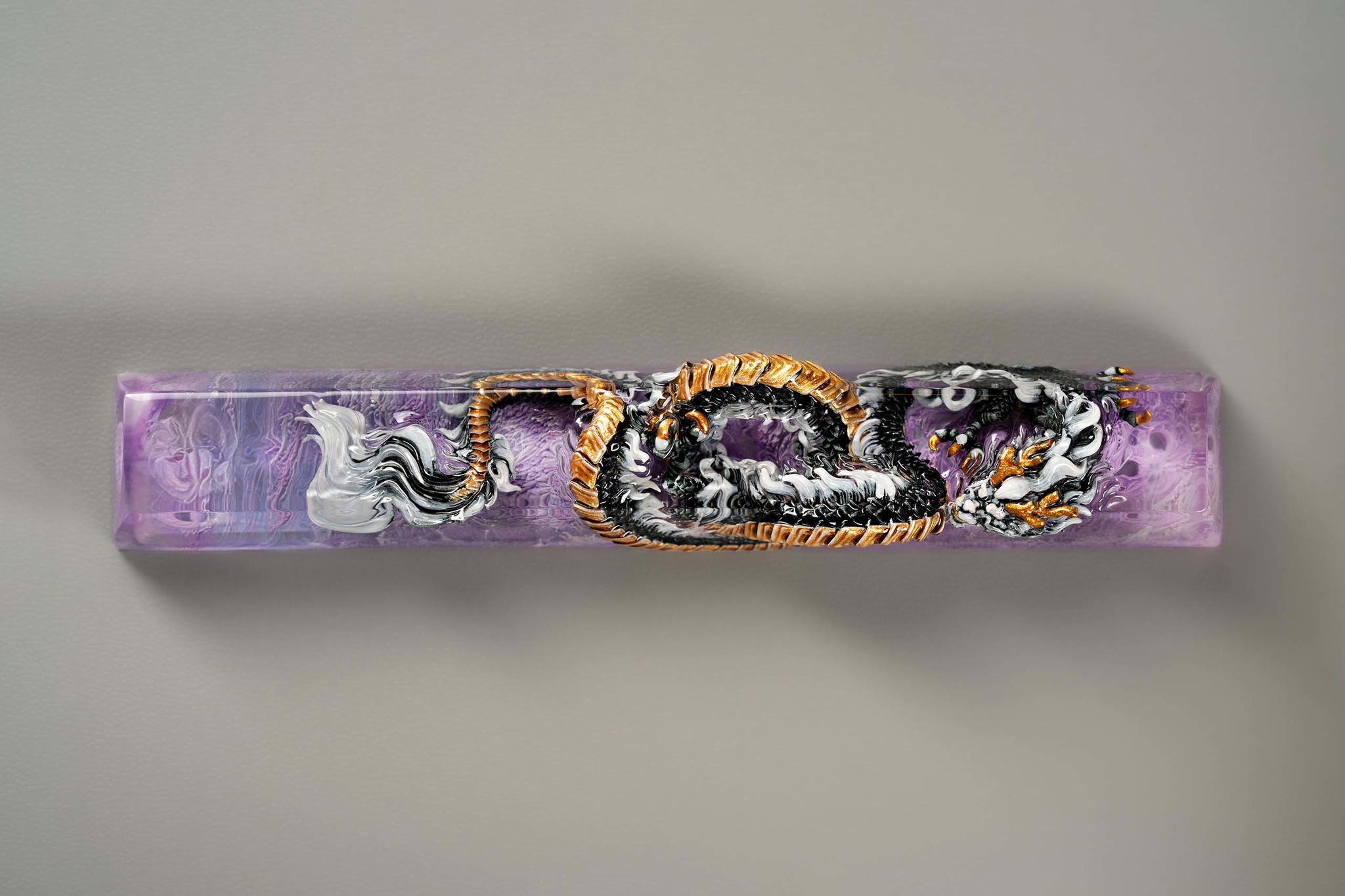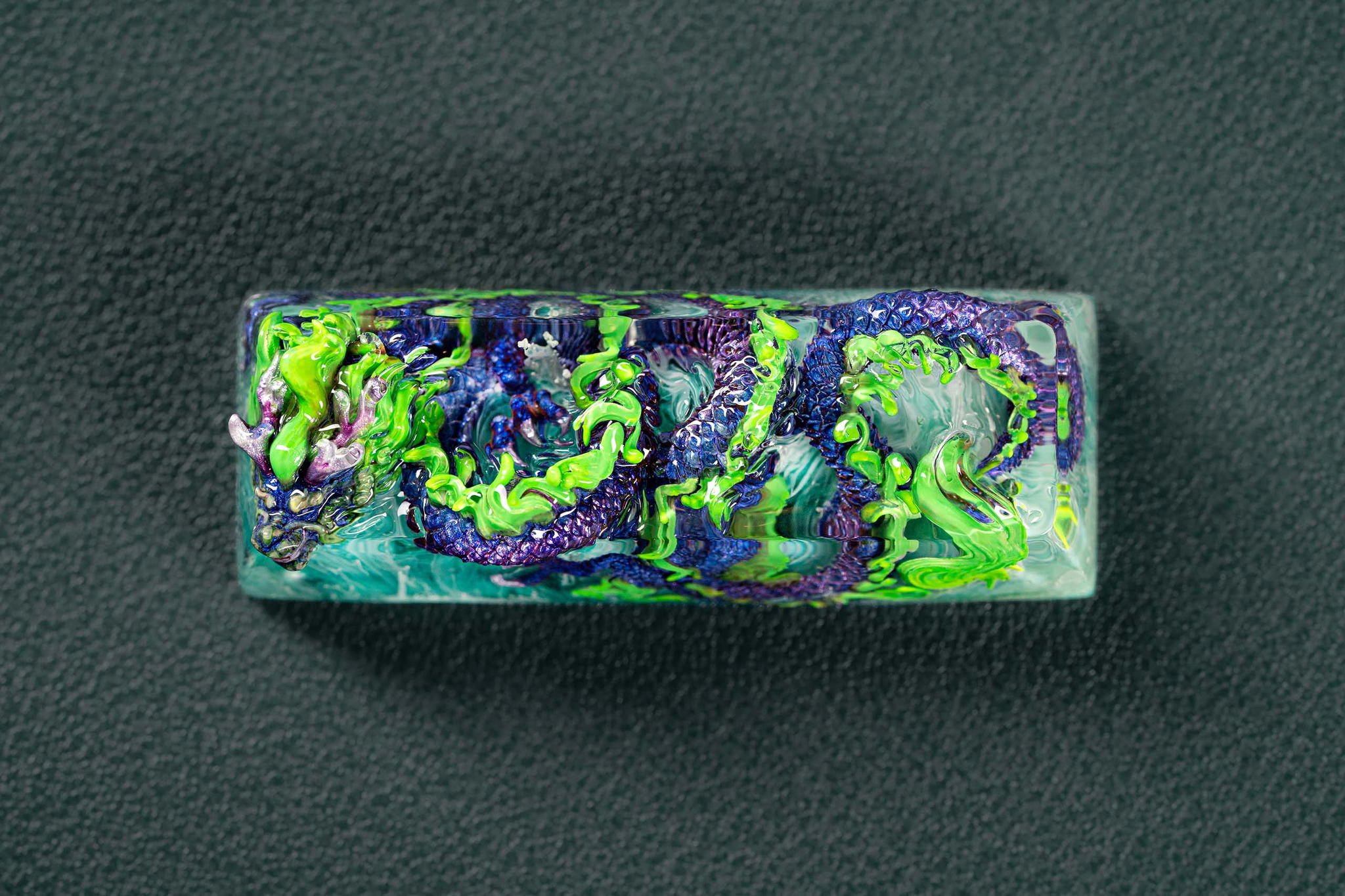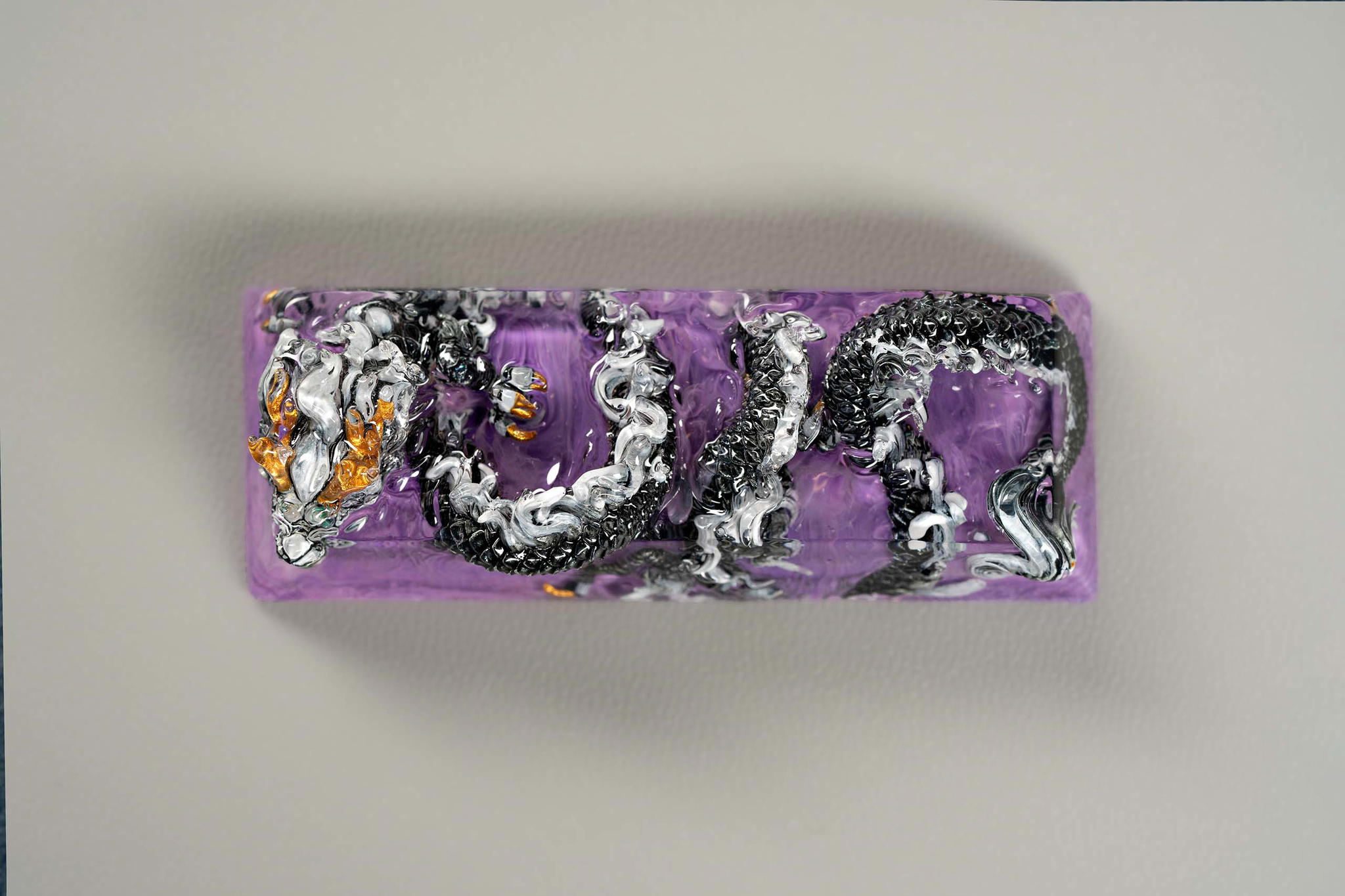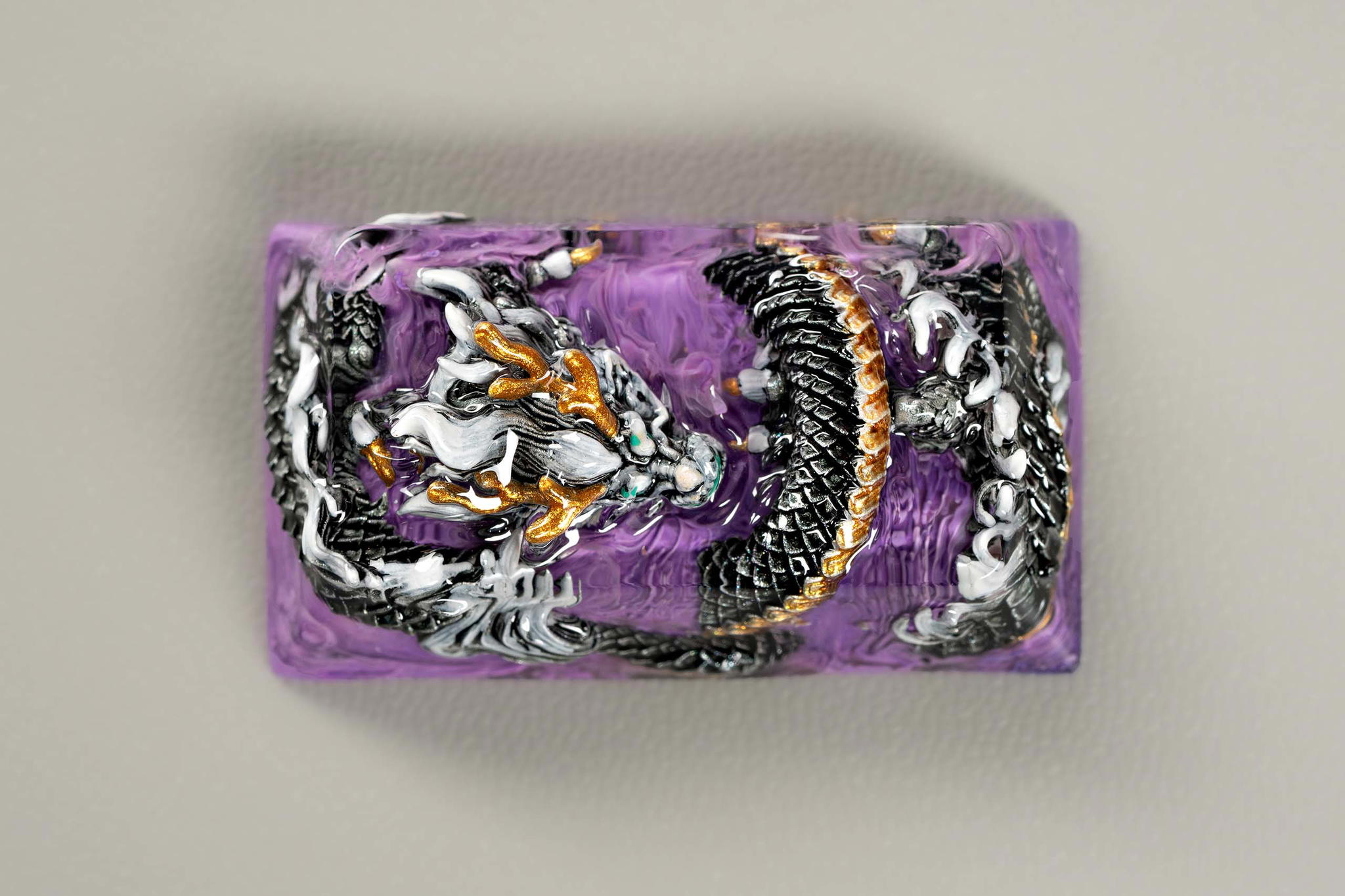Unlike other makers who use 3D printing and painting technology, Jelly Key creates dragons through a complex multi-layer casting technique, resulting in completely handcrafted, sharp details. Polishing the keycap after removing it from the mold is also a big challenge with a keycap surface that is neither flat nor curved, including corners, the transparent layer surrounding the dragon, and the hard-to-define curve of the ripples. All are sanded through 4 different levels of sandpaper and polished twice by machine to achieve the highest level of finish.