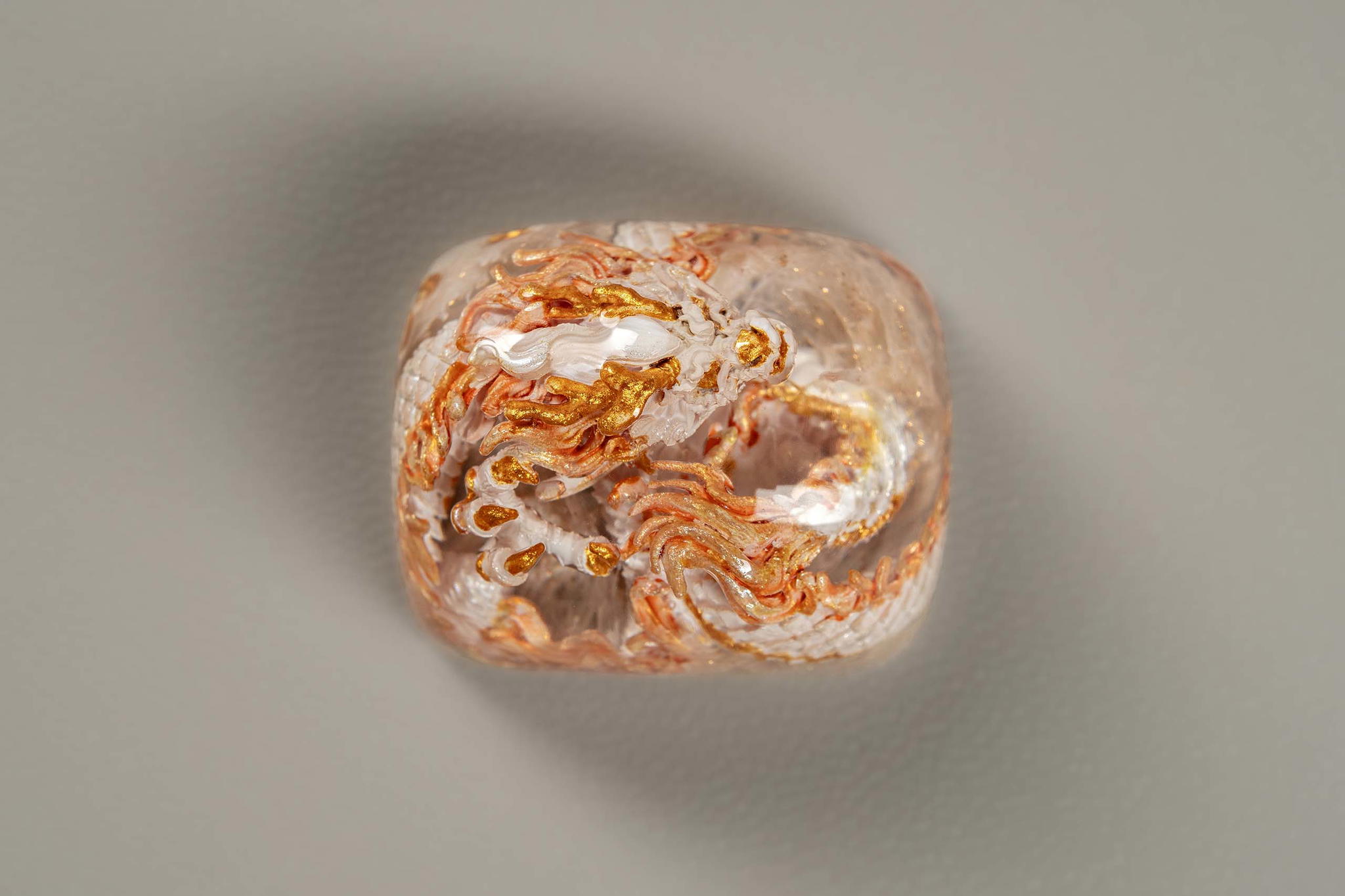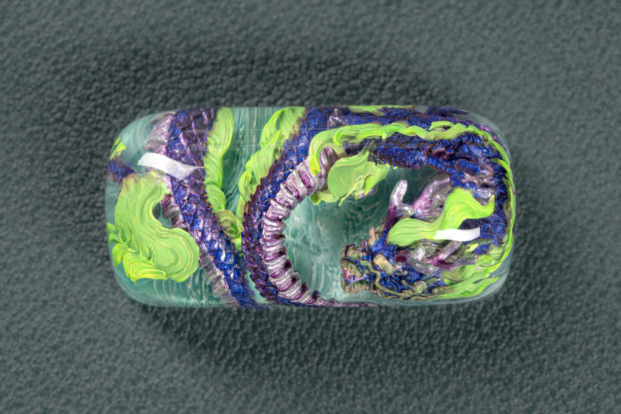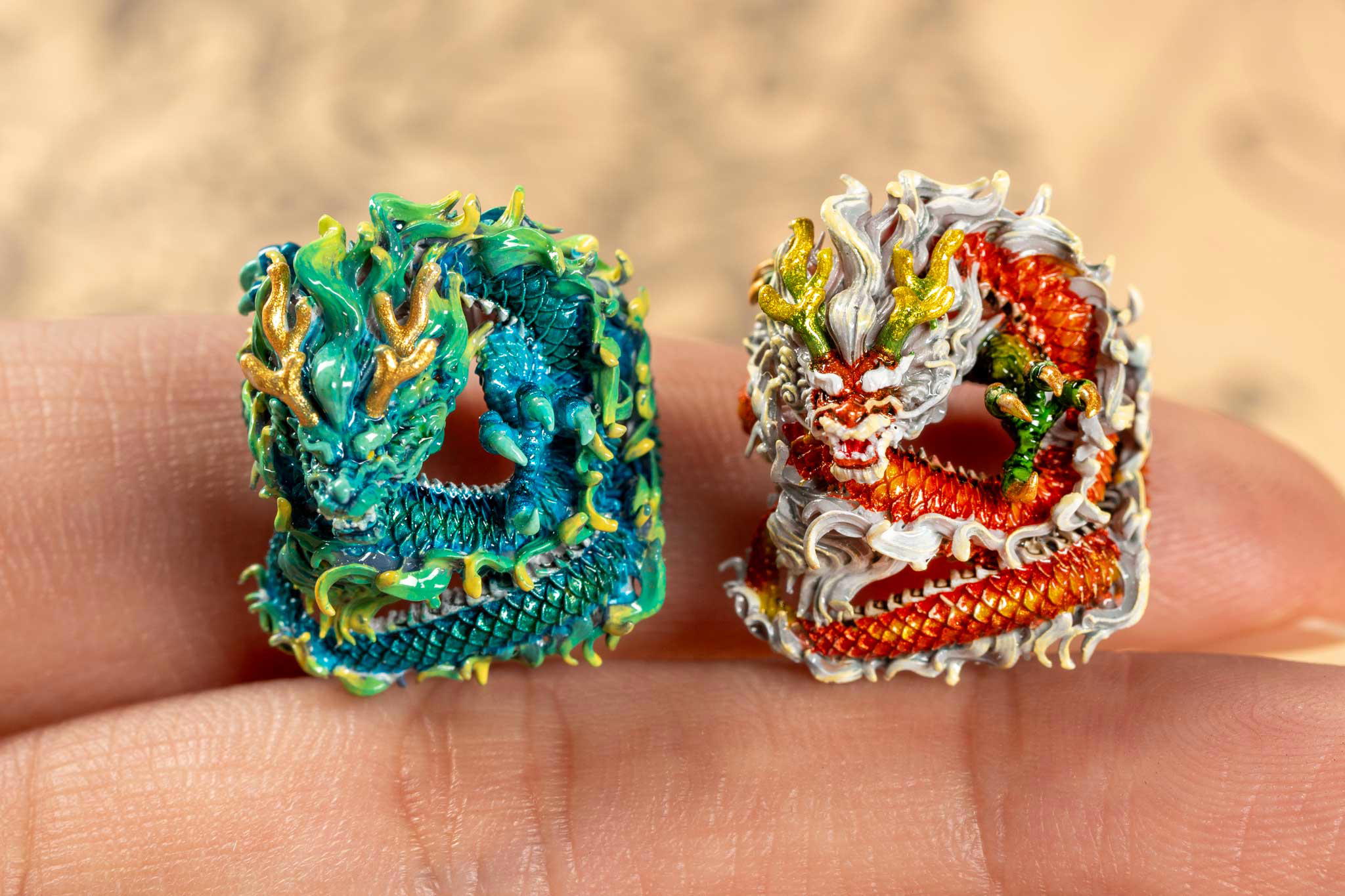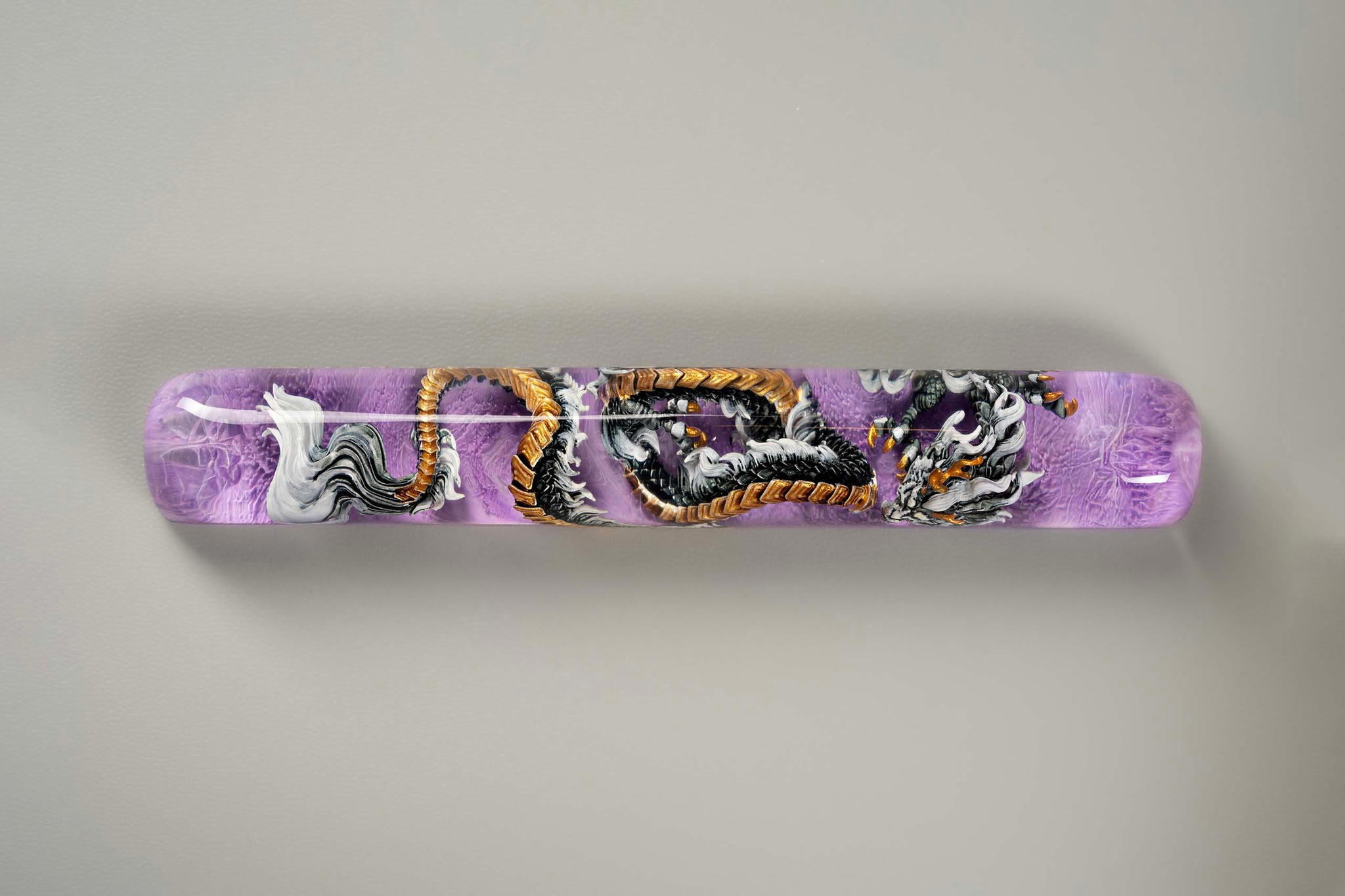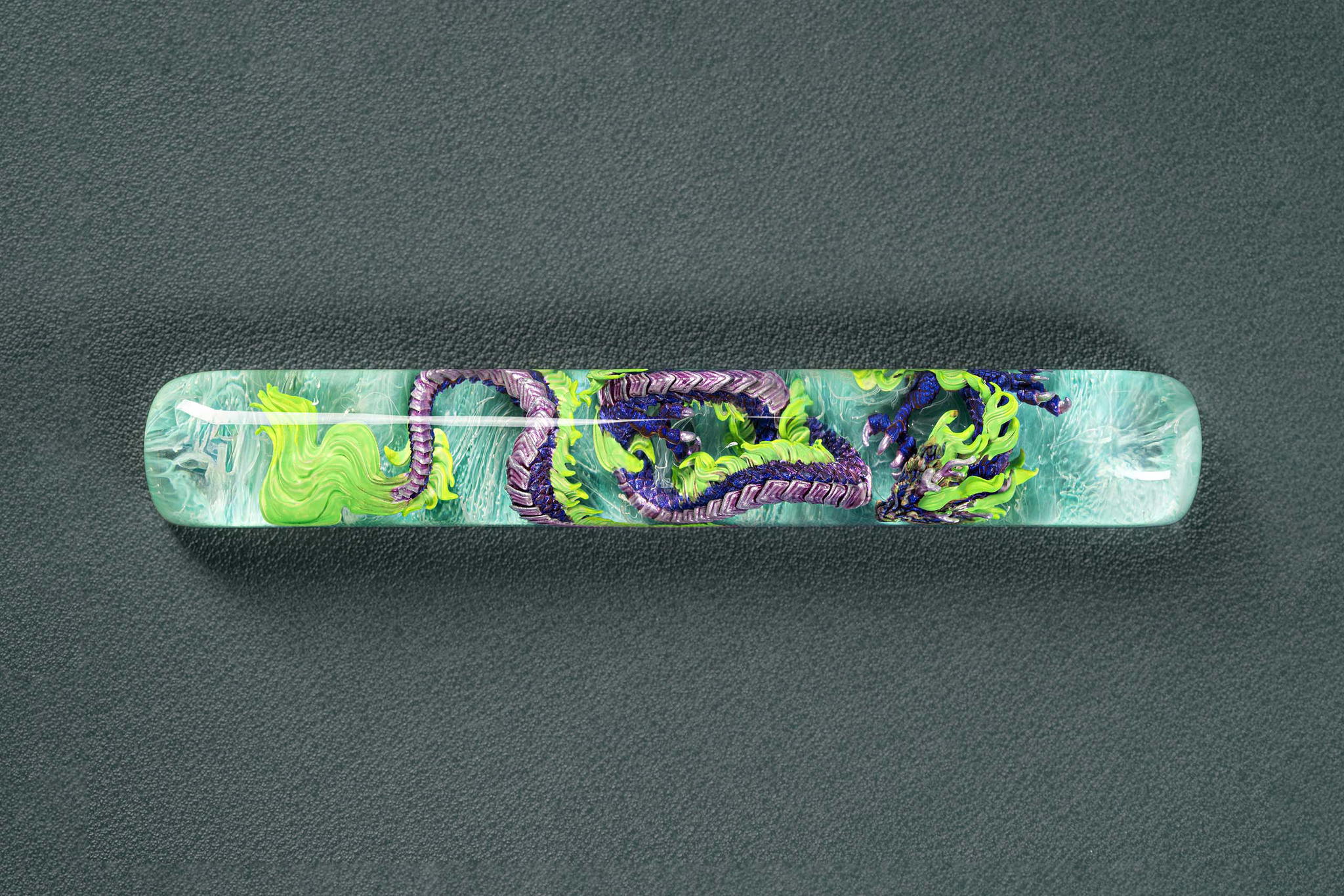 Unlike other makers who use 3D printing and painting technology, Jelly Key creates dragons through a complex multi-layer casting technique, resulting in completely handcrafted, sharp details. Polishing the keycap after removing it from the mold is also a big challenge with a keycap surface that is neither flat nor curved, including corners, the transparent layer surrounding the dragon, and the hard-to-define curve of the ripples. All are sanded through 4 different levels of sandpaper and polished twice by machine to achieve the highest level of finish.