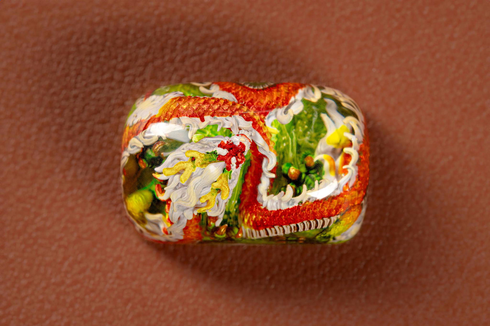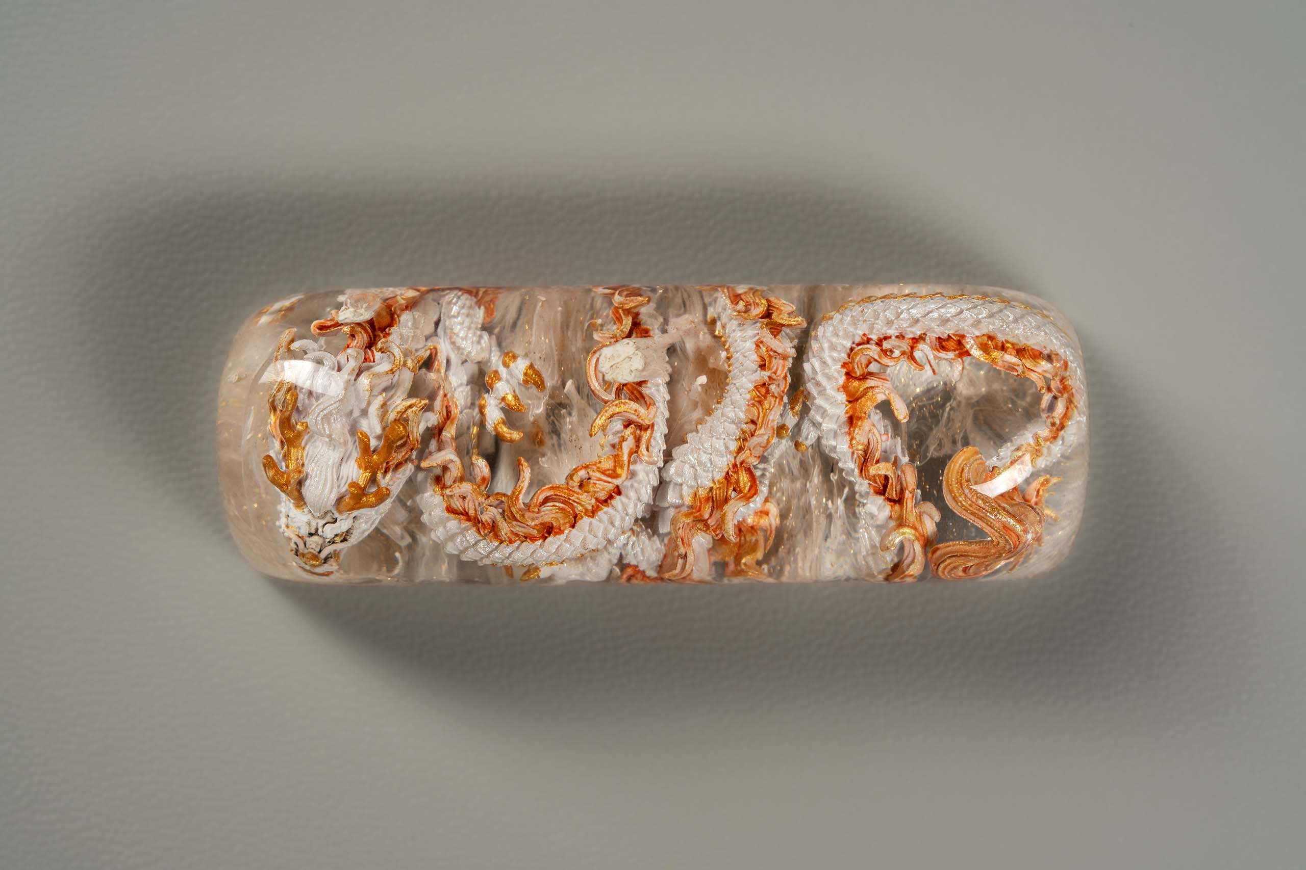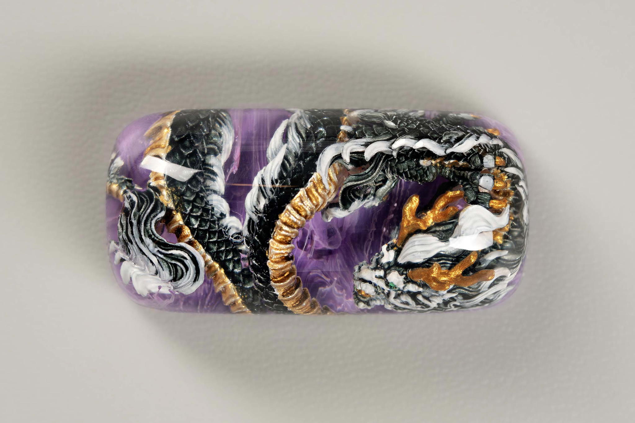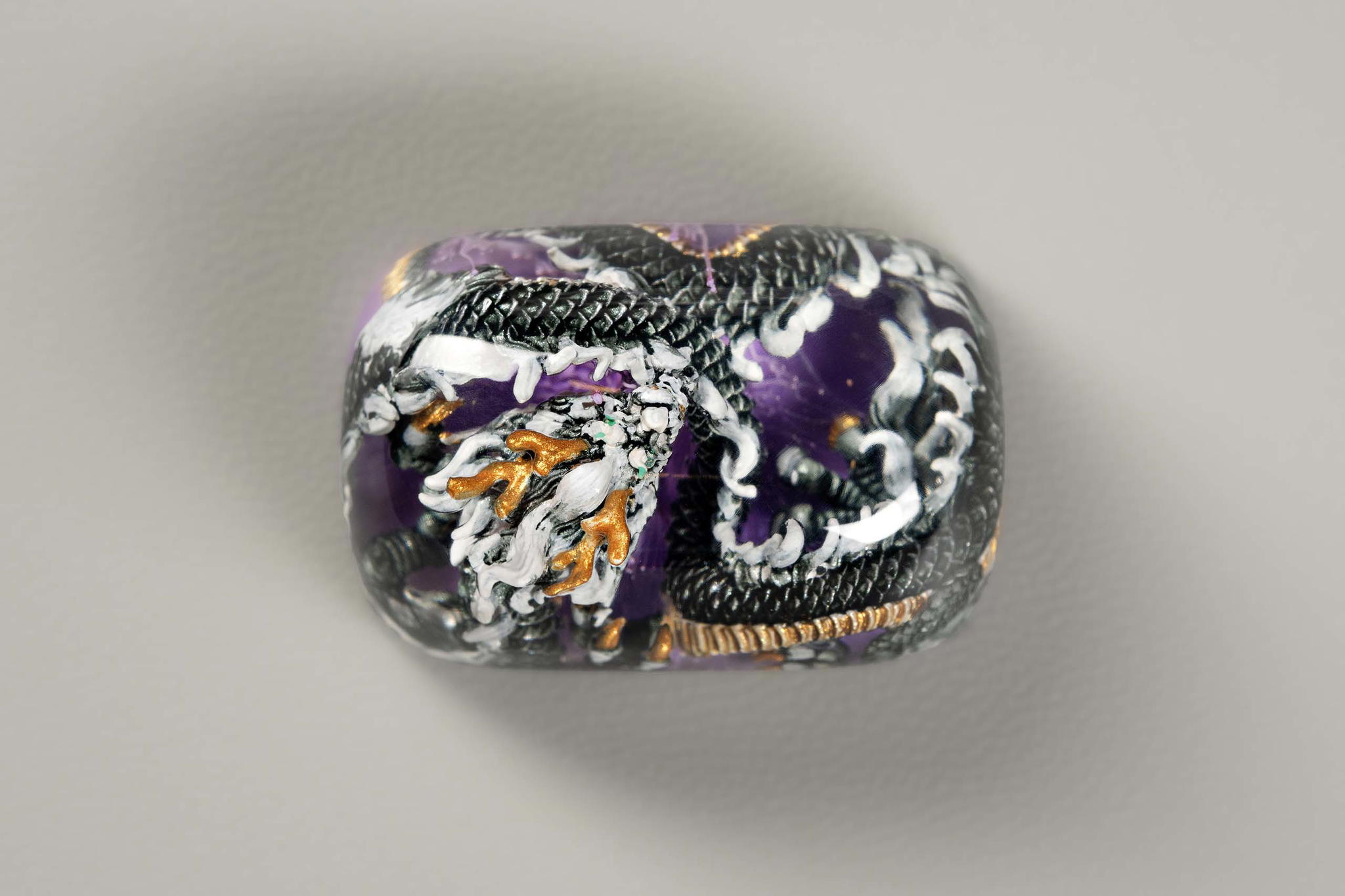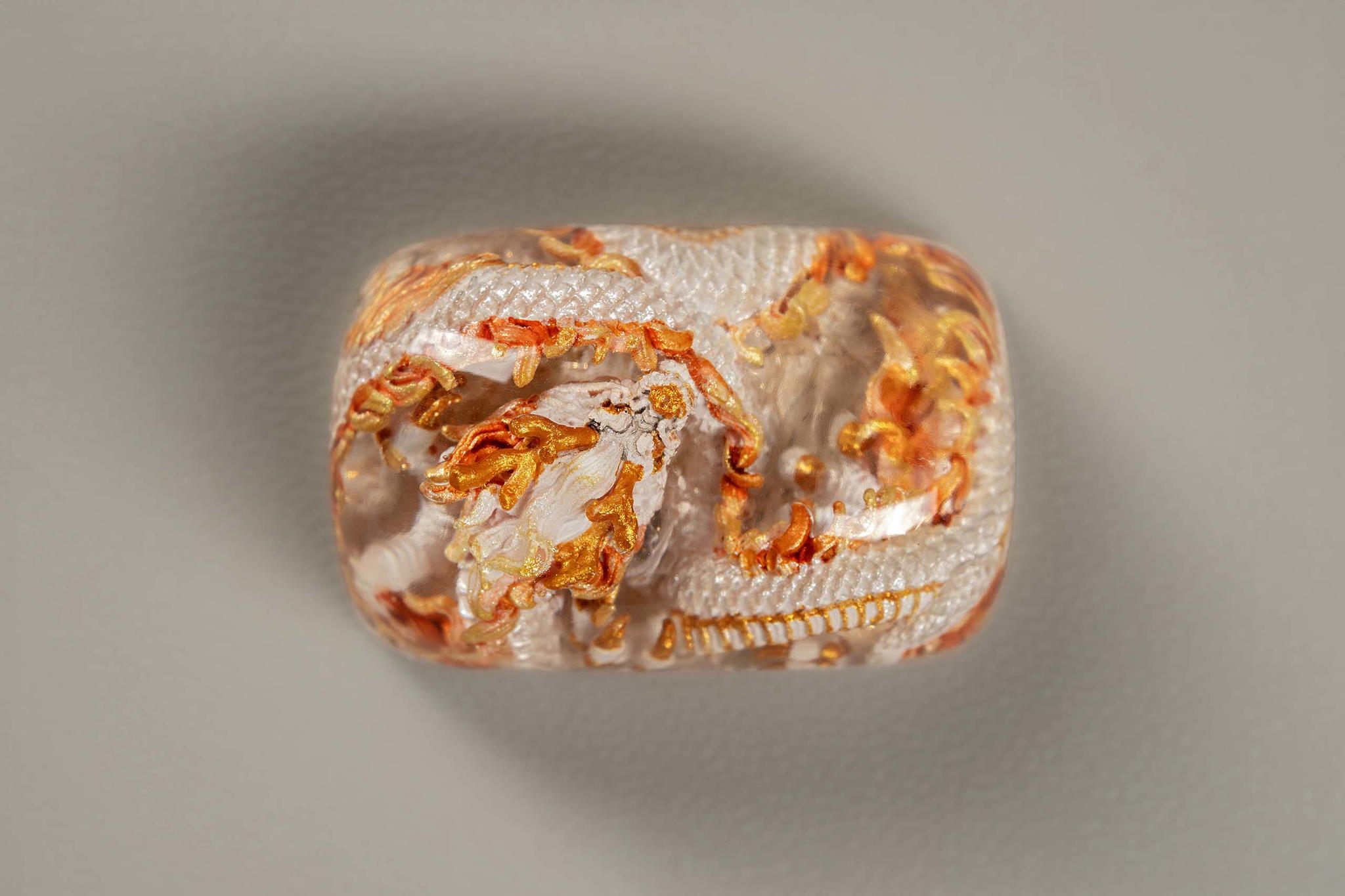 Unlike other makers who use 3D printing and painting technology, Jelly Key creates dragons through a complex multi-layer casting technique, resulting in completely handcrafted, sharp details. Polishing the keycap after removing it from the mold is also a big challenge with a keycap surface that is neither flat nor curved, including corners, the transparent layer surrounding the dragon, and the hard-to-define curve of the ripples. All are sanded through 4 different levels of sandpaper and polished twice by machine to achieve the highest level of finish.