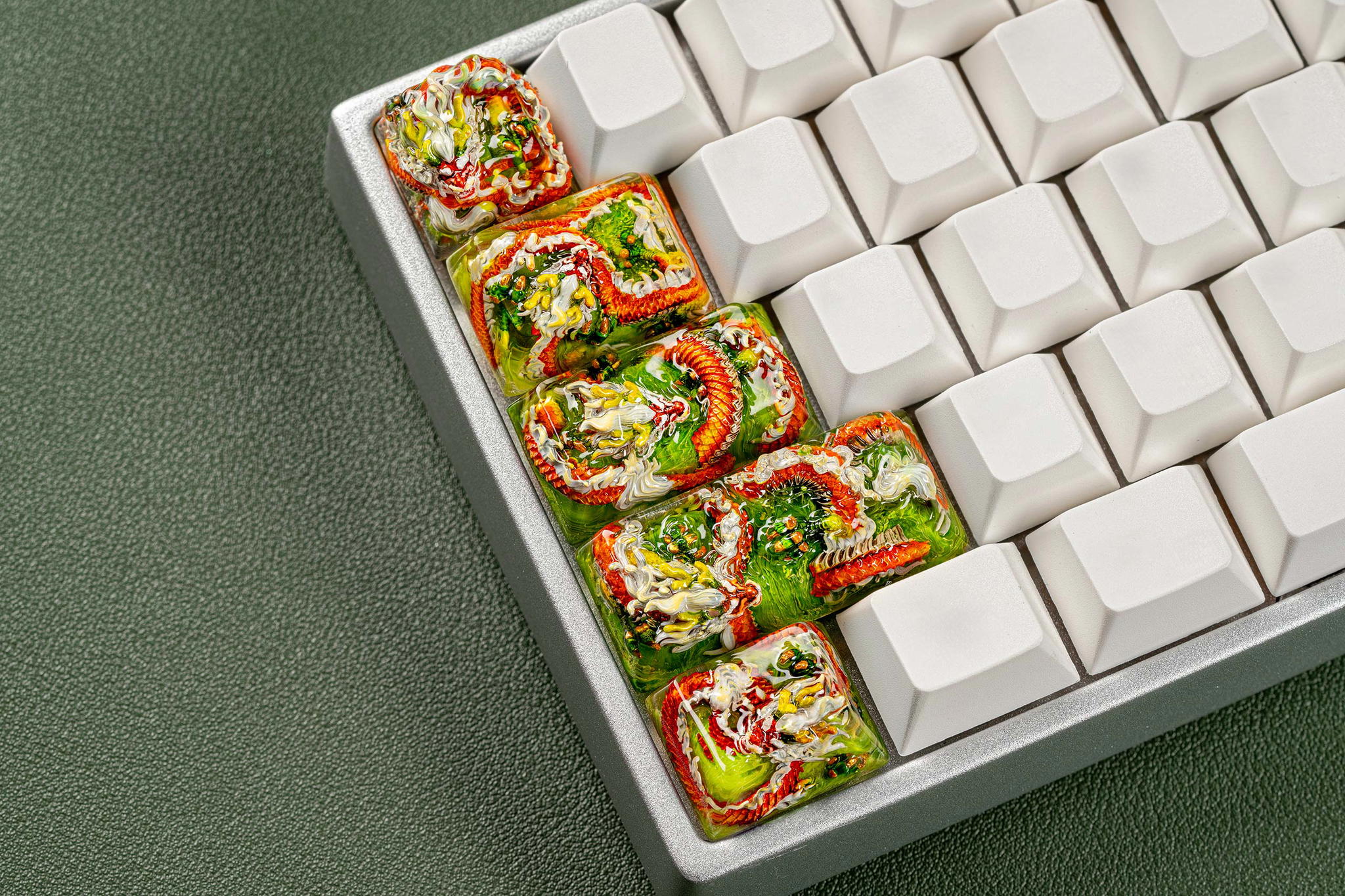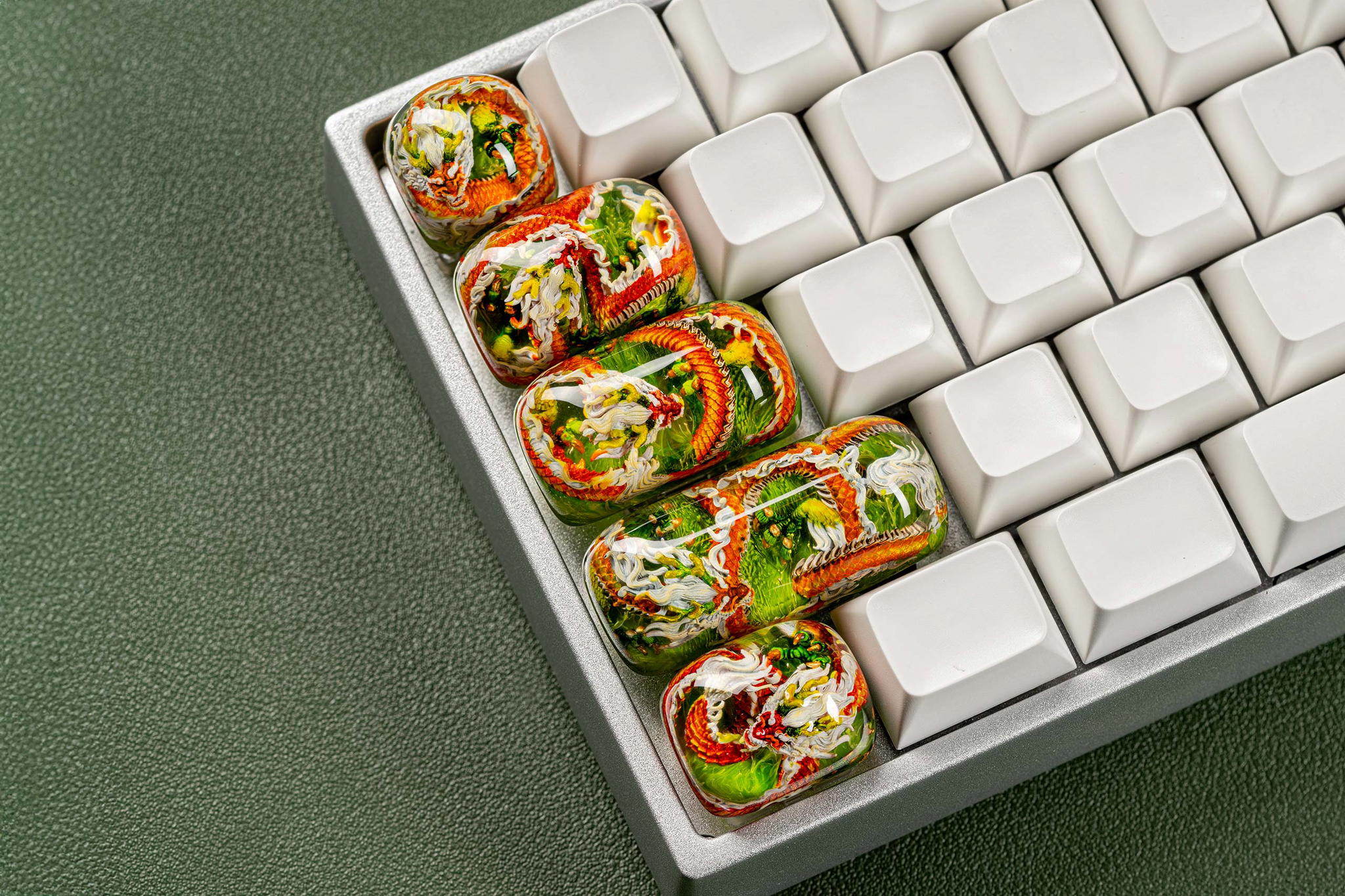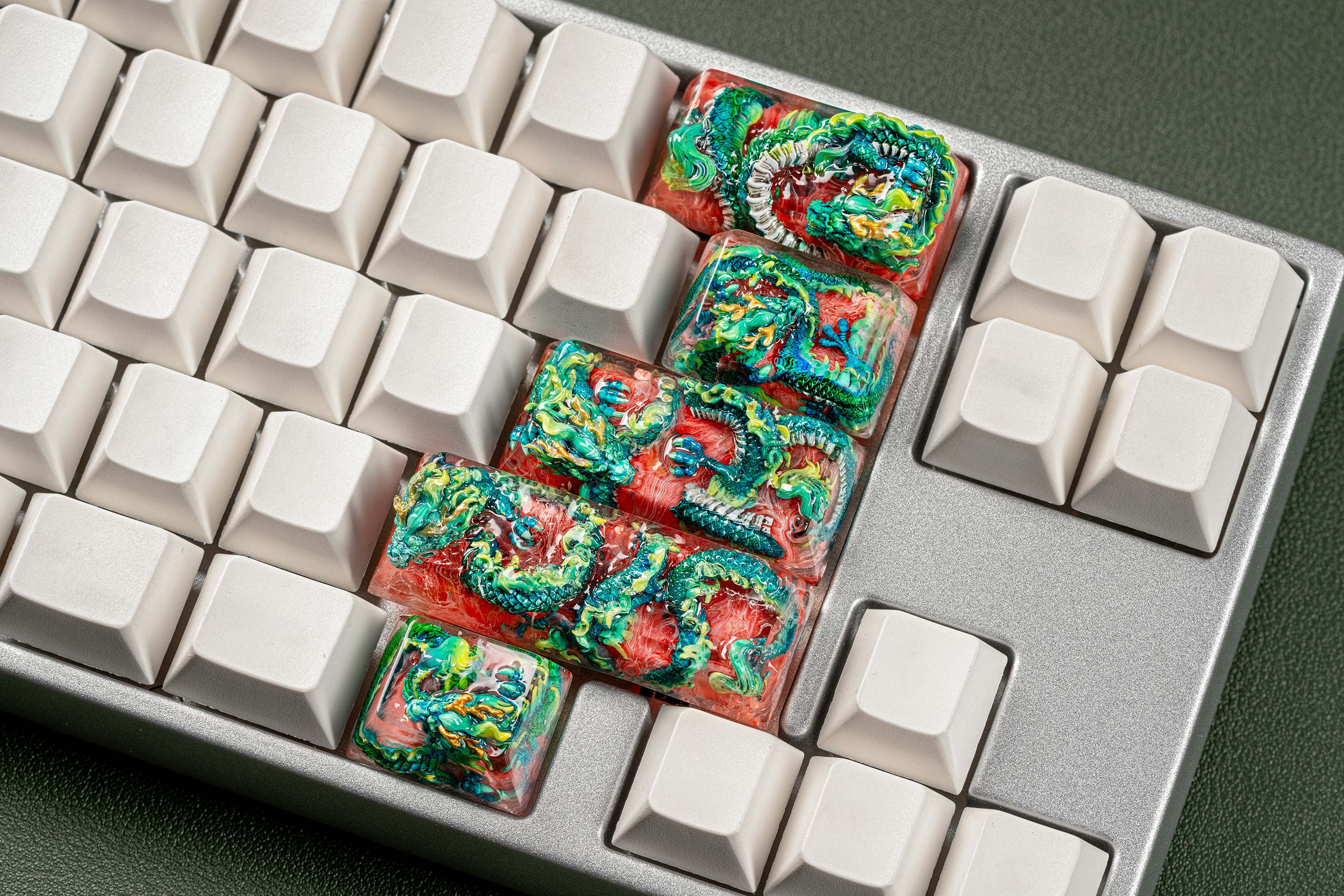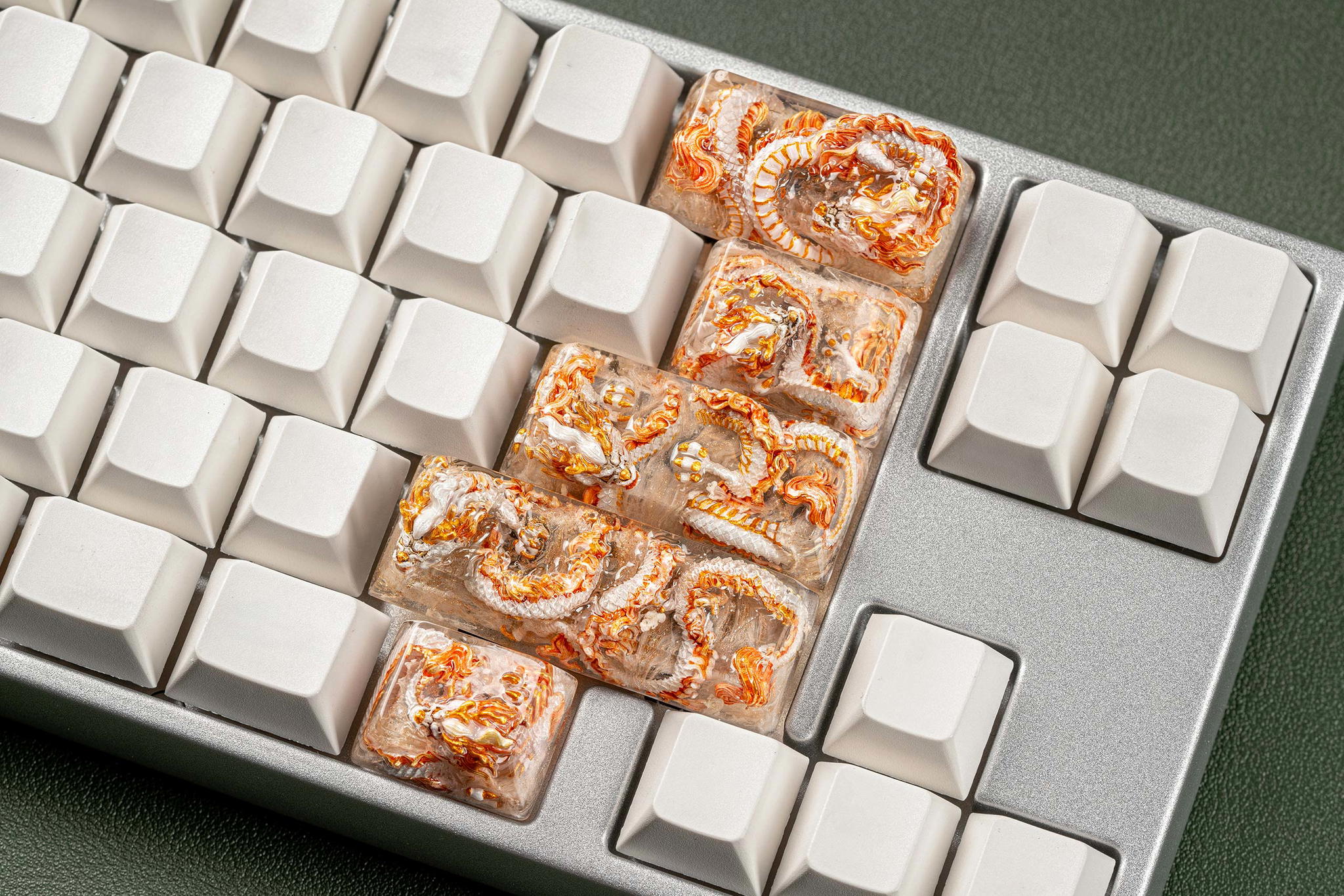Here’s an extra tip: using a magnifying glass or macro photography, you’ll notice an outer transparent layer with a unique shape. This layer enhances the dragon’s visual appeal and grandeur while protecting details like claws, horns, and the head. I’ve tested these keycaps rigorously, and they withstand rough handling without any damage.