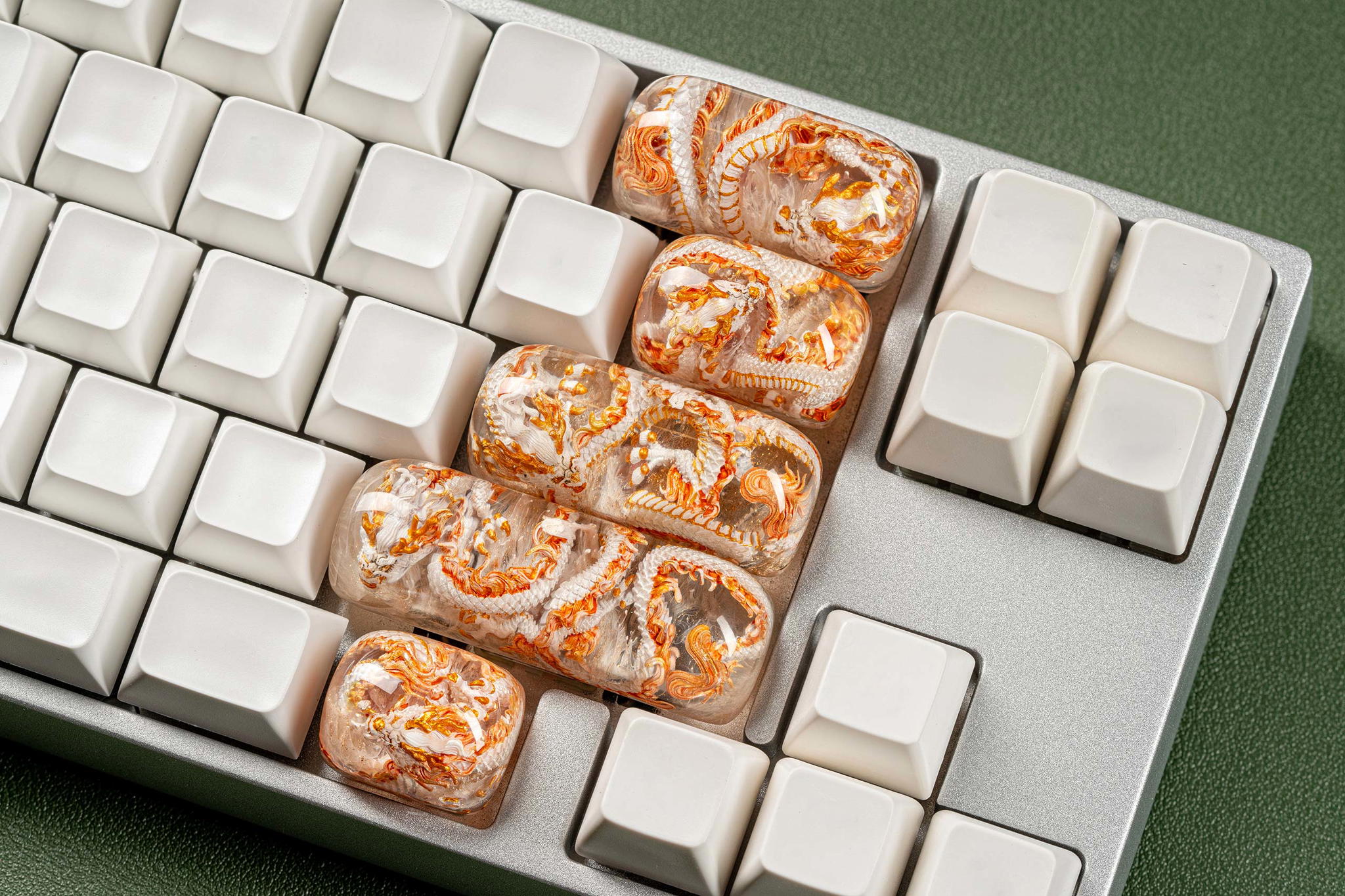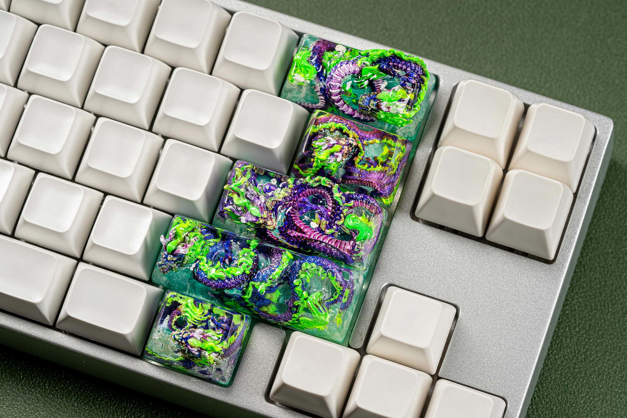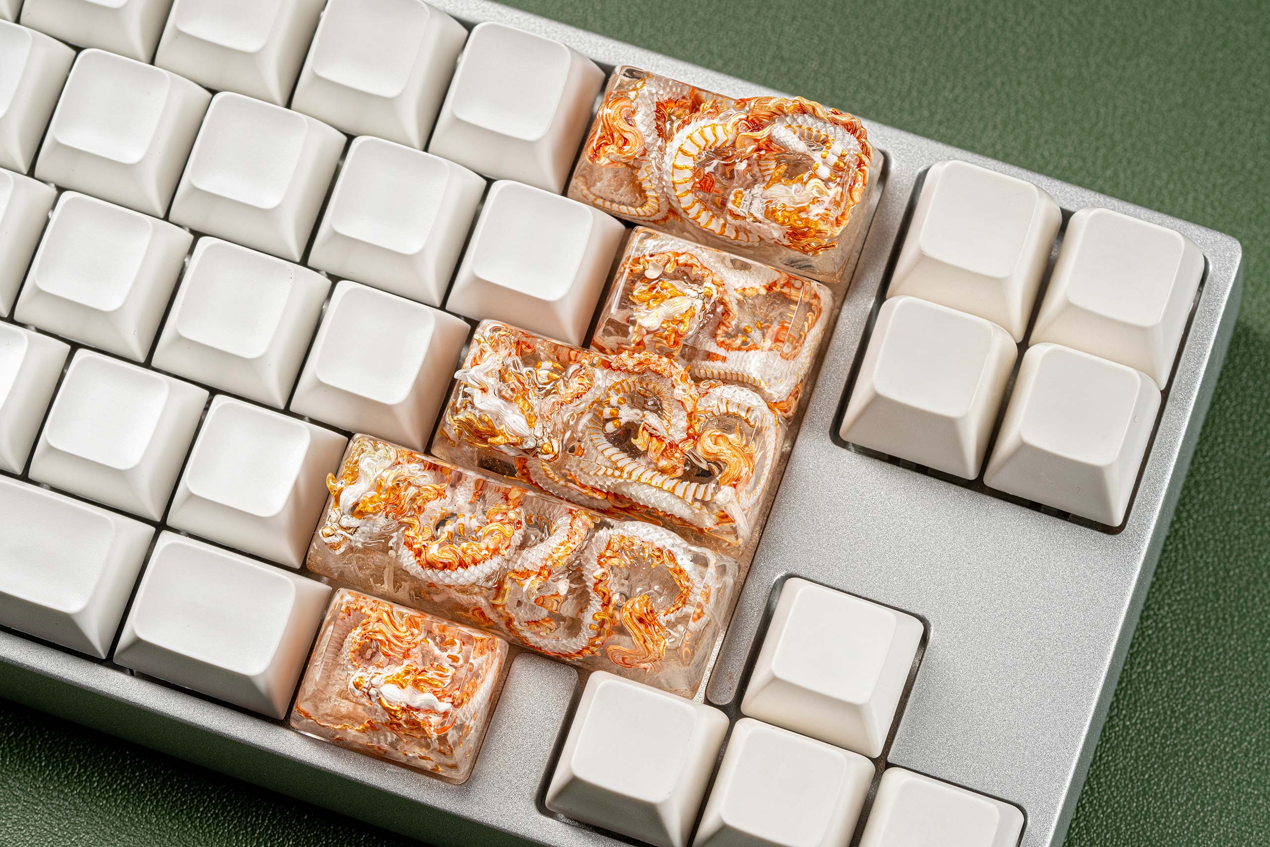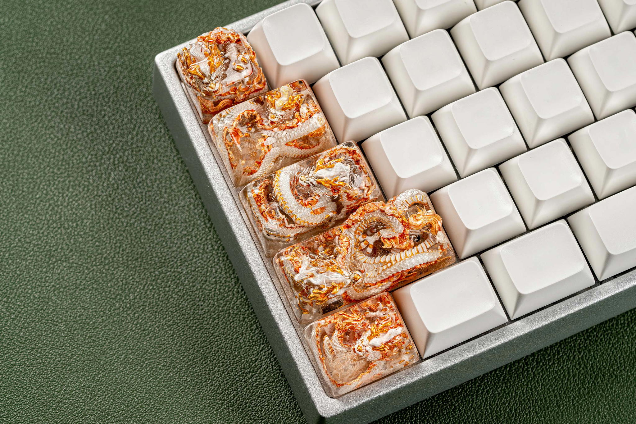 Here’s an extra tip: using a magnifying glass or macro photography, you’ll notice an outer transparent layer with a unique shape. This layer enhances the dragon’s visual appeal and grandeur while protecting details like claws, horns, and the head. I’ve tested these keycaps rigorously, and they withstand rough handling without any damage.