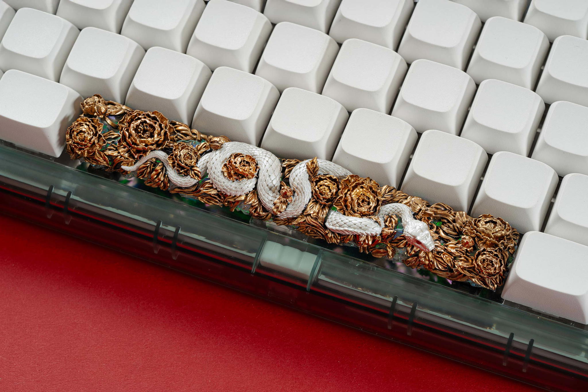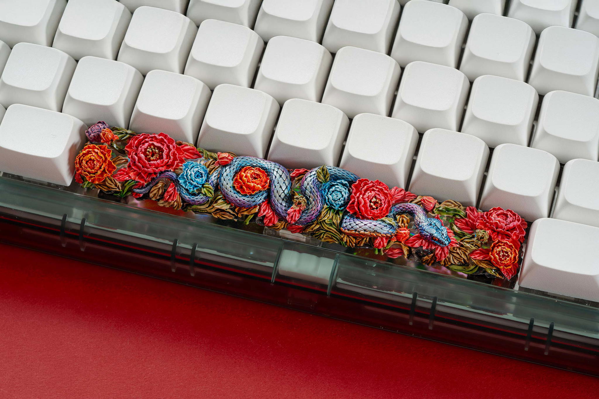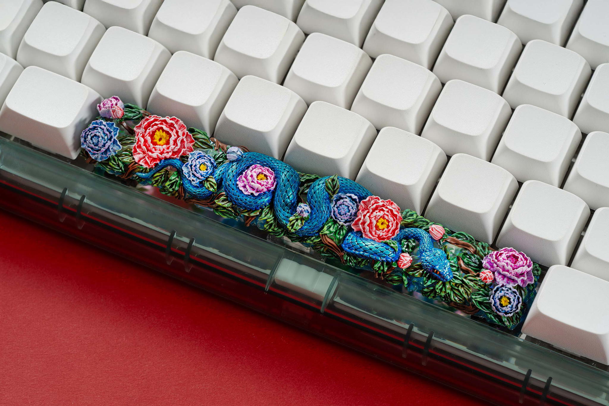 Once the base elements are perfected, the serpent’s body is cast separately and layered atop the base. We incorporate a translucent resin layer infused with holographic foil accents to enhance its allure, creating a mesmerizing iridescent effect that shimmers under different lighting conditions. This thoughtful layering not only enriches the visual complexity of the design but also allows for a stunning LED shine-through effect when mounted on a keyboard.
