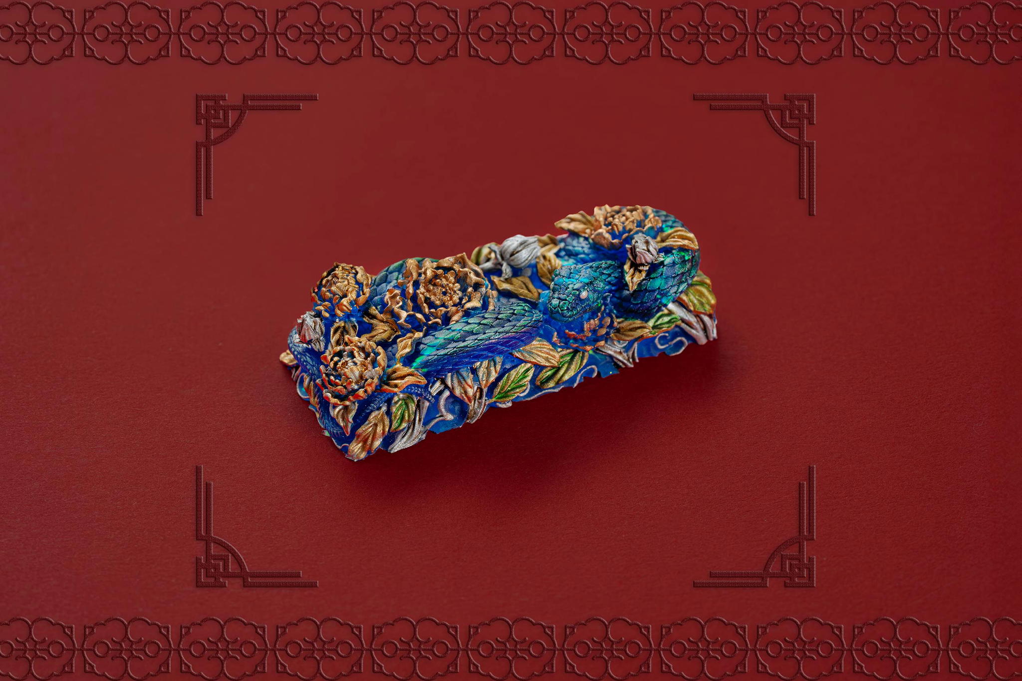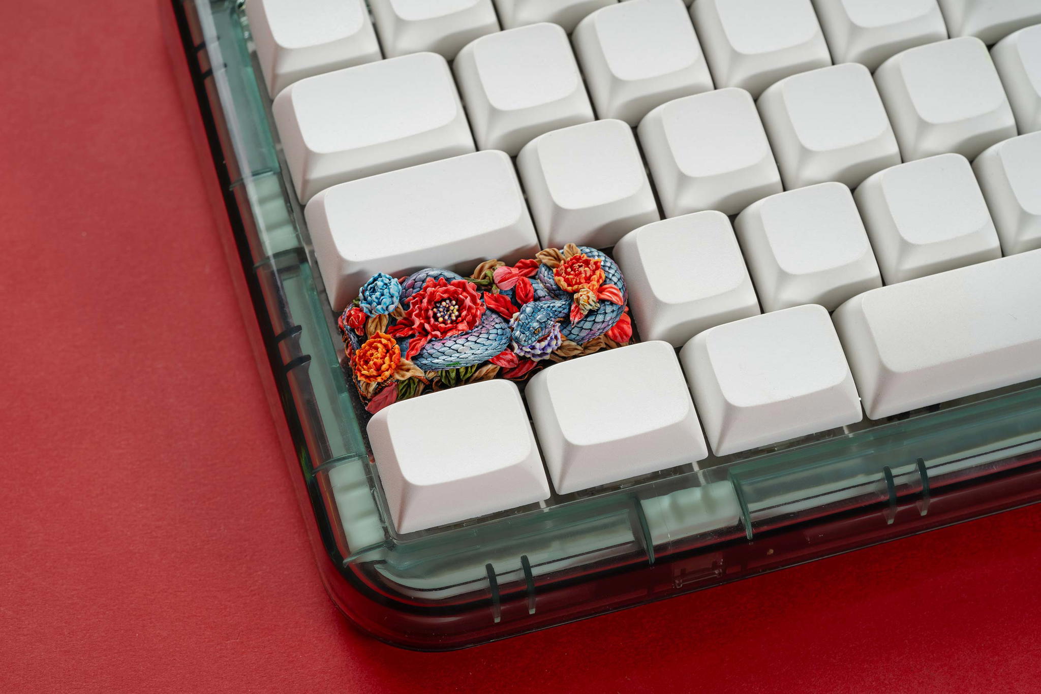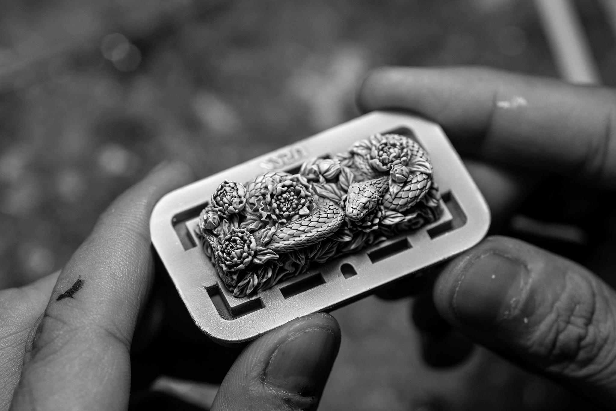 Once the base elements are perfected, the serpent’s body is cast separately and layered atop the base. We incorporate a translucent resin layer infused with holographic foil accents to enhance its allure, creating a mesmerizing iridescent effect that shimmers under different lighting conditions. This thoughtful layering not only enriches the visual complexity of the design but also allows for a stunning LED shine-through effect when mounted on a keyboard.