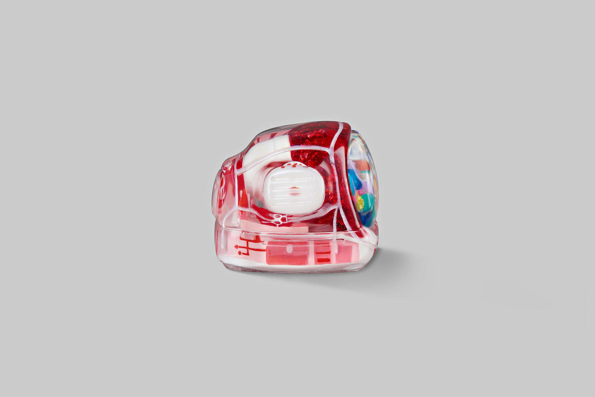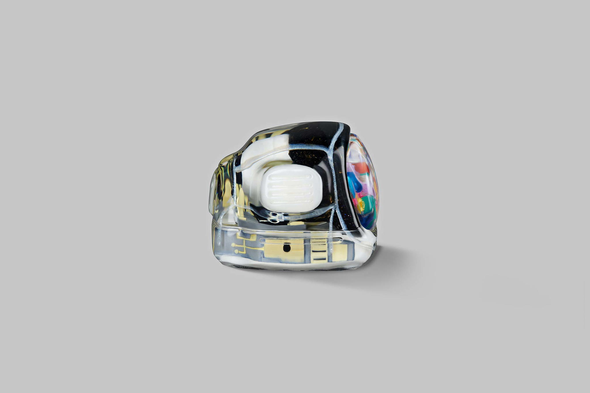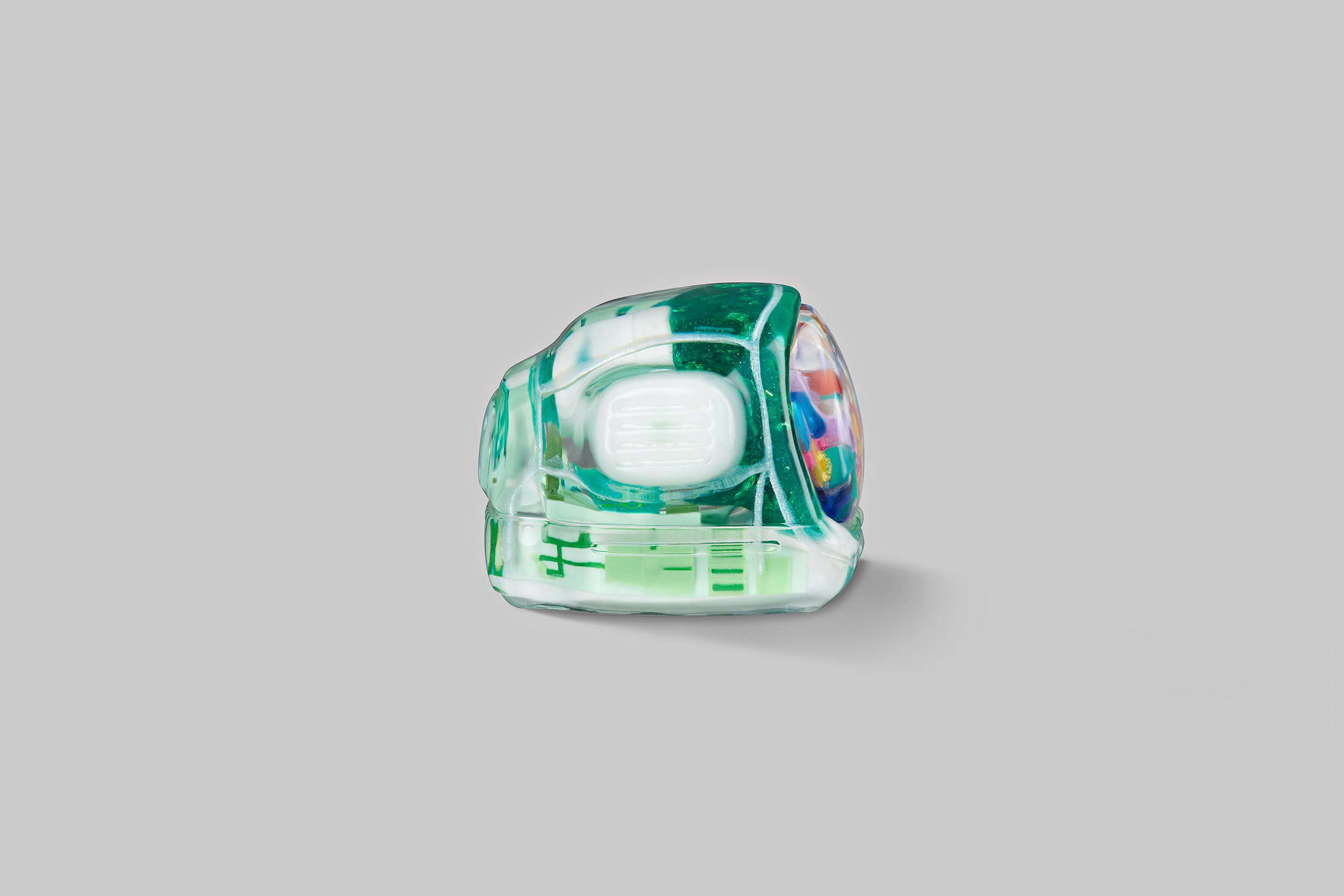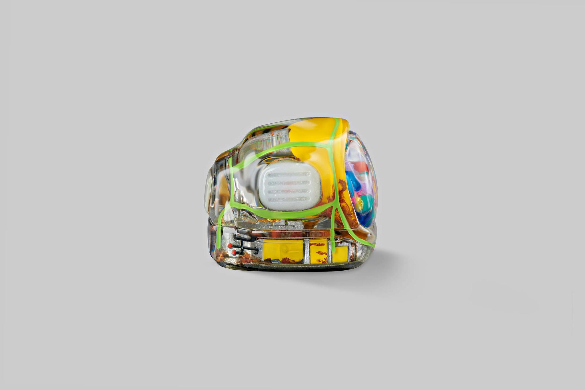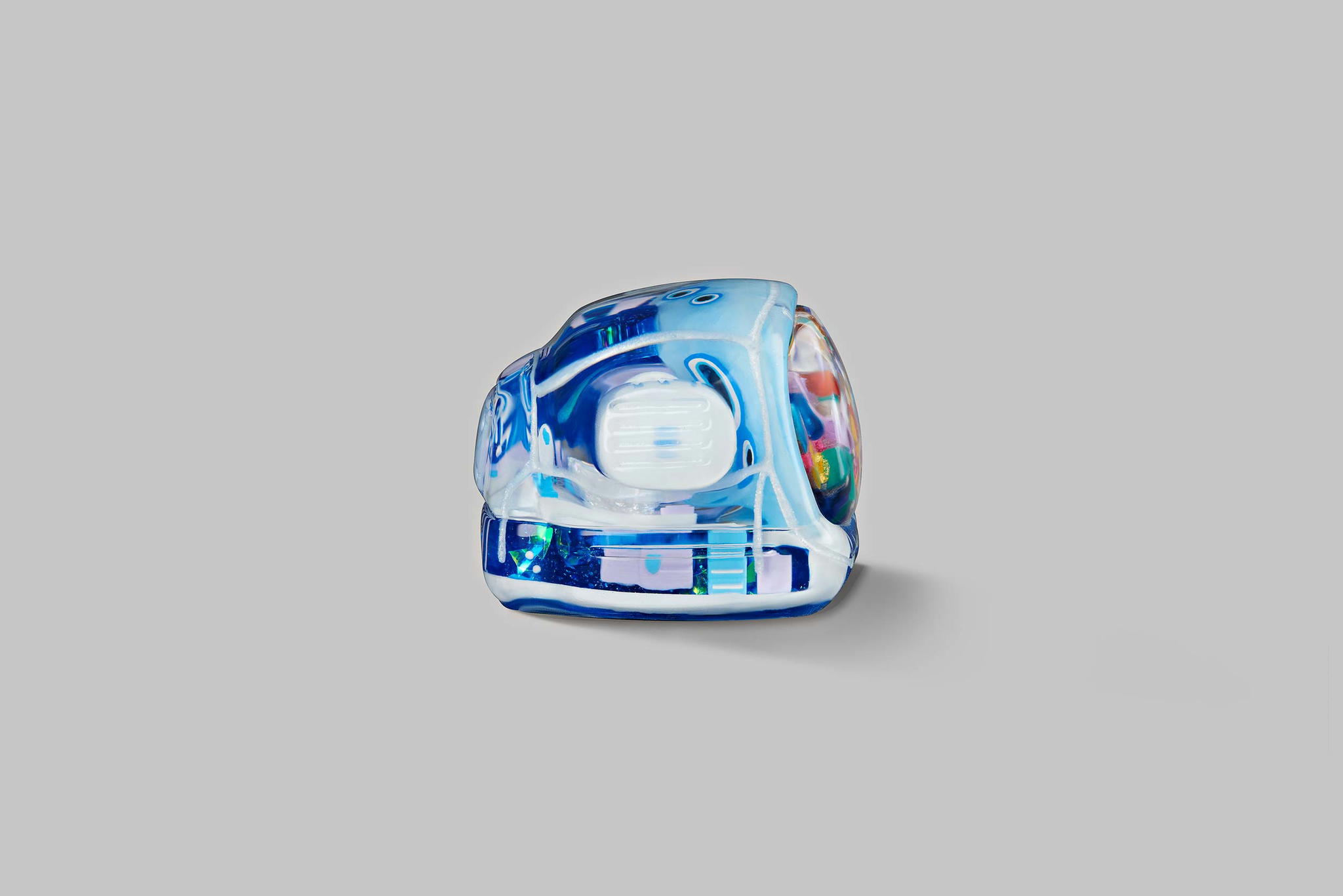 As you may know, we produce our keycaps by casting entirely, so we use an exclusive type of resin for these 6 new colours. This is to create the tiniest yet most twinkling details, which is very difficult when using the regular material. The unique resin we use this time is mixed with emulsion powder and golden & silver leaves to highlight a unique effect on the TV’s top lamb tube.