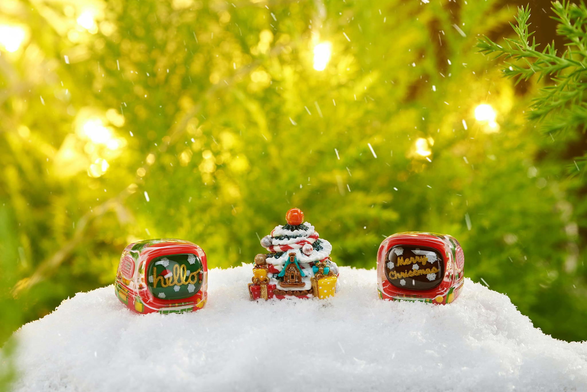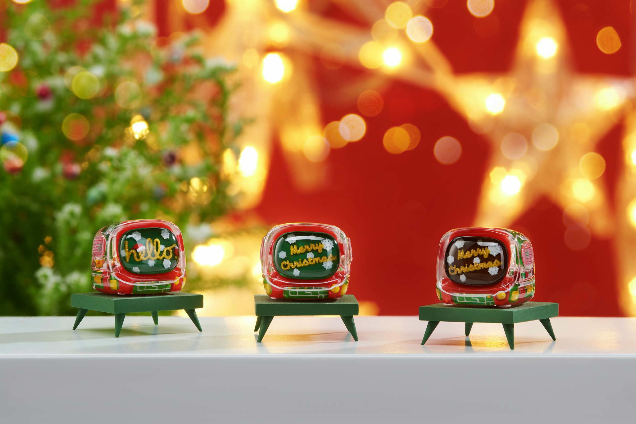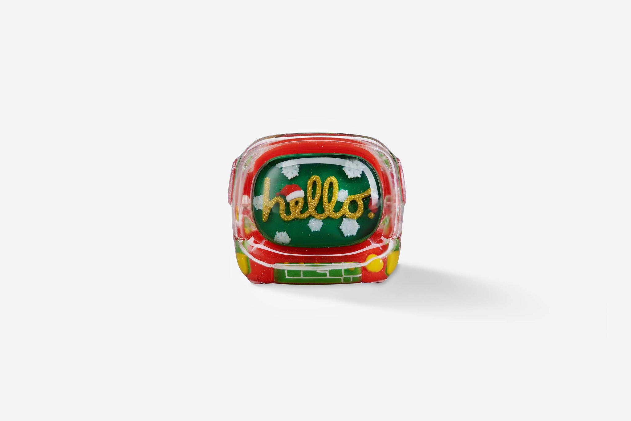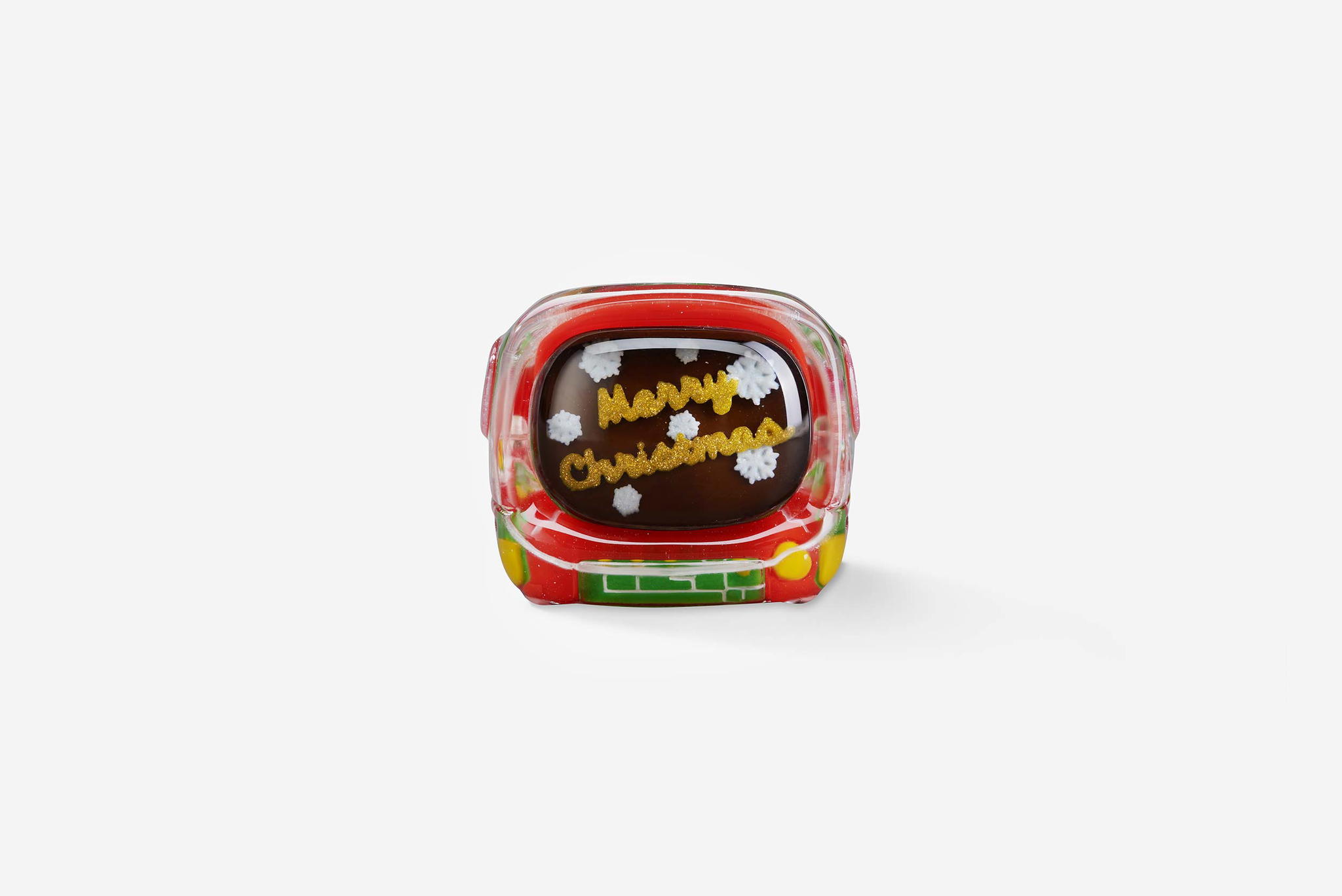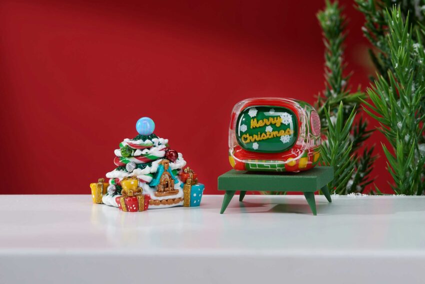 For the Retro TV version, the keycaps are also made through casting entirely. Many festive color schemes are used in these mini TVs, including the classic red and green, and also the glittering golden. In the screen, you can “watch” the Christmas greetings and wishes to cheer up your holiday spirit. The TV case is another delight: it still has the pixel vibe from the original version, now redecorated with a Christmas theme! You will also be impressed by the little snowman with the height of 2,99mm, and an illustration of a snowball inside the TV.