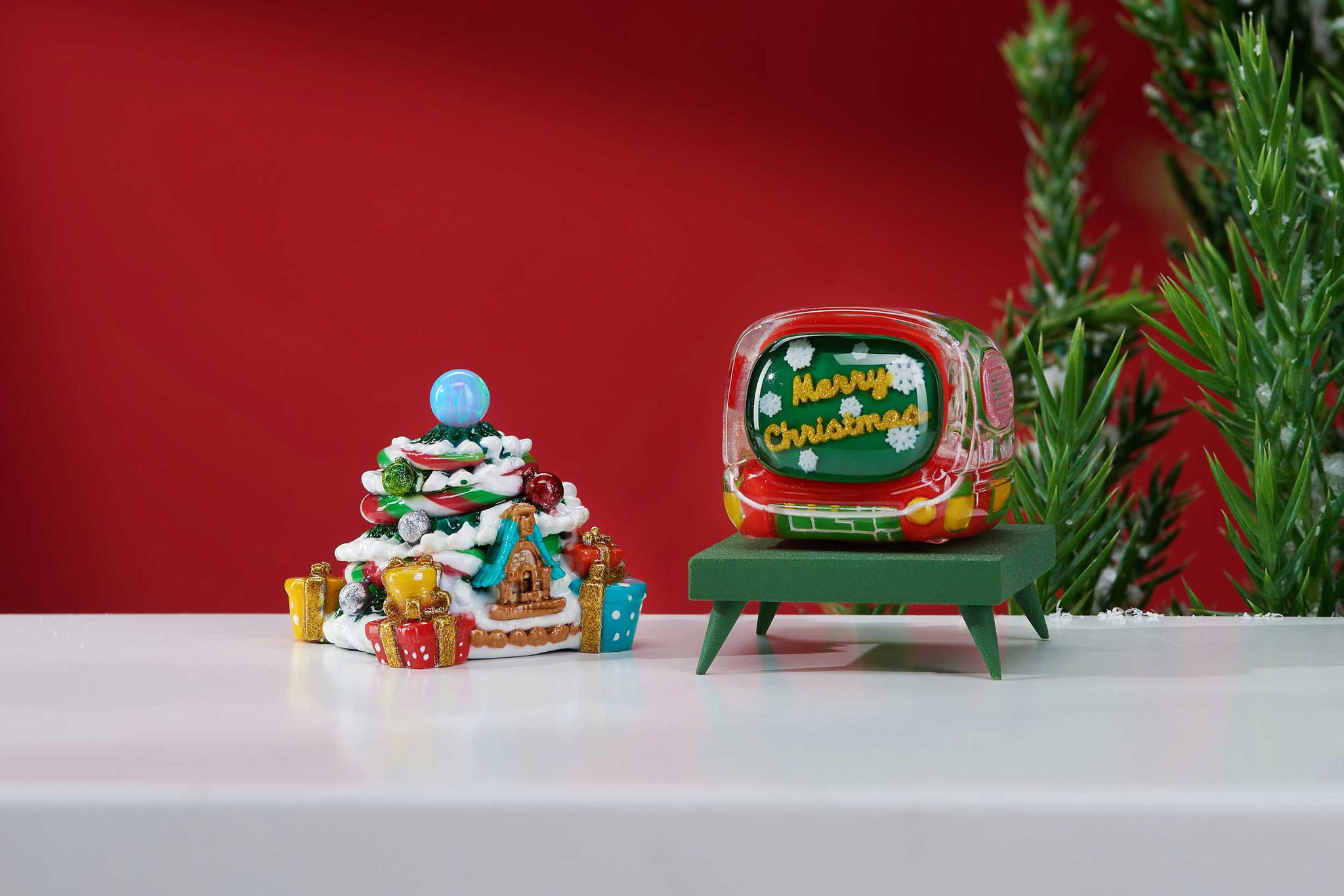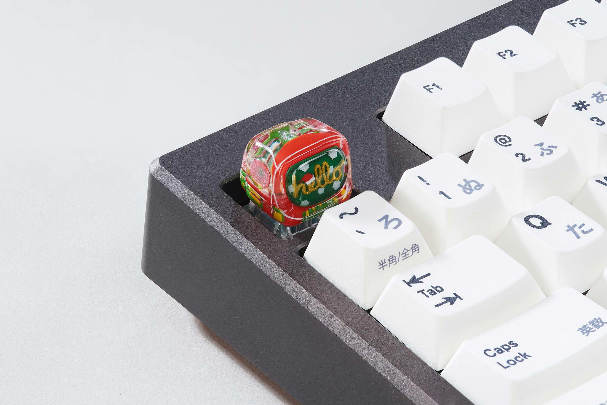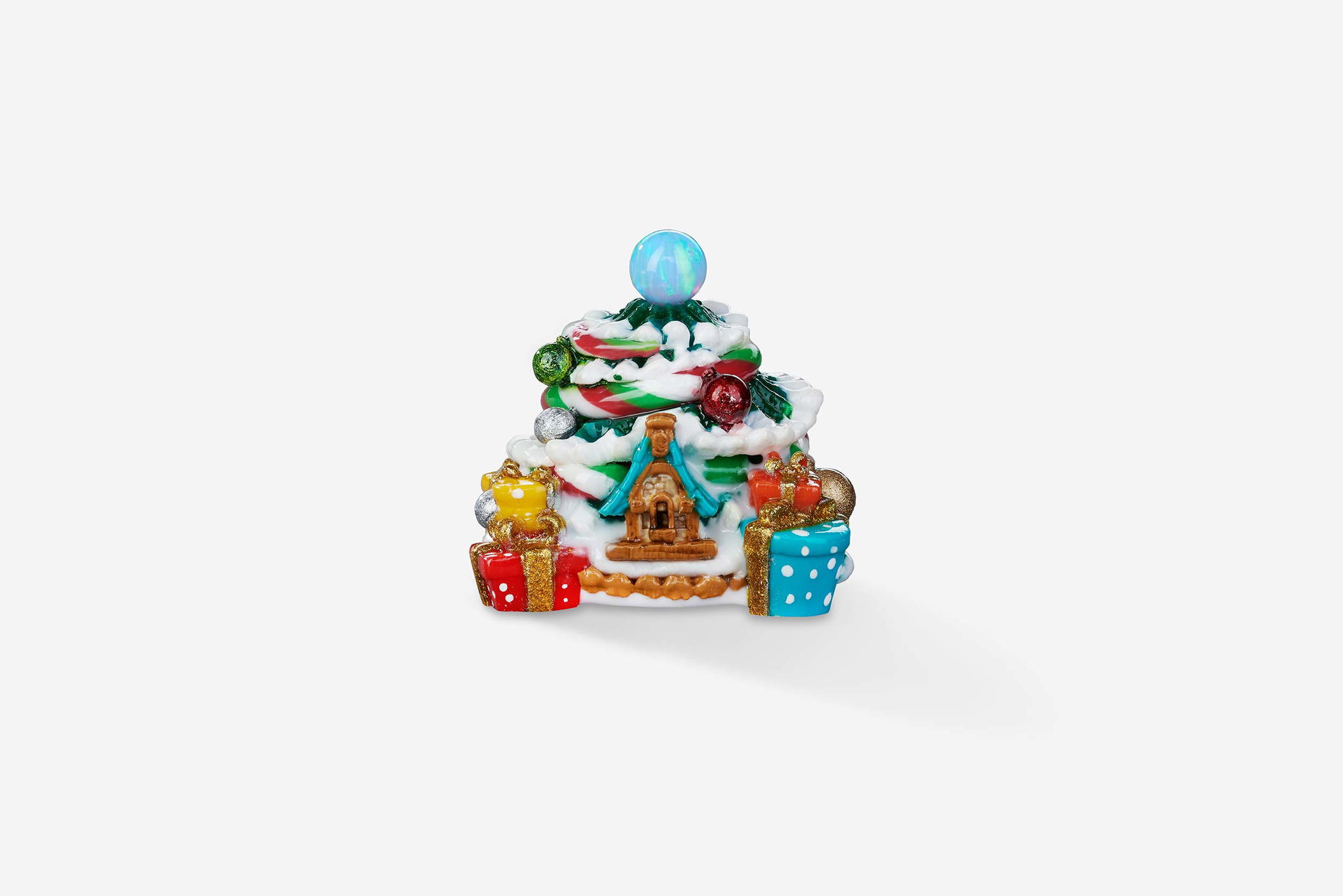 All the keycaps are cast with a 95% ratio and intricately colored to create the festive sparkles. In particular, the ball on top of the Jingle pine is natural Opal gemstone, giving an absolutely magically visual effect through its translucent flashes of color. There are up to 10 colors seen in the Jingle pine collection, each of which is beautifully blended throughout the trees. The layers are cast separately so you can recognize every little detail: the tree itself, the holiday ribbons, the presents, even the falling snow. It takes a lot of time to produce these different layers of resin in a way that they don’t merge together and create this wonderful Christmas tree.