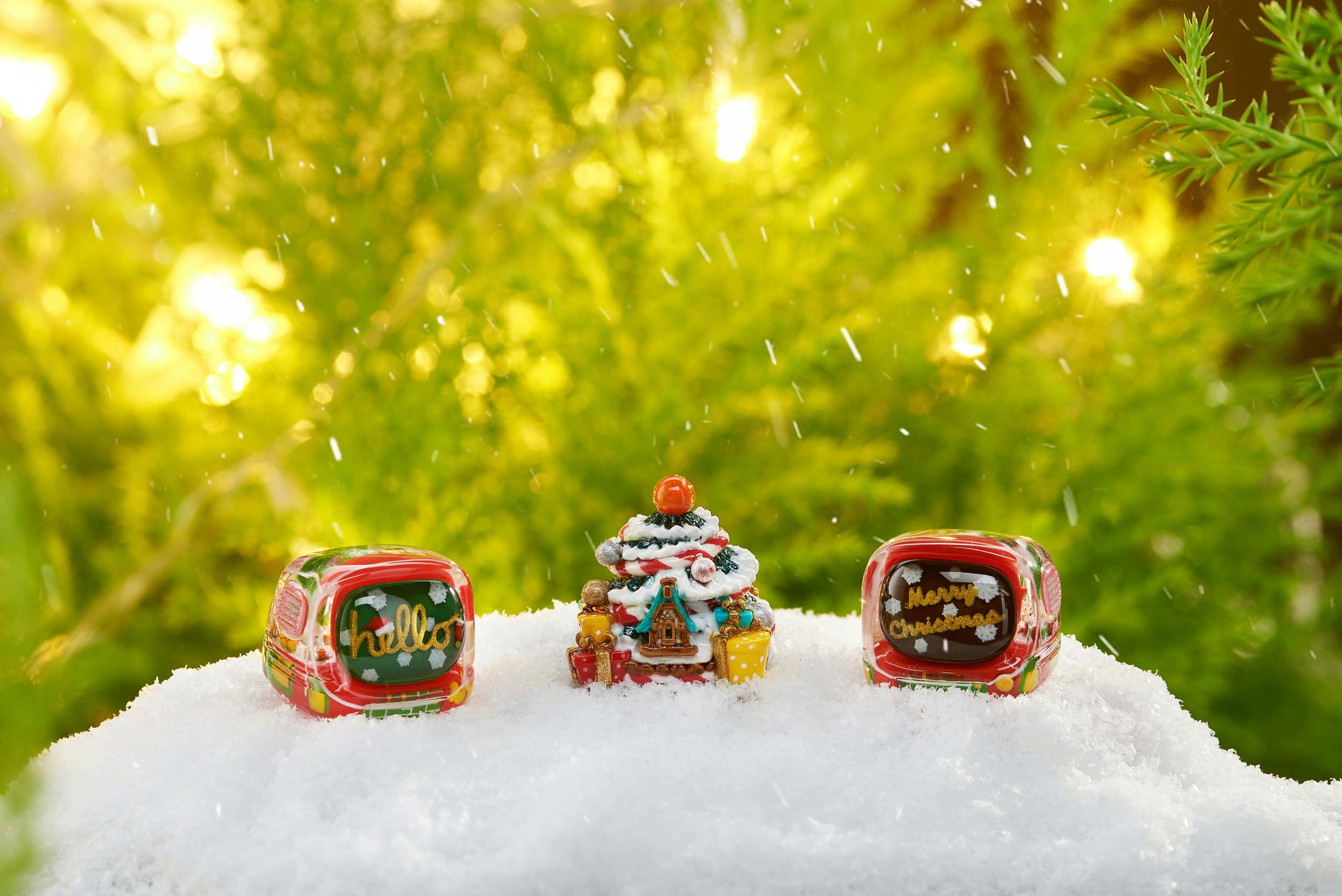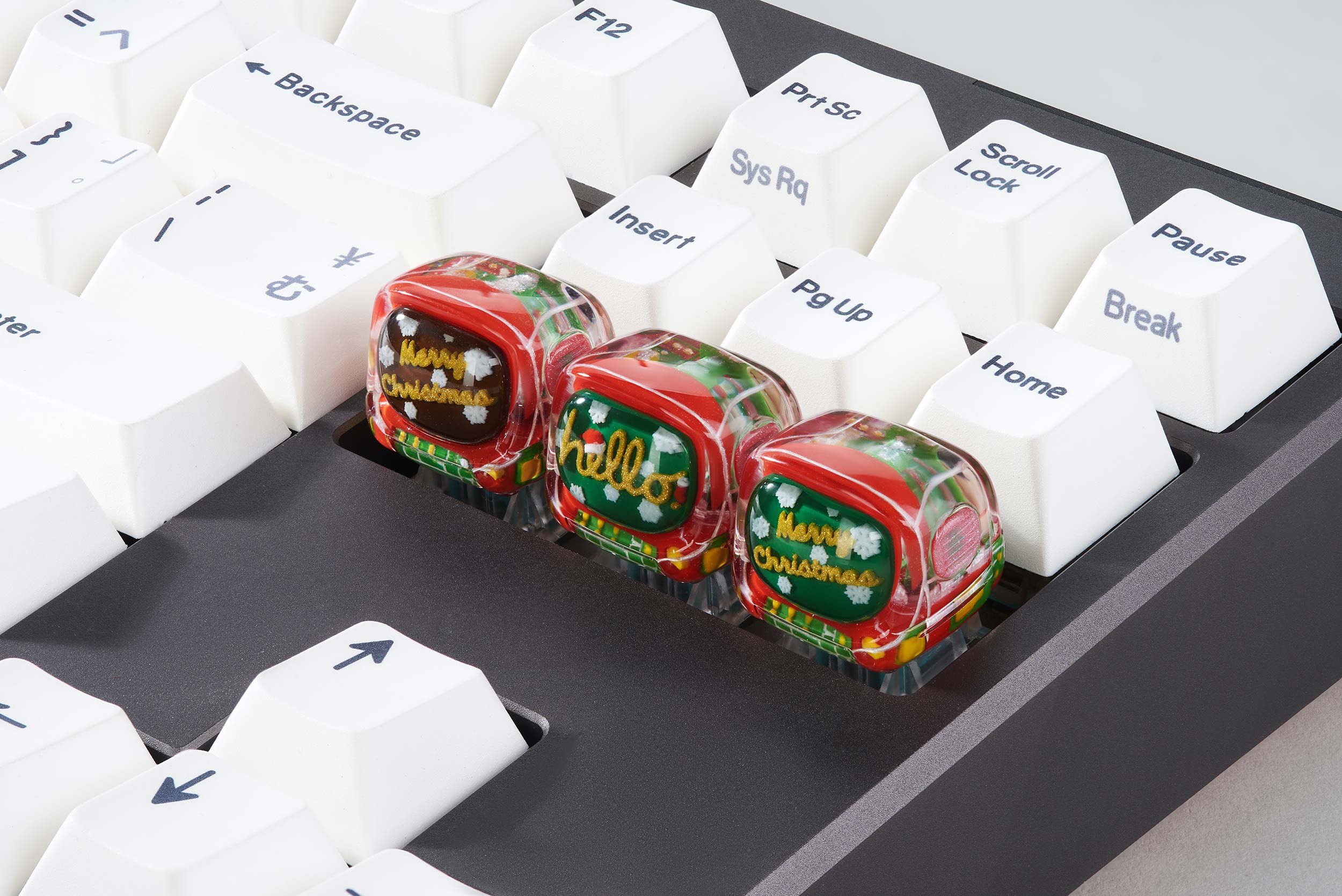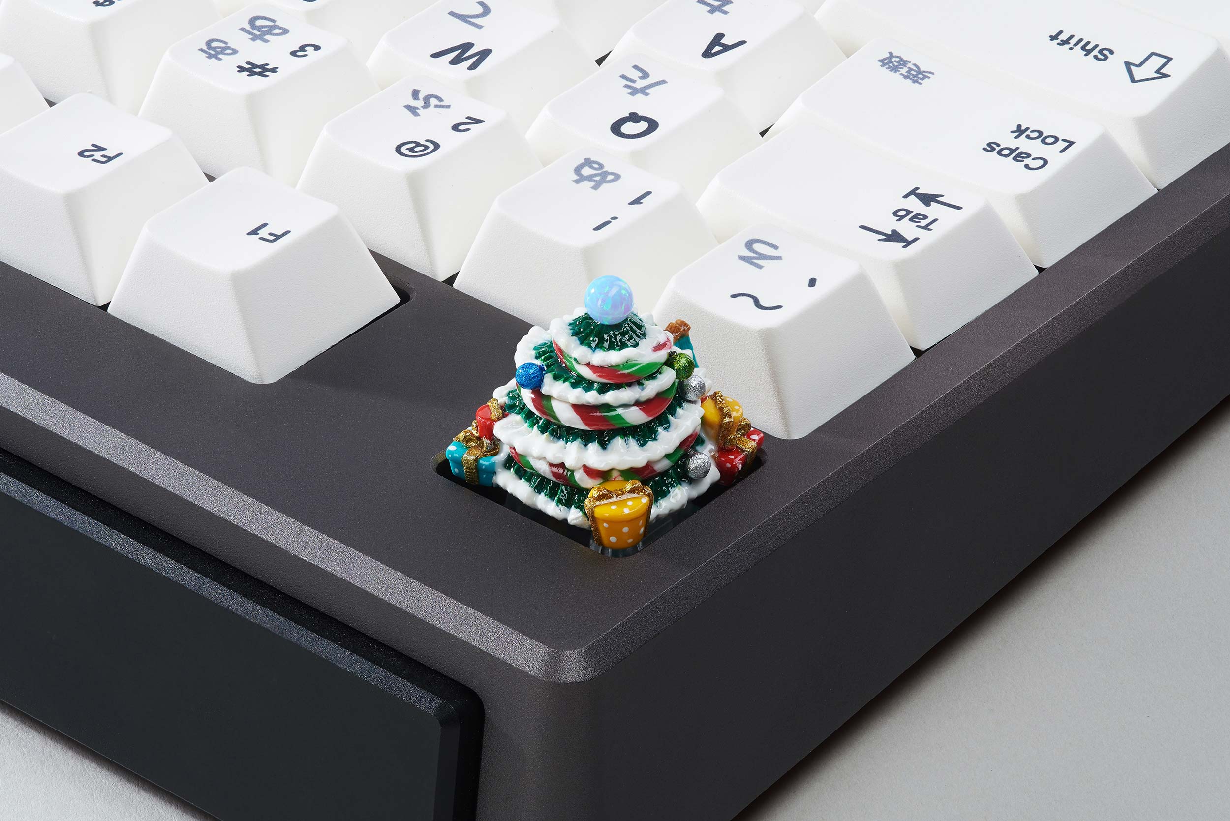 All the keycaps are cast with a 95% ratio and intricately colored to create the festive sparkles. In particular, the ball on top of the Jingle pine is natural Opal gemstone, giving an absolutely magically visual effect through its translucent flashes of color. There are up to 10 colors seen in the Jingle pine collection, each of which is beautifully blended throughout the trees. The layers are cast separately so you can recognize every little detail: the tree itself, the holiday ribbons, the presents, even the falling snow. It takes a lot of time to produce these different layers of resin in a way that they don’t merge together and create this wonderful Christmas tree.