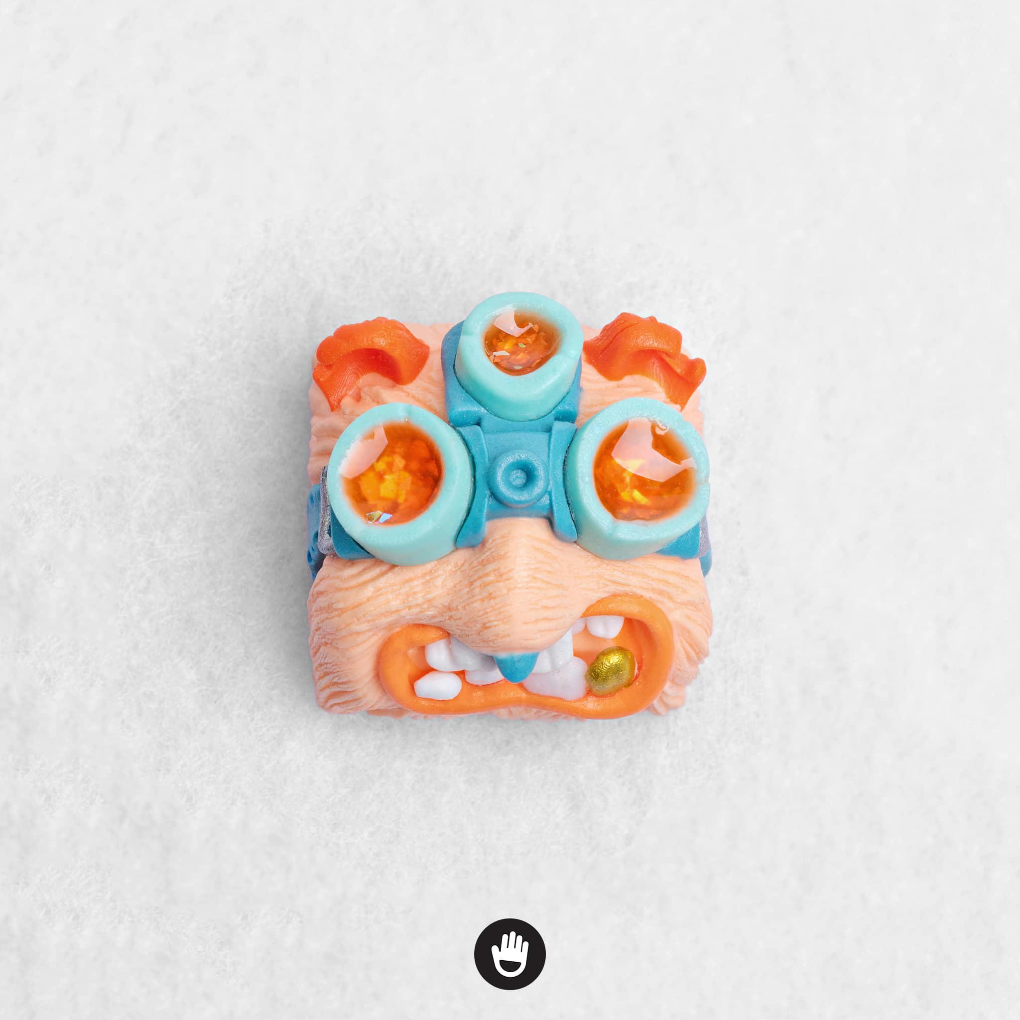 Michel chose the colors himself, he explain he want to try with a different effect with his favorite orange color on the goggles rather than on the band, so we suggest him to use the dark blue for the band, it’s a pretty good relevant combination. The ears is yellow and told us to have the golden tooth on the sculpture at the last minute, he shrugged his shoulders and said “That’d be an icon”
