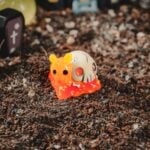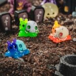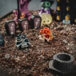 The ghost, once the playful spirit of a child who roamed the village in happier times, danced around the pumpkin, giggling and swooping through the cool night air. The jack-o’-lantern, with its distinct, sharp face, seemed delighted by its own haunting glow, casting a warm but eerie light into every shadow. The candlelit skull, bearing the wise and melancholic gaze of a long-lost elder, let the candle’s soft glow flicker like a beacon, as if trying to illuminate memories of a forgotten past. Meanwhile, the snail-riding skull glided slowly across the old cobblestones, exuding a patient wisdom, savoring every inch of the journey with a deep, thoughtful gaze.