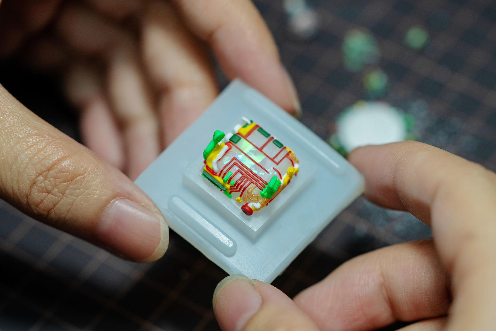 – Each keycap comes in a handmade wooden box. All keycaps are fully handcrafted using resin casting and layer-by-layer coloring. No 3D printing. The photos show real prototype keycaps, not renders.