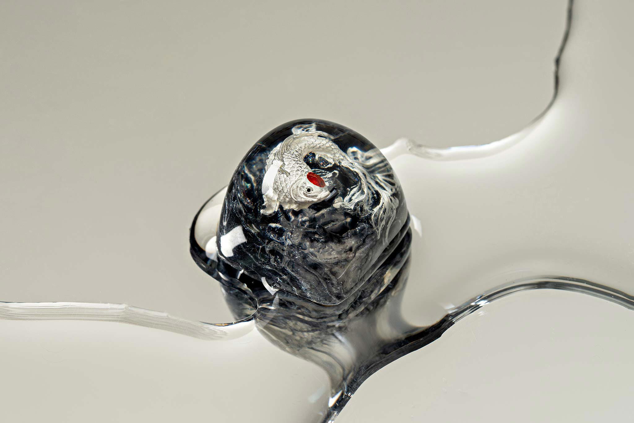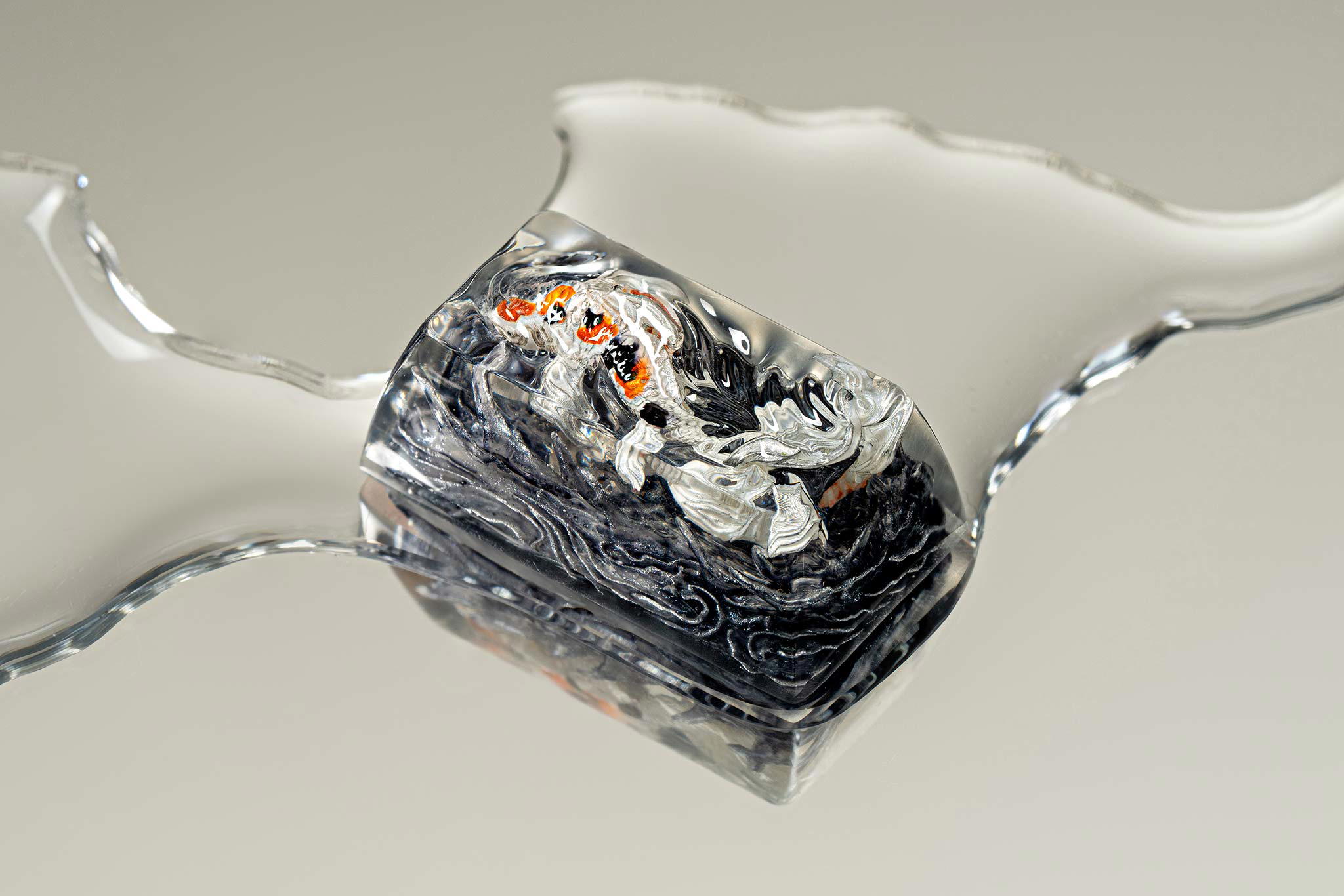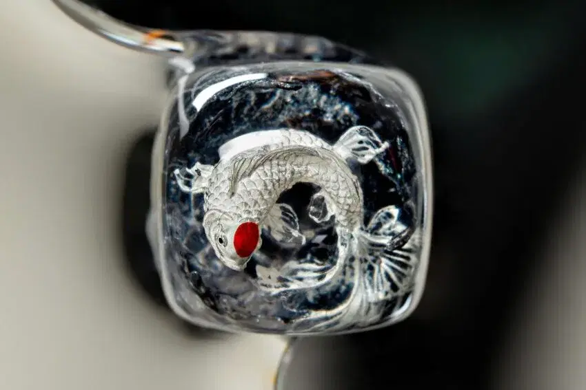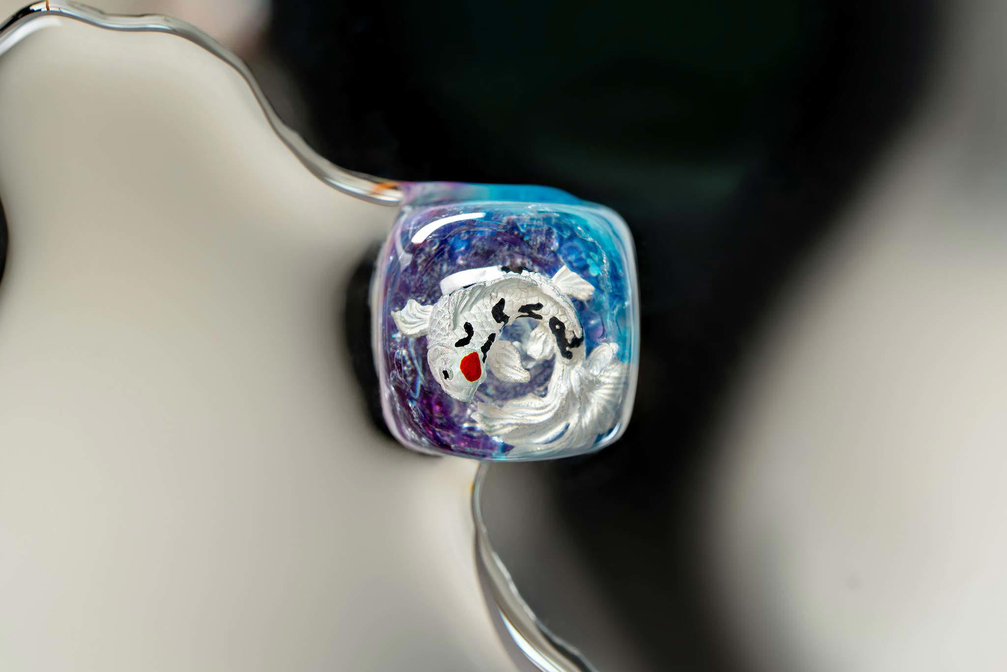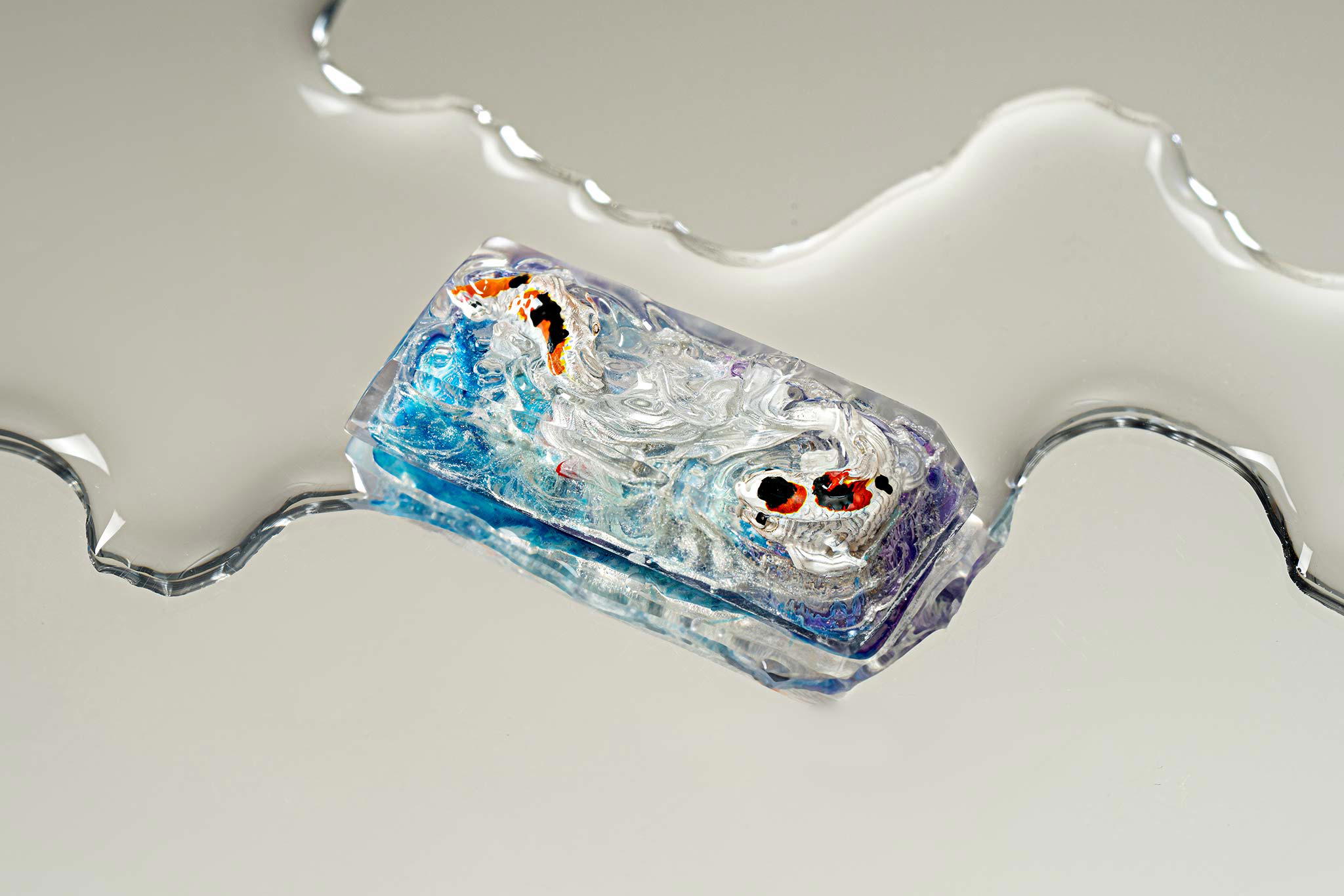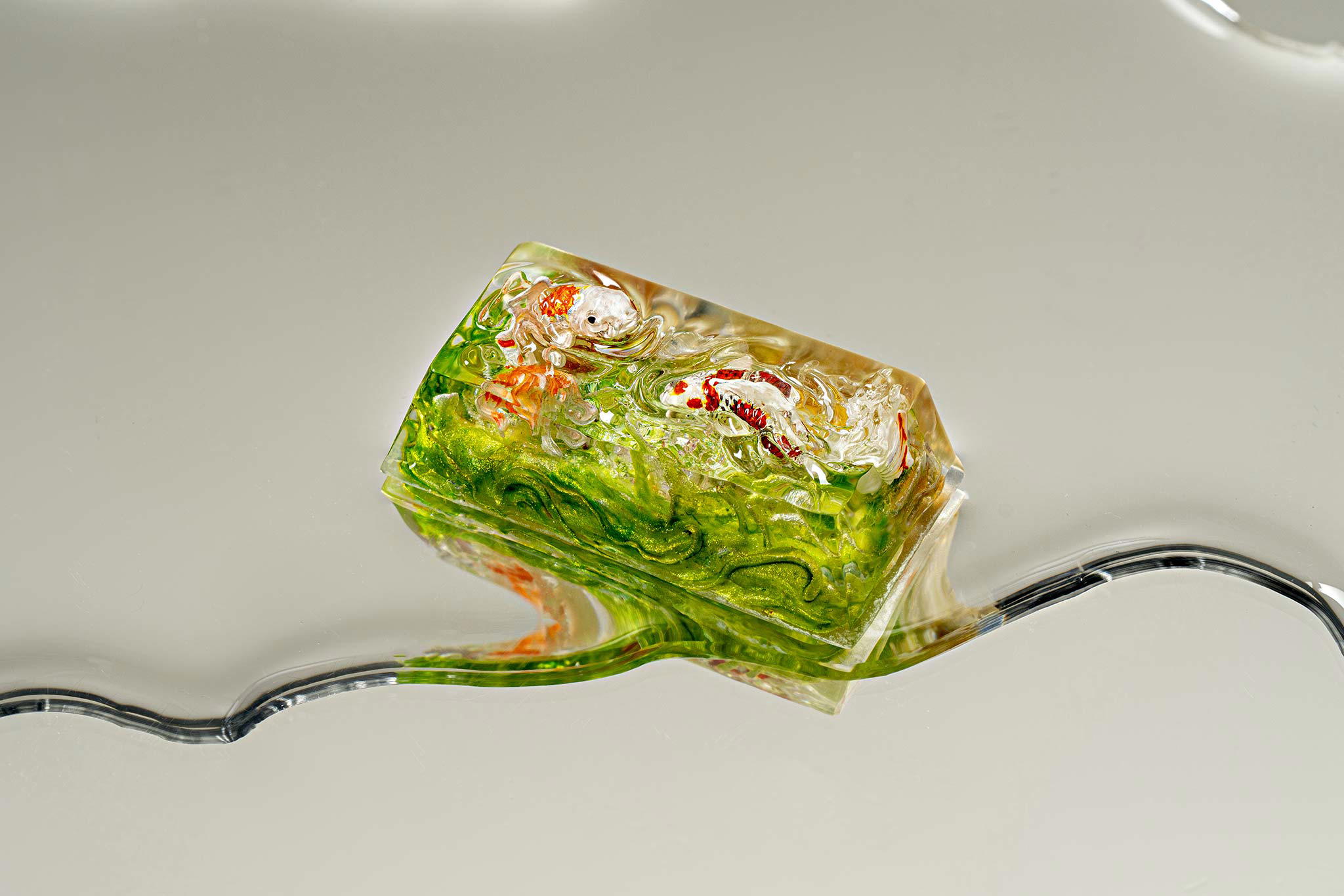 When the final layer of resin is poured, completely encasing the fish, it’s time to position the pre-formed water waves. This is the most crucial step, where “nature” and its “inhabitants” blend into a complete artwork. The most challenging part is handling the protruding portions of the Koi fish – they remain within the resin but rise above the keycap surface with “water” surrounding them, protecting the fish while ensuring daily usability and maintaining consistent aesthetics throughout. But the journey isn’t over yet – we still need to wait another 24 hours for the resin to fully solidify.