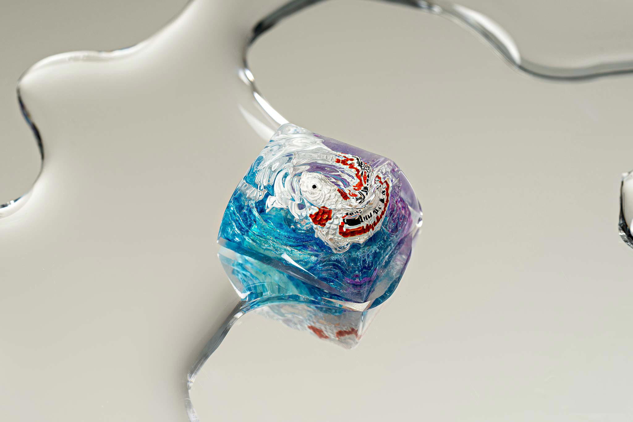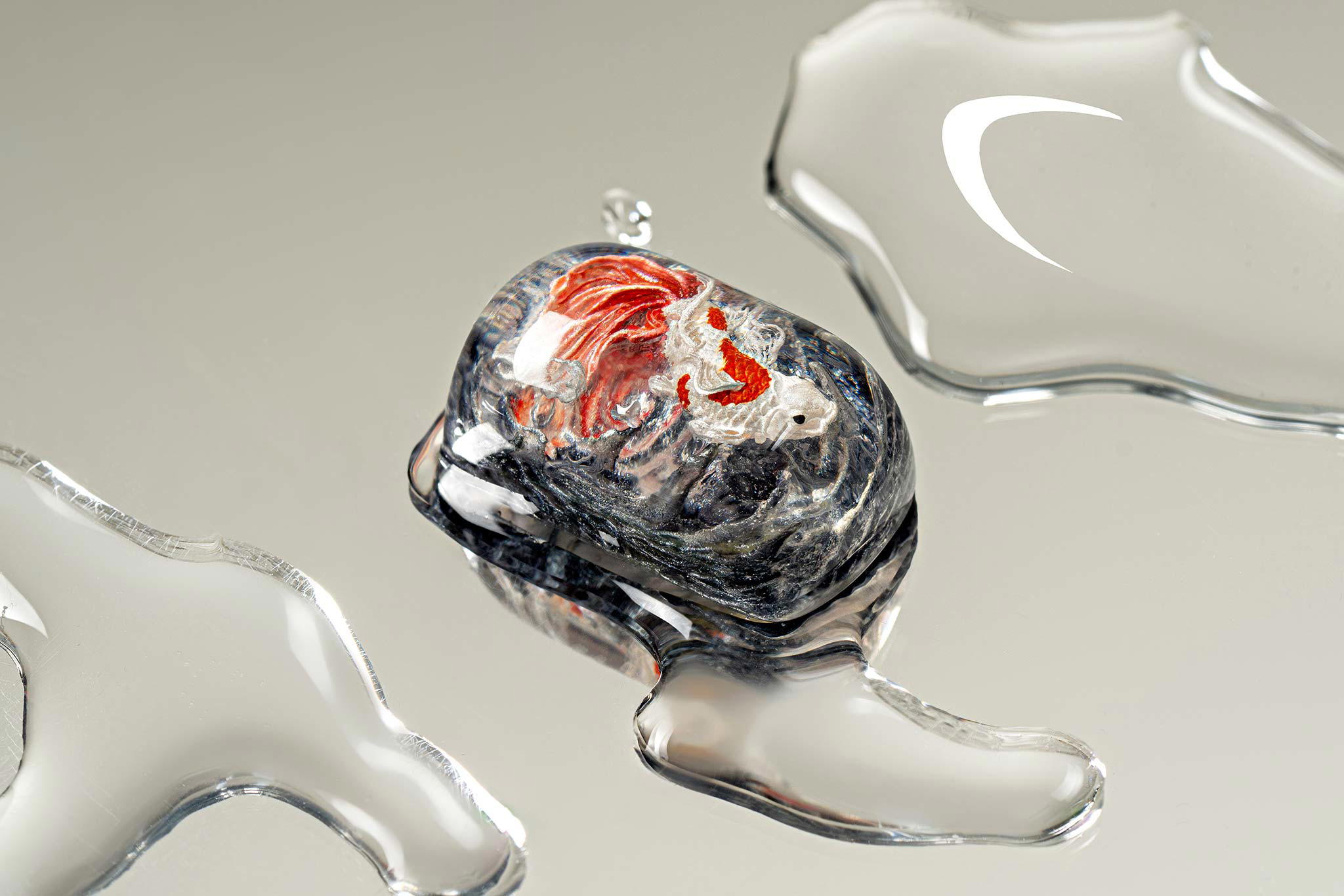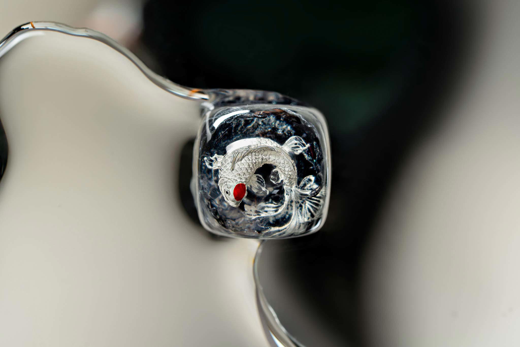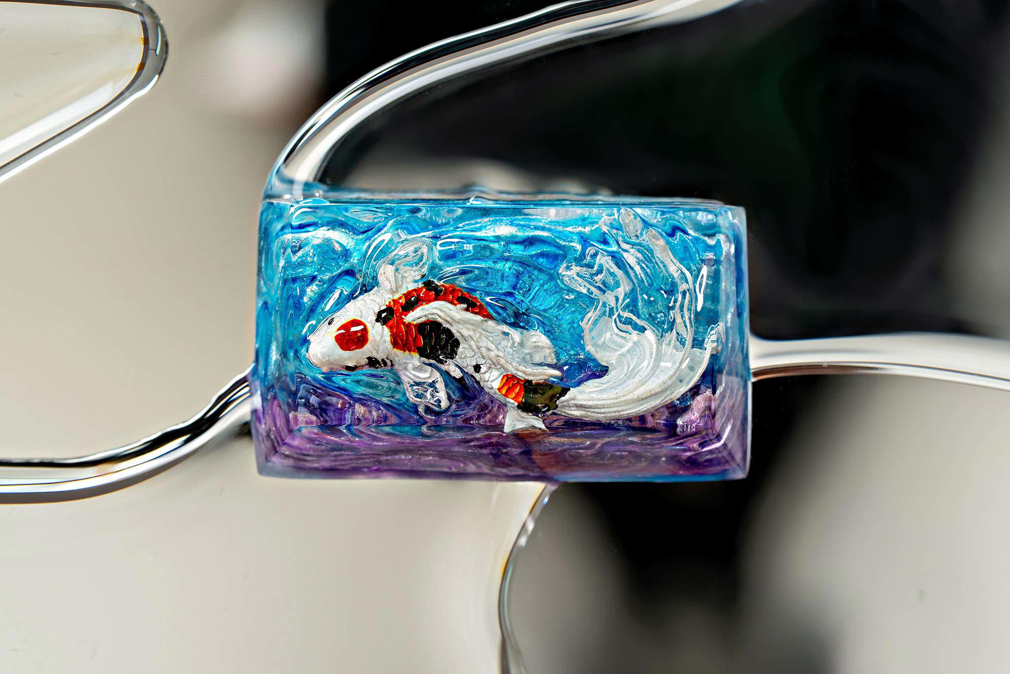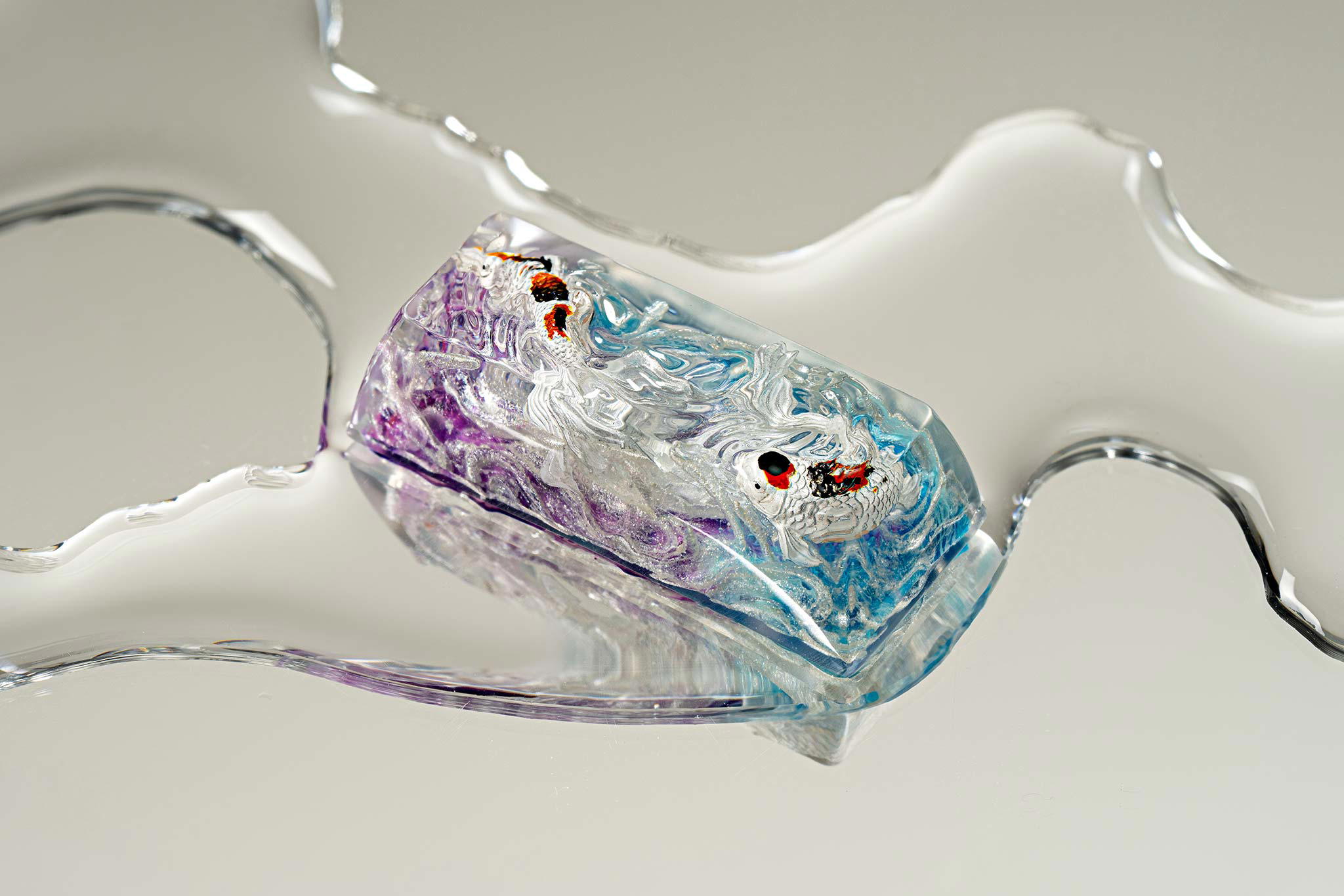 When the final layer of resin is poured, completely encasing the fish, it’s time to position the pre-formed water waves. This is the most crucial step, where “nature” and its “inhabitants” blend into a complete artwork. The most challenging part is handling the protruding portions of the Koi fish – they remain within the resin but rise above the keycap surface with “water” surrounding them, protecting the fish while ensuring daily usability and maintaining consistent aesthetics throughout. But the journey isn’t over yet – we still need to wait another 24 hours for the resin to fully solidify.