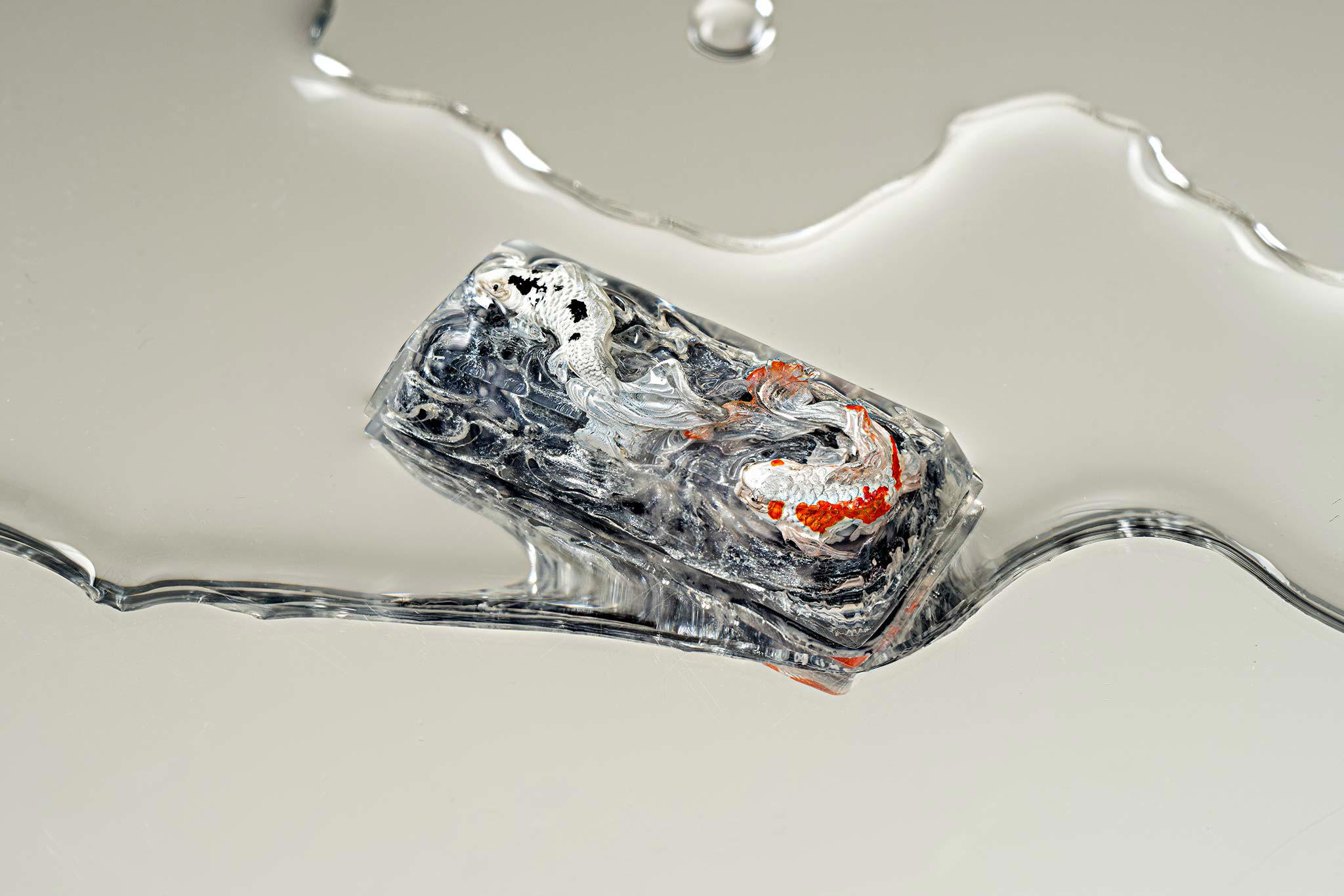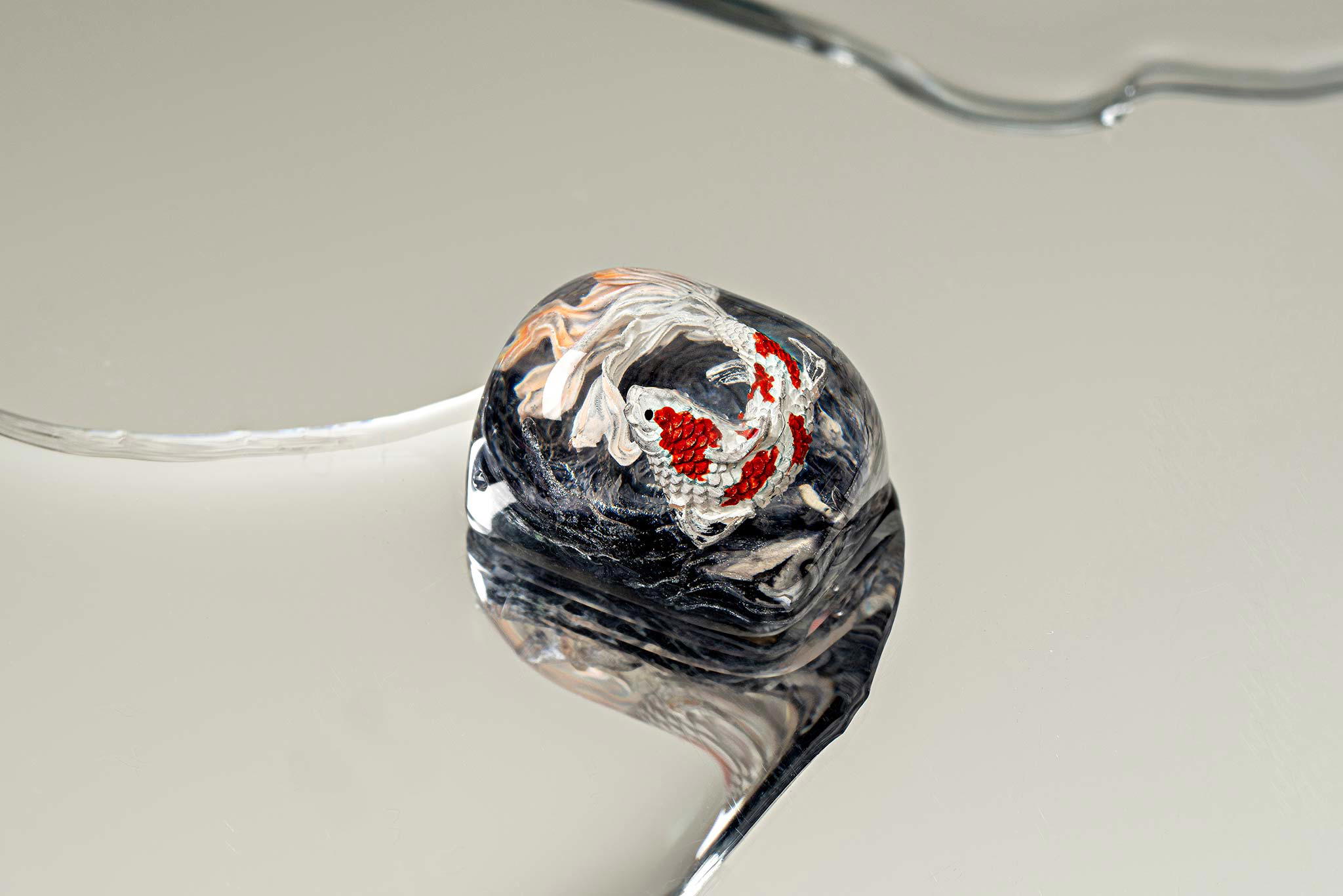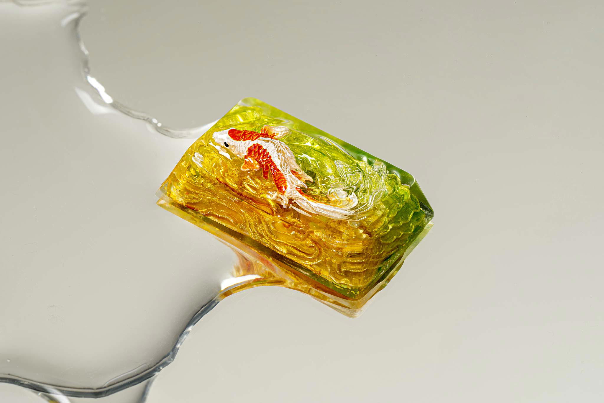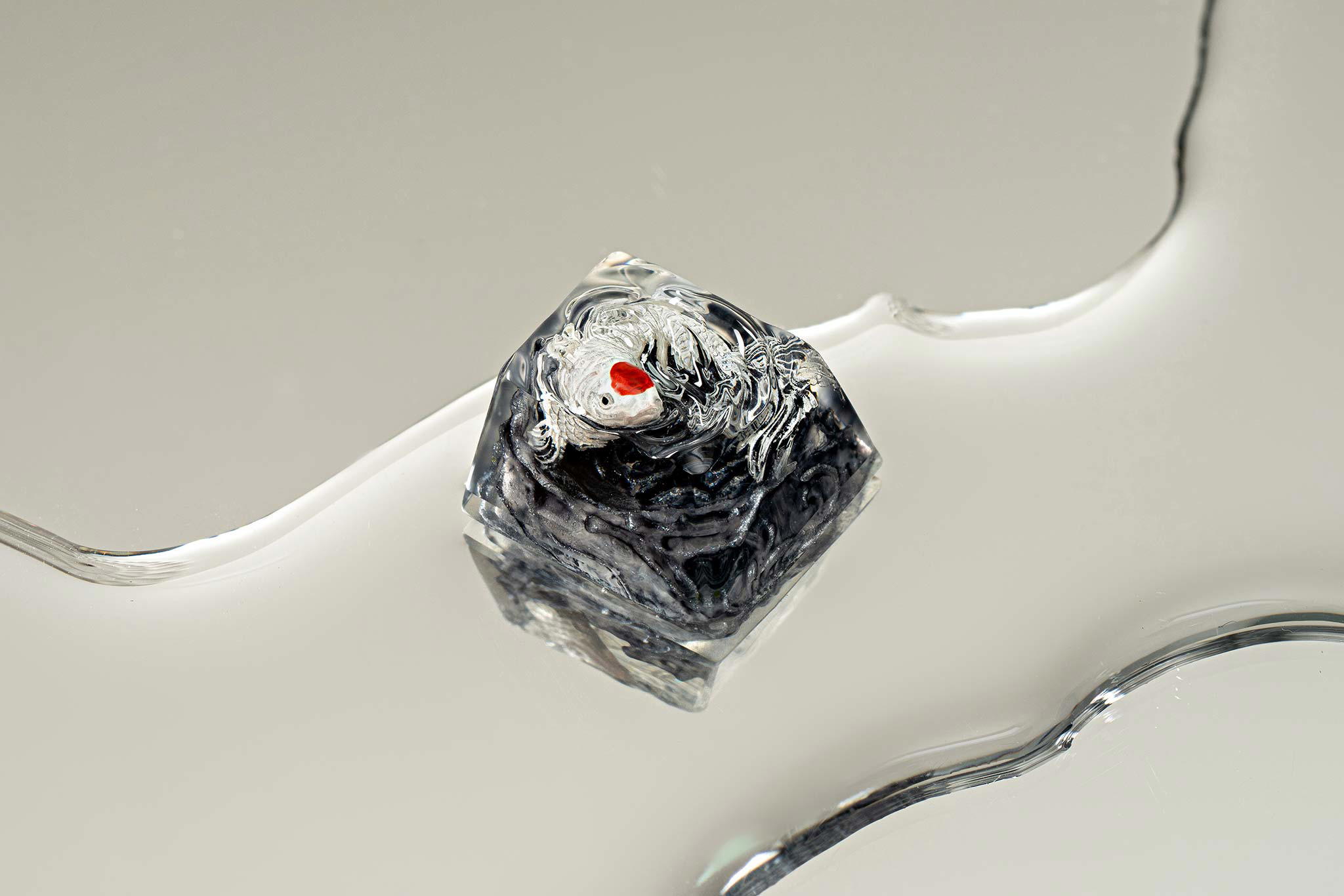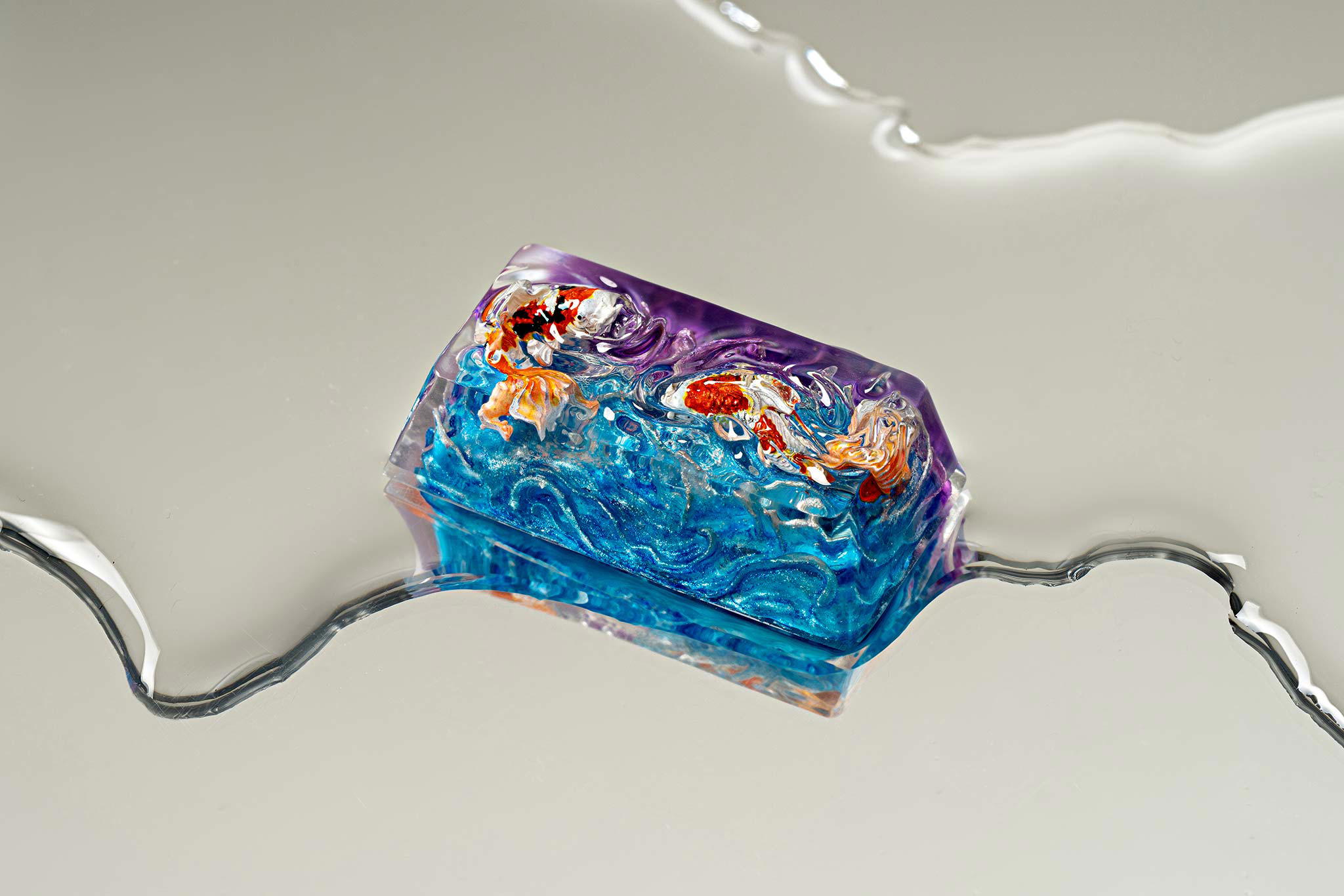 When the final layer of resin is poured, completely encasing the fish, it’s time to position the pre-formed water waves. This is the most crucial step, where “nature” and its “inhabitants” blend into a complete artwork. The most challenging part is handling the protruding portions of the Koi fish – they remain within the resin but rise above the keycap surface with “water” surrounding them, protecting the fish while ensuring daily usability and maintaining consistent aesthetics throughout. But the journey isn’t over yet – we still need to wait another 24 hours for the resin to fully solidify.