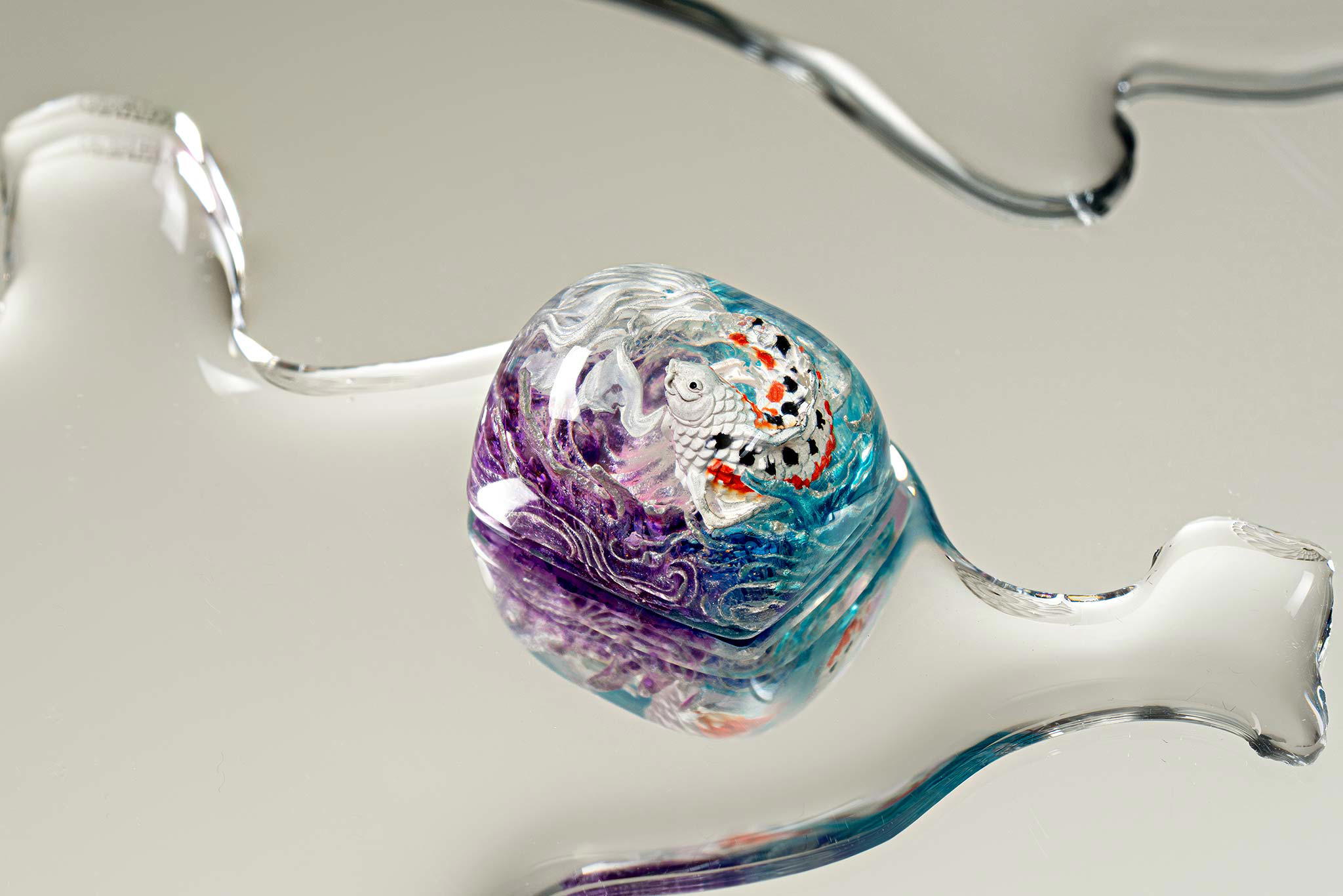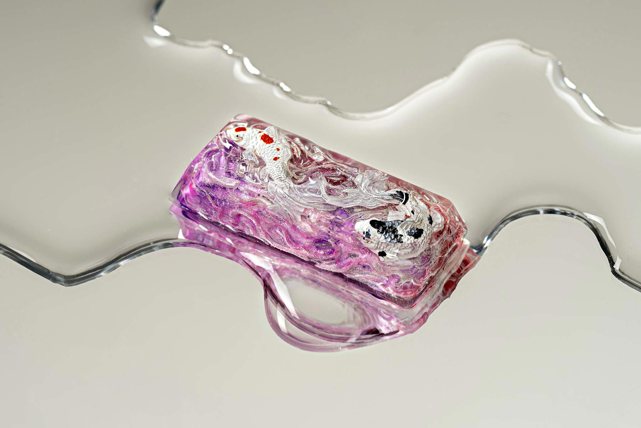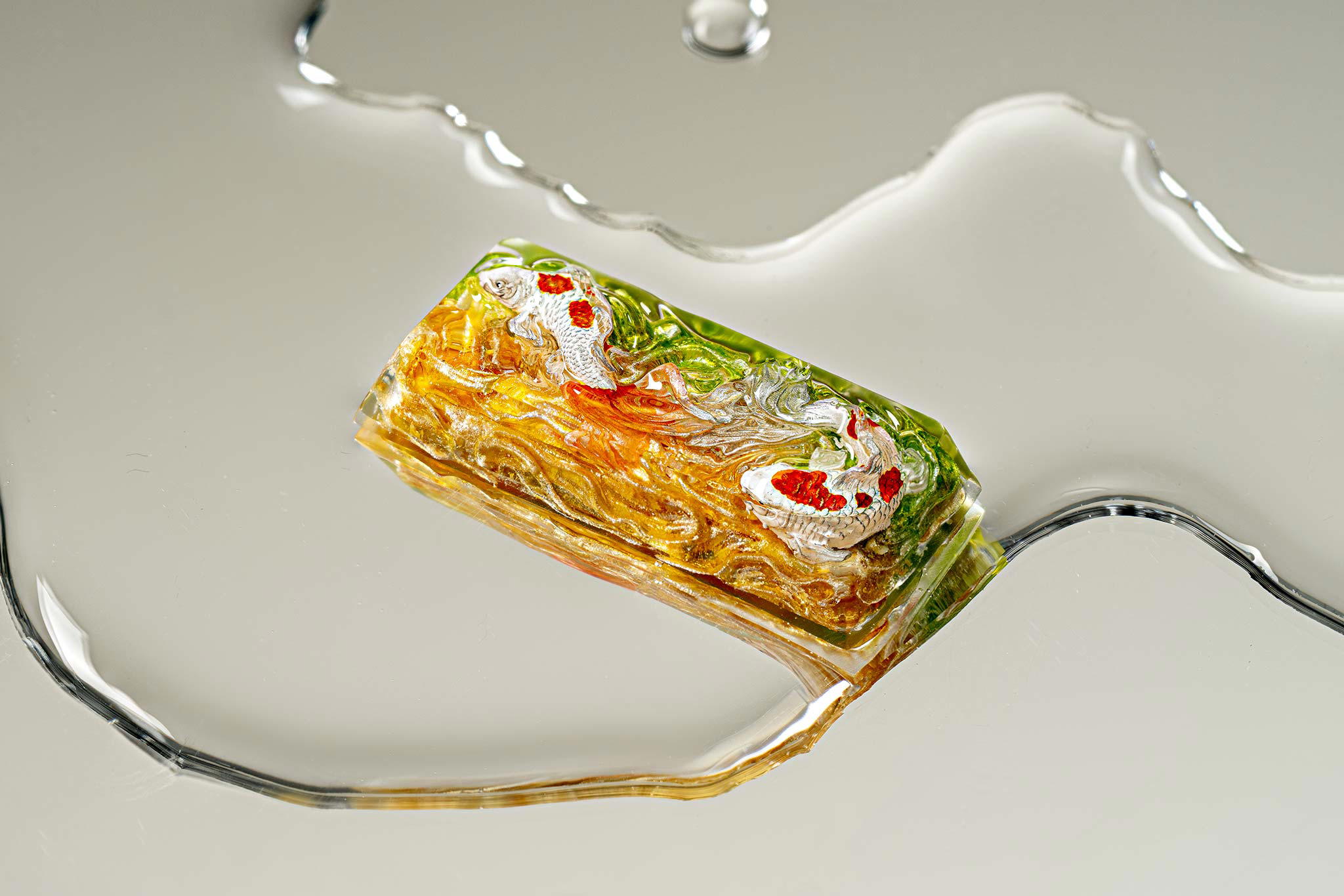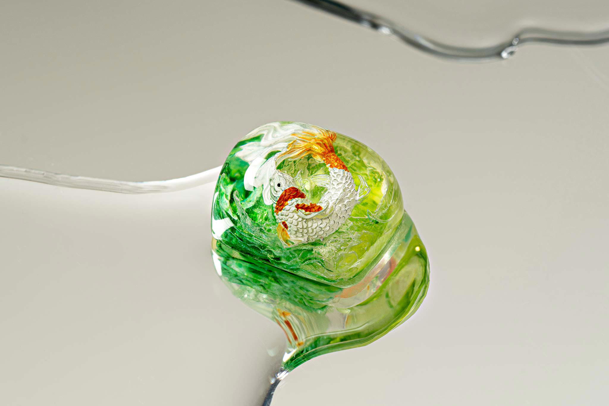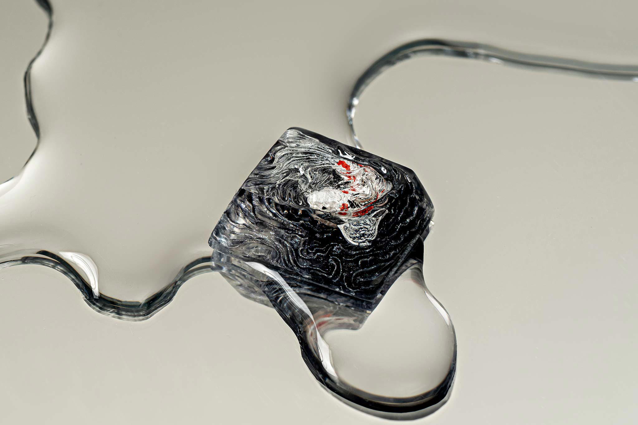 When the final layer of resin is poured, completely encasing the fish, it’s time to position the pre-formed water waves. This is the most crucial step, where “nature” and its “inhabitants” blend into a complete artwork. The most challenging part is handling the protruding portions of the Koi fish – they remain within the resin but rise above the keycap surface with “water” surrounding them, protecting the fish while ensuring daily usability and maintaining consistent aesthetics throughout. But the journey isn’t over yet – we still need to wait another 24 hours for the resin to fully solidify.