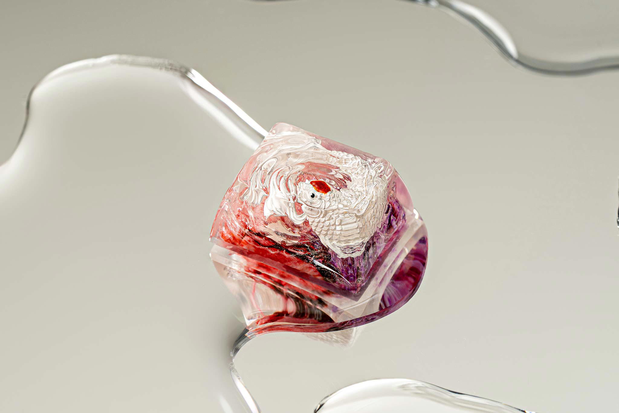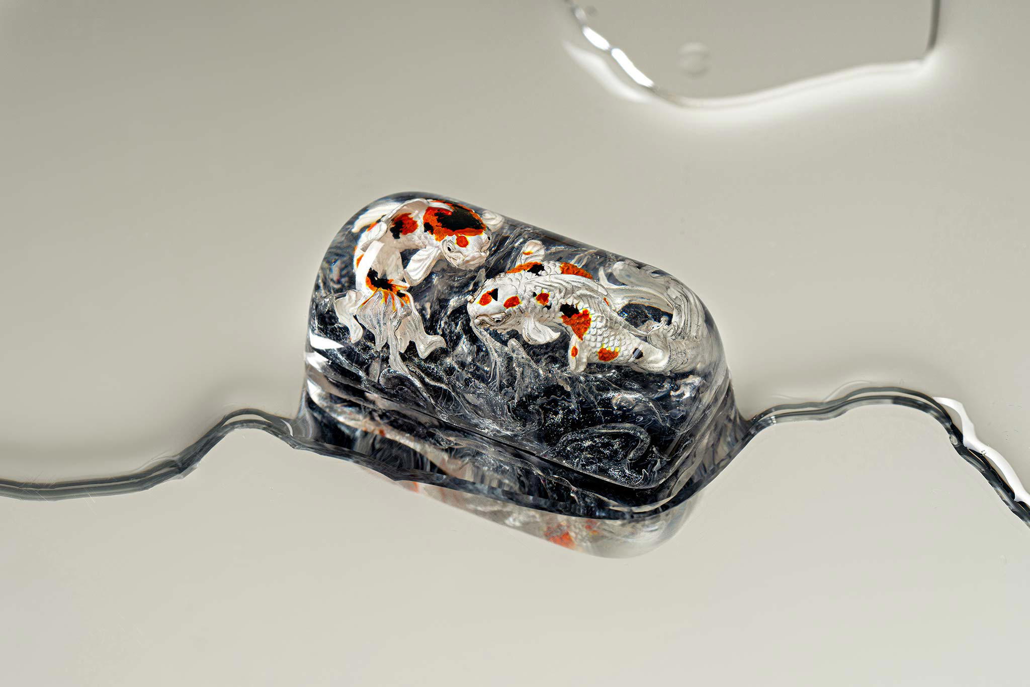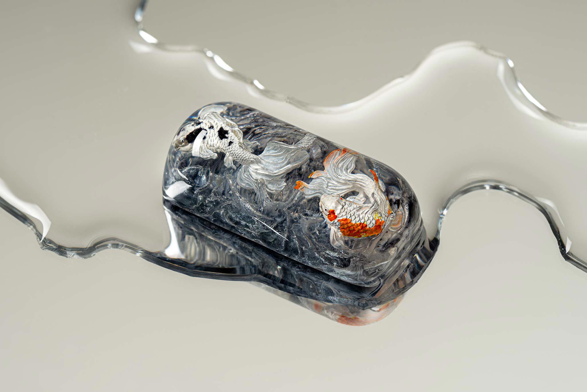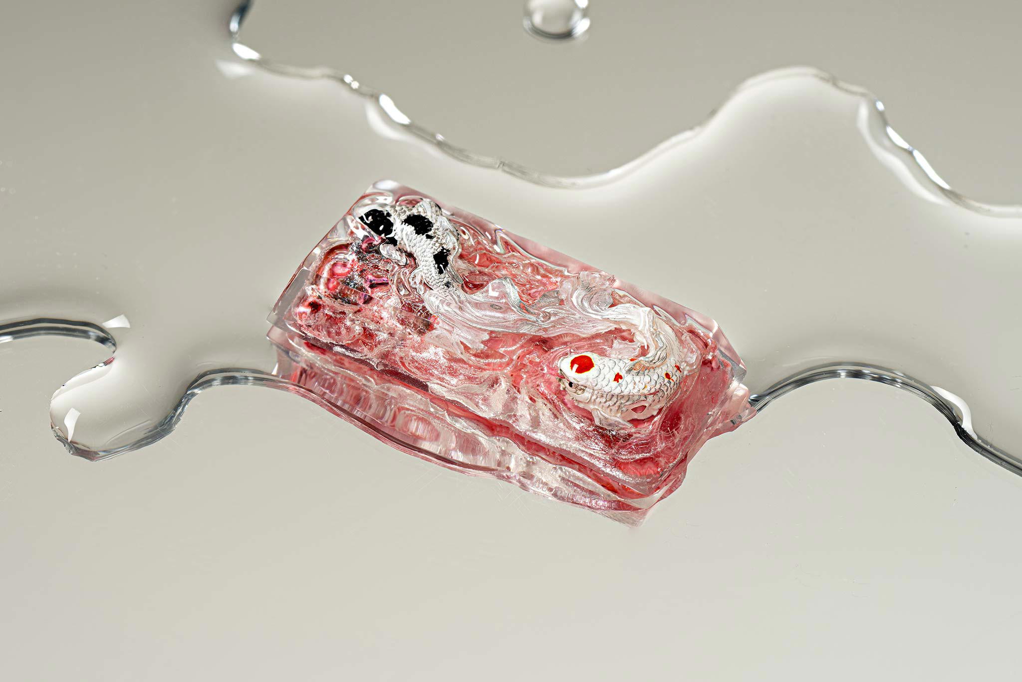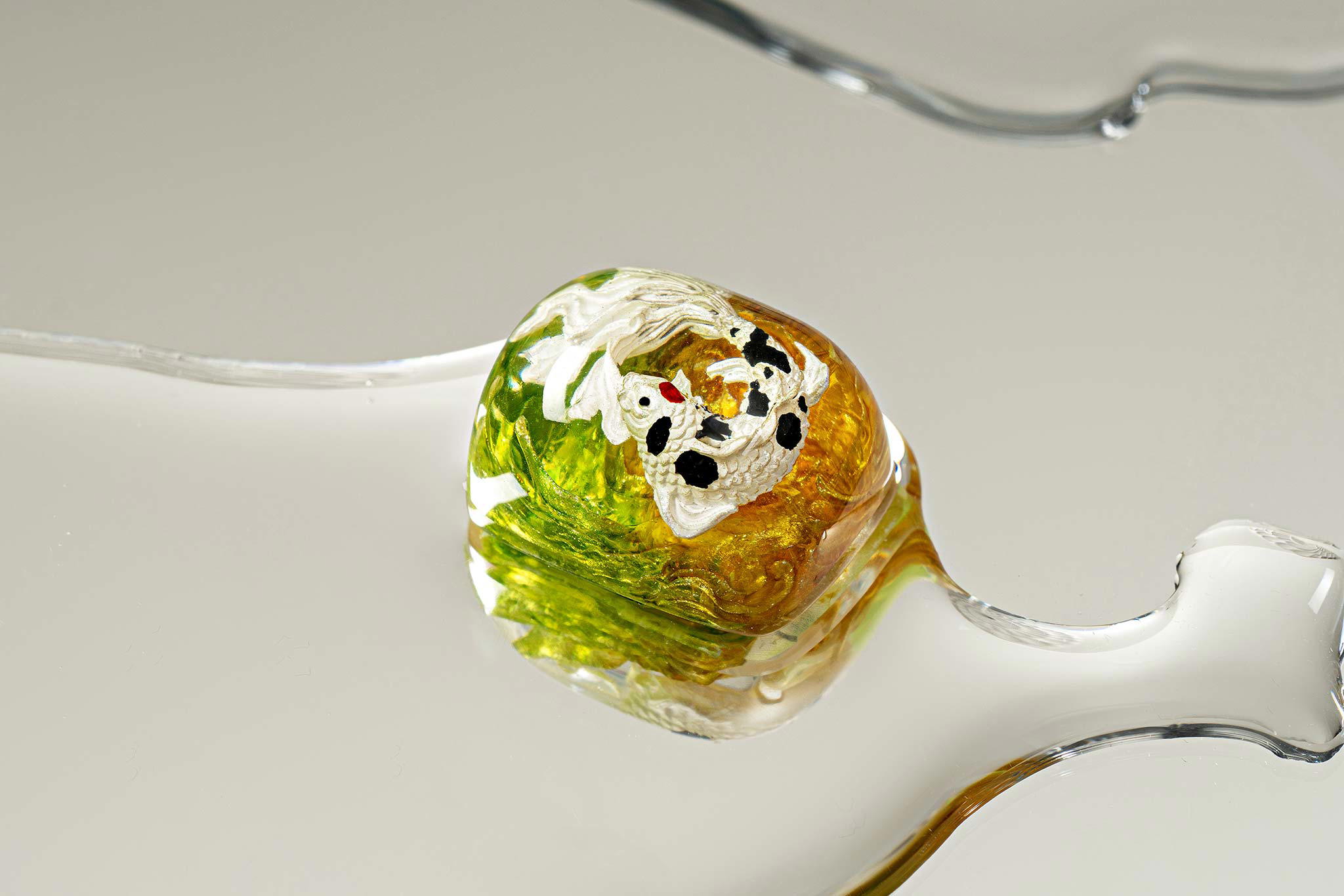 When the final layer of resin is poured, completely encasing the fish, it’s time to position the pre-formed water waves. This is the most crucial step, where “nature” and its “inhabitants” blend into a complete artwork. The most challenging part is handling the protruding portions of the Koi fish – they remain within the resin but rise above the keycap surface with “water” surrounding them, protecting the fish while ensuring daily usability and maintaining consistent aesthetics throughout. But the journey isn’t over yet – we still need to wait another 24 hours for the resin to fully solidify.