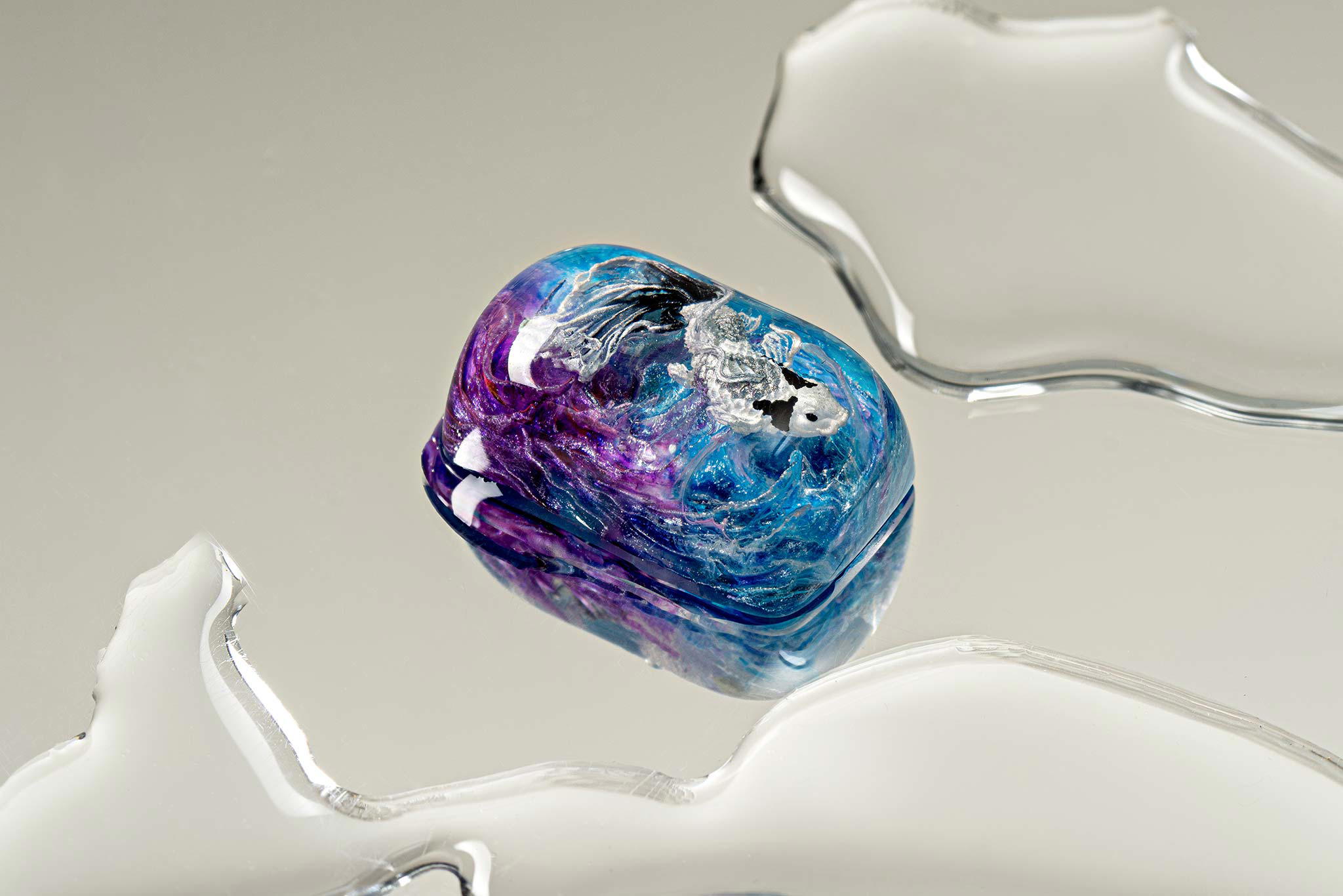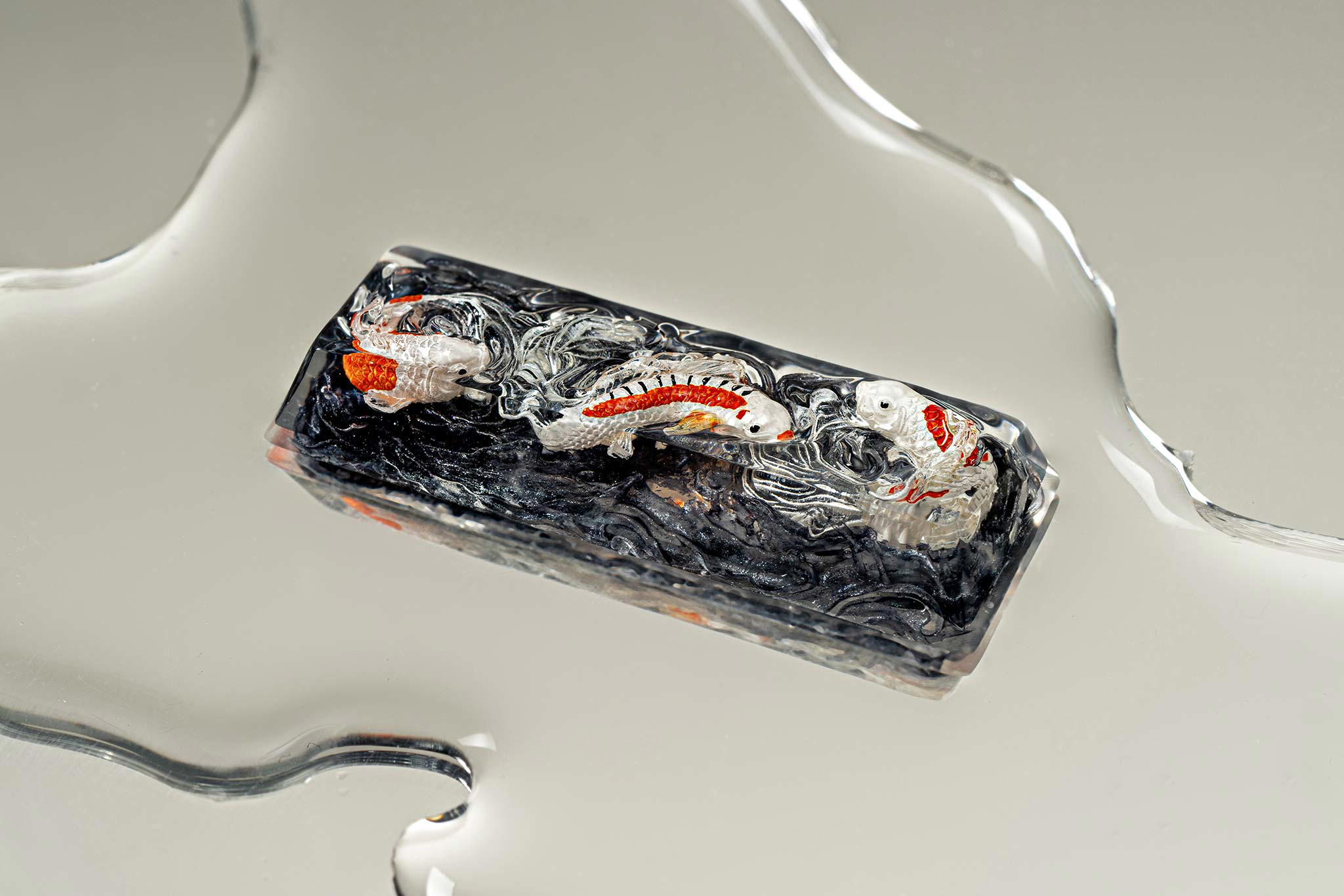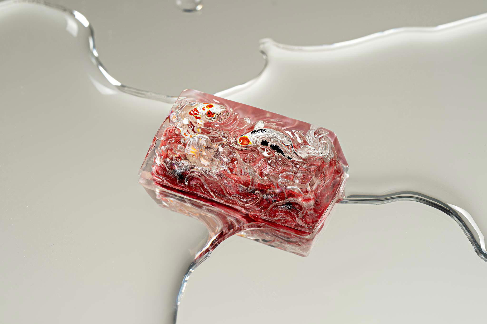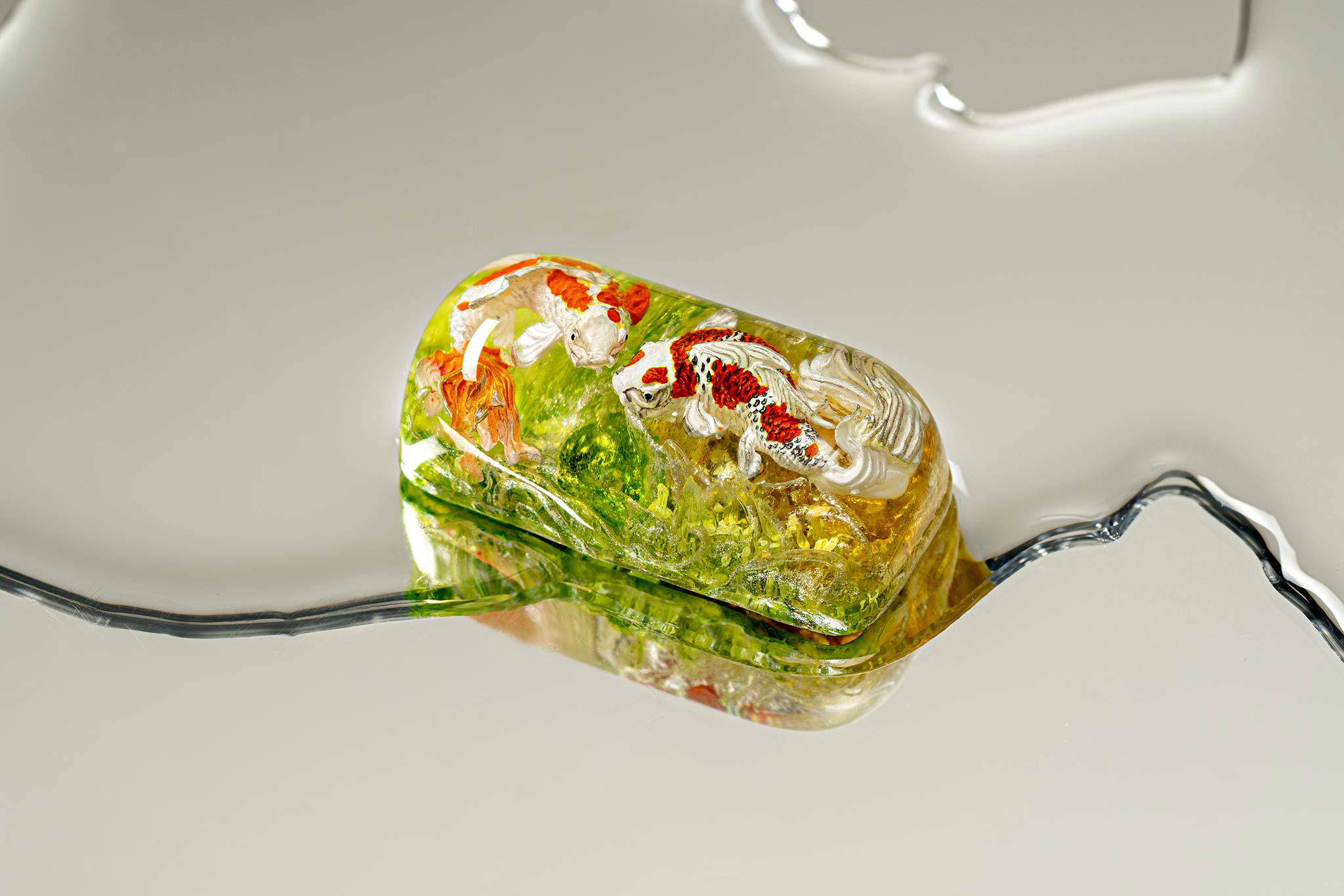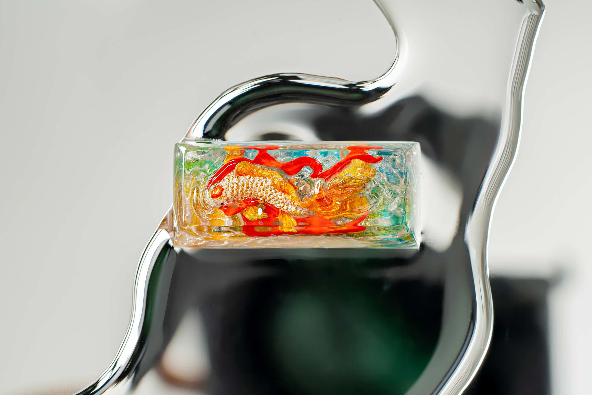 When the final layer of resin is poured, completely encasing the fish, it’s time to position the pre-formed water waves. This is the most crucial step, where “nature” and its “inhabitants” blend into a complete artwork. The most challenging part is handling the protruding portions of the Koi fish – they remain within the resin but rise above the keycap surface with “water” surrounding them, protecting the fish while ensuring daily usability and maintaining consistent aesthetics throughout. But the journey isn’t over yet – we still need to wait another 24 hours for the resin to fully solidify.