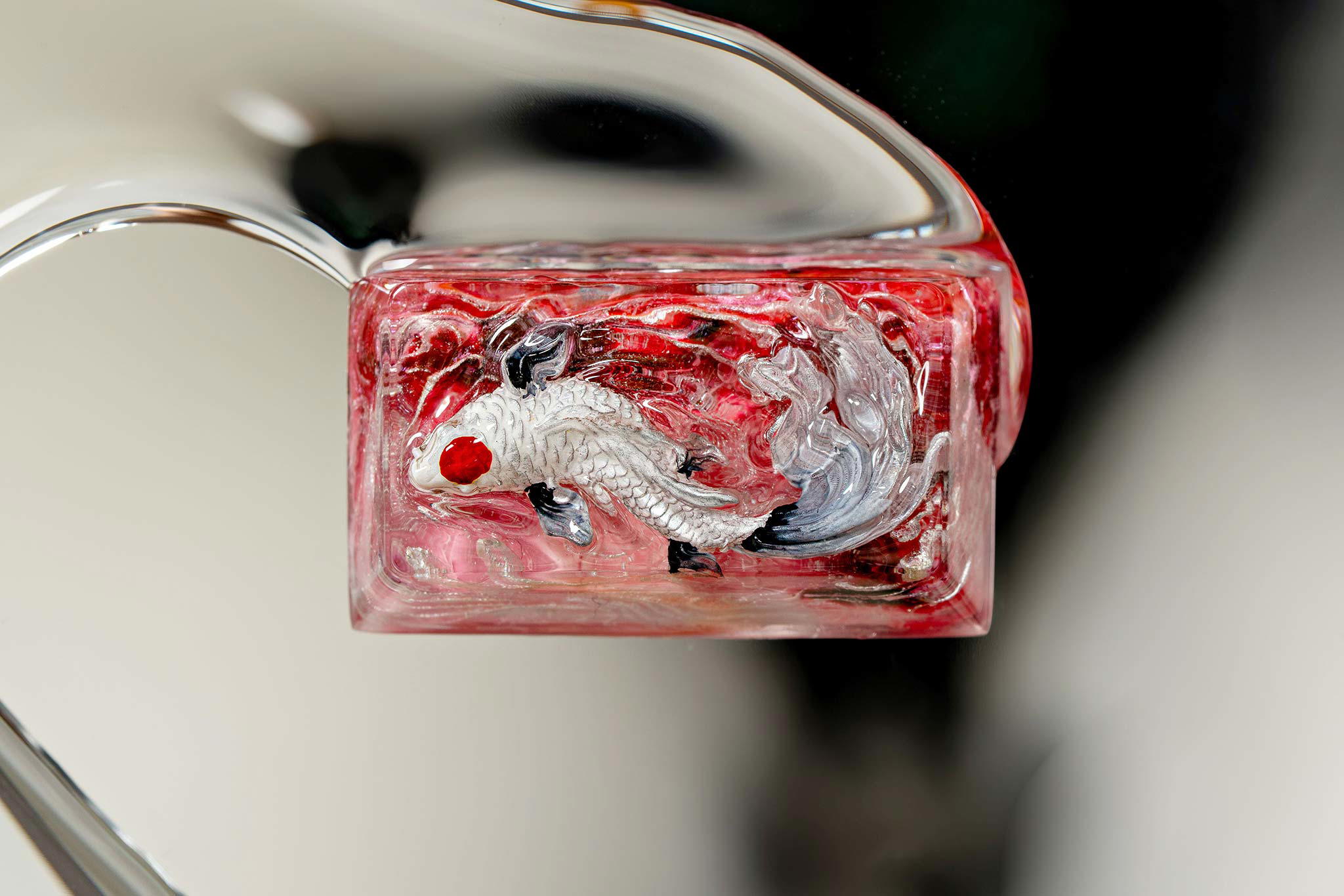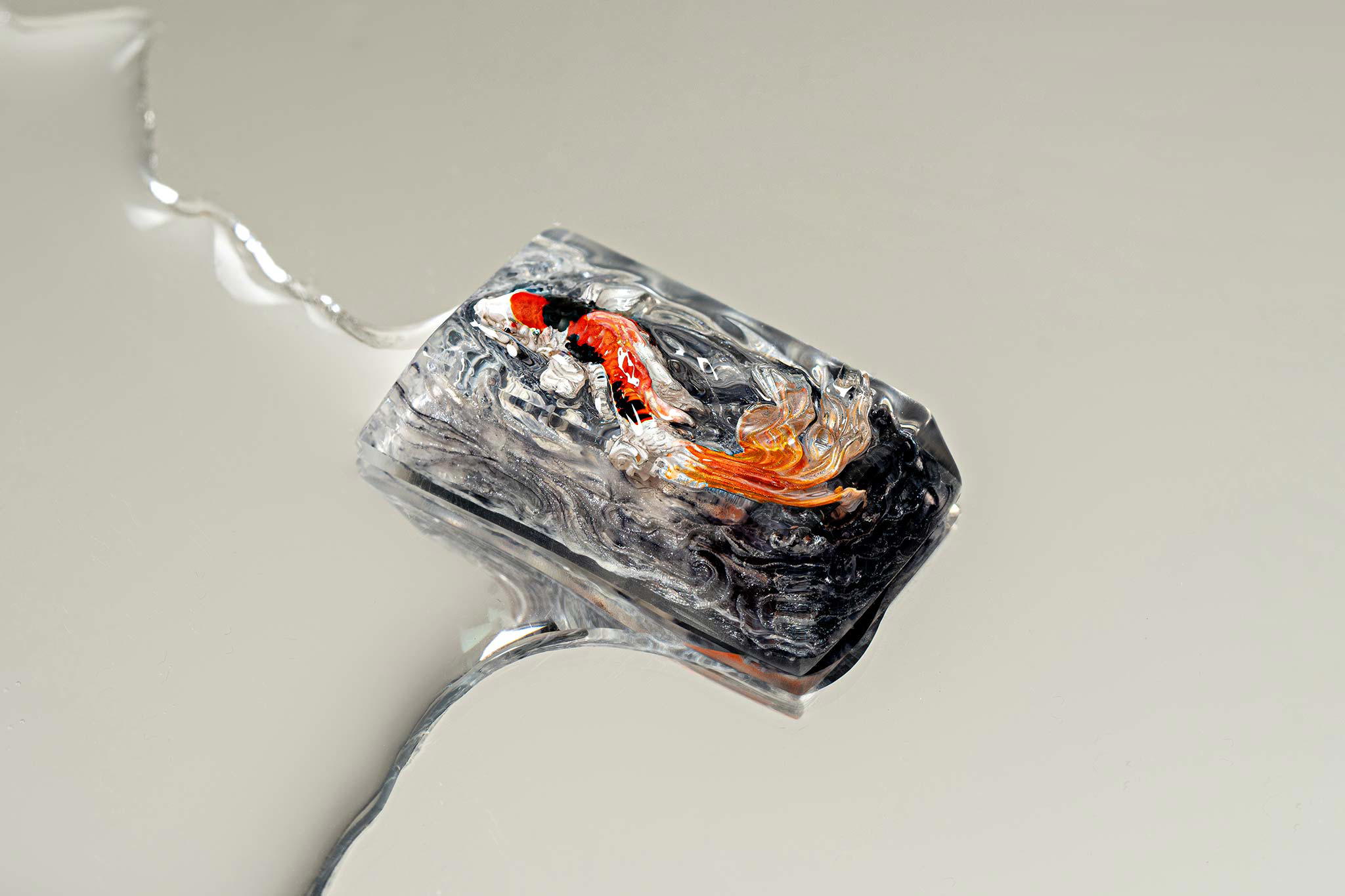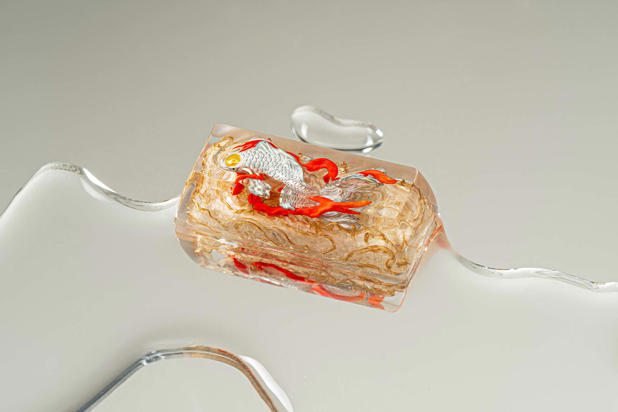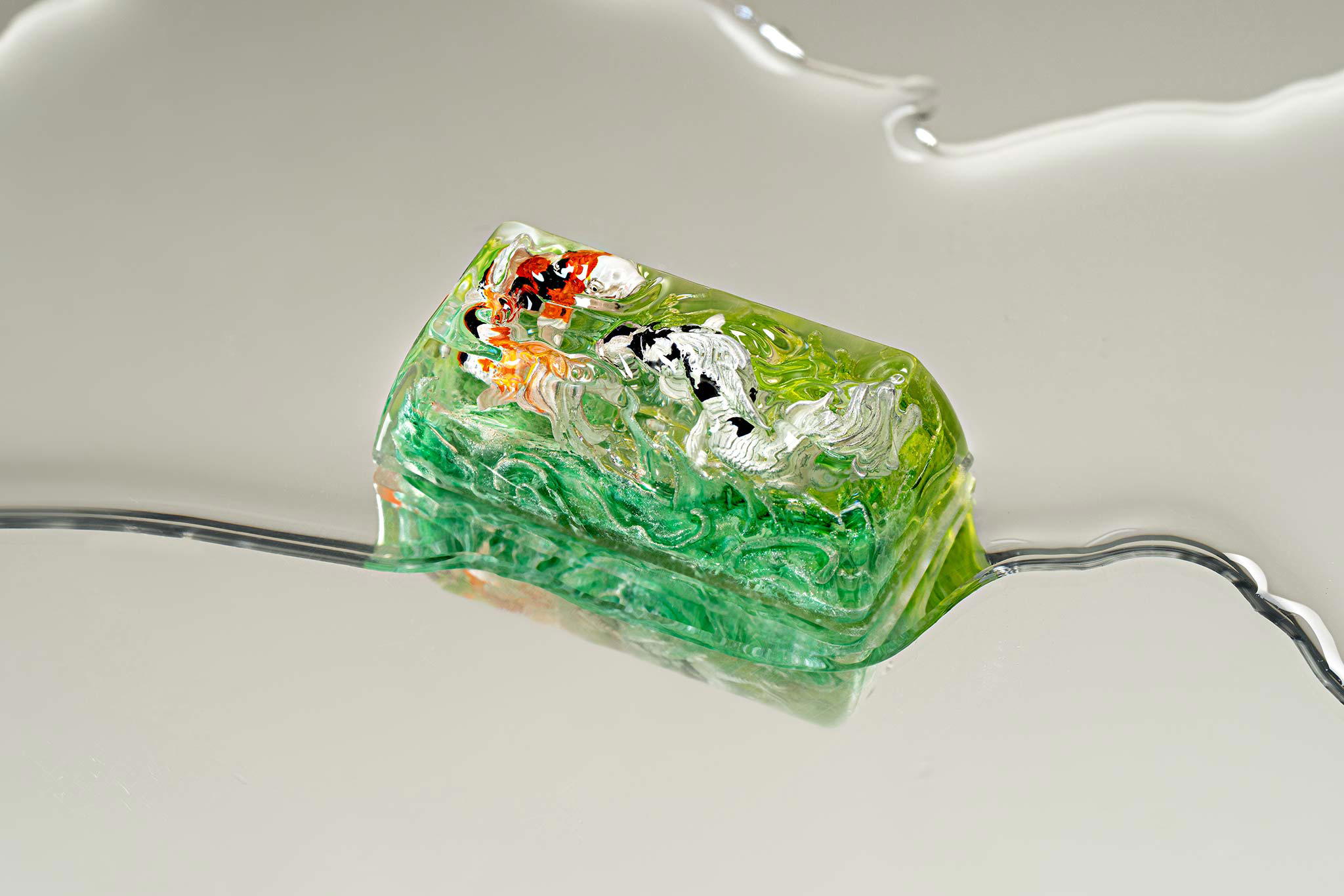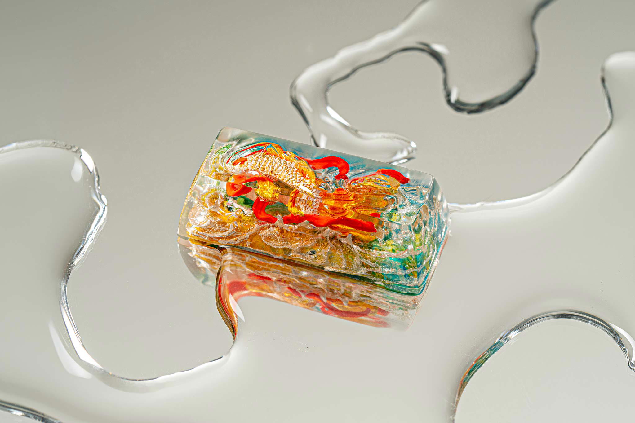 When the final layer of resin is poured, completely encasing the fish, it’s time to position the pre-formed water waves. This is the most crucial step, where “nature” and its “inhabitants” blend into a complete artwork. The most challenging part is handling the protruding portions of the Koi fish – they remain within the resin but rise above the keycap surface with “water” surrounding them, protecting the fish while ensuring daily usability and maintaining consistent aesthetics throughout. But the journey isn’t over yet – we still need to wait another 24 hours for the resin to fully solidify.