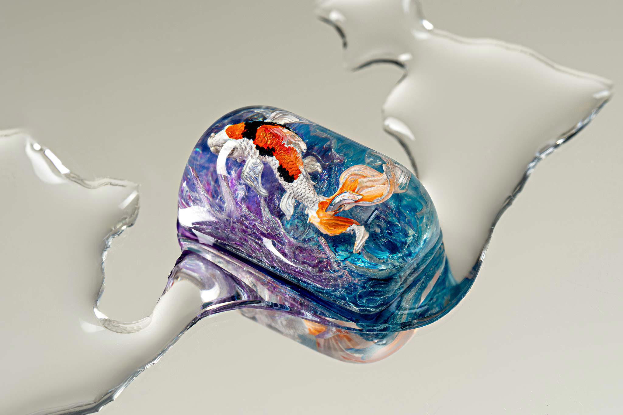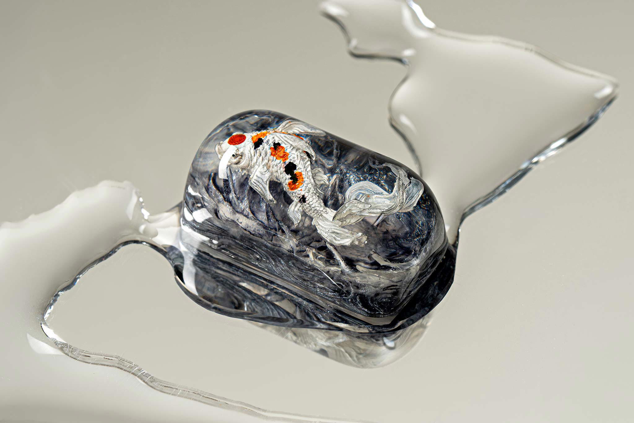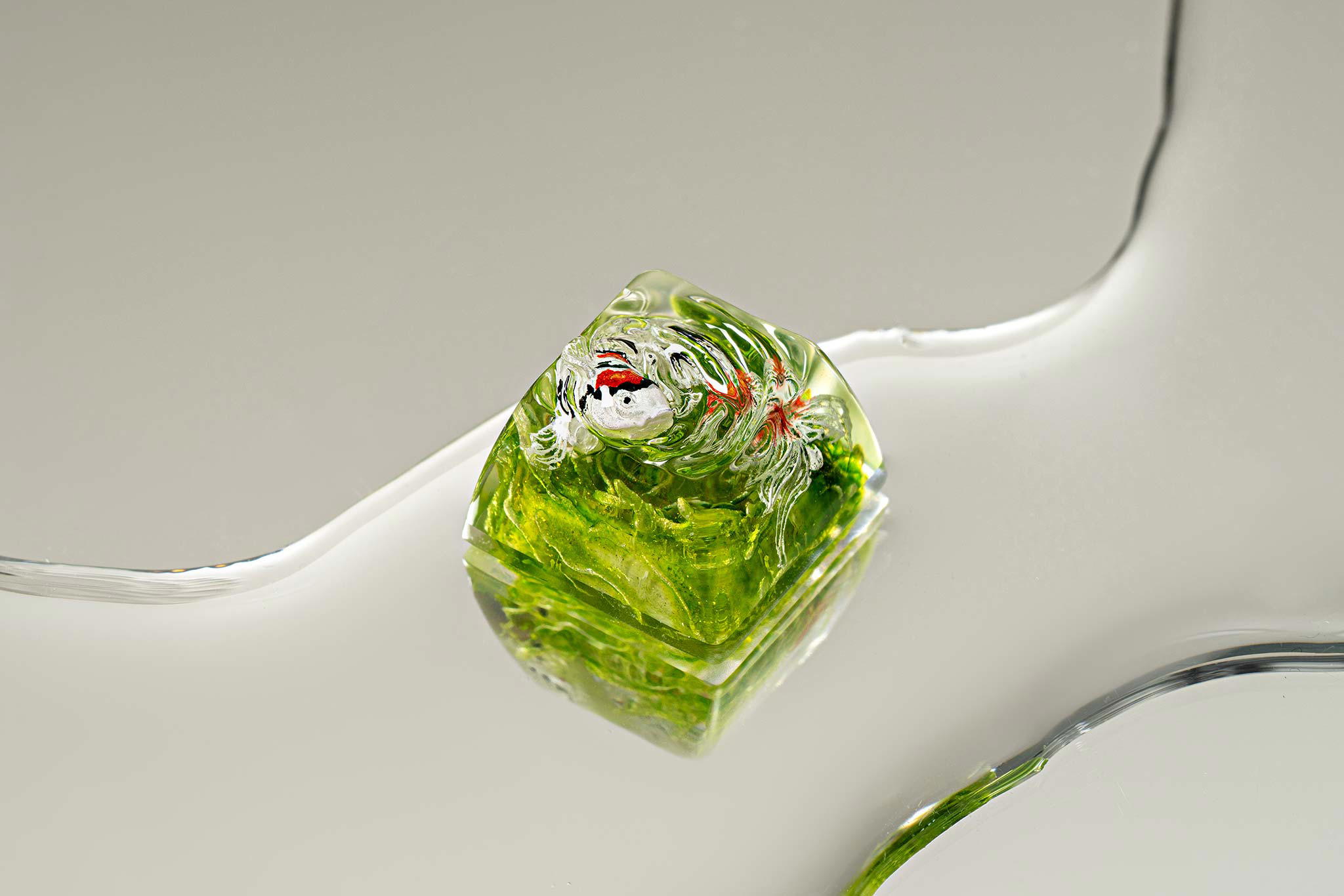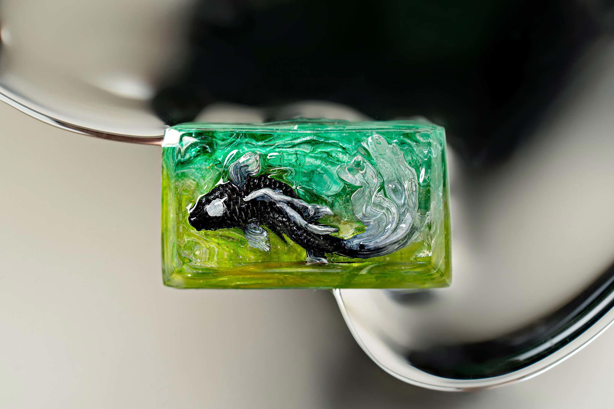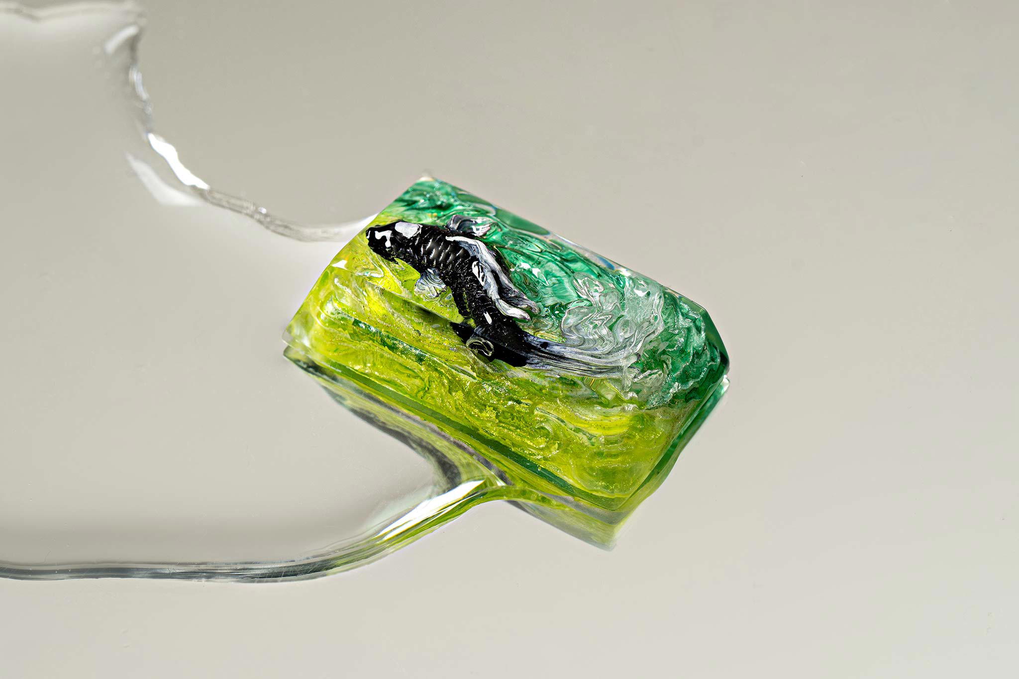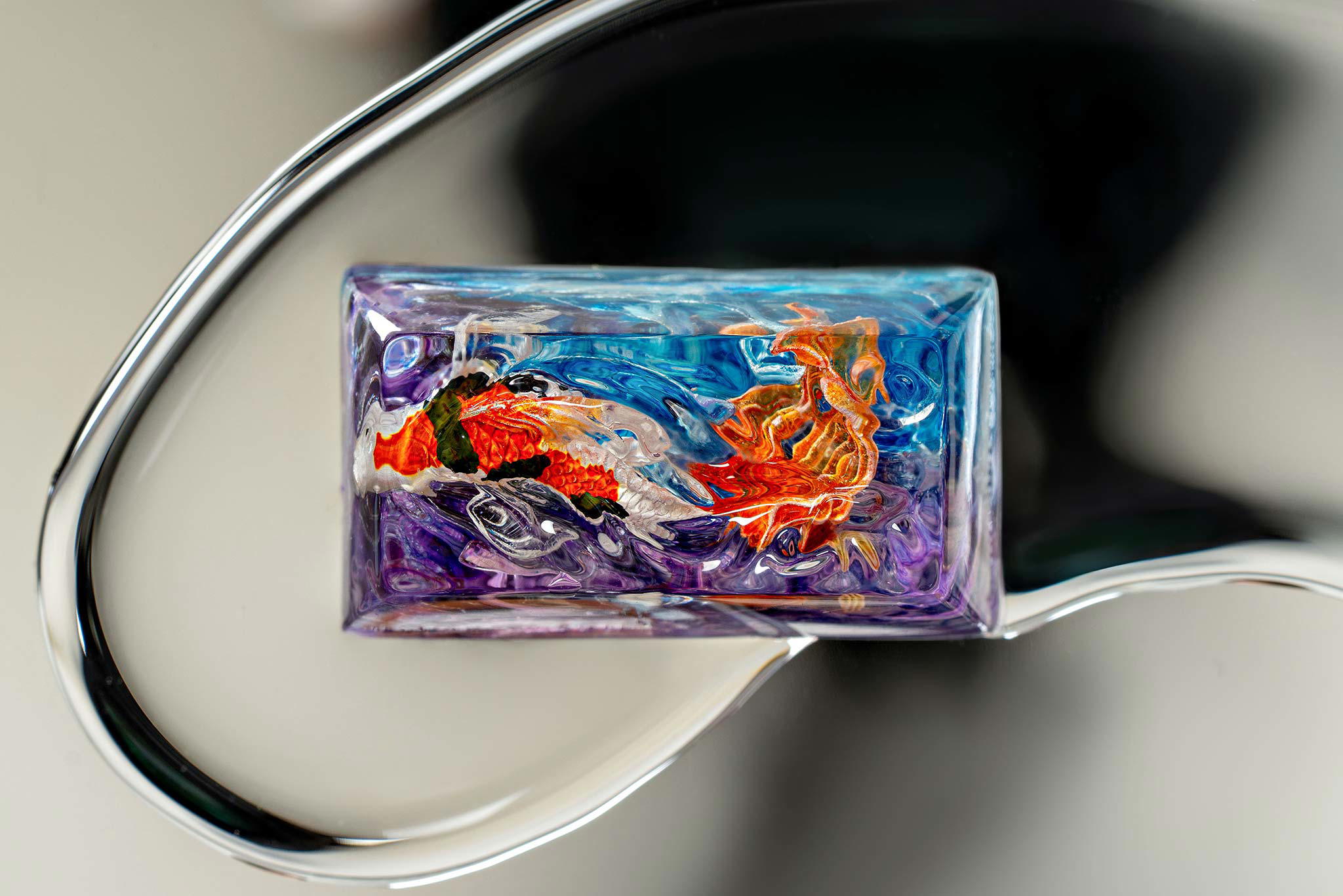 When the final layer of resin is poured, completely encasing the fish, it’s time to position the pre-formed water waves. This is the most crucial step, where “nature” and its “inhabitants” blend into a complete artwork. The most challenging part is handling the protruding portions of the Koi fish – they remain within the resin but rise above the keycap surface with “water” surrounding them, protecting the fish while ensuring daily usability and maintaining consistent aesthetics throughout. But the journey isn’t over yet – we still need to wait another 24 hours for the resin to fully solidify.