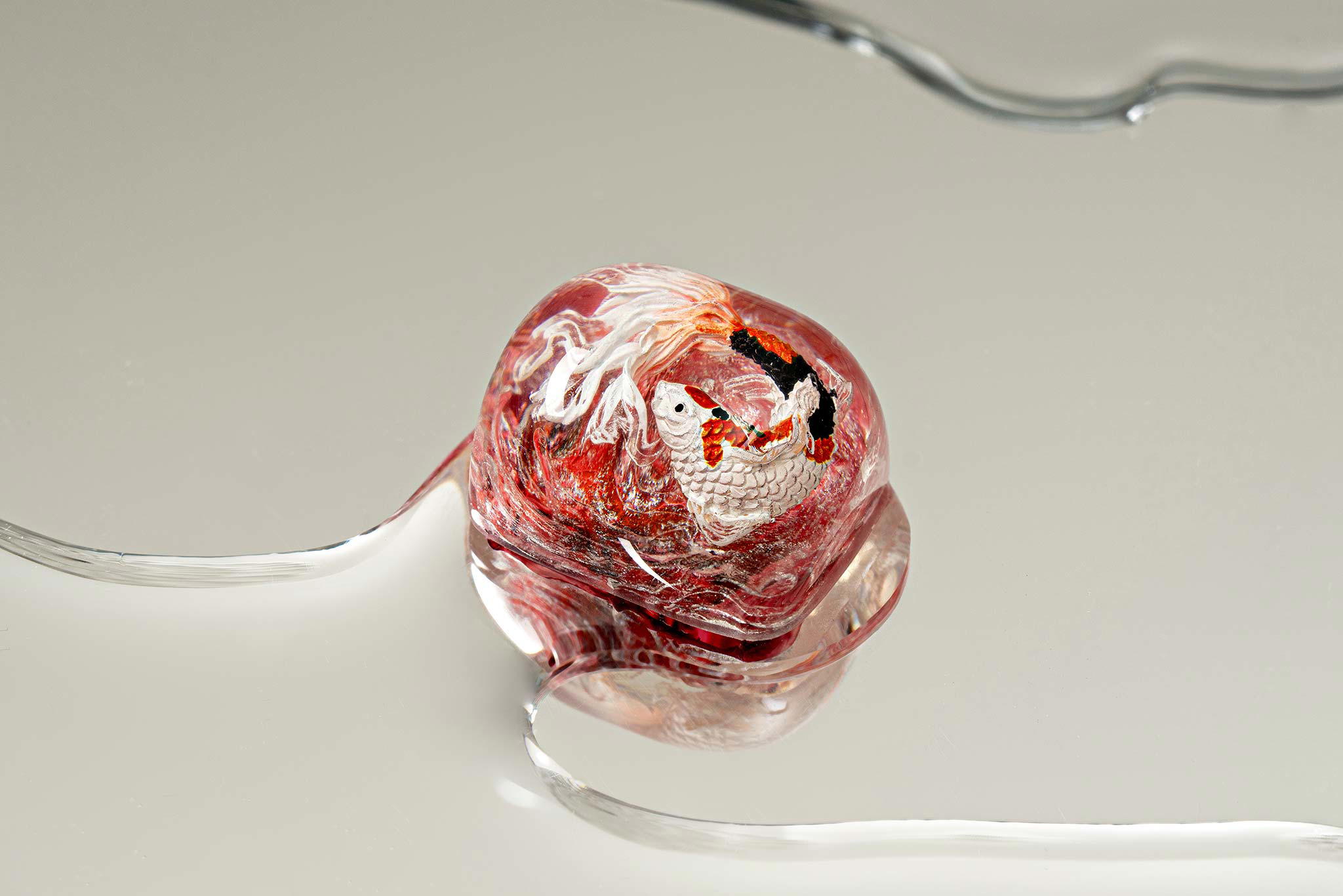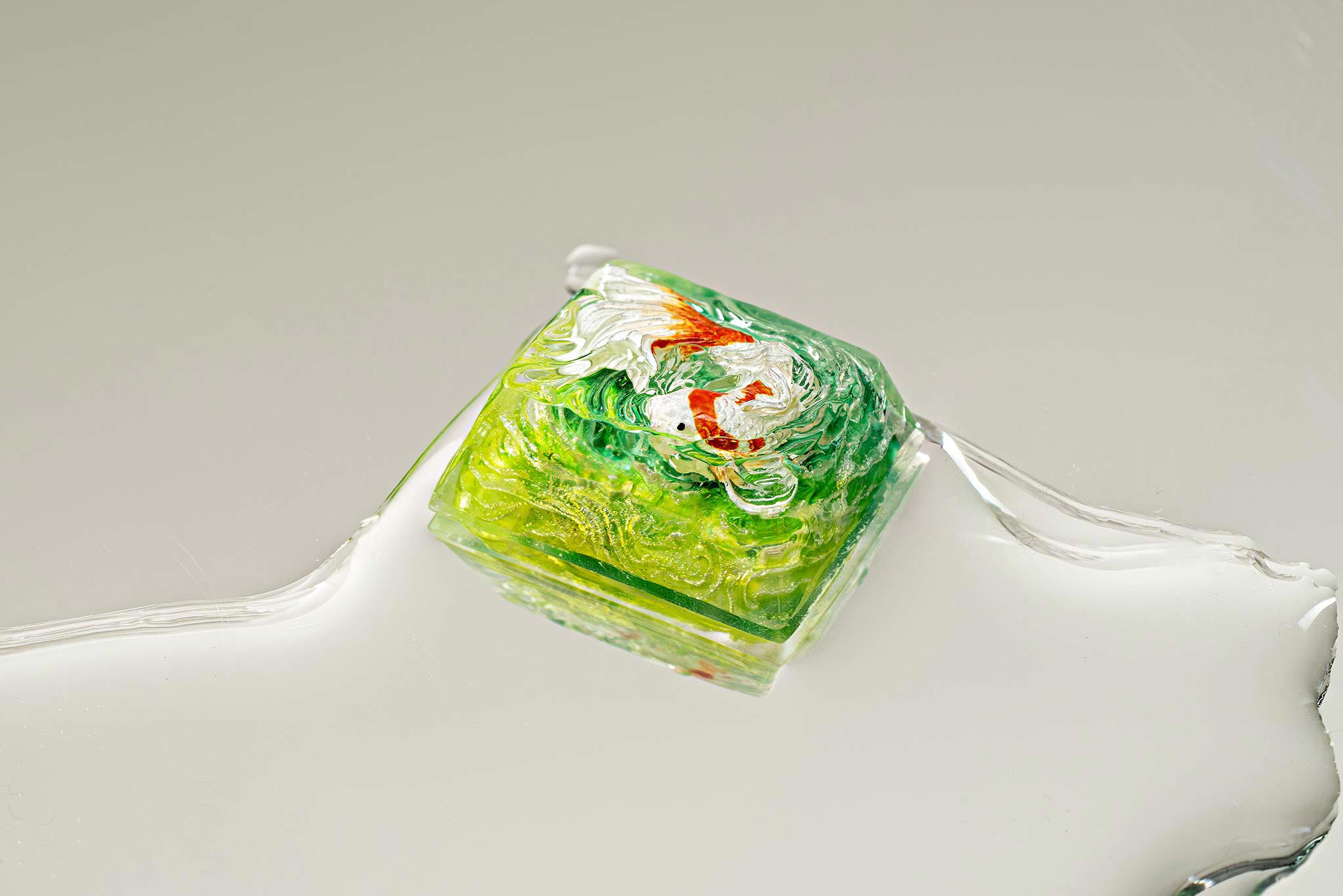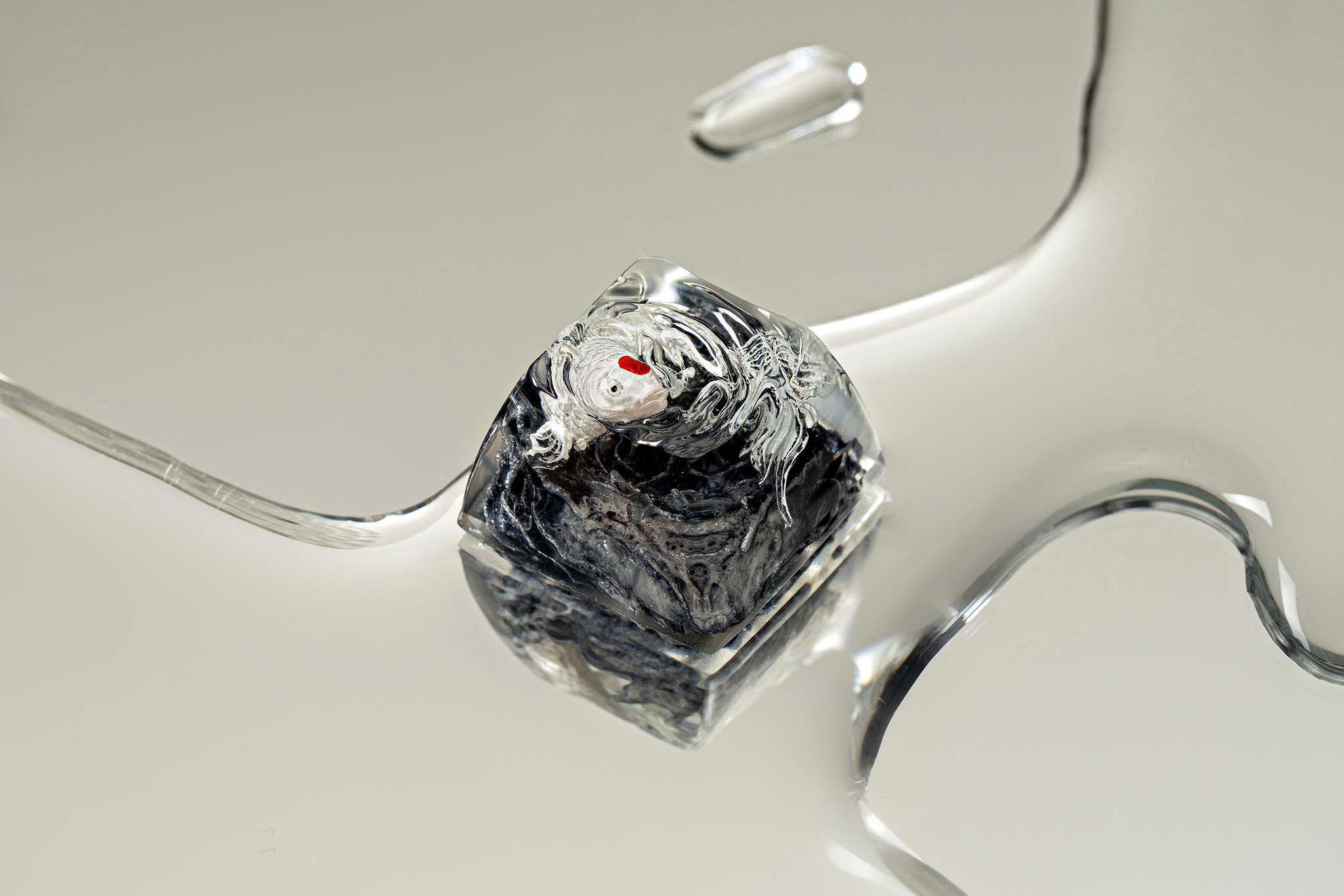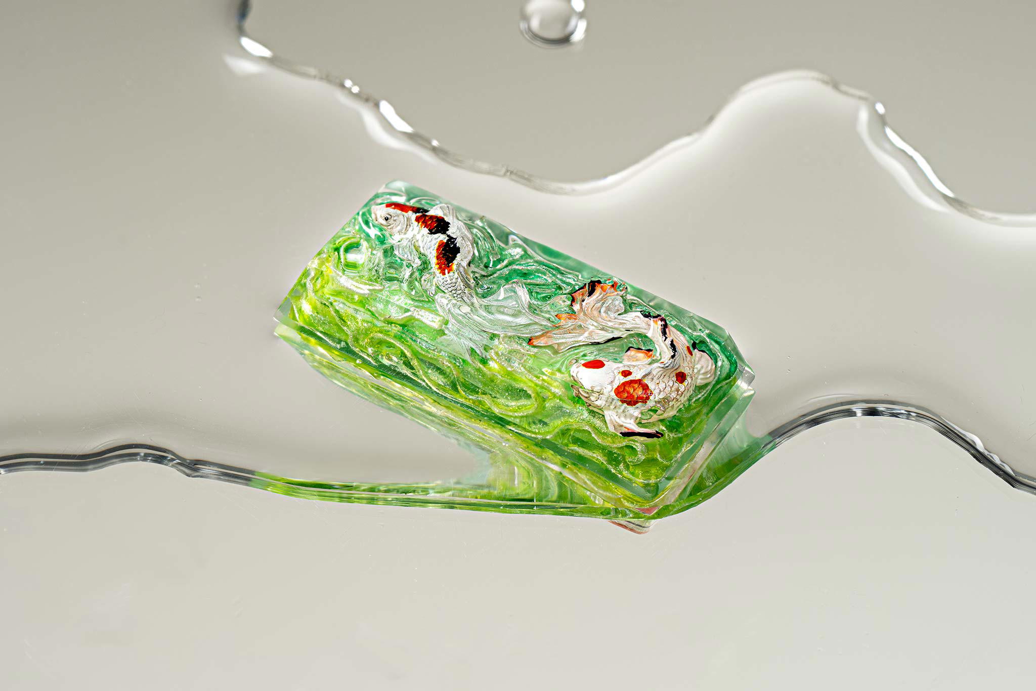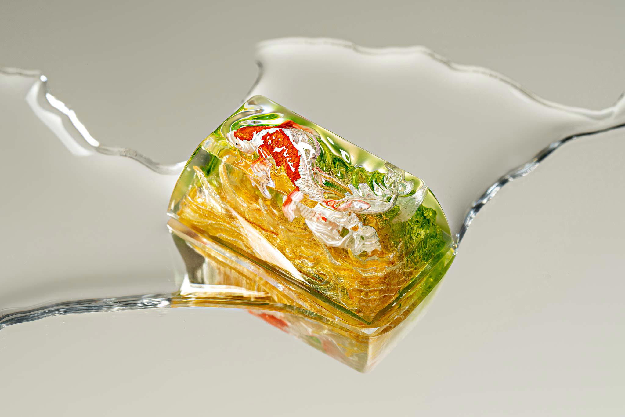 When the final layer of resin is poured, completely encasing the fish, it’s time to position the pre-formed water waves. This is the most crucial step, where “nature” and its “inhabitants” blend into a complete artwork. The most challenging part is handling the protruding portions of the Koi fish – they remain within the resin but rise above the keycap surface with “water” surrounding them, protecting the fish while ensuring daily usability and maintaining consistent aesthetics throughout. But the journey isn’t over yet – we still need to wait another 24 hours for the resin to fully solidify.
