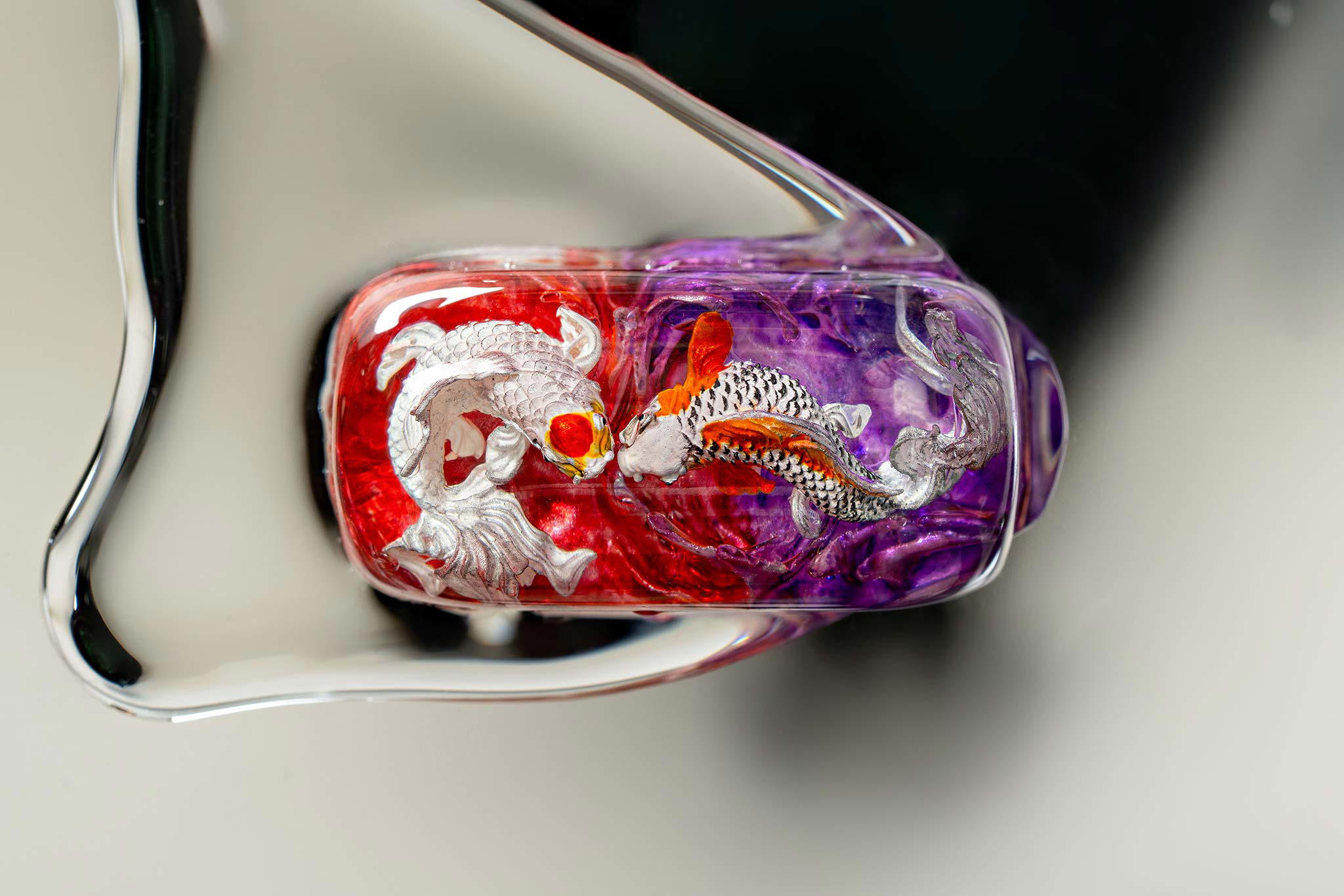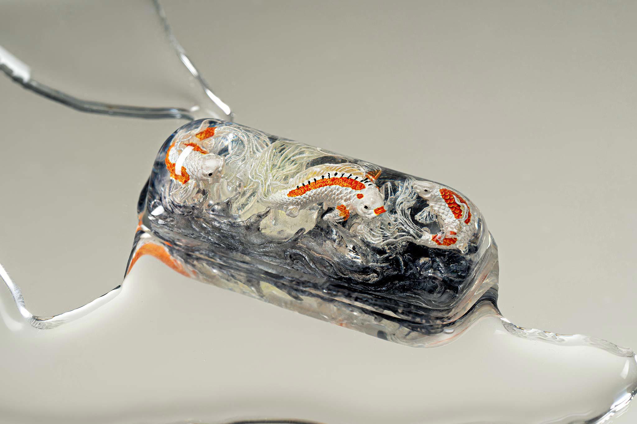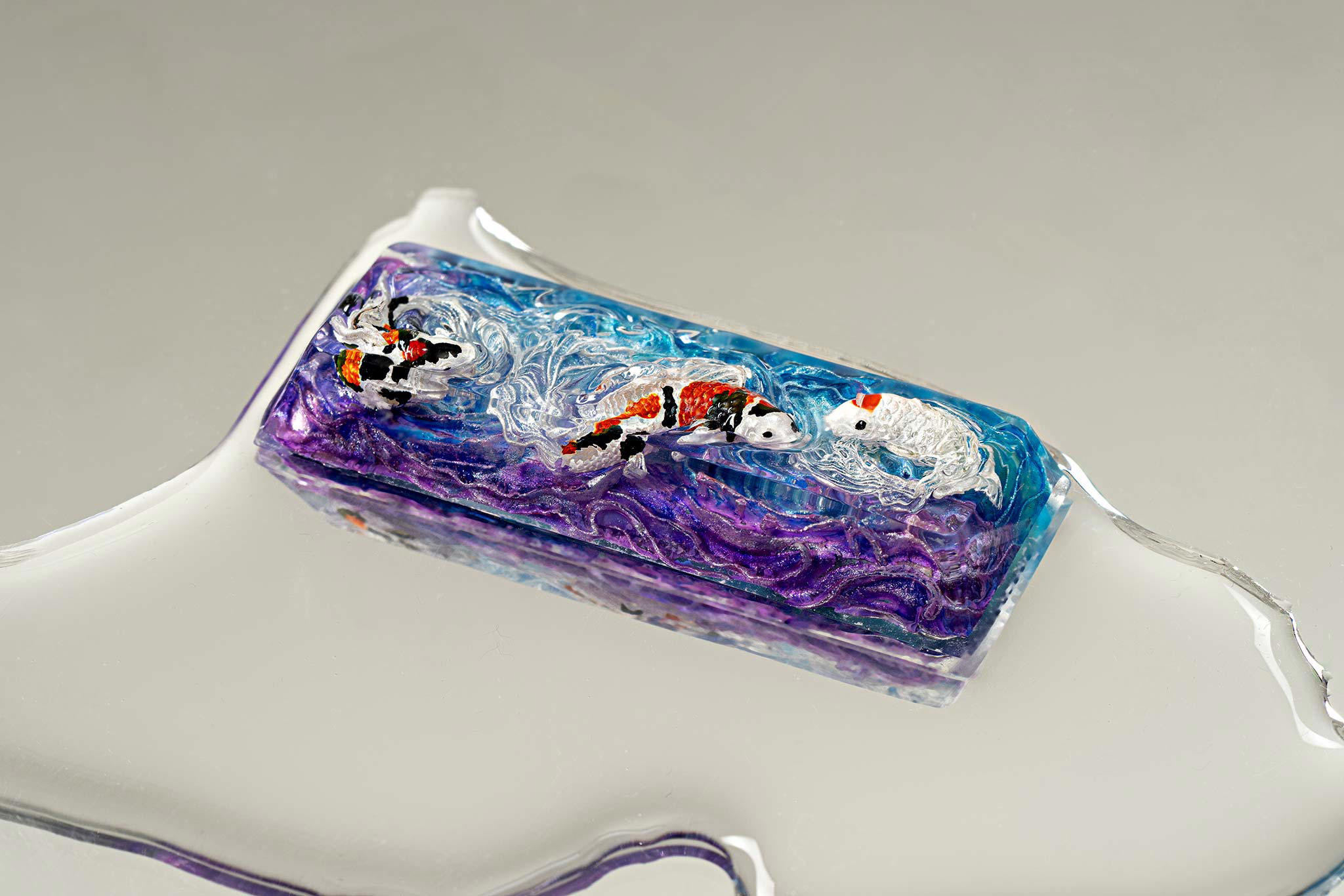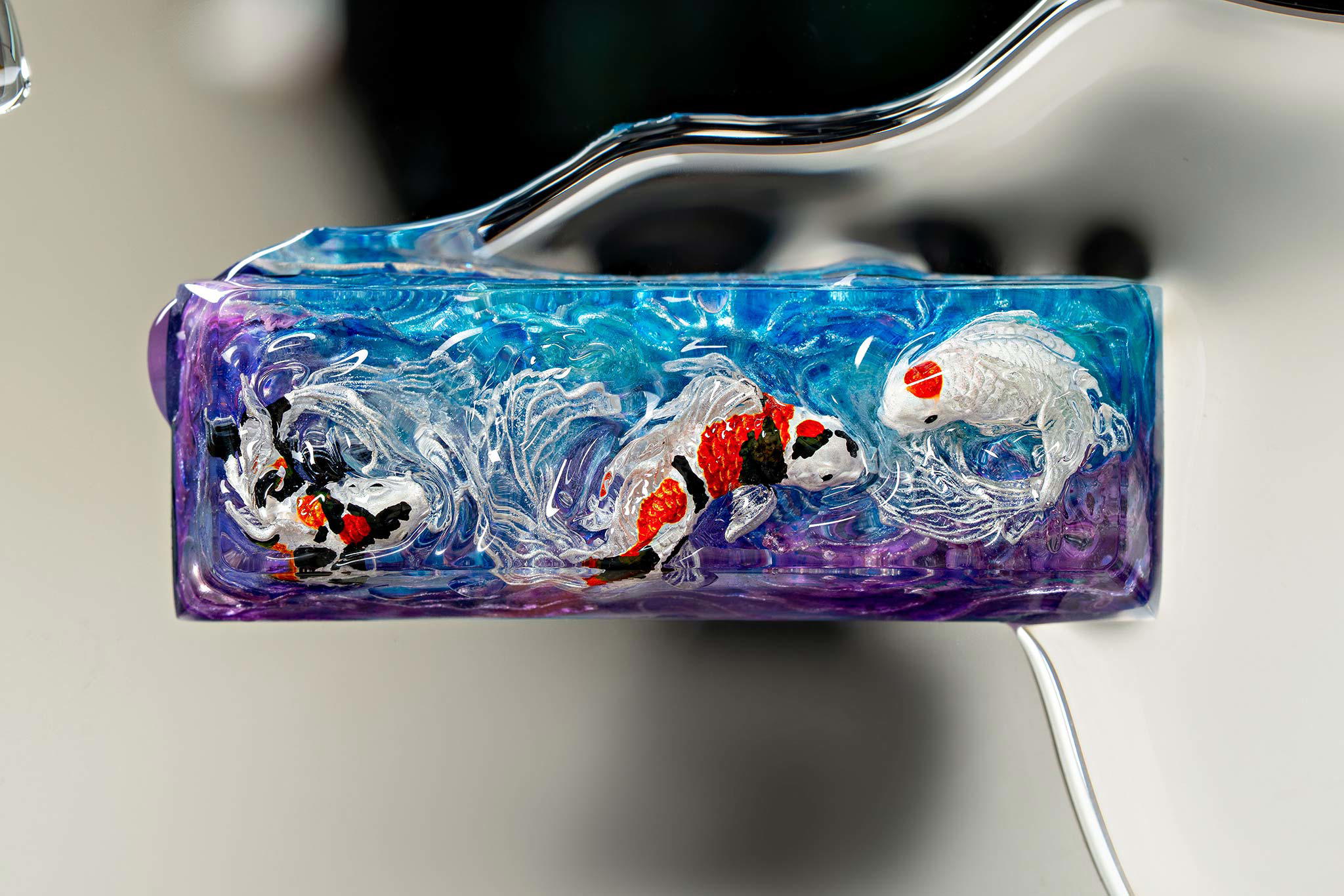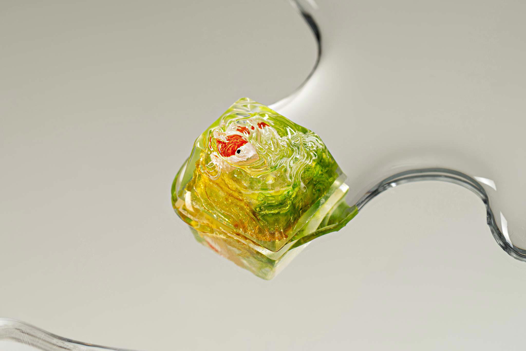 When the final layer of resin is poured, completely encasing the fish, it’s time to position the pre-formed water waves. This is the most crucial step, where “nature” and its “inhabitants” blend into a complete artwork. The most challenging part is handling the protruding portions of the Koi fish – they remain within the resin but rise above the keycap surface with “water” surrounding them, protecting the fish while ensuring daily usability and maintaining consistent aesthetics throughout. But the journey isn’t over yet – we still need to wait another 24 hours for the resin to fully solidify.