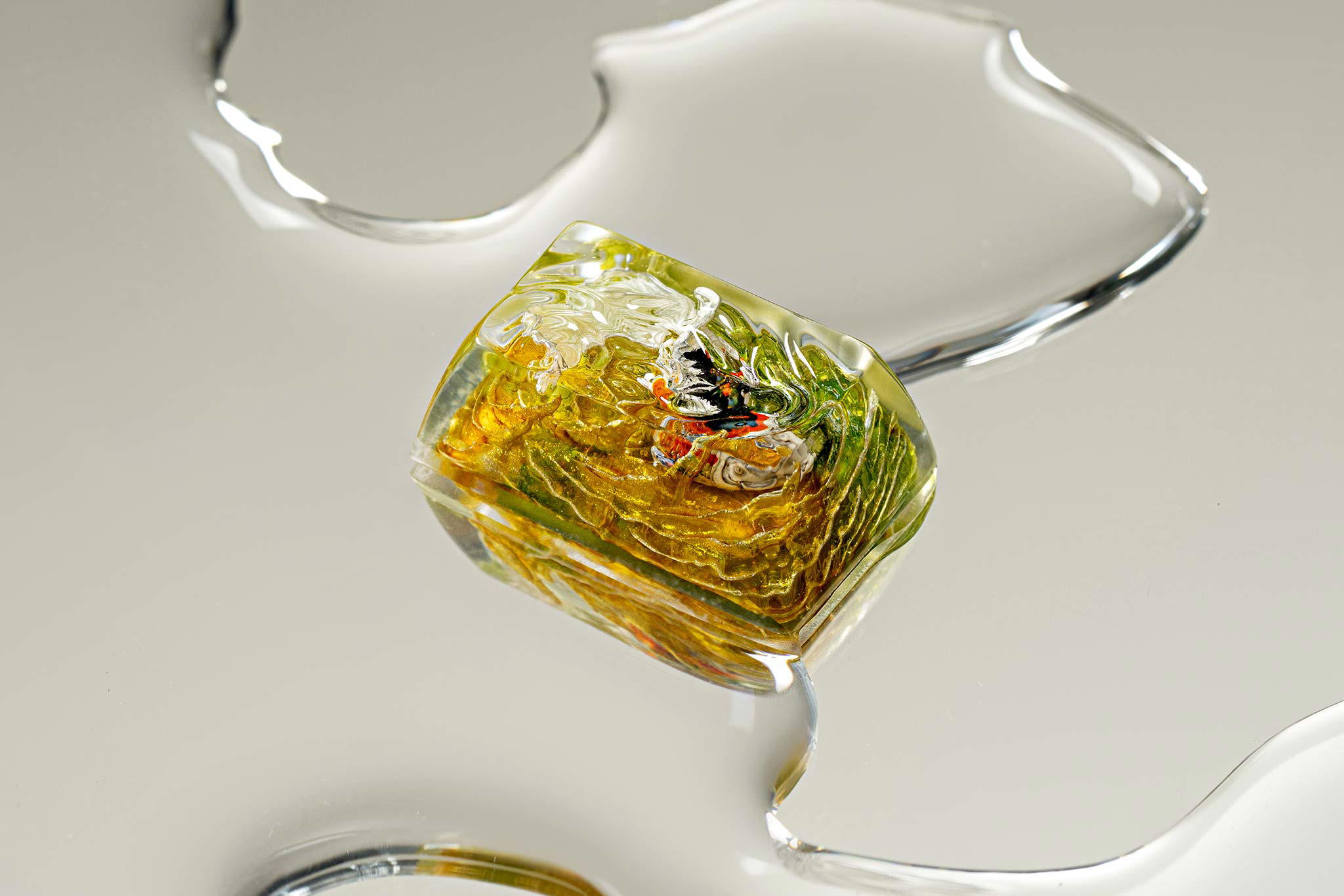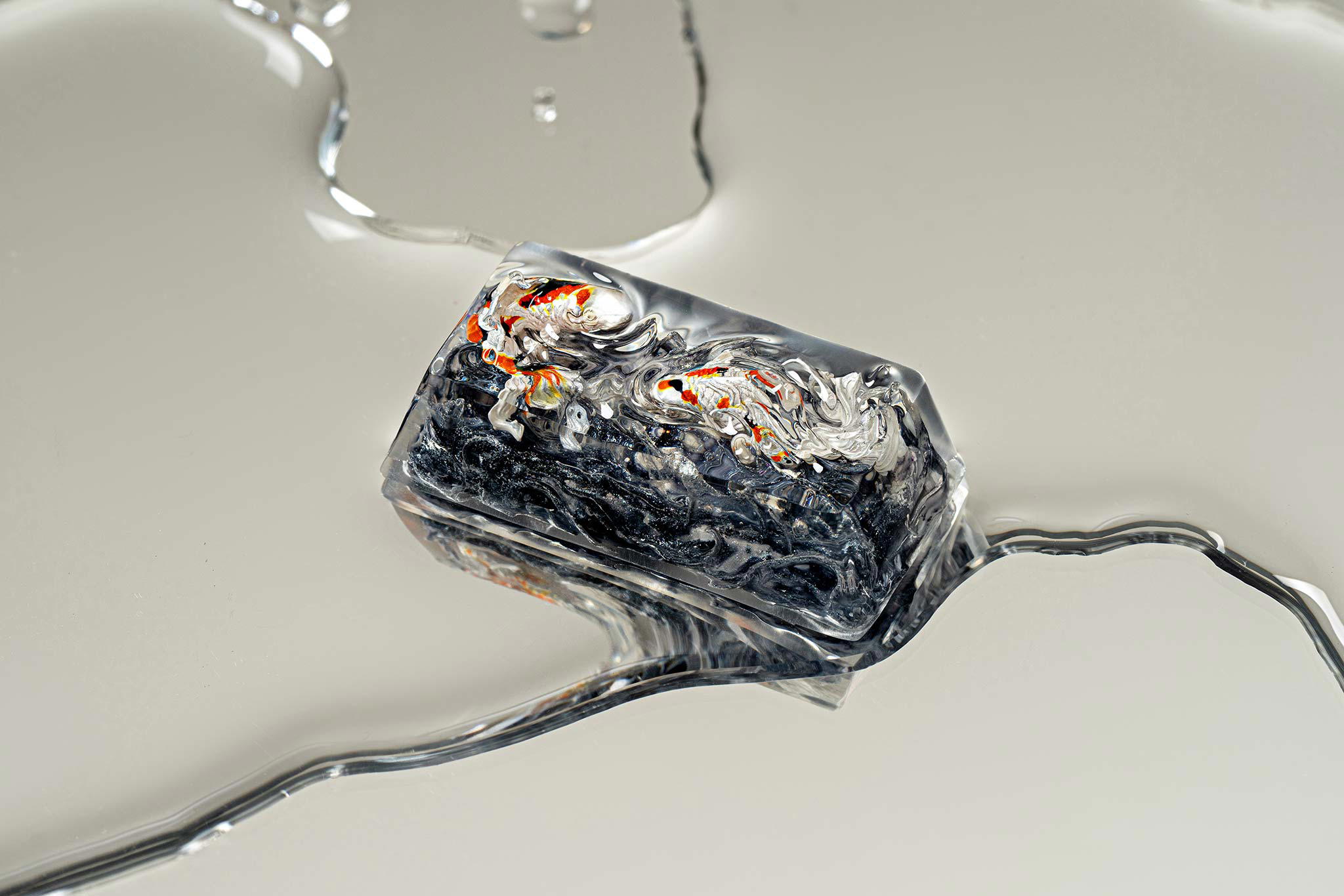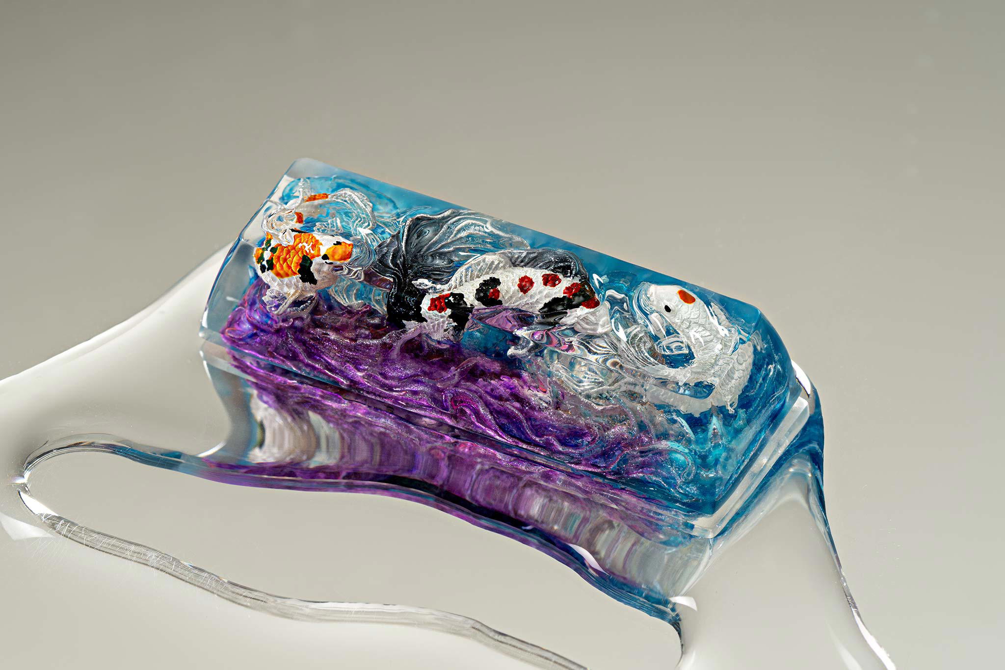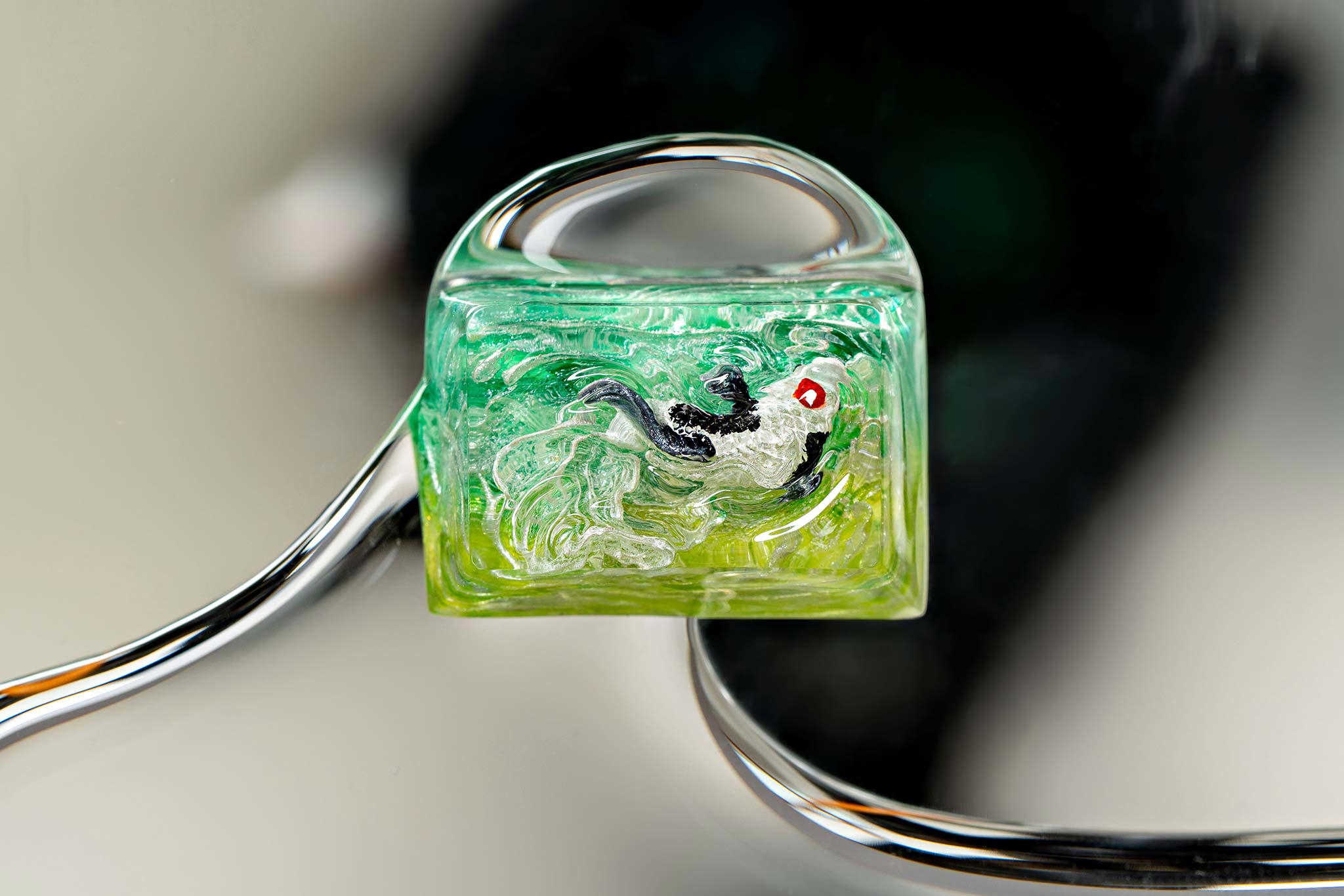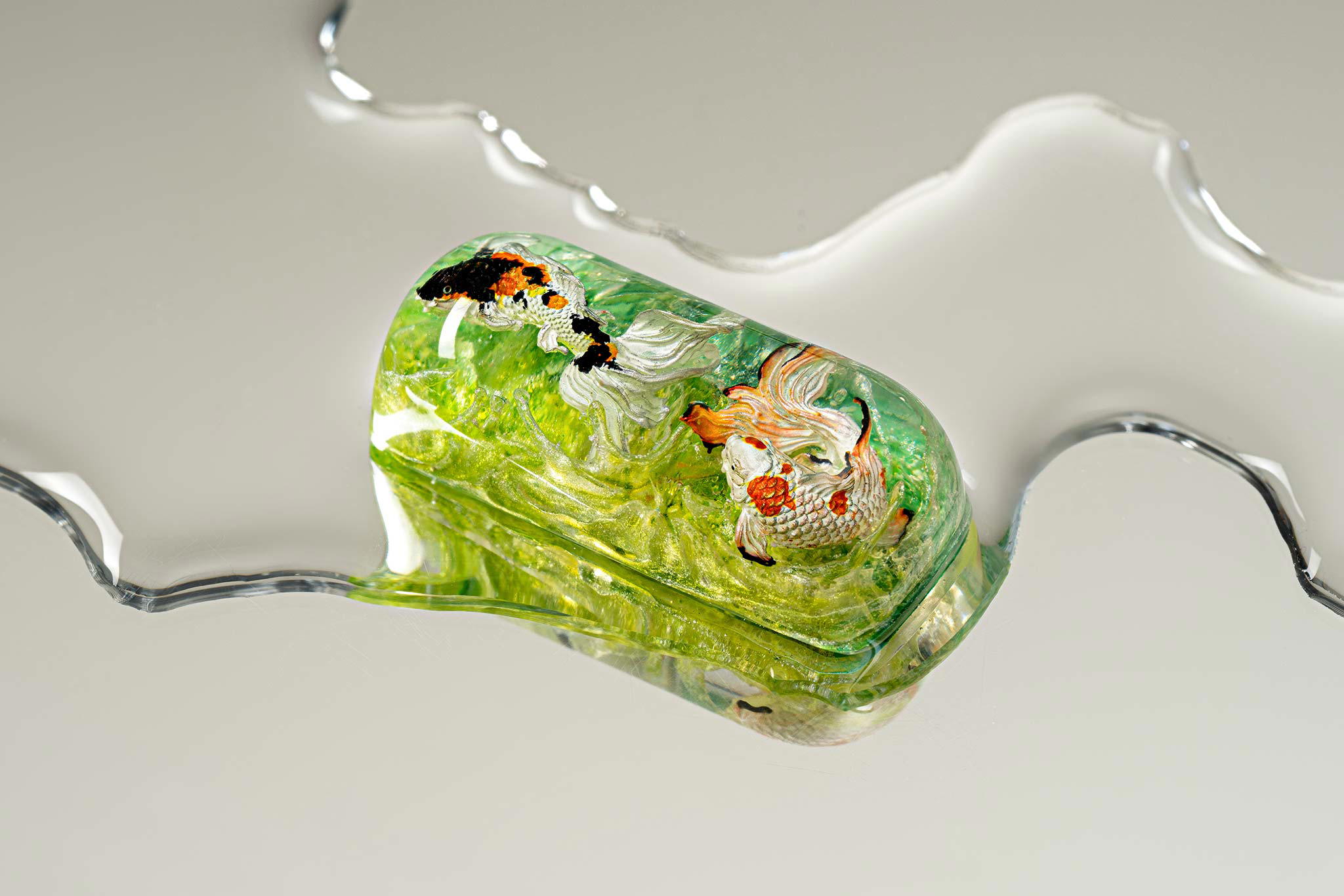 When the final layer of resin is poured, completely encasing the fish, it’s time to position the pre-formed water waves. This is the most crucial step, where “nature” and its “inhabitants” blend into a complete artwork. The most challenging part is handling the protruding portions of the Koi fish – they remain within the resin but rise above the keycap surface with “water” surrounding them, protecting the fish while ensuring daily usability and maintaining consistent aesthetics throughout. But the journey isn’t over yet – we still need to wait another 24 hours for the resin to fully solidify.