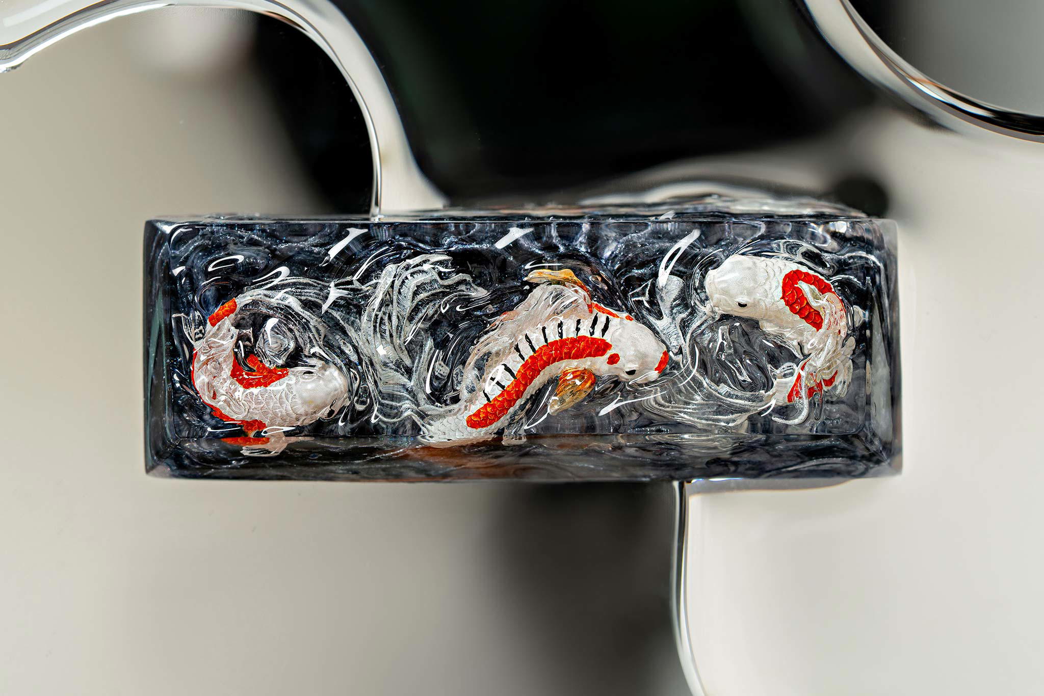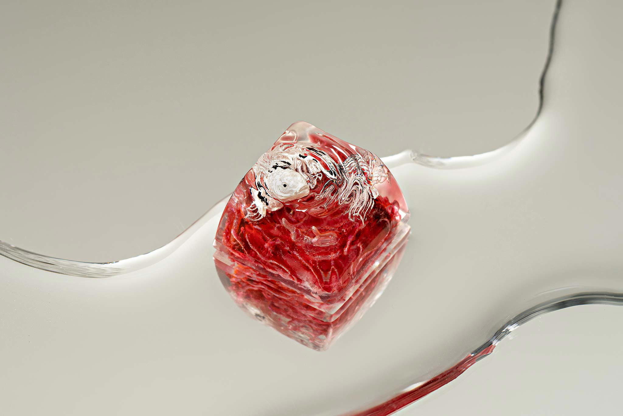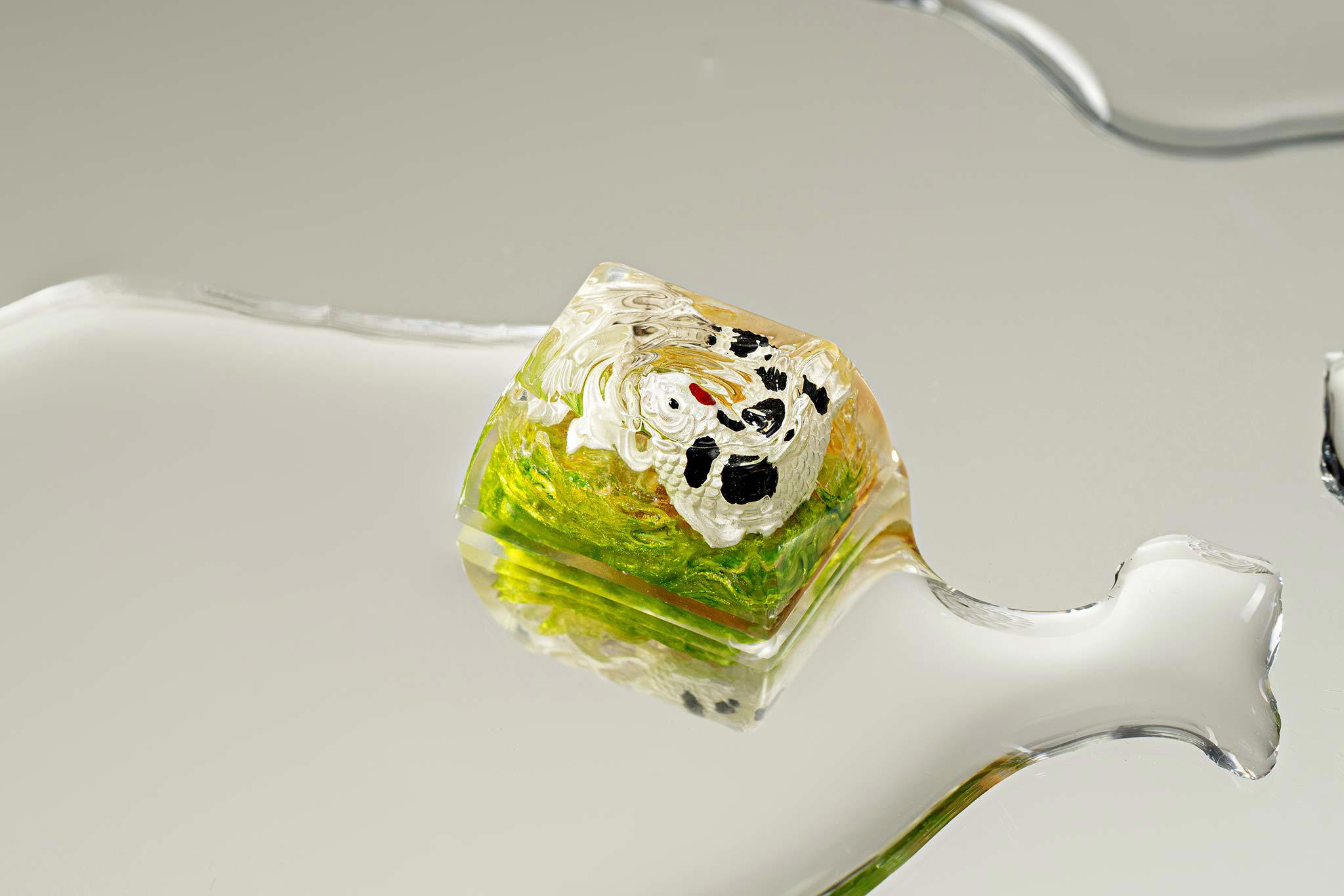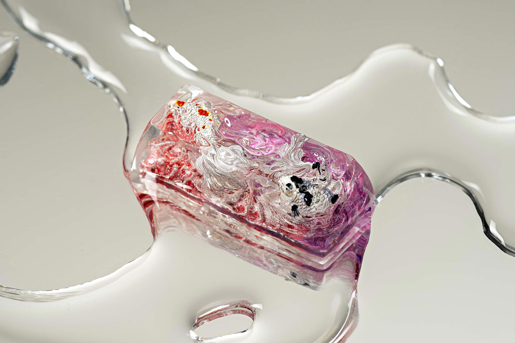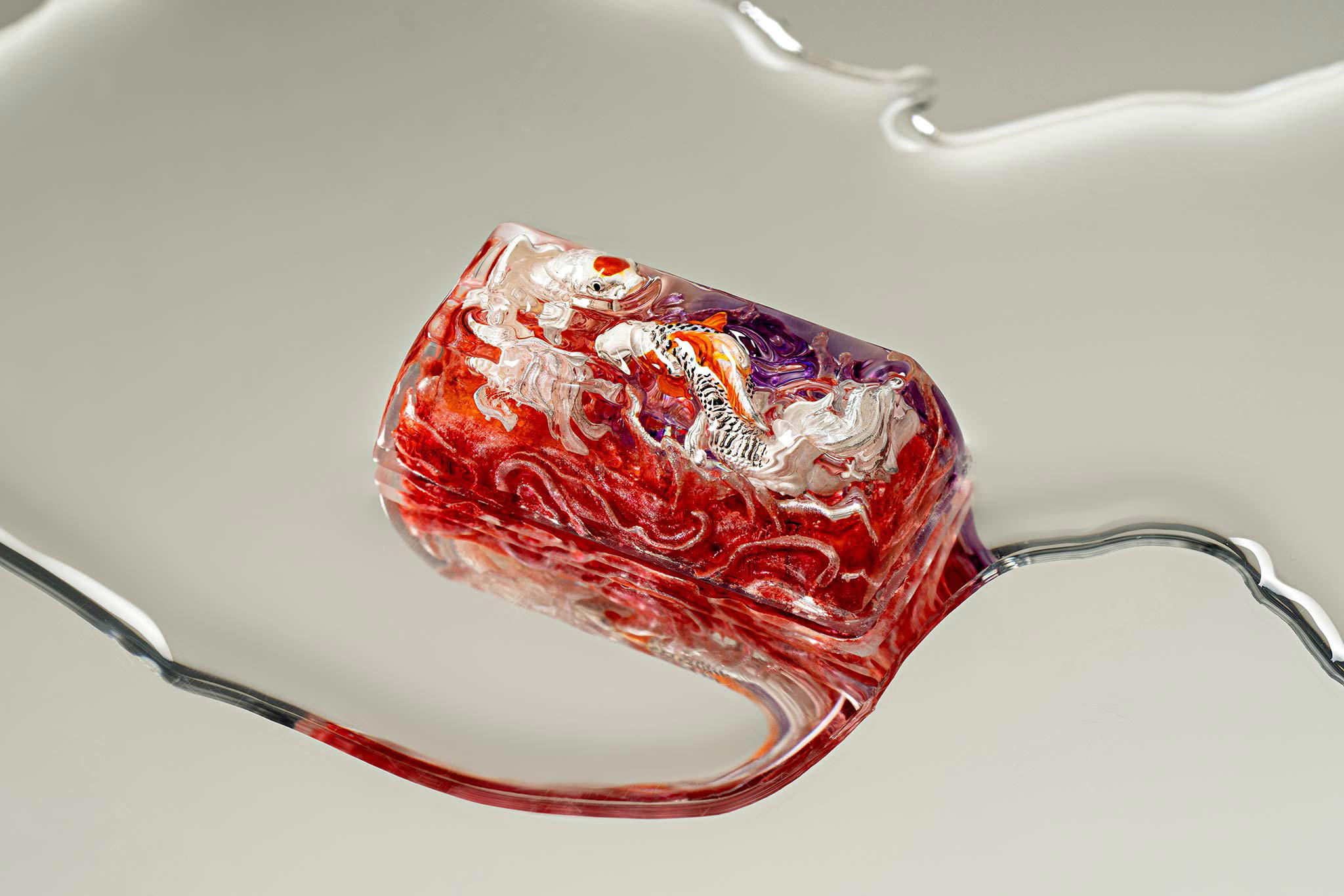 When the final layer of resin is poured, completely encasing the fish, it’s time to position the pre-formed water waves. This is the most crucial step, where “nature” and its “inhabitants” blend into a complete artwork. The most challenging part is handling the protruding portions of the Koi fish – they remain within the resin but rise above the keycap surface with “water” surrounding them, protecting the fish while ensuring daily usability and maintaining consistent aesthetics throughout. But the journey isn’t over yet – we still need to wait another 24 hours for the resin to fully solidify.