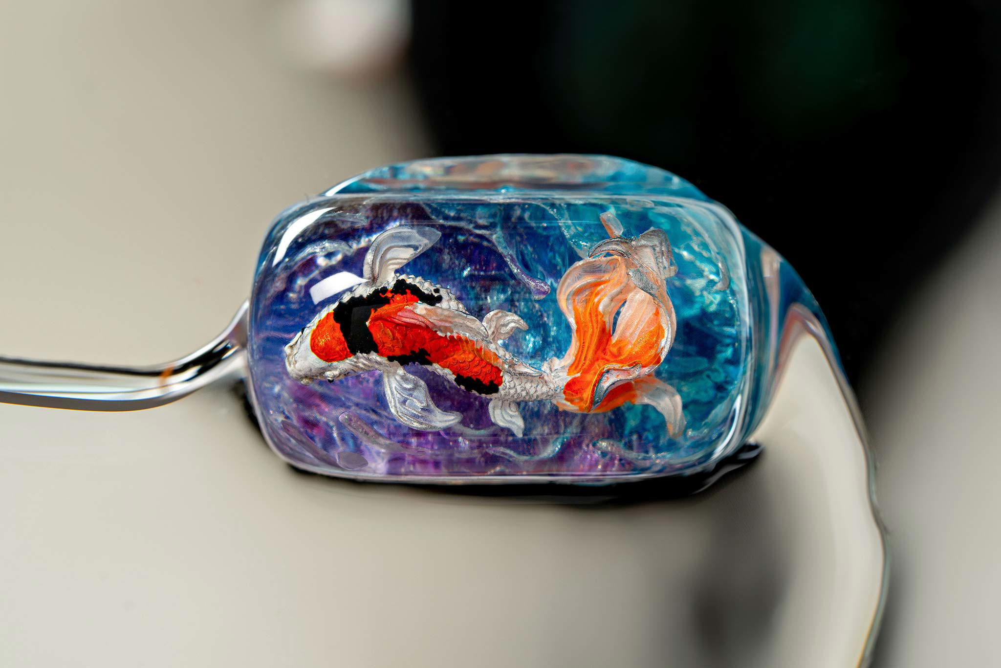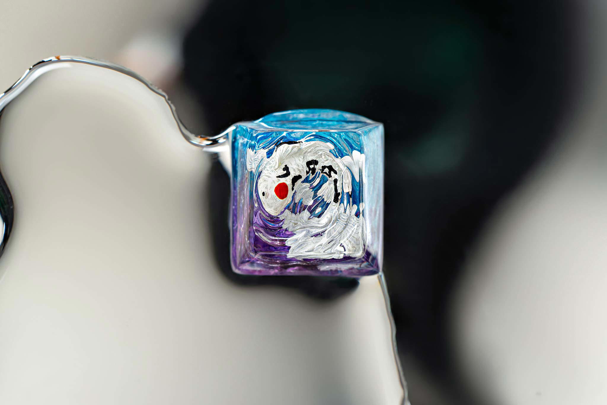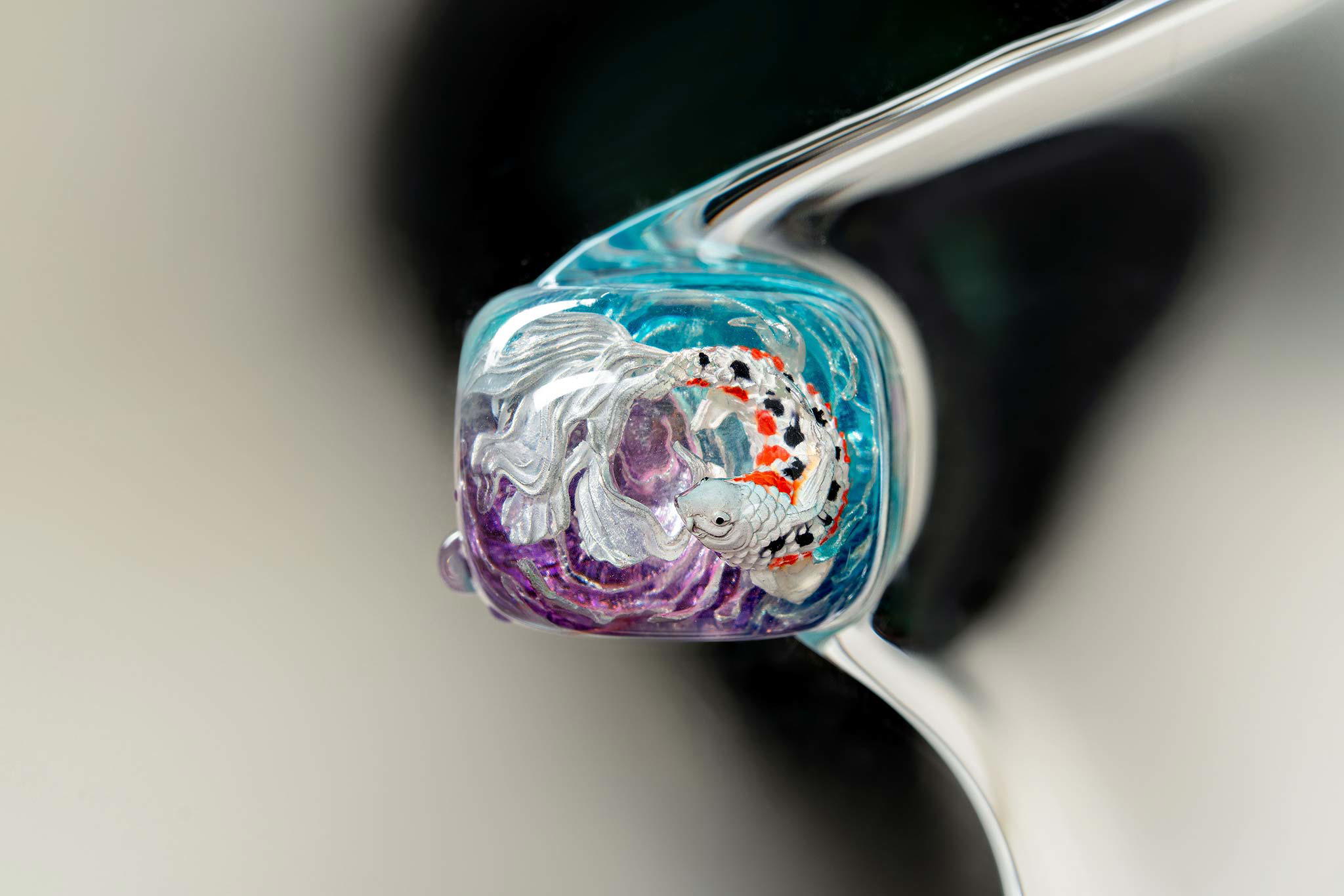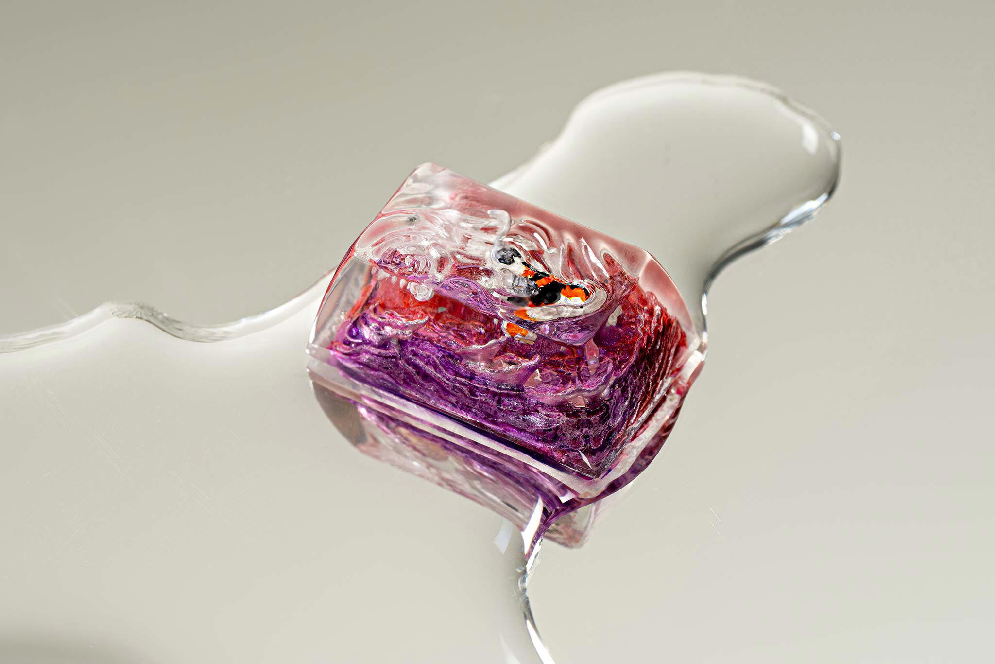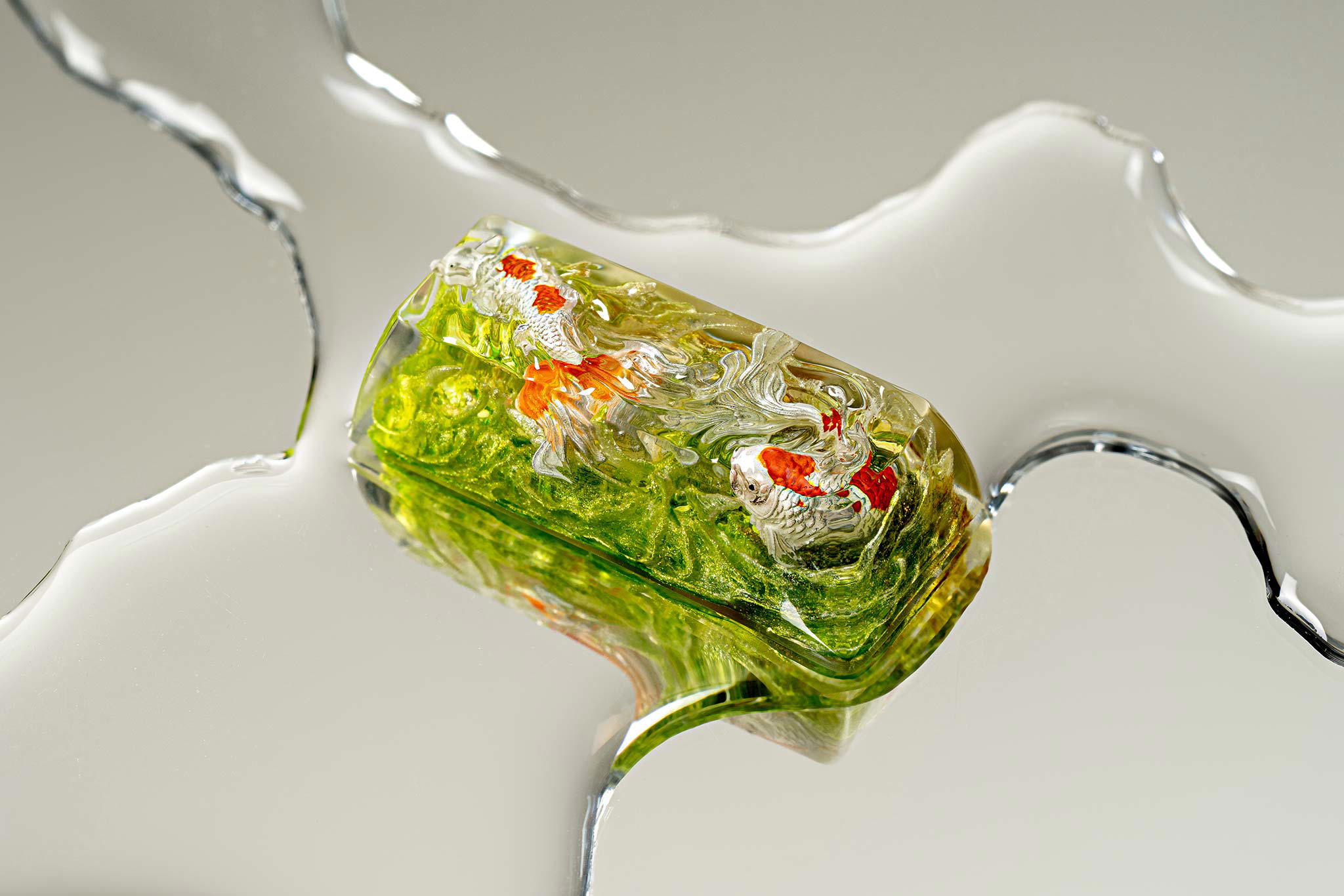 When the final layer of resin is poured, completely encasing the fish, it’s time to position the pre-formed water waves. This is the most crucial step, where “nature” and its “inhabitants” blend into a complete artwork. The most challenging part is handling the protruding portions of the Koi fish – they remain within the resin but rise above the keycap surface with “water” surrounding them, protecting the fish while ensuring daily usability and maintaining consistent aesthetics throughout. But the journey isn’t over yet – we still need to wait another 24 hours for the resin to fully solidify.