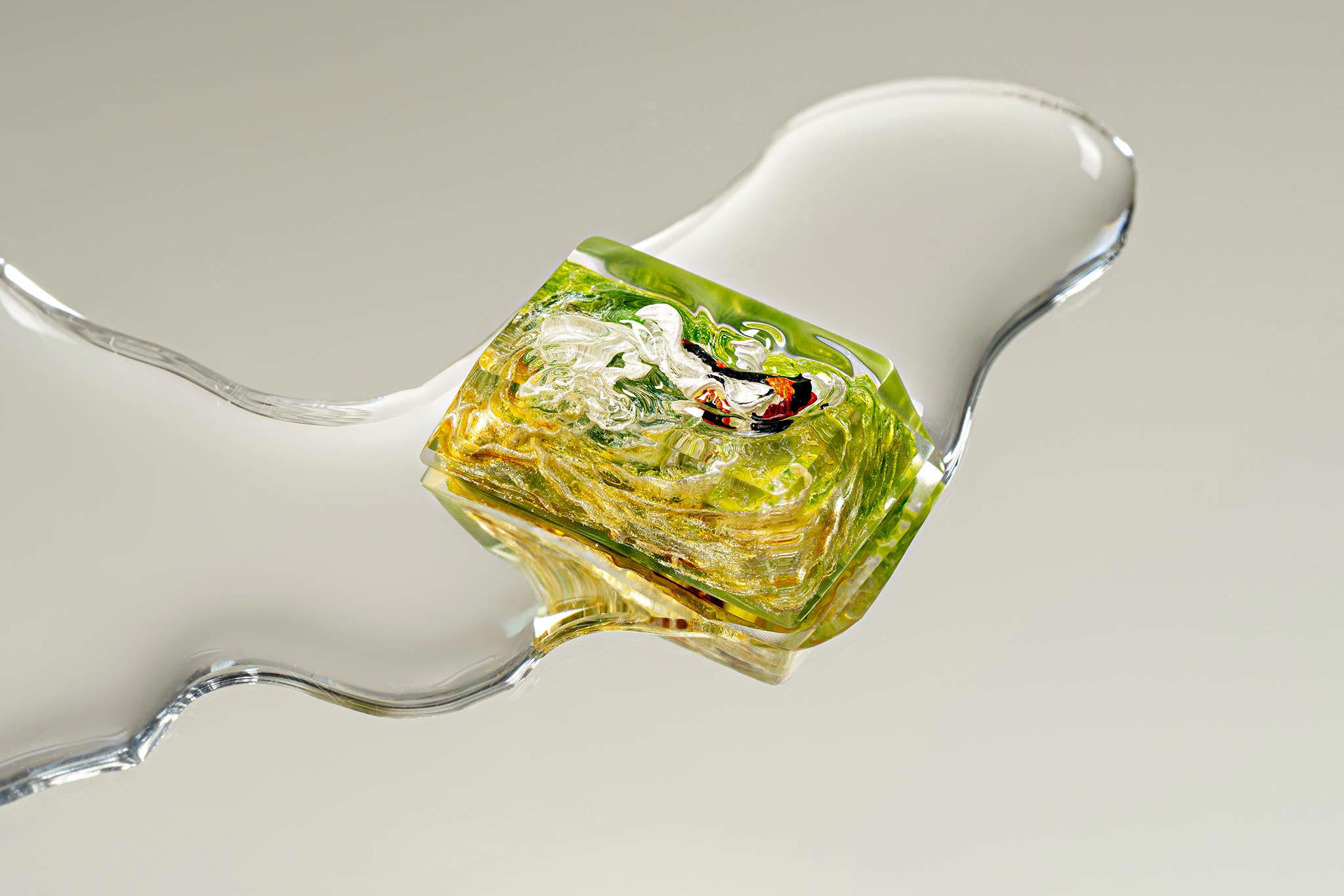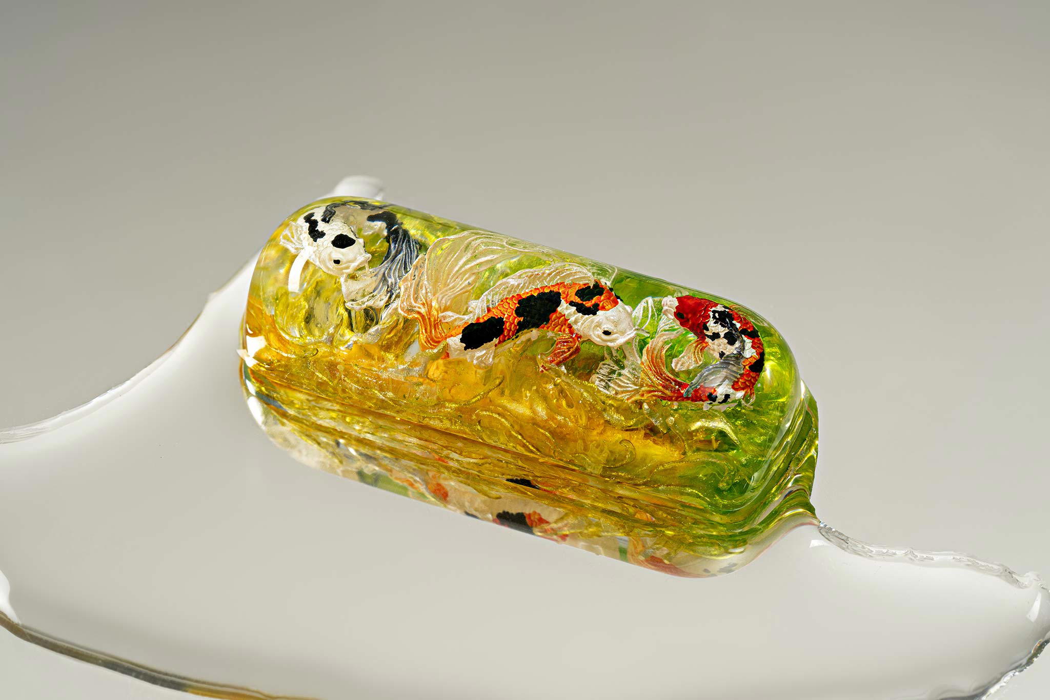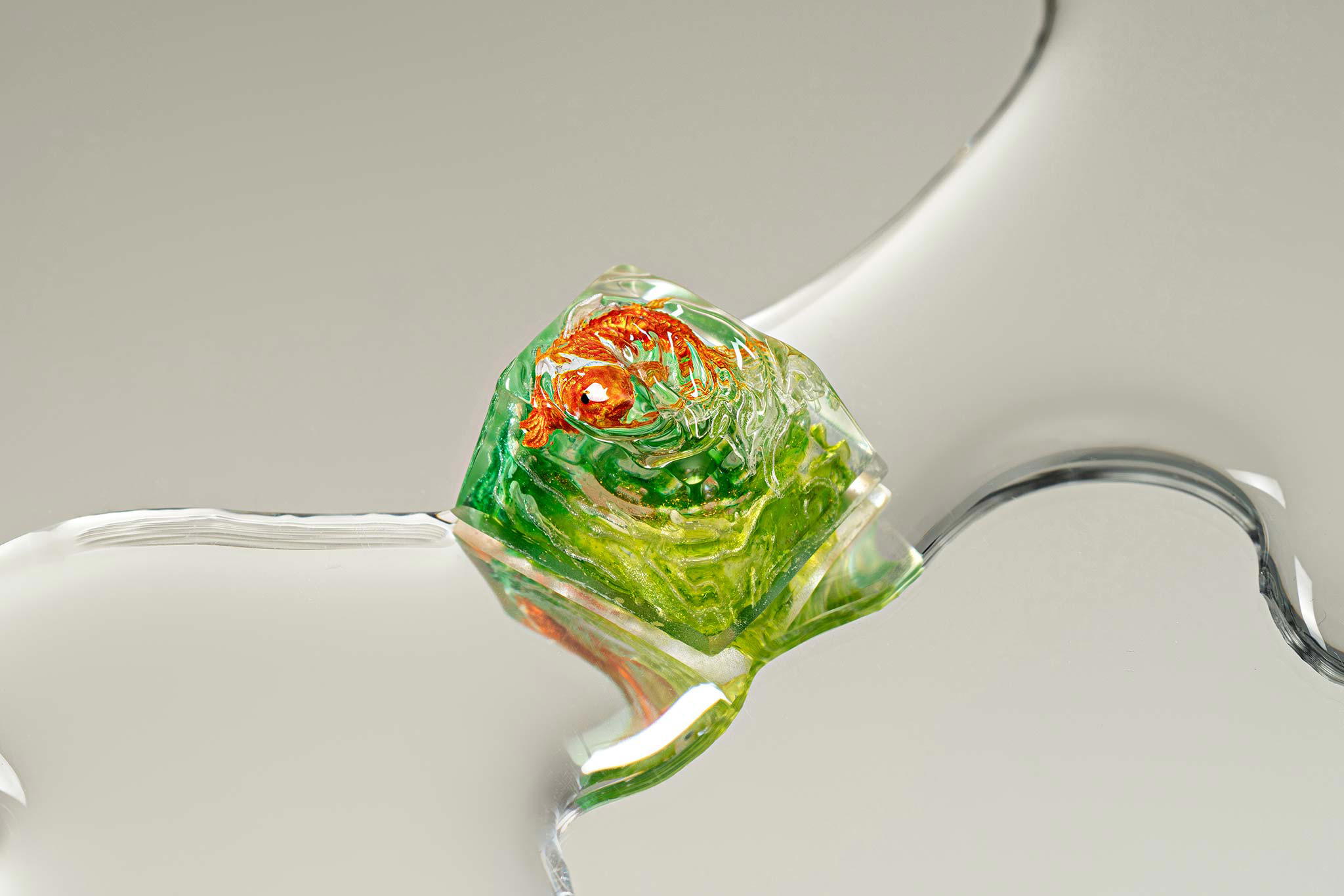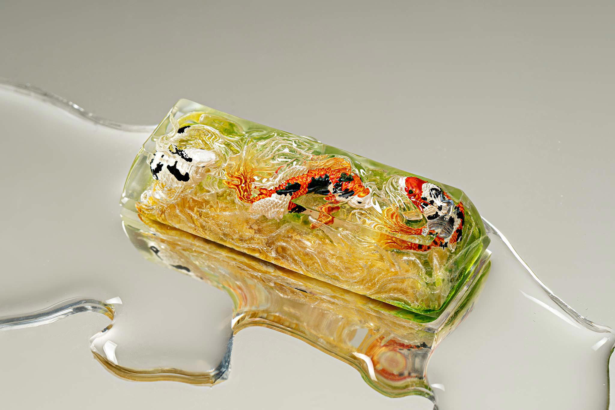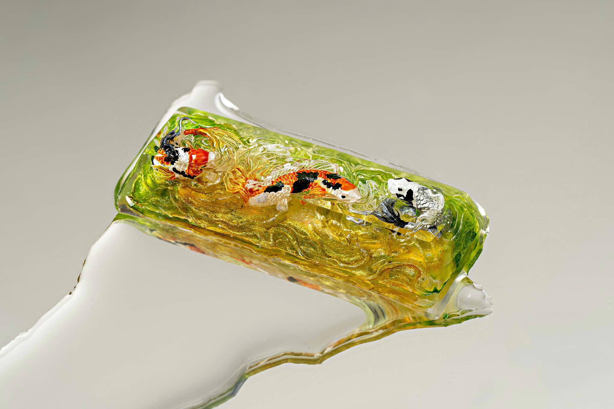 When the final layer of resin is poured, completely encasing the fish, it’s time to position the pre-formed water waves. This is the most crucial step, where “nature” and its “inhabitants” blend into a complete artwork. The most challenging part is handling the protruding portions of the Koi fish – they remain within the resin but rise above the keycap surface with “water” surrounding them, protecting the fish while ensuring daily usability and maintaining consistent aesthetics throughout. But the journey isn’t over yet – we still need to wait another 24 hours for the resin to fully solidify.