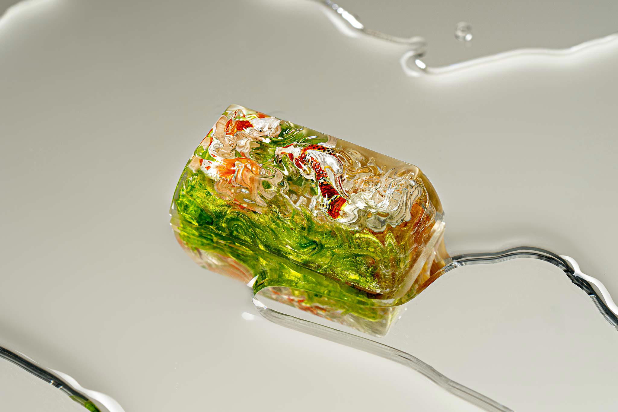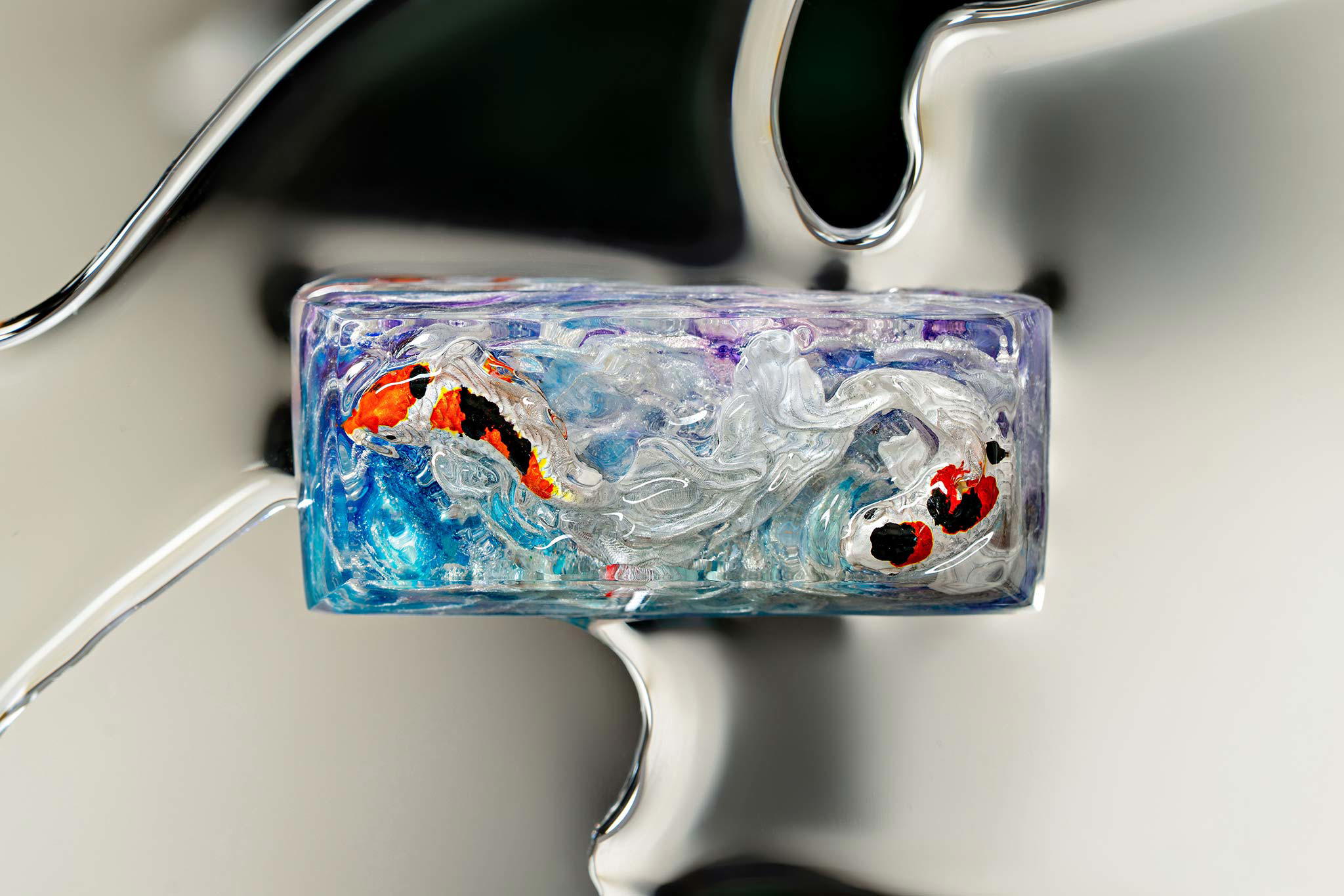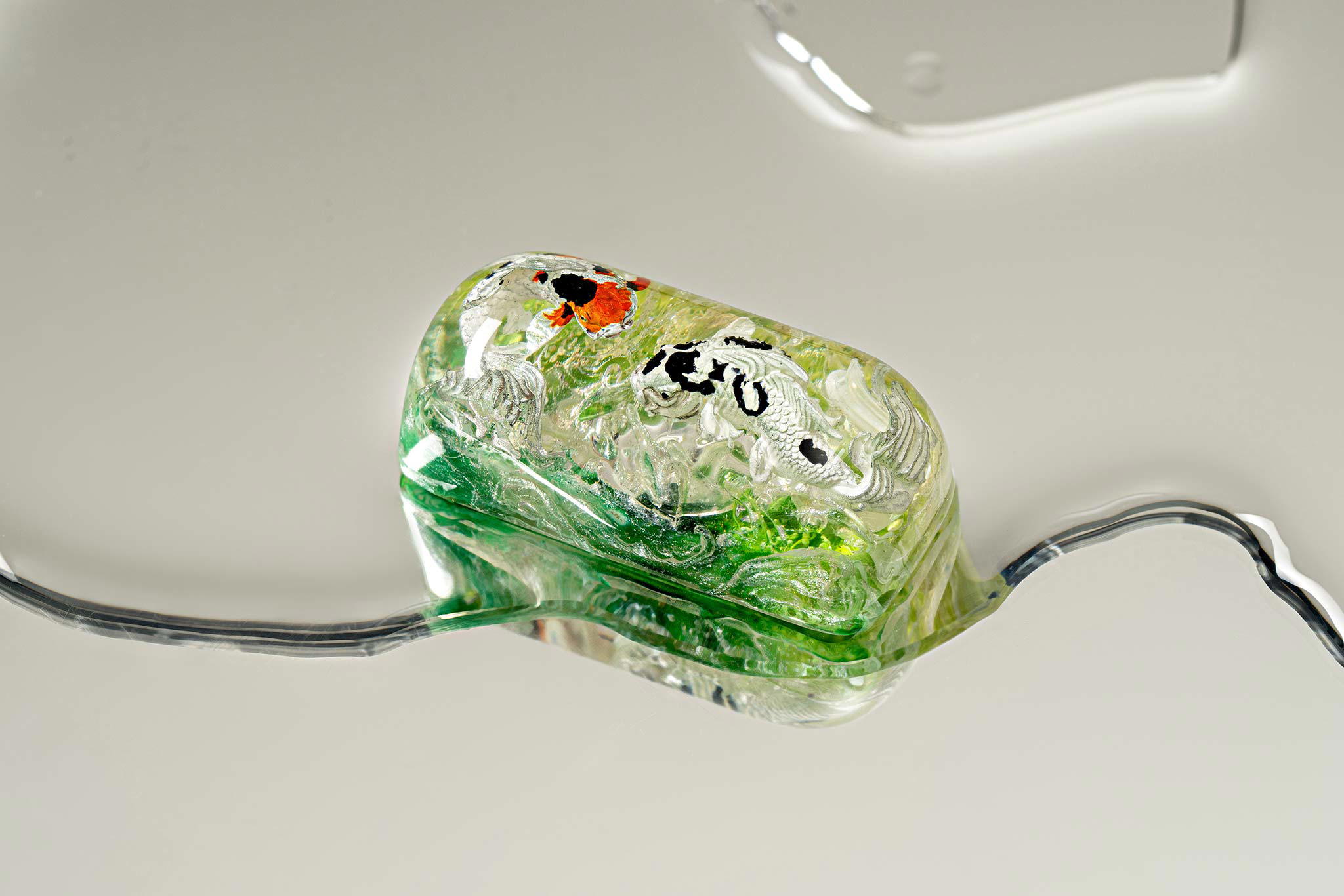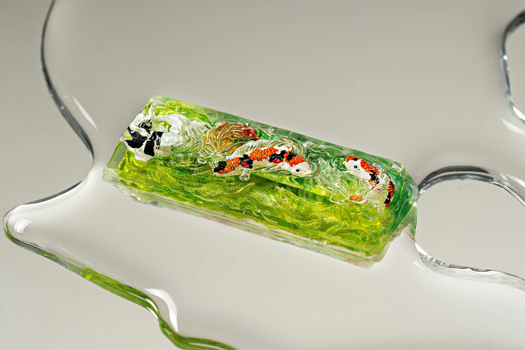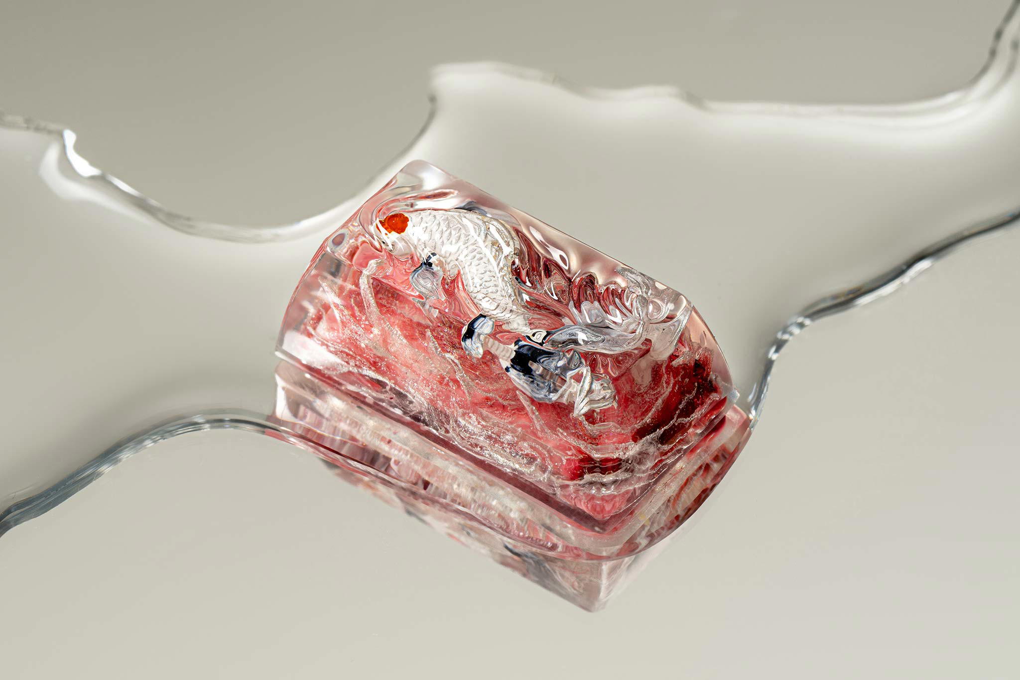 When the final layer of resin is poured, completely encasing the fish, it’s time to position the pre-formed water waves. This is the most crucial step, where “nature” and its “inhabitants” blend into a complete artwork. The most challenging part is handling the protruding portions of the Koi fish – they remain within the resin but rise above the keycap surface with “water” surrounding them, protecting the fish while ensuring daily usability and maintaining consistent aesthetics throughout. But the journey isn’t over yet – we still need to wait another 24 hours for the resin to fully solidify.