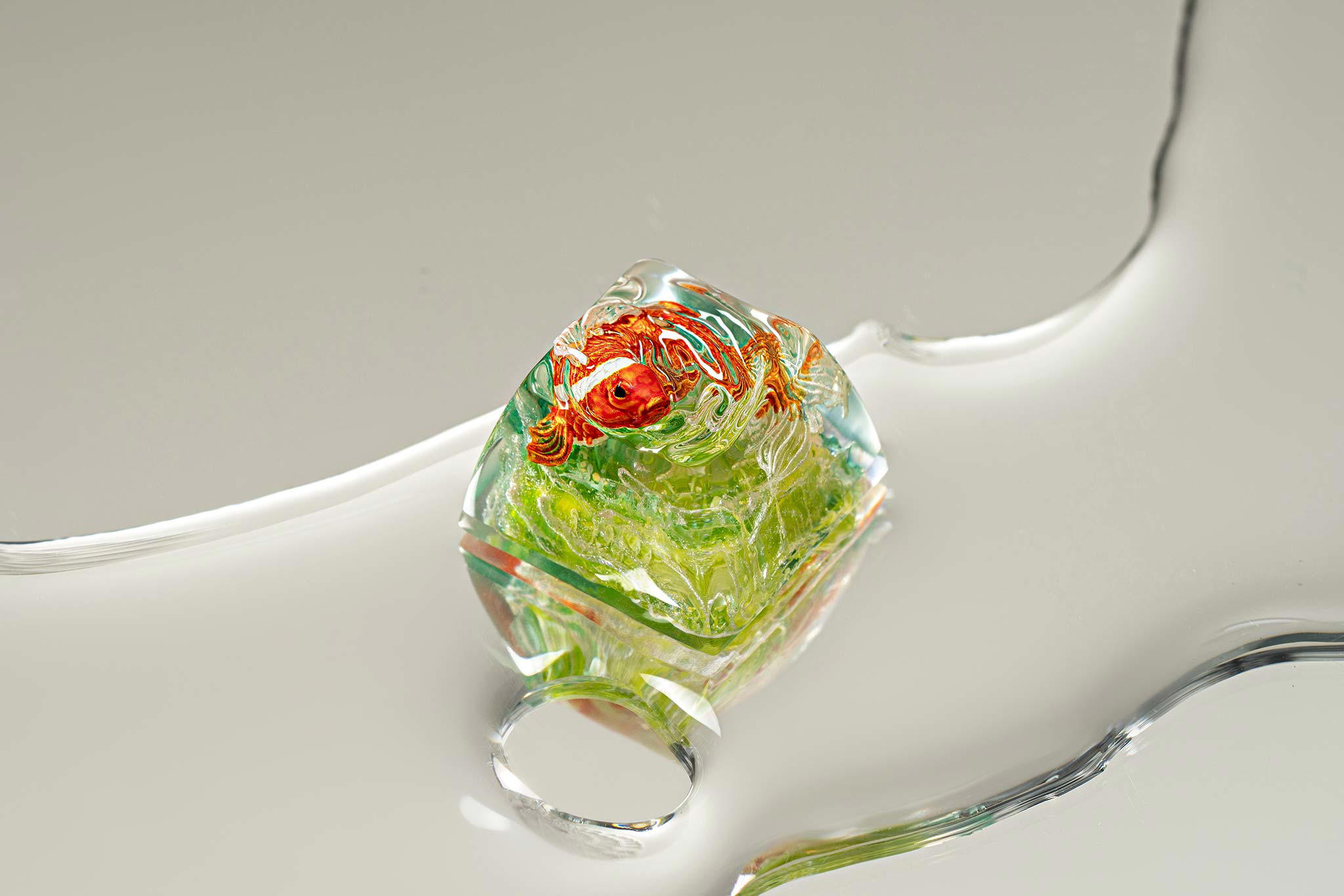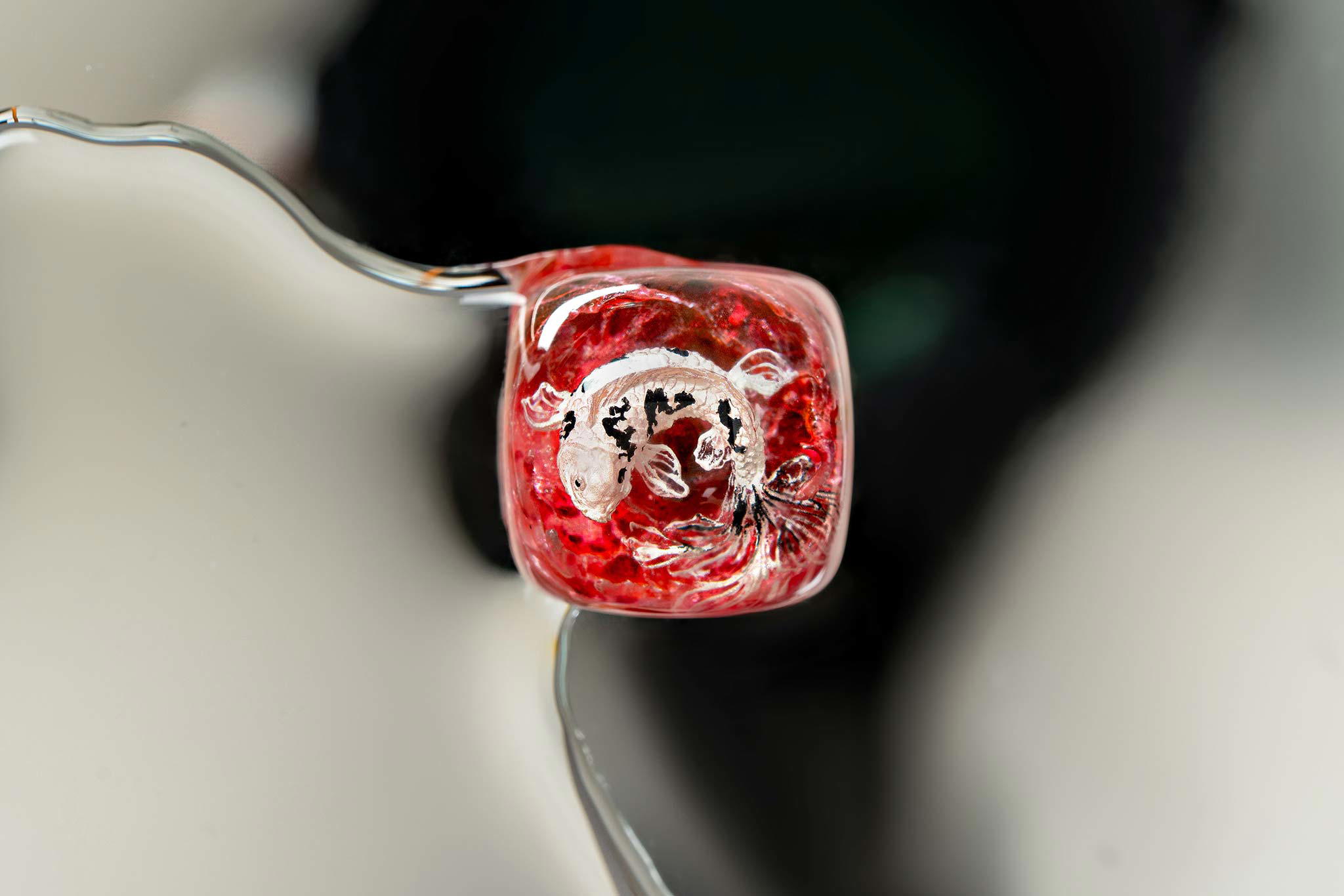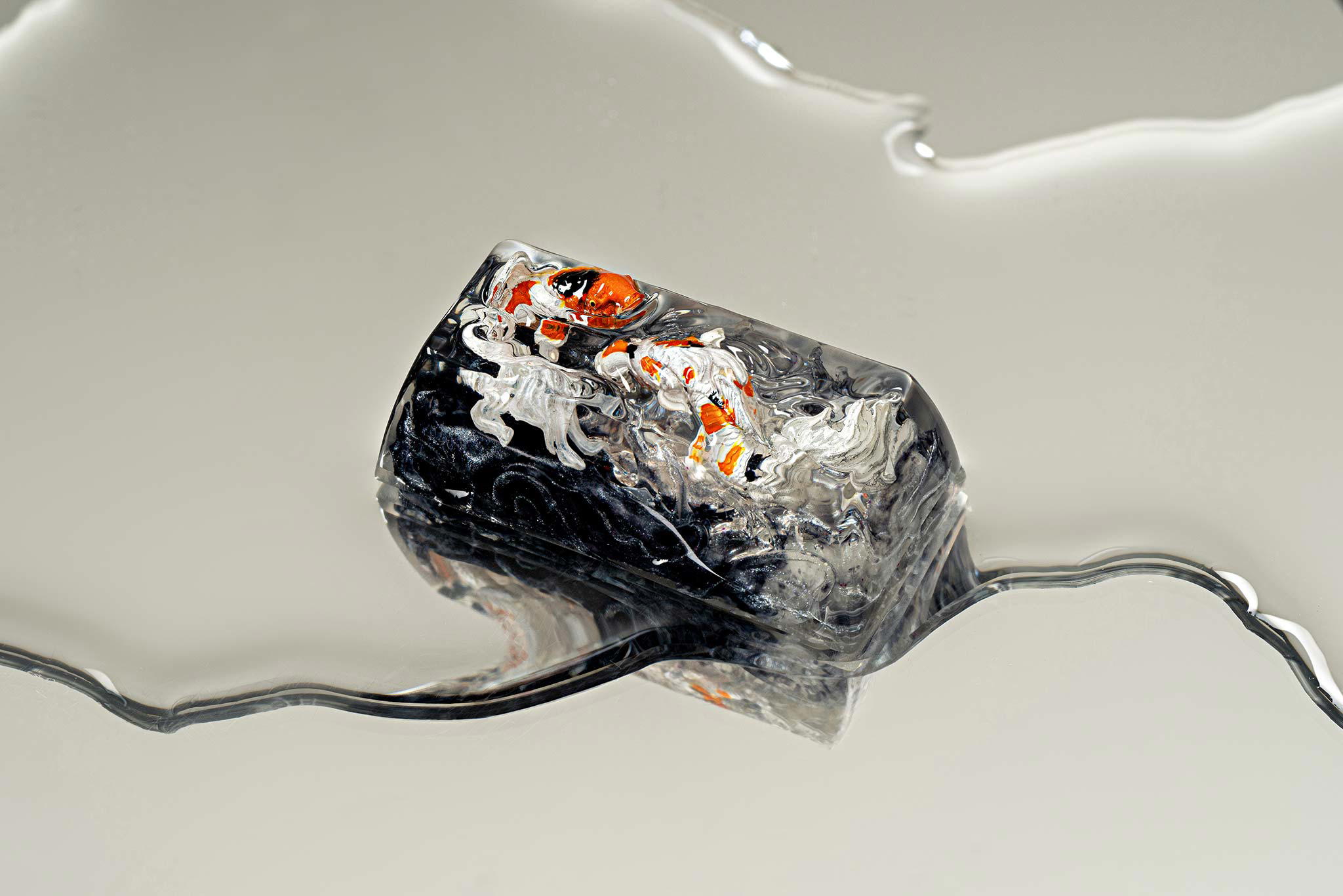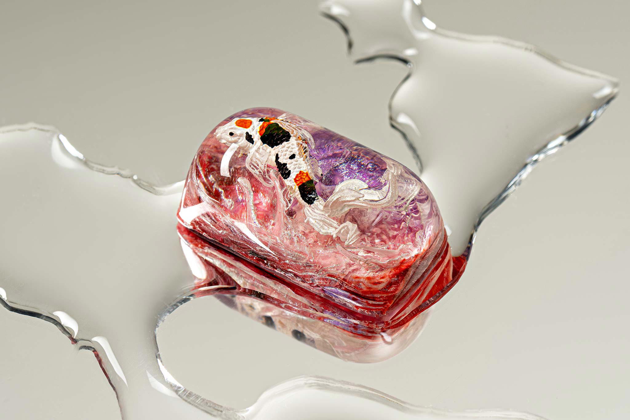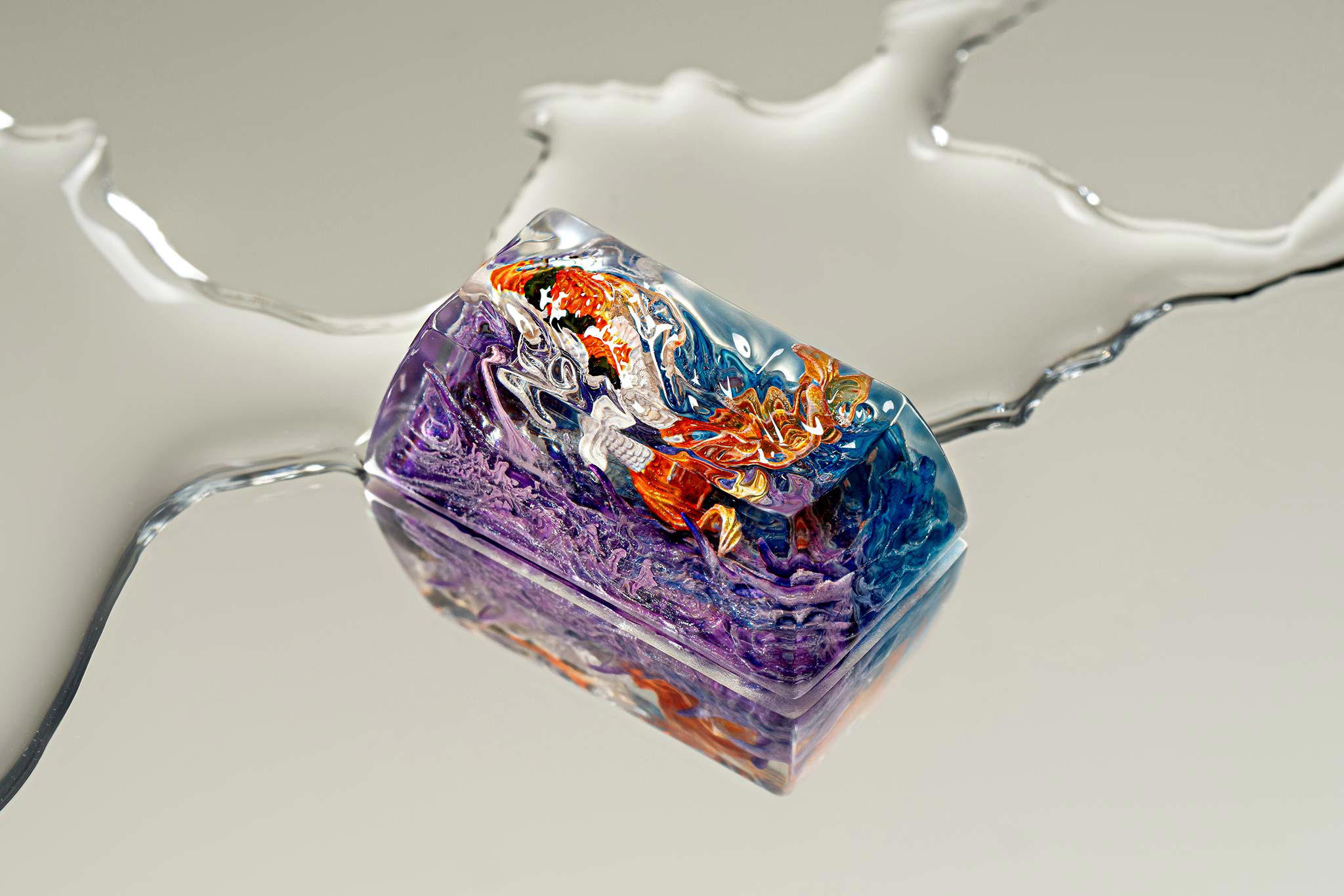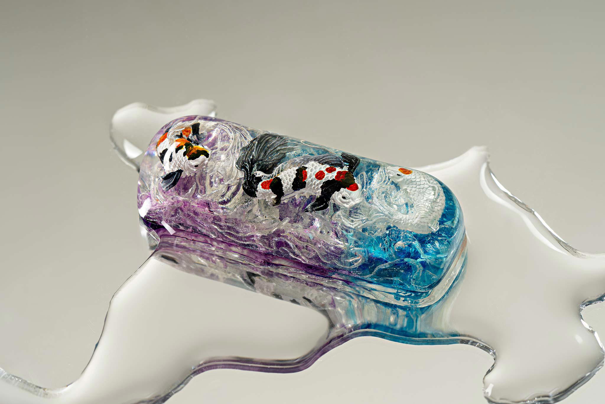 When the final layer of resin is poured, completely encasing the fish, it’s time to position the pre-formed water waves. This is the most crucial step, where “nature” and its “inhabitants” blend into a complete artwork. The most challenging part is handling the protruding portions of the Koi fish – they remain within the resin but rise above the keycap surface with “water” surrounding them, protecting the fish while ensuring daily usability and maintaining consistent aesthetics throughout. But the journey isn’t over yet – we still need to wait another 24 hours for the resin to fully solidify.