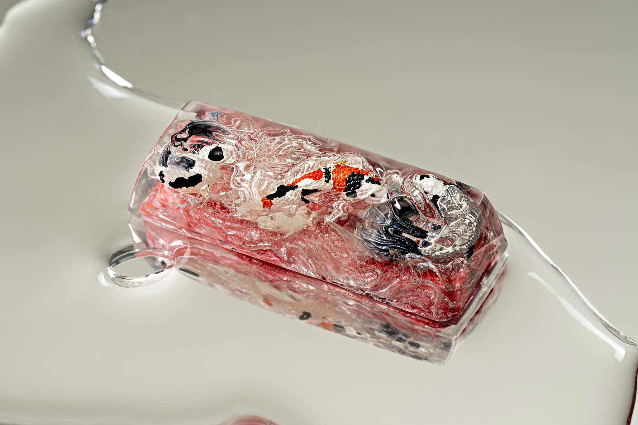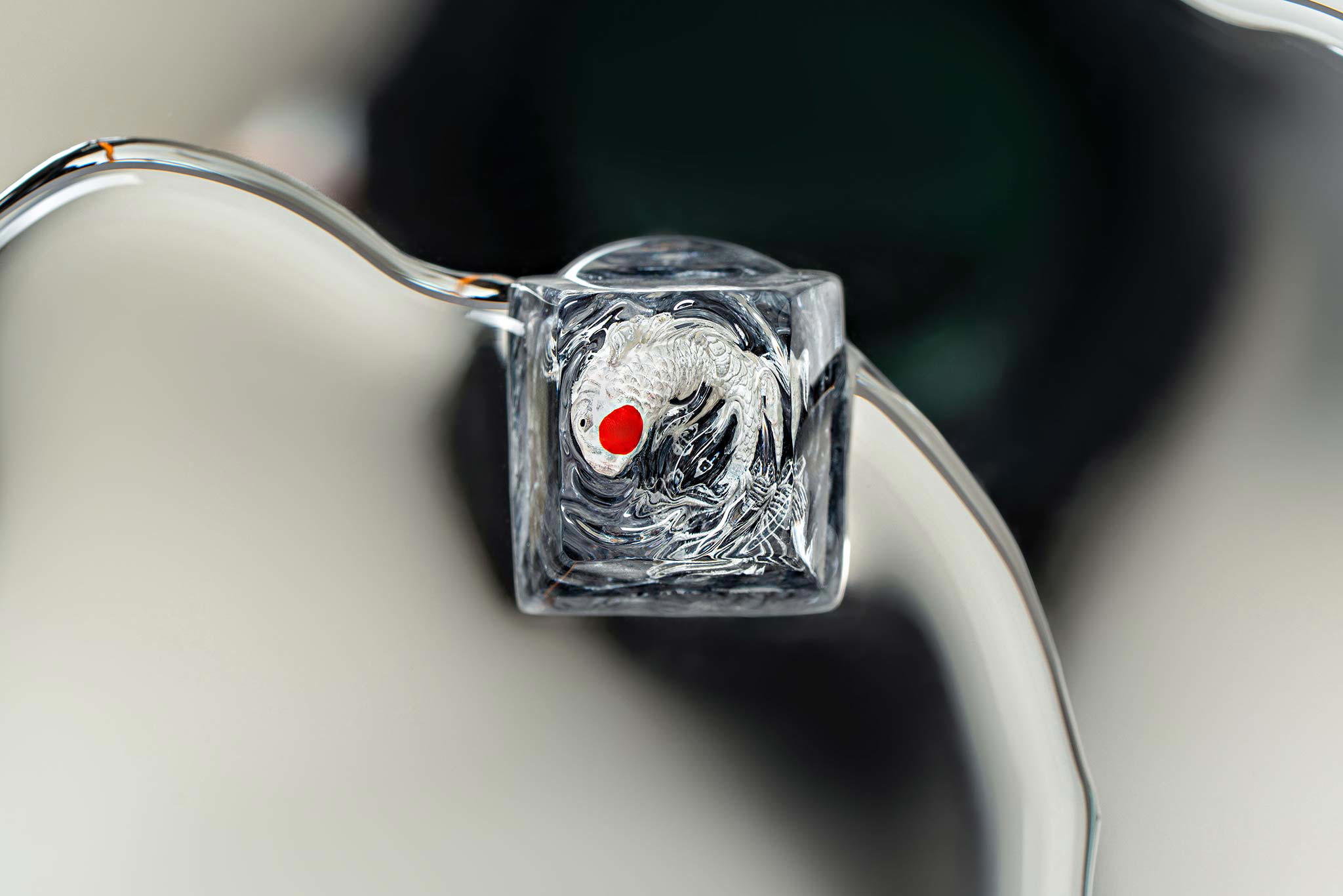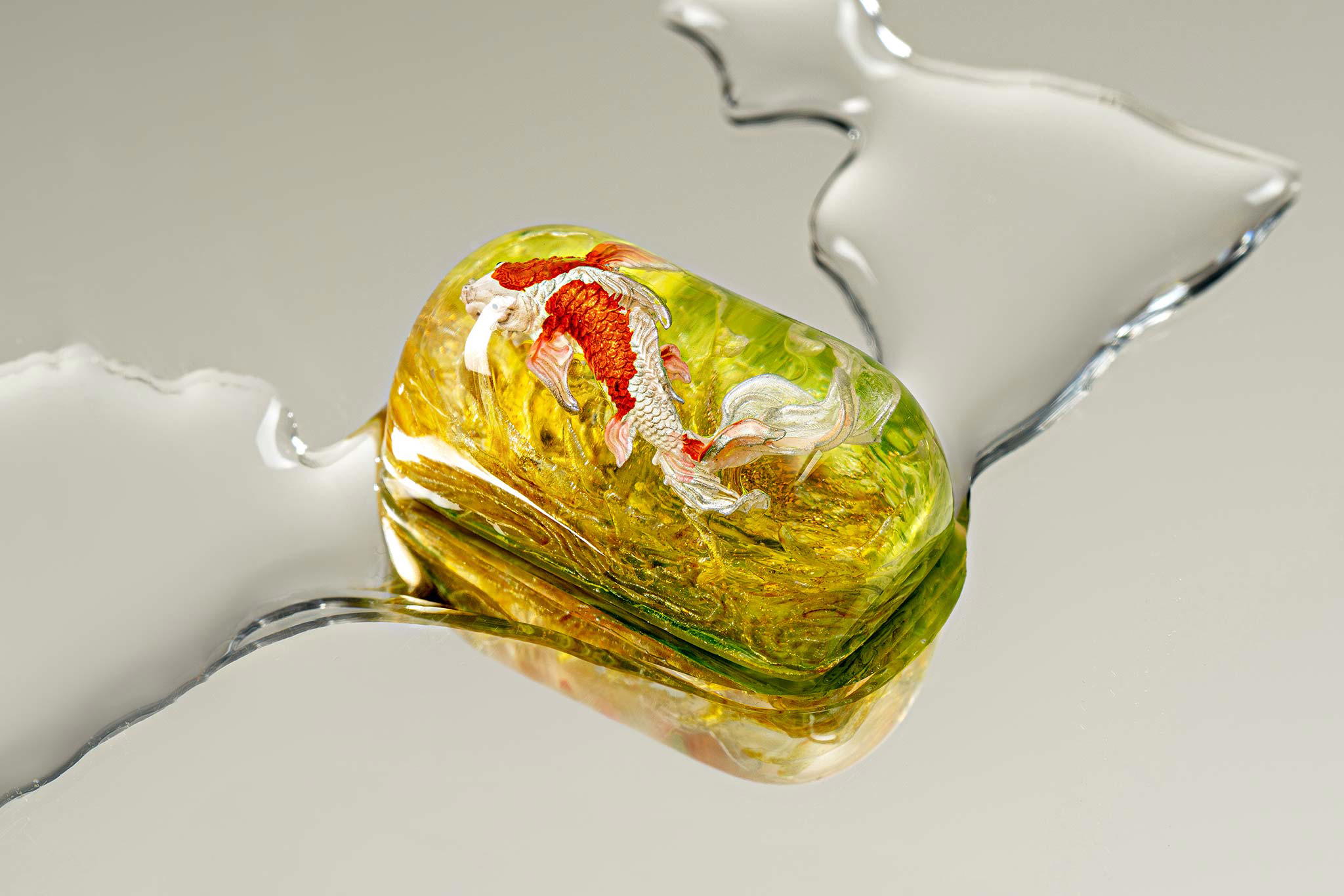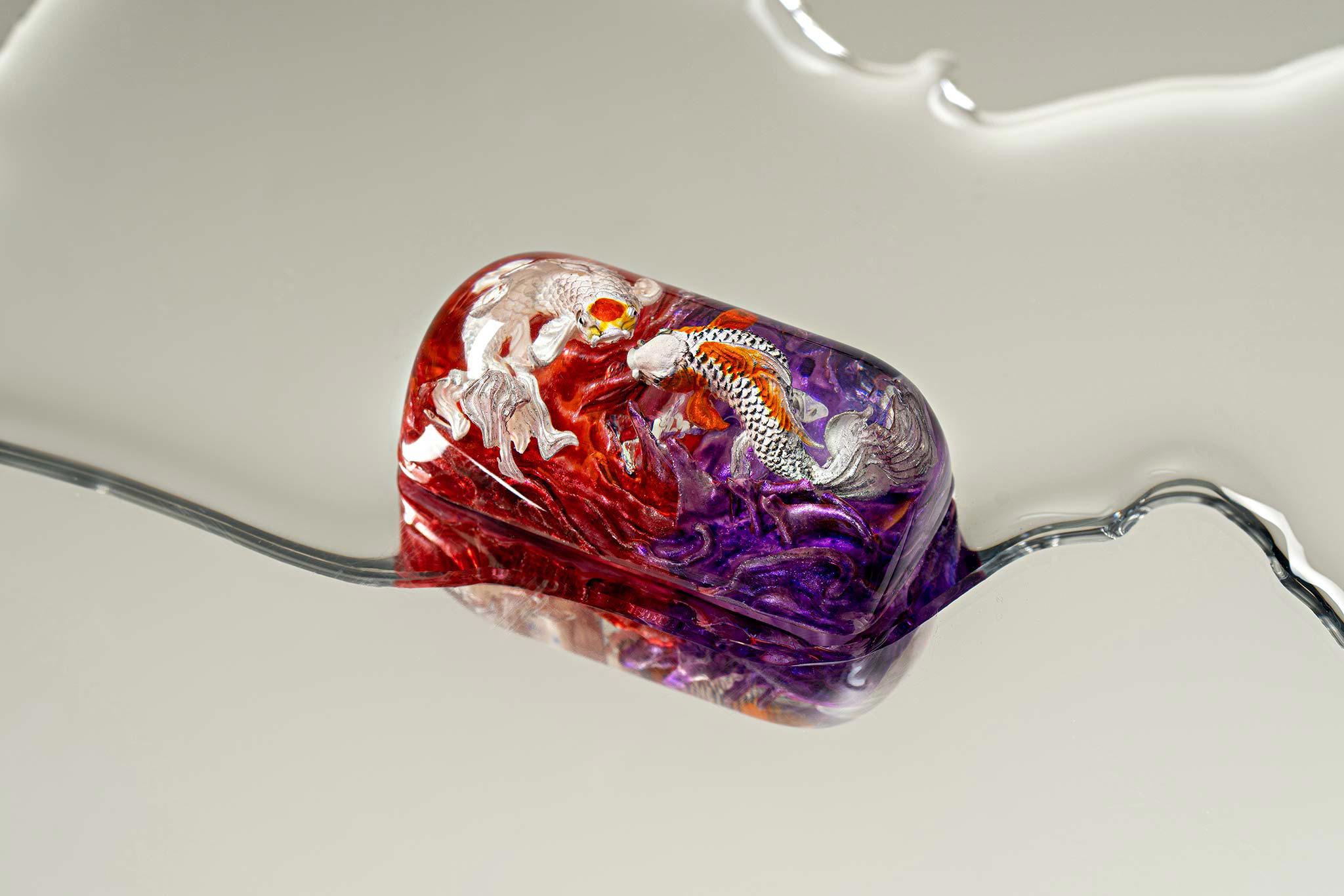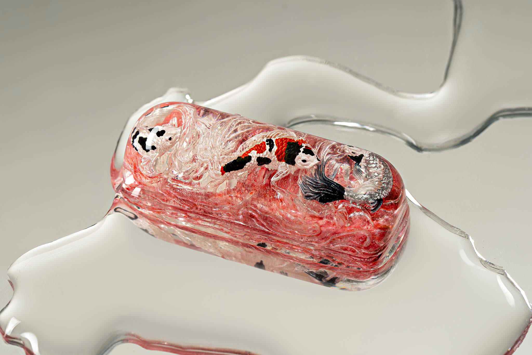 When the final layer of resin is poured, completely encasing the fish, it’s time to position the pre-formed water waves. This is the most crucial step, where “nature” and its “inhabitants” blend into a complete artwork. The most challenging part is handling the protruding portions of the Koi fish – they remain within the resin but rise above the keycap surface with “water” surrounding them, protecting the fish while ensuring daily usability and maintaining consistent aesthetics throughout. But the journey isn’t over yet – we still need to wait another 24 hours for the resin to fully solidify.
