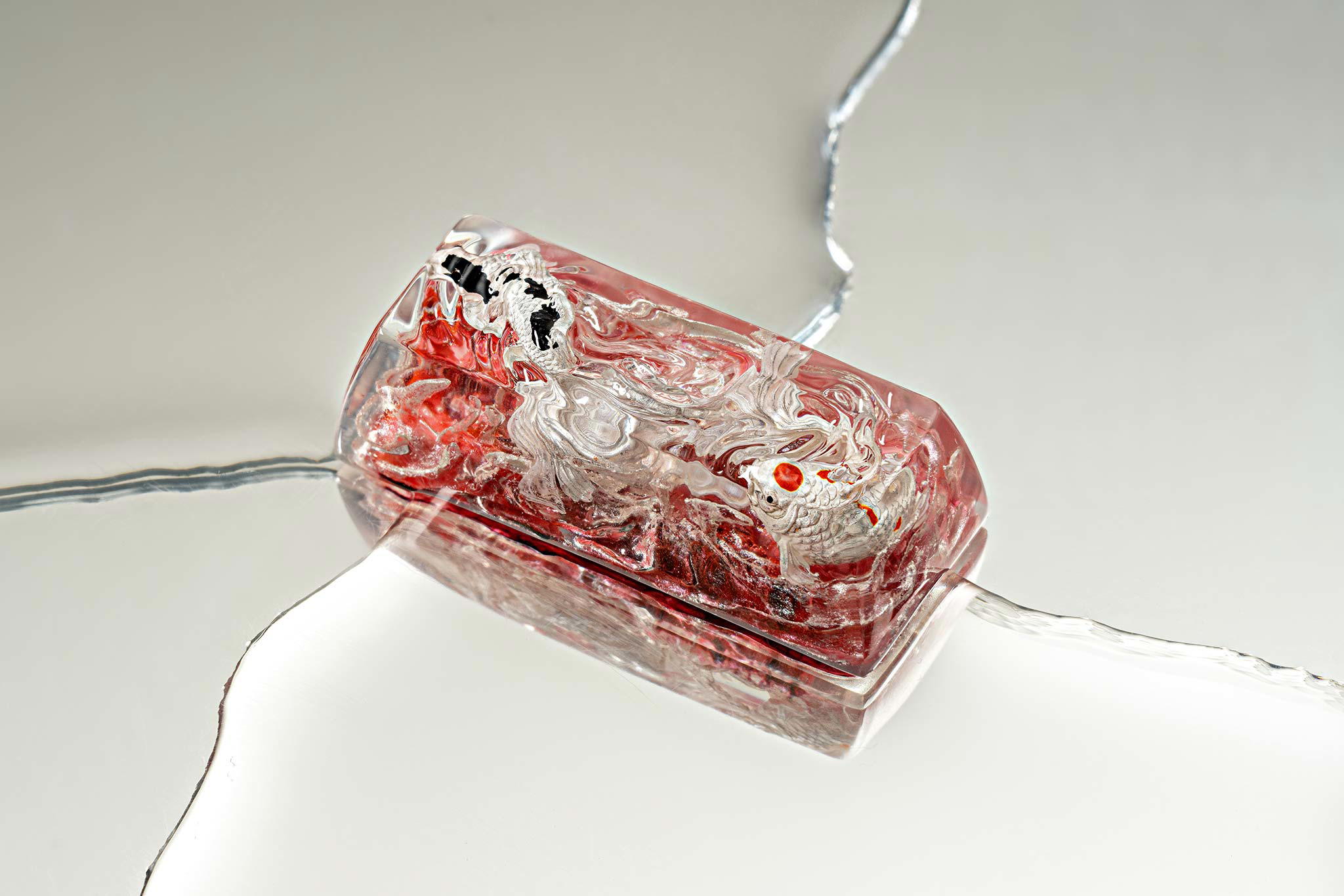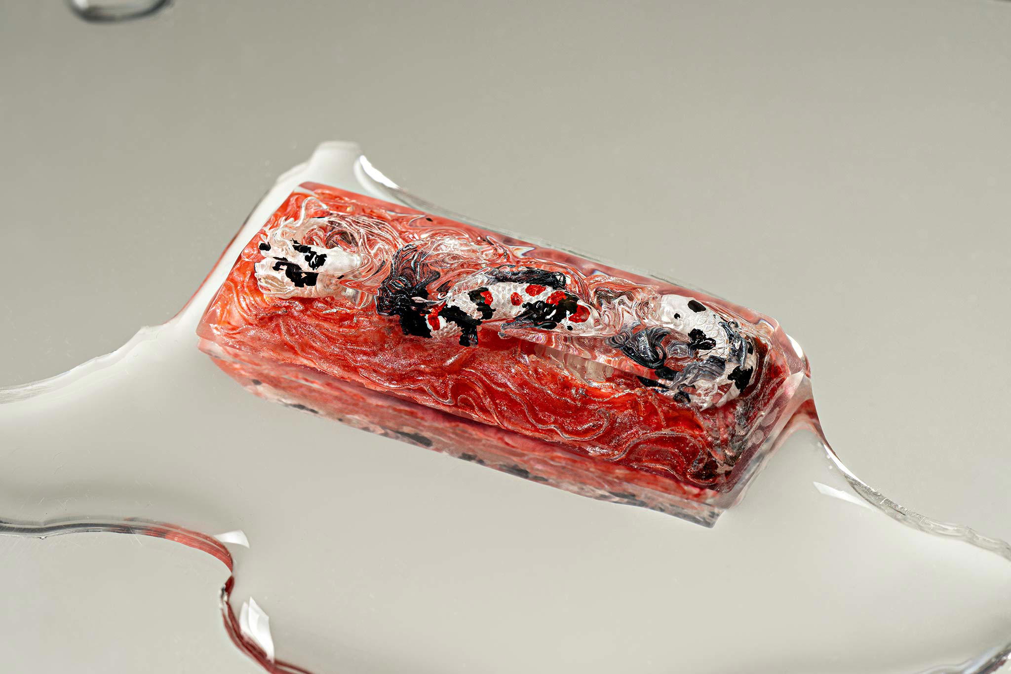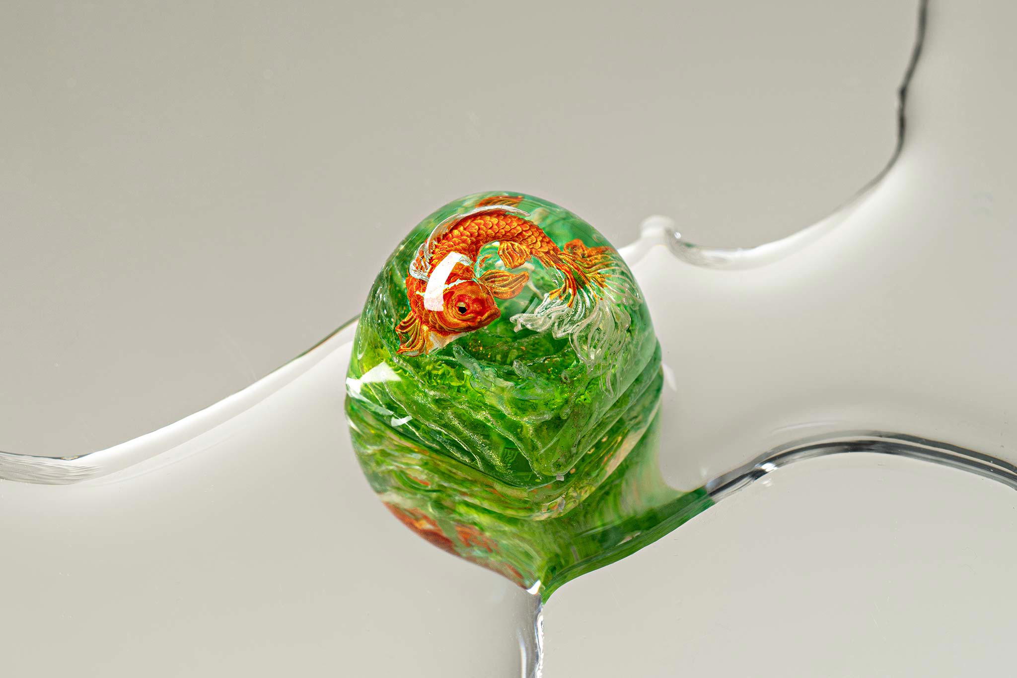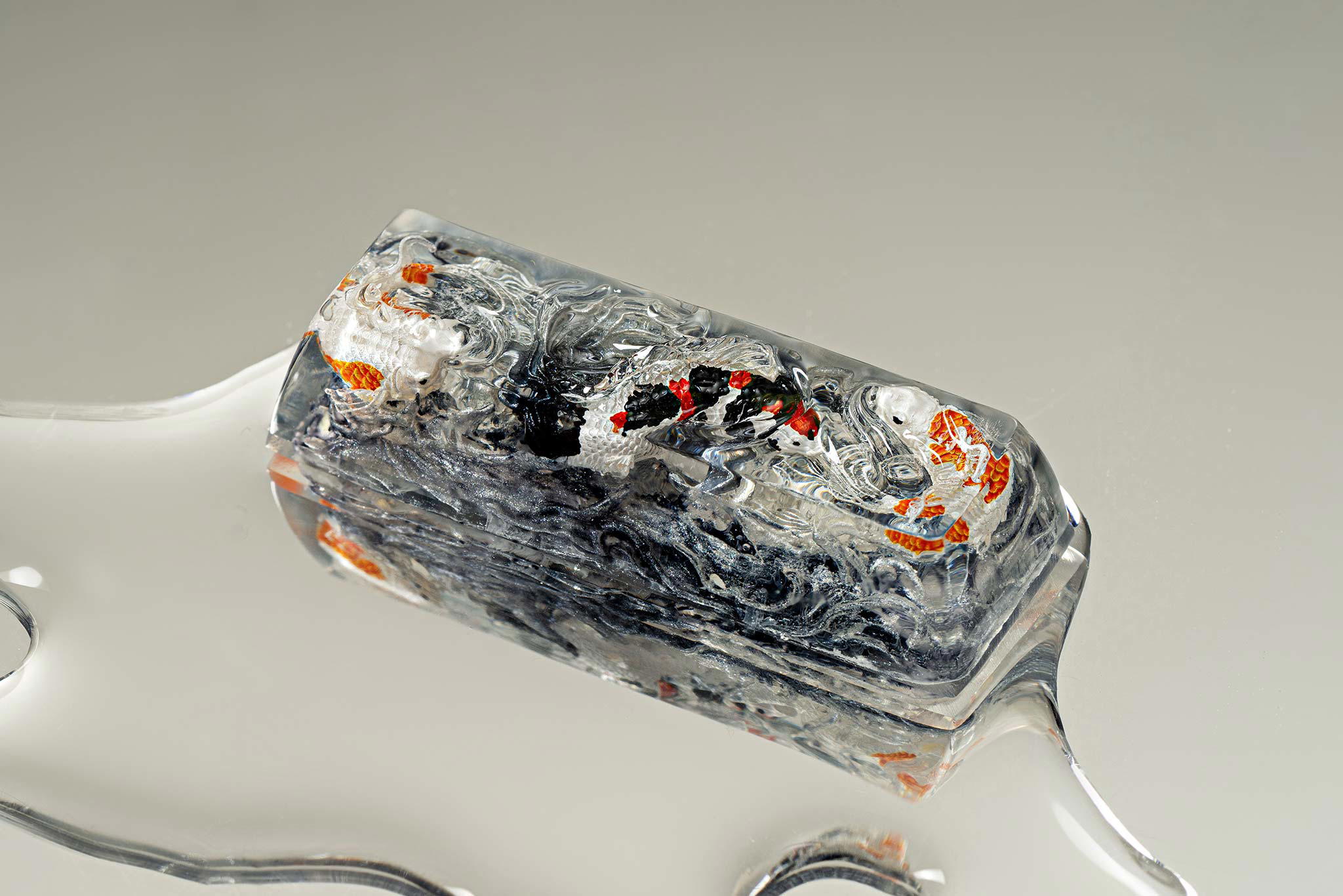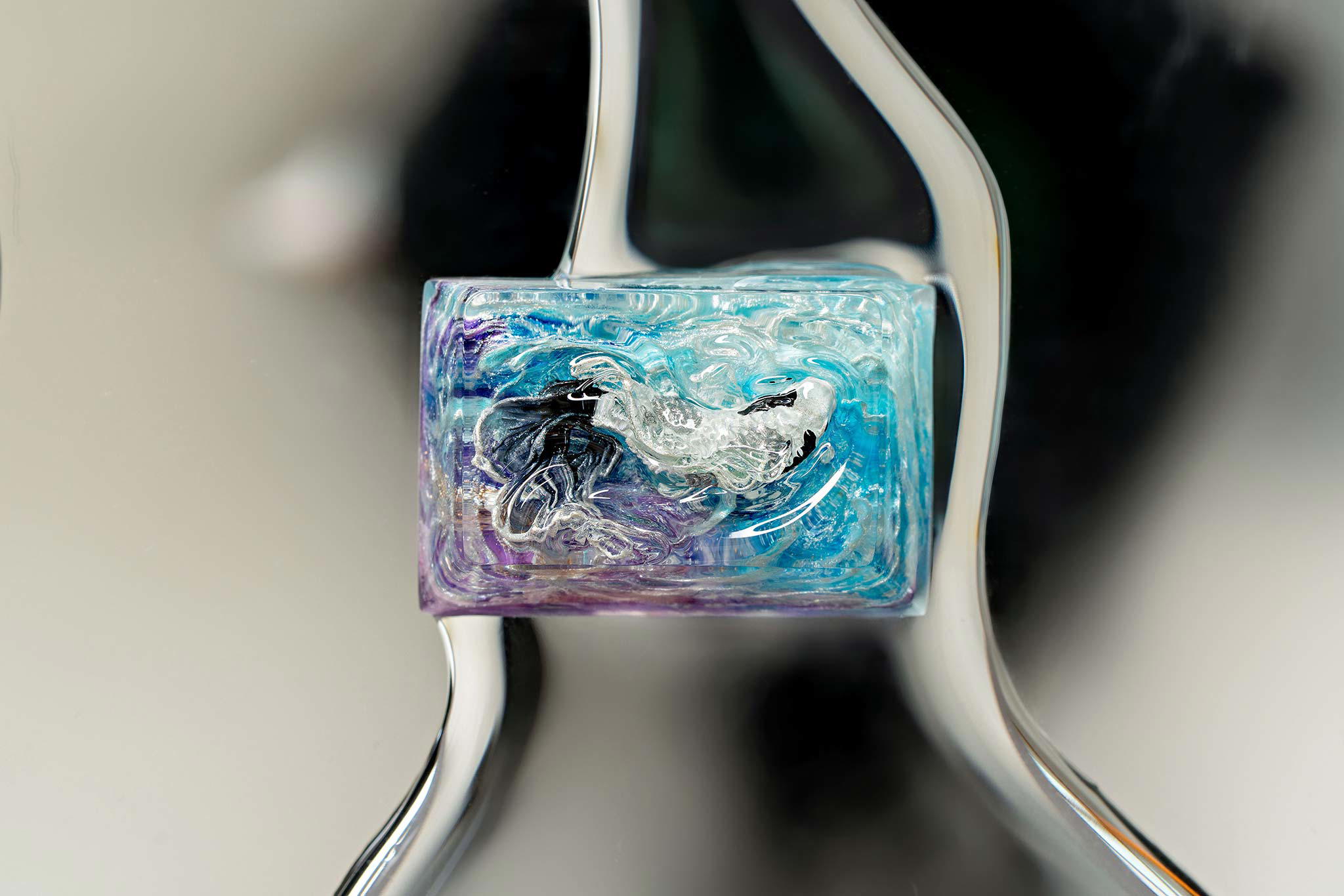 When the final layer of resin is poured, completely encasing the fish, it’s time to position the pre-formed water waves. This is the most crucial step, where “nature” and its “inhabitants” blend into a complete artwork. The most challenging part is handling the protruding portions of the Koi fish – they remain within the resin but rise above the keycap surface with “water” surrounding them, protecting the fish while ensuring daily usability and maintaining consistent aesthetics throughout. But the journey isn’t over yet – we still need to wait another 24 hours for the resin to fully solidify.