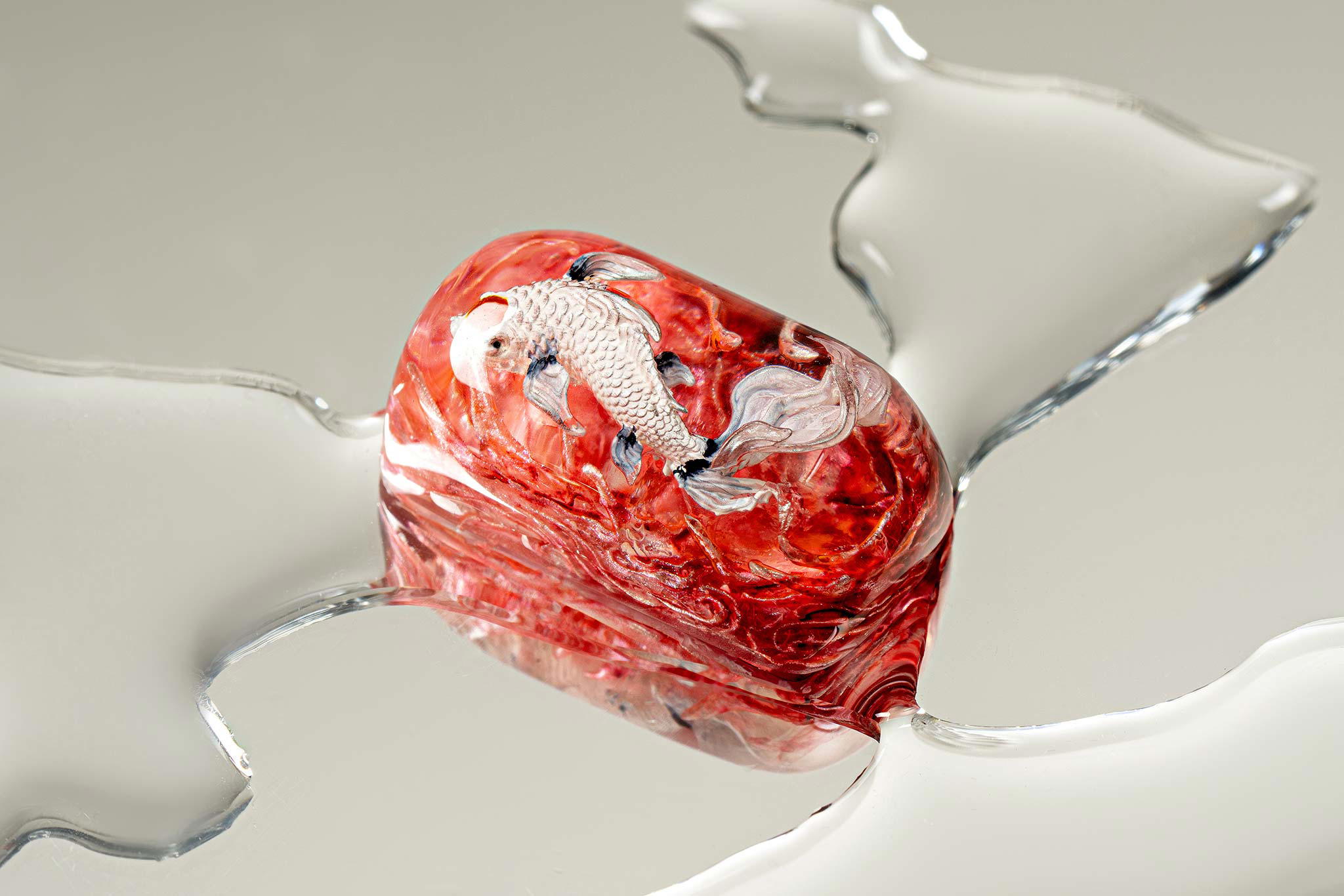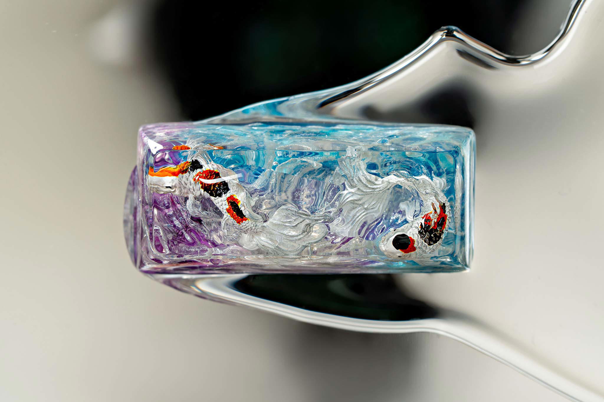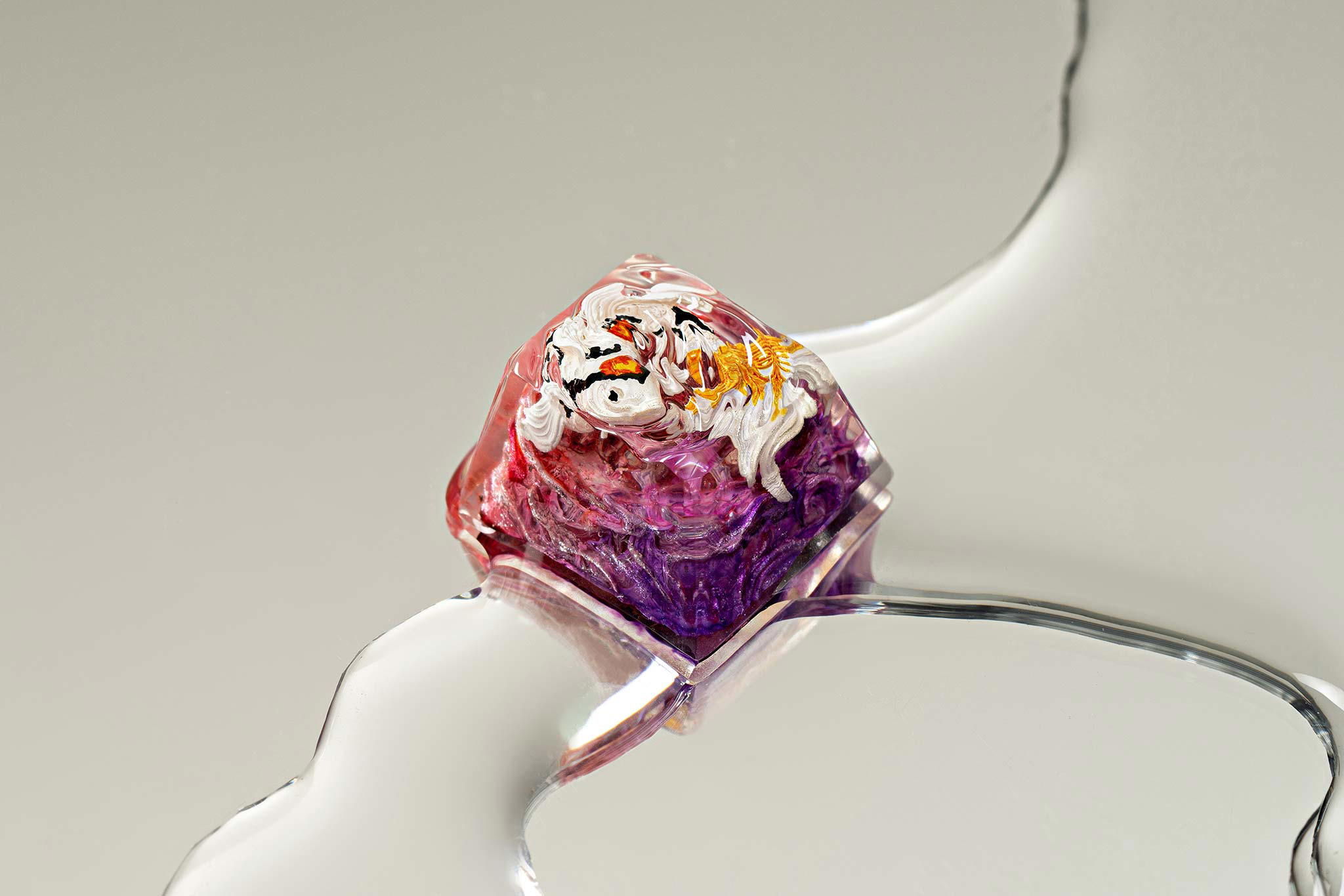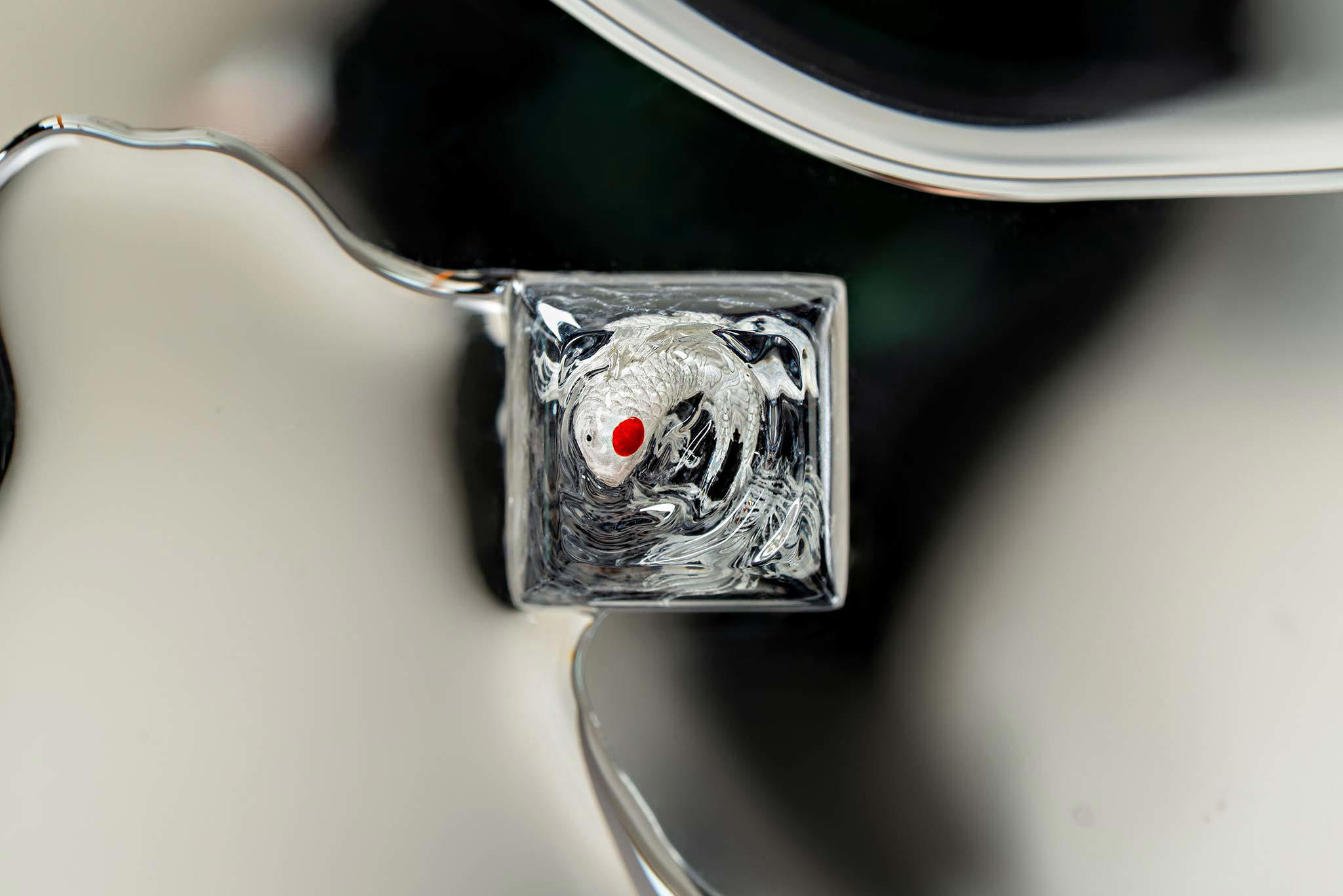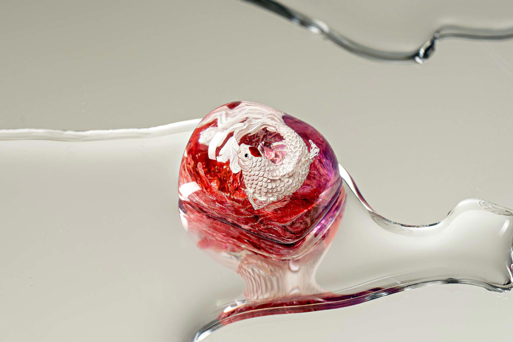 When the final layer of resin is poured, completely encasing the fish, it’s time to position the pre-formed water waves. This is the most crucial step, where “nature” and its “inhabitants” blend into a complete artwork. The most challenging part is handling the protruding portions of the Koi fish – they remain within the resin but rise above the keycap surface with “water” surrounding them, protecting the fish while ensuring daily usability and maintaining consistent aesthetics throughout. But the journey isn’t over yet – we still need to wait another 24 hours for the resin to fully solidify.