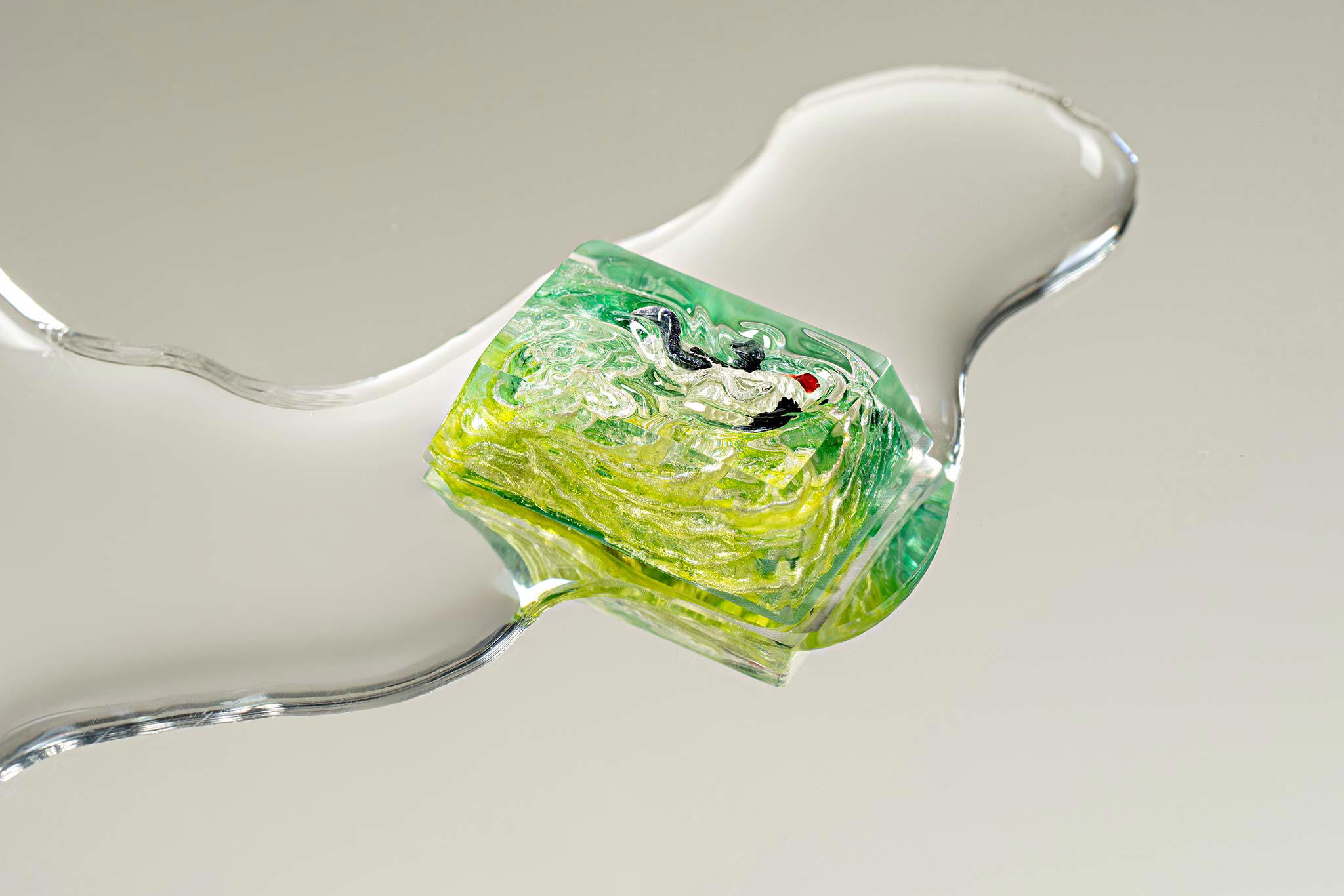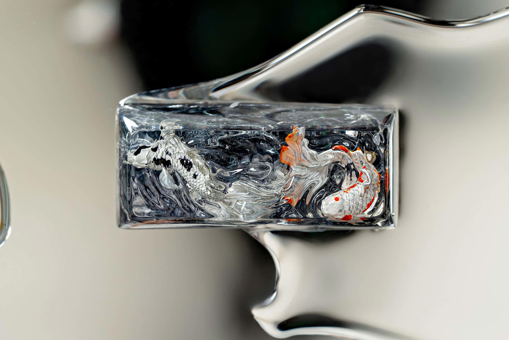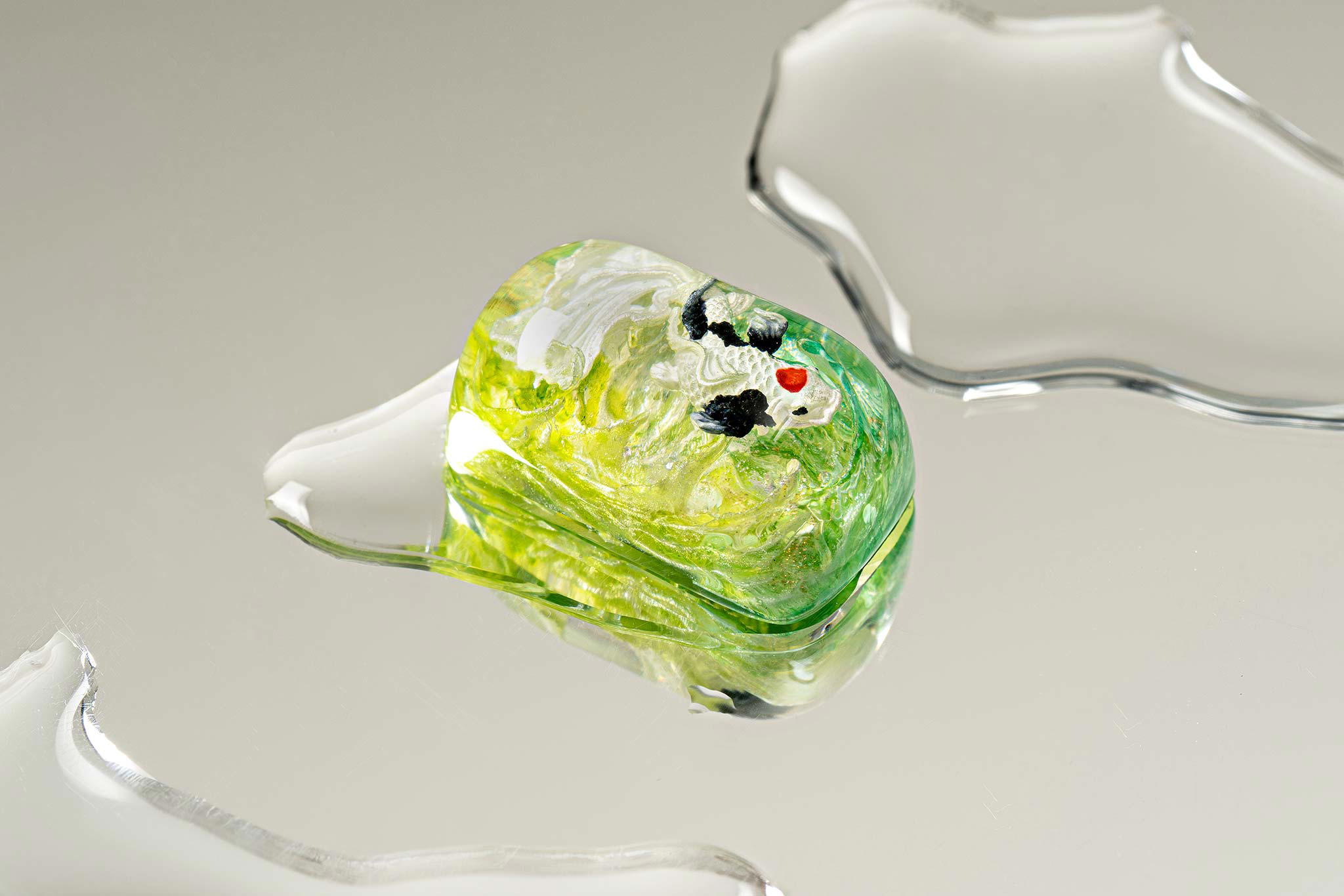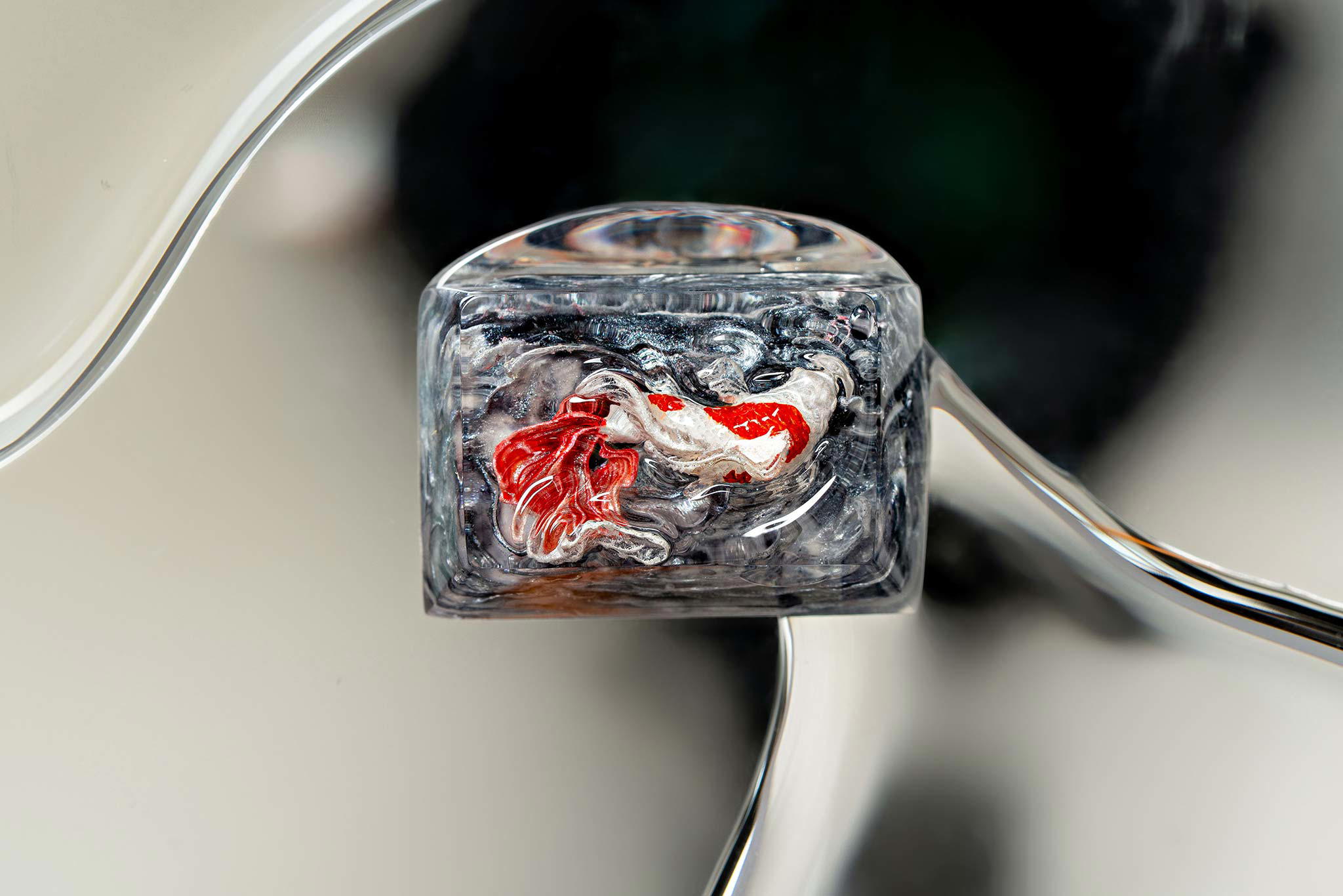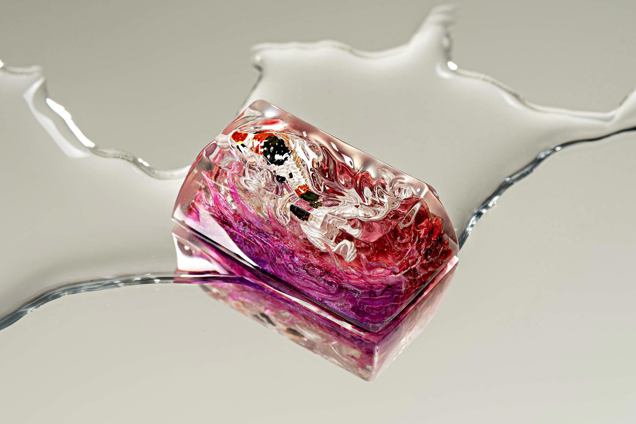 When the final layer of resin is poured, completely encasing the fish, it’s time to position the pre-formed water waves. This is the most crucial step, where “nature” and its “inhabitants” blend into a complete artwork. The most challenging part is handling the protruding portions of the Koi fish – they remain within the resin but rise above the keycap surface with “water” surrounding them, protecting the fish while ensuring daily usability and maintaining consistent aesthetics throughout. But the journey isn’t over yet – we still need to wait another 24 hours for the resin to fully solidify.
