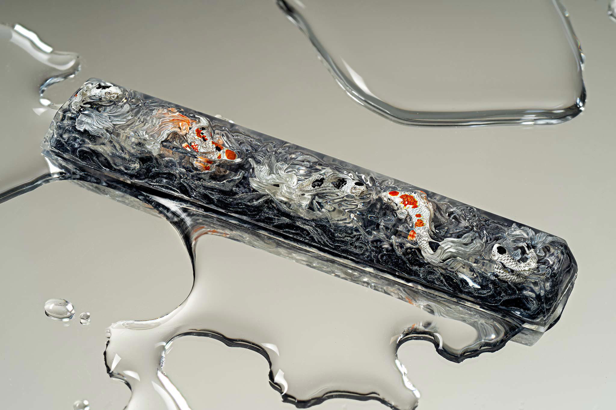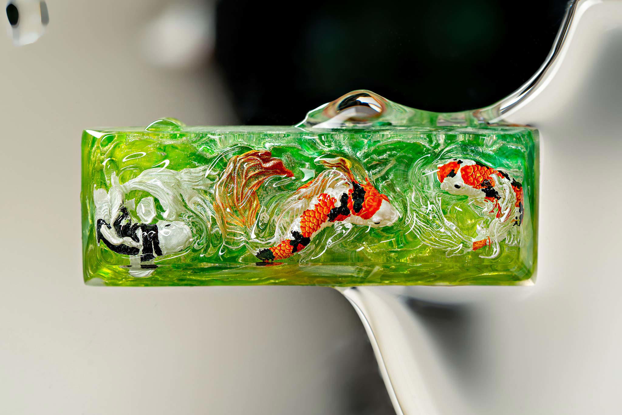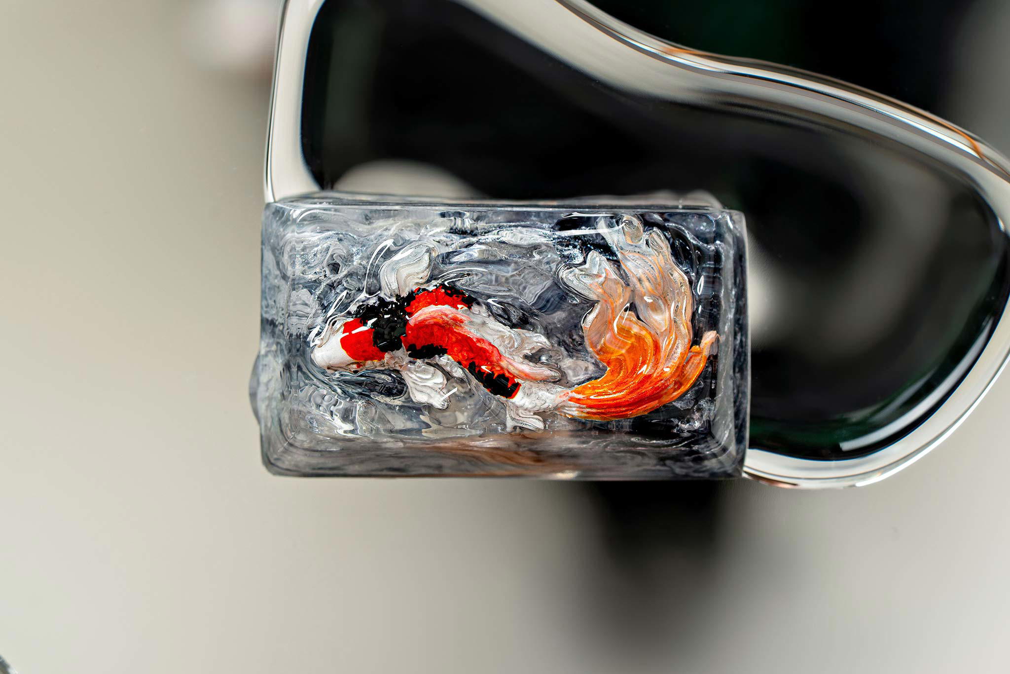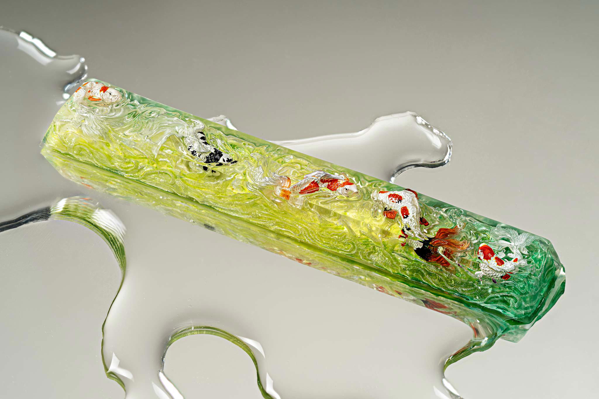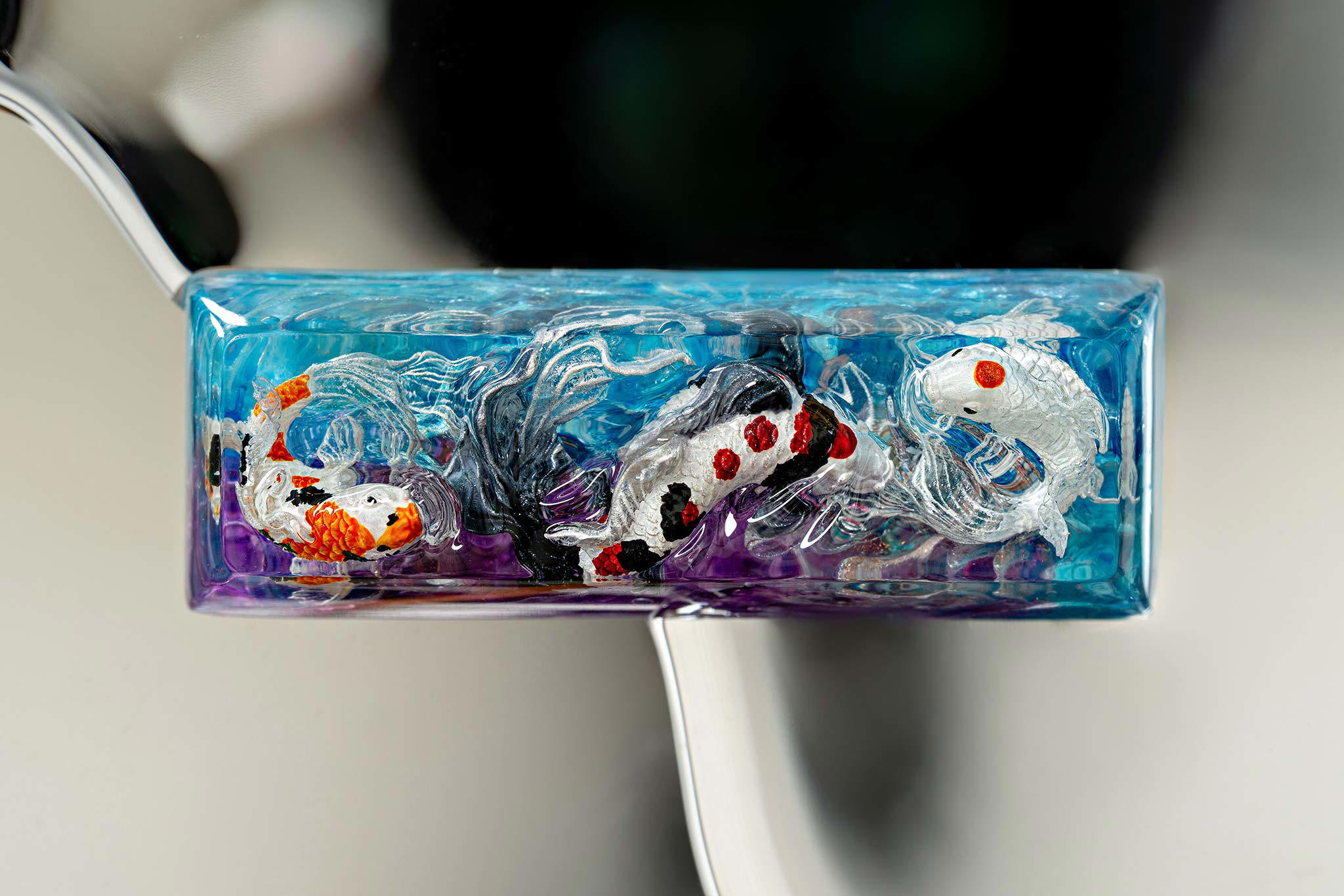 When the final layer of resin is poured, completely encasing the fish, it’s time to position the pre-formed water waves. This is the most crucial step, where “nature” and its “inhabitants” blend into a complete artwork. The most challenging part is handling the protruding portions of the Koi fish – they remain within the resin but rise above the keycap surface with “water” surrounding them, protecting the fish while ensuring daily usability and maintaining consistent aesthetics throughout. But the journey isn’t over yet – we still need to wait another 24 hours for the resin to fully solidify.