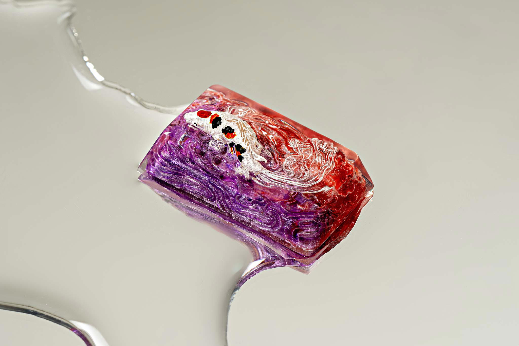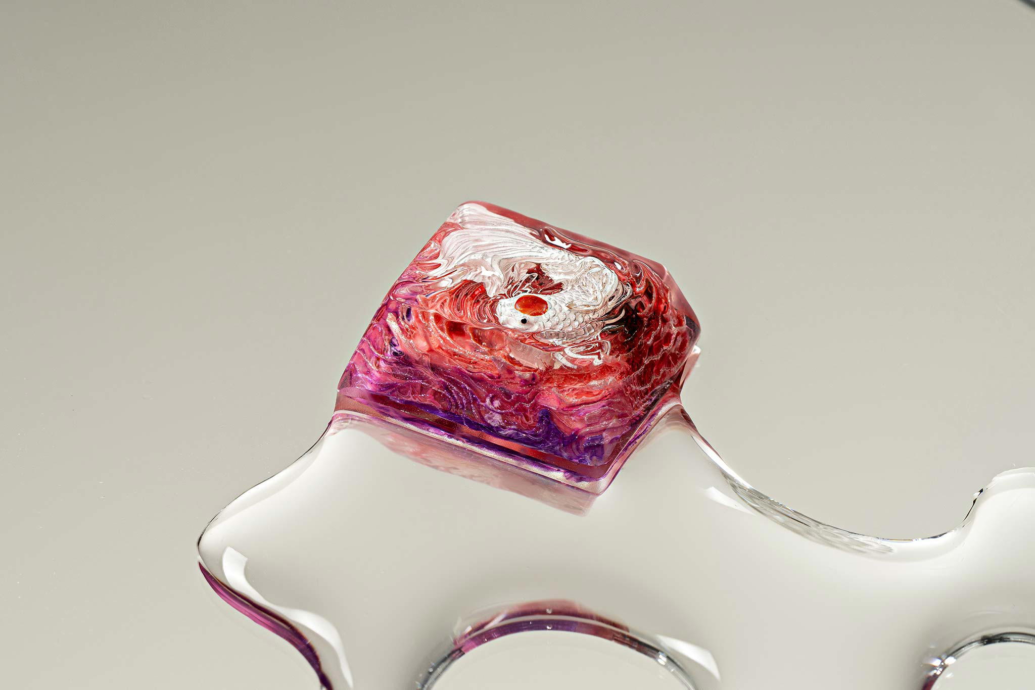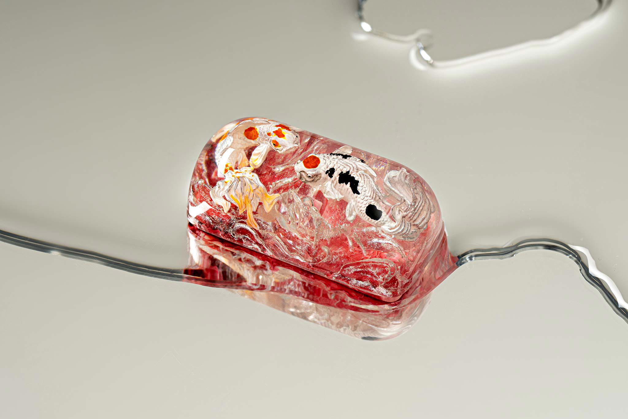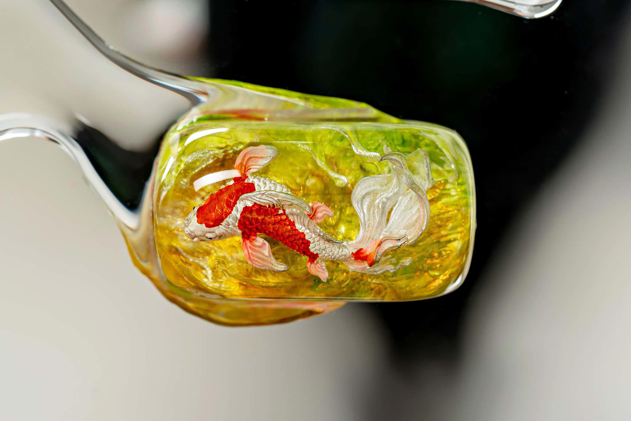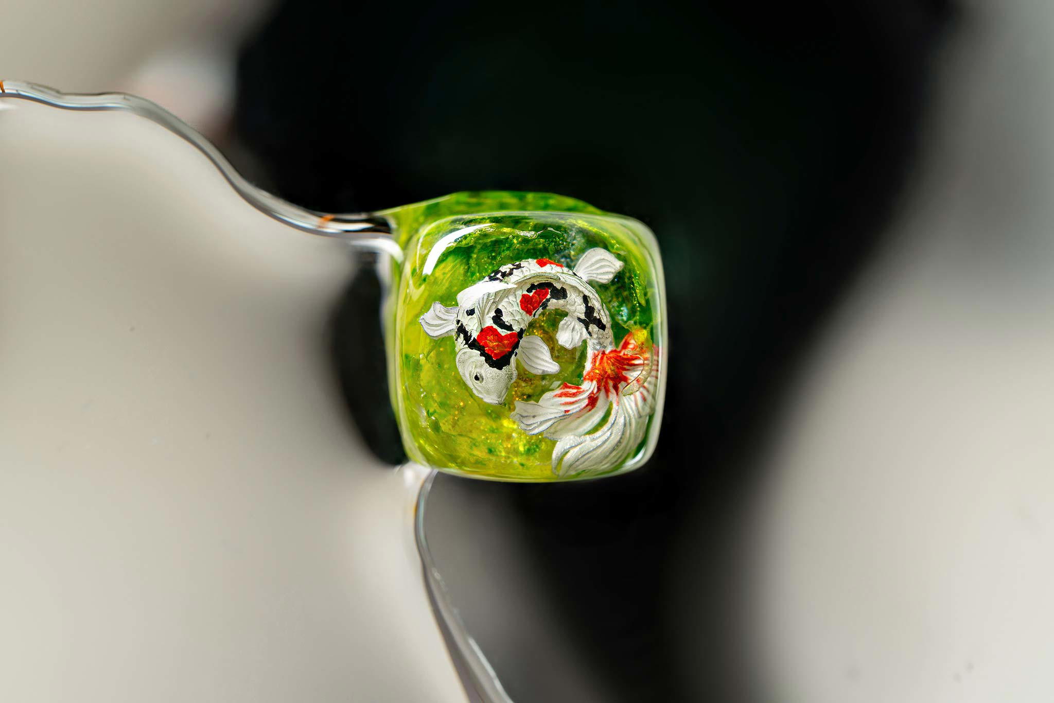 When the final layer of resin is poured, completely encasing the fish, it’s time to position the pre-formed water waves. This is the most crucial step, where “nature” and its “inhabitants” blend into a complete artwork. The most challenging part is handling the protruding portions of the Koi fish – they remain within the resin but rise above the keycap surface with “water” surrounding them, protecting the fish while ensuring daily usability and maintaining consistent aesthetics throughout. But the journey isn’t over yet – we still need to wait another 24 hours for the resin to fully solidify.