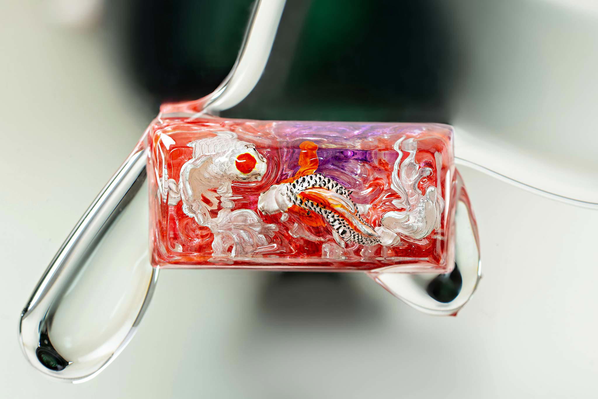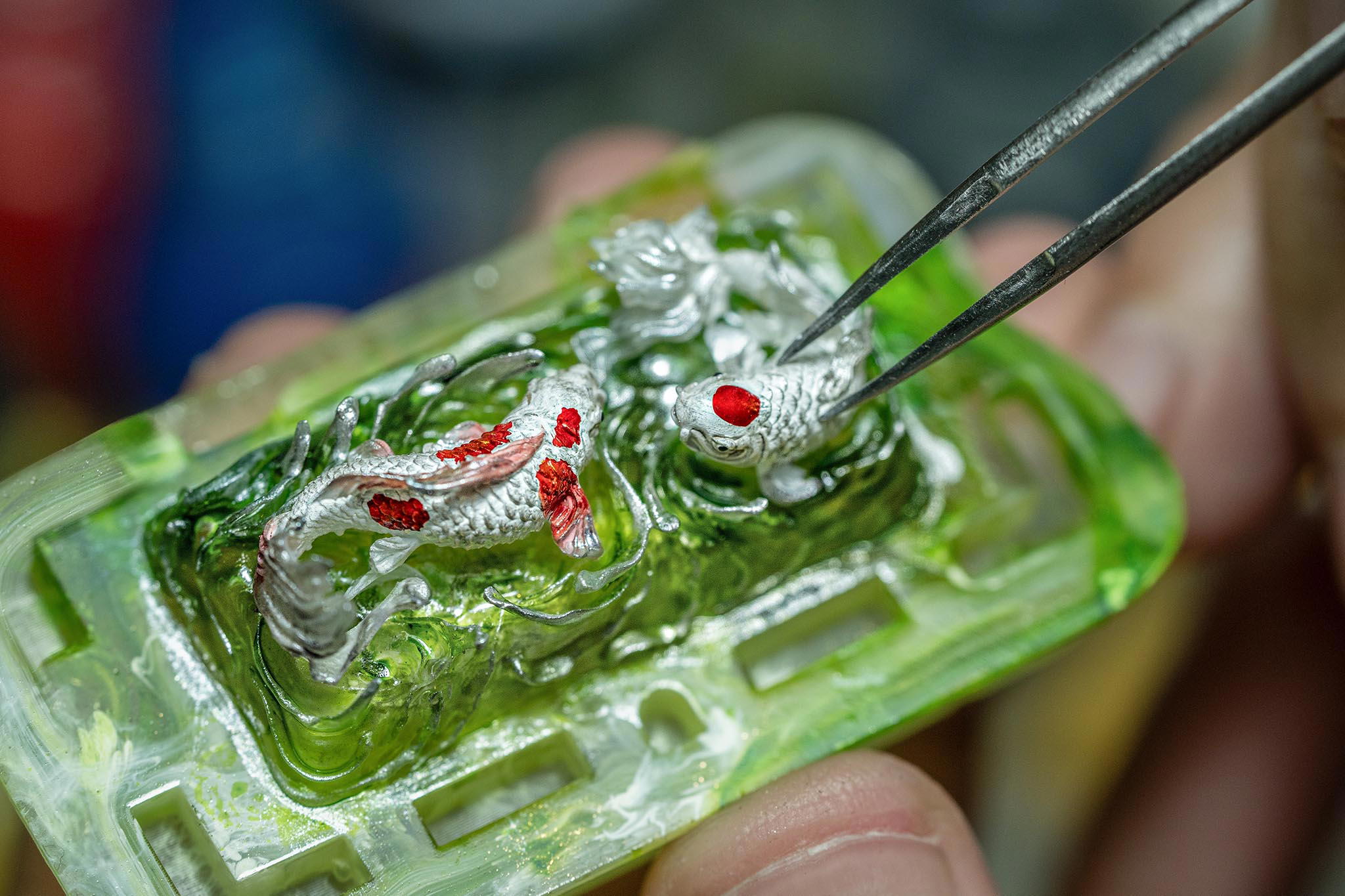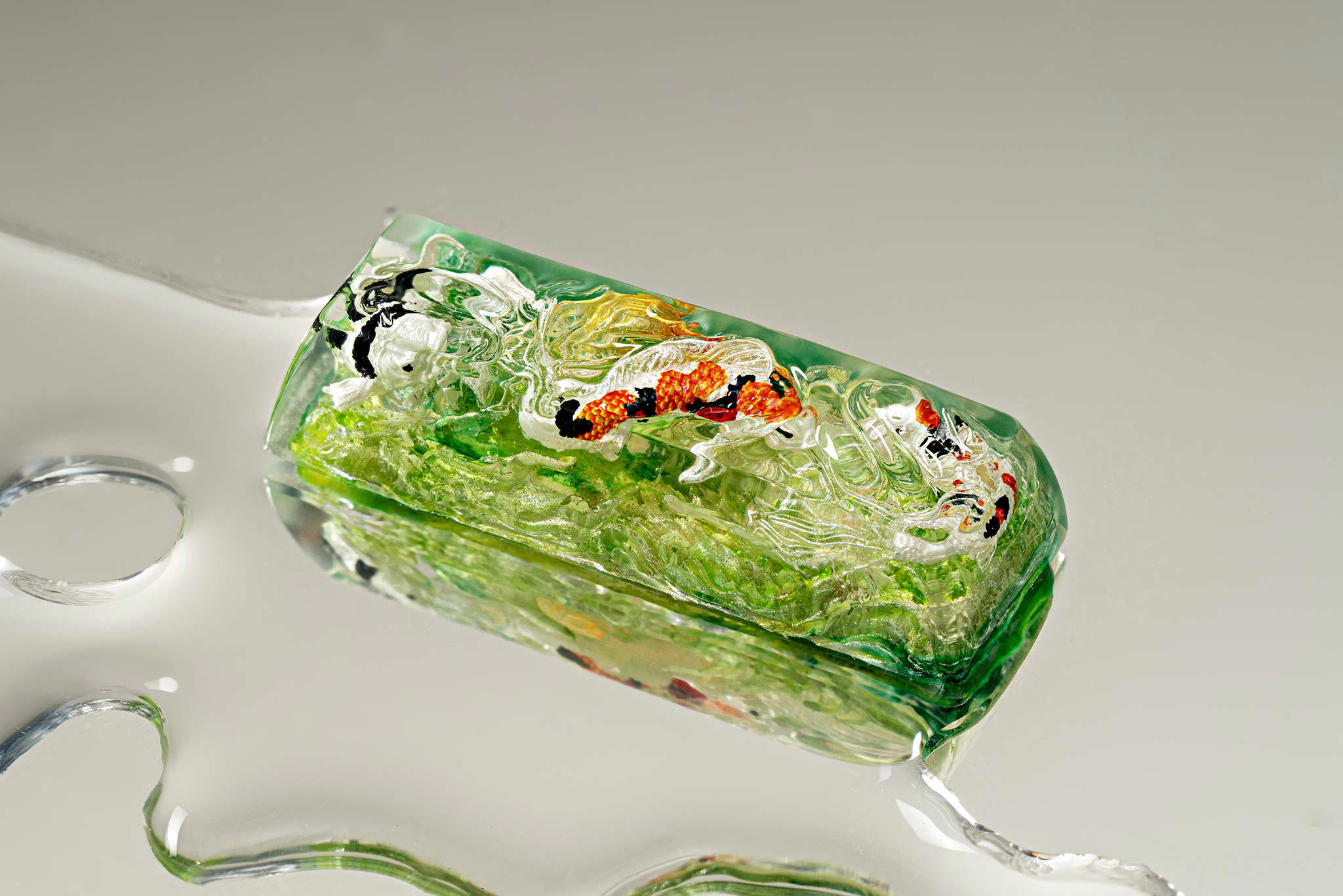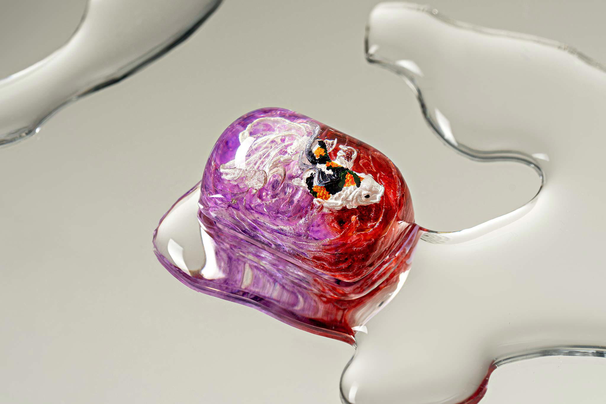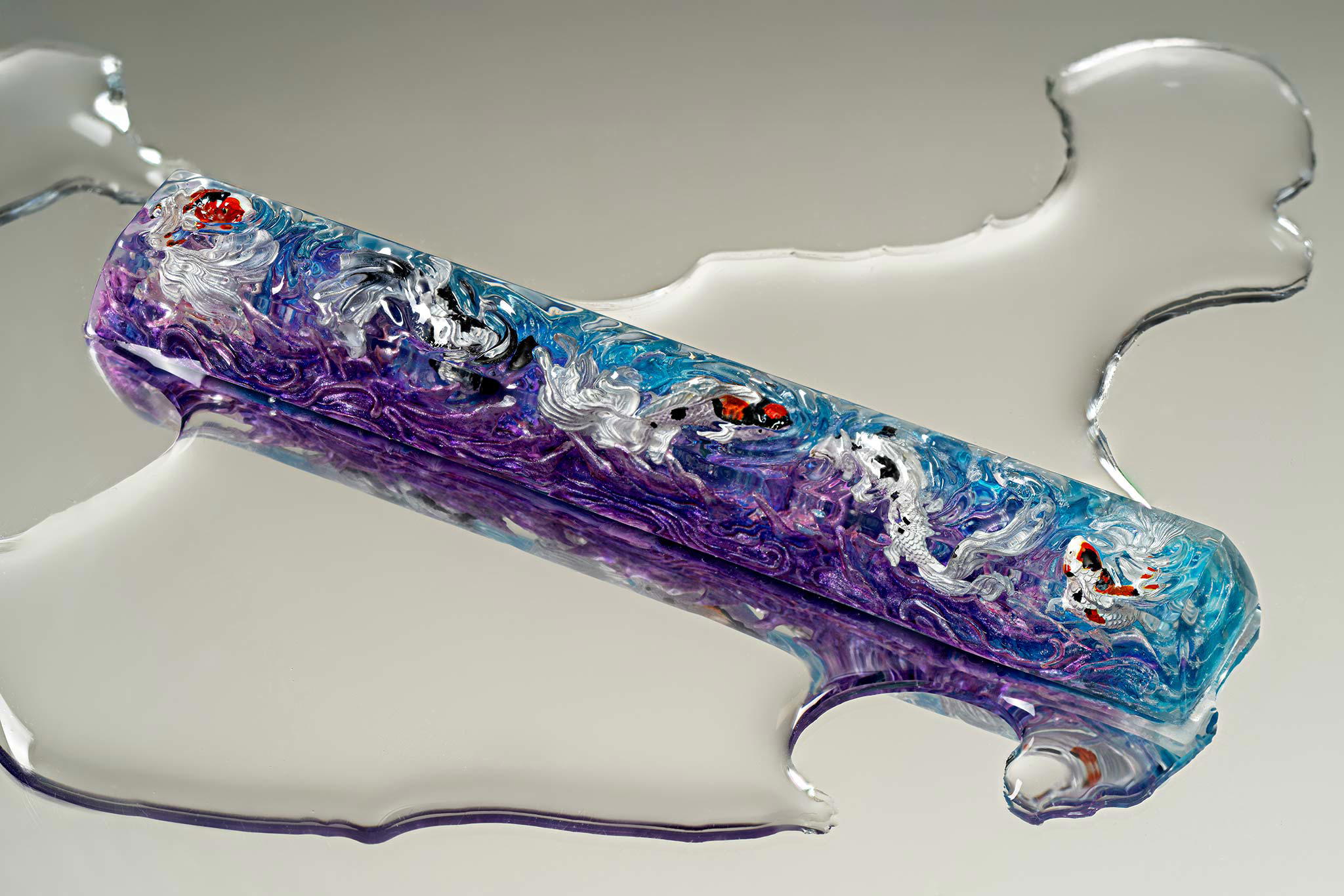 When the final layer of resin is poured, completely encasing the fish, it’s time to position the pre-formed water waves. This is the most crucial step, where “nature” and its “inhabitants” blend into a complete artwork. The most challenging part is handling the protruding portions of the Koi fish – they remain within the resin but rise above the keycap surface with “water” surrounding them, protecting the fish while ensuring daily usability and maintaining consistent aesthetics throughout. But the journey isn’t over yet – we still need to wait another 24 hours for the resin to fully solidify.